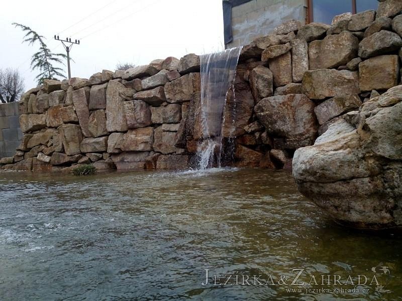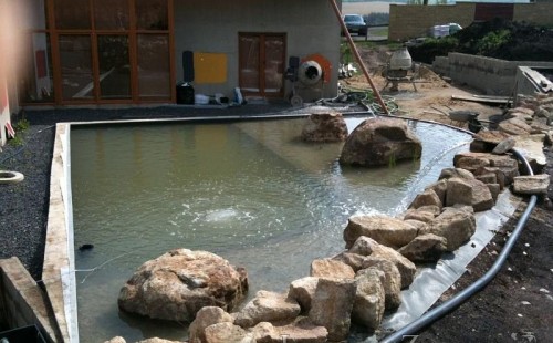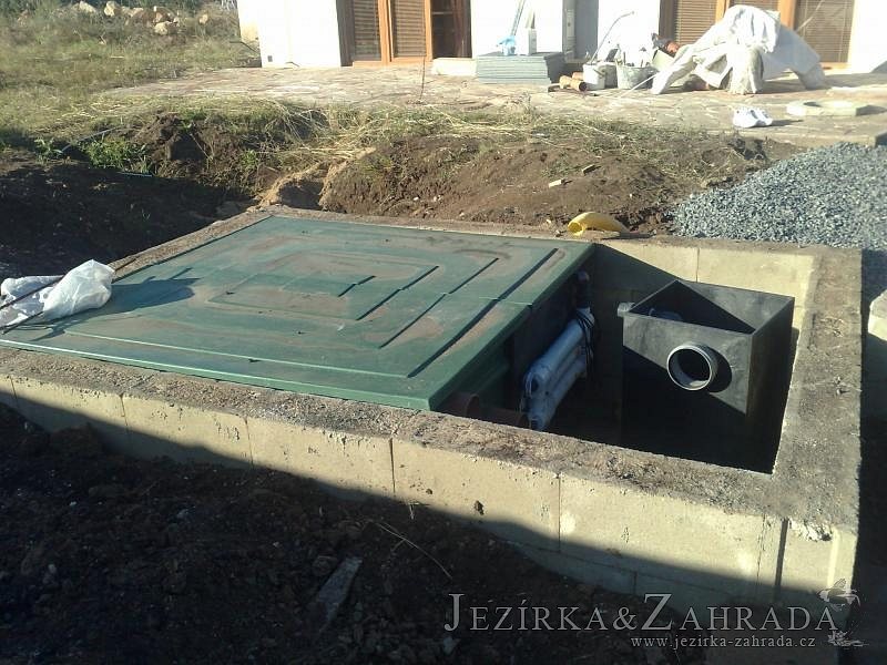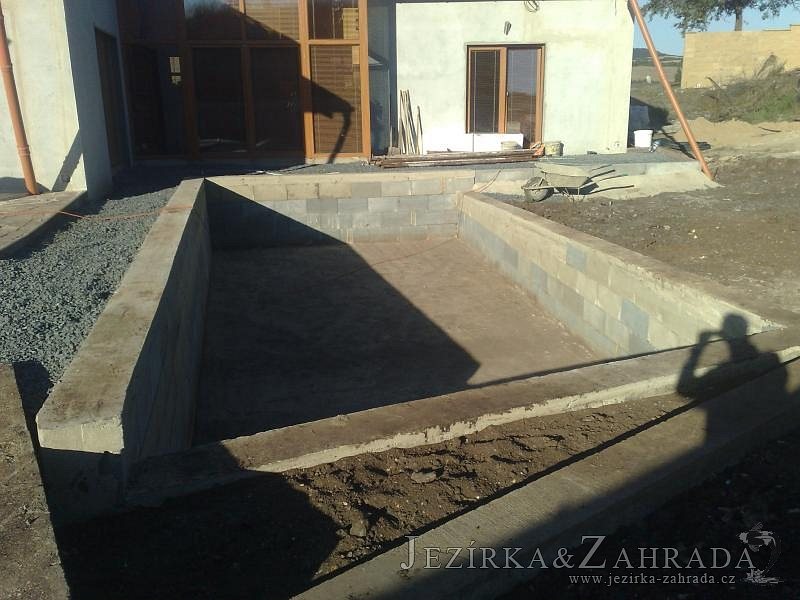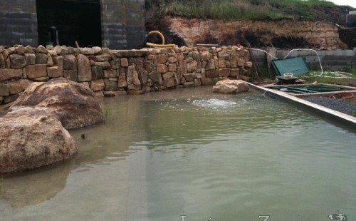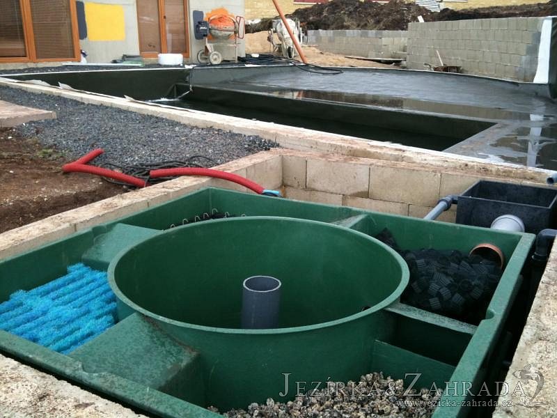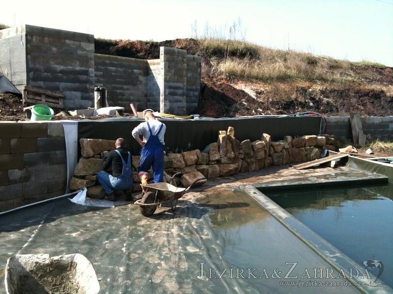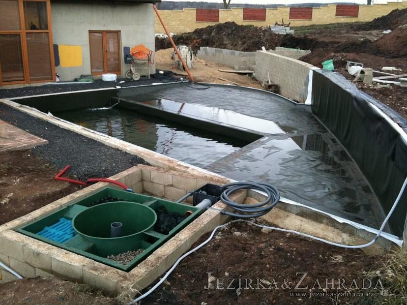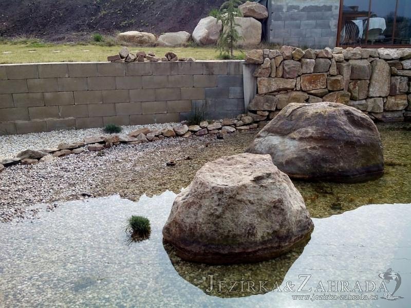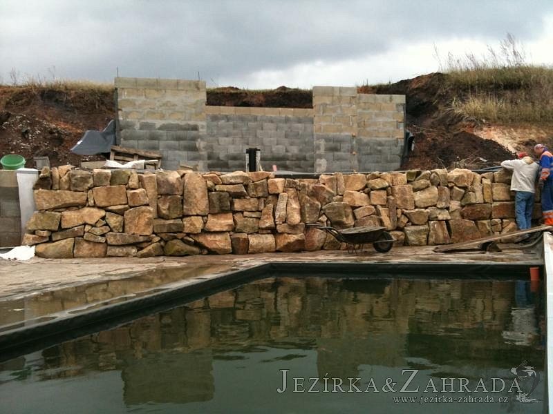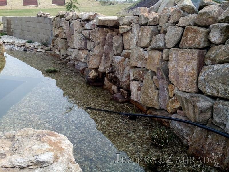 U moderní novostavby si klient přál postavit koupací jezírka o velikosti cca. 65m3. Ze ztraceného bednění se postavil obvod jezírka a technická místnost. Připravilo se potrubí vedoucí k technologii, zabetonovalo se, položila se geotextílie 500g, přidělaly se speciální fóliové lišty pro uchycení jezírkové fólie Fatra Aquaplast 805/V 1,5mm olivově zelené. K jezírku navazuje stěna obložená okrasnými kameny a po nich padá voda z malého horního jezírka. Stavba terasy okolo koupací části z exotického dřeva (Bankgirai). V mělčině je použit kačírek s 2 velkými okrasnými kameny. Systém je zapojen gravitačně: biologicko-mechanická filtrace Tripond Center-Vortex C115, odkalovací jímka s kalovým čerpadlem, UV lampa TMC Pro Pond Advantage 110W, čerpadlo 28000l/hod, vzduchovací čerpadlo Resun LP 100.