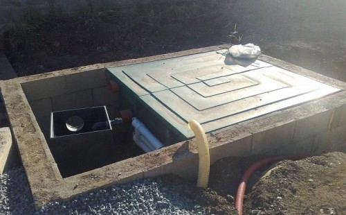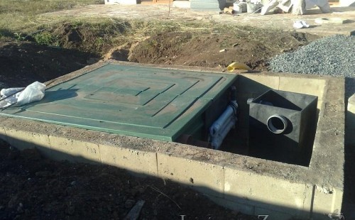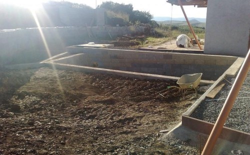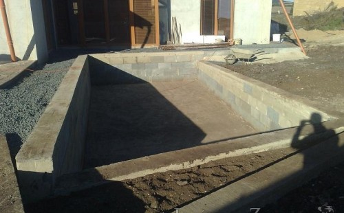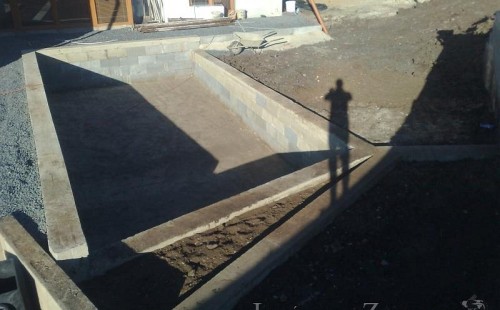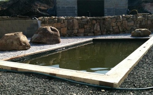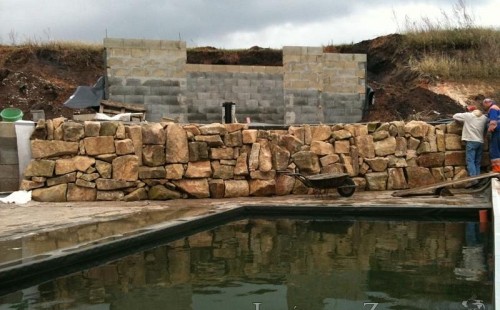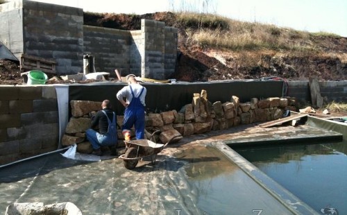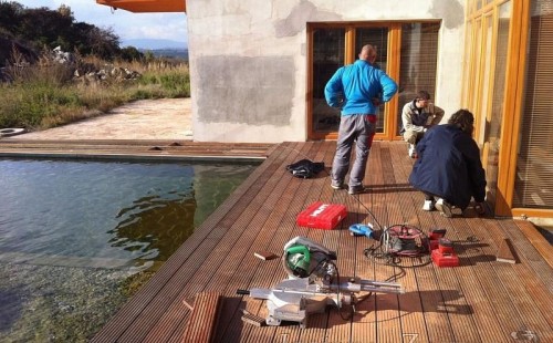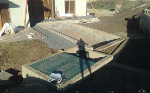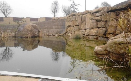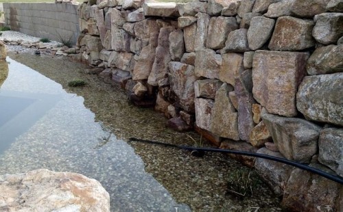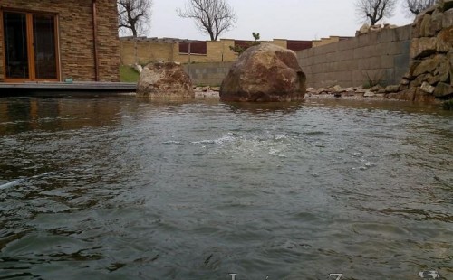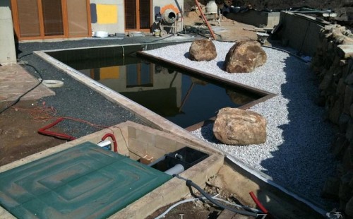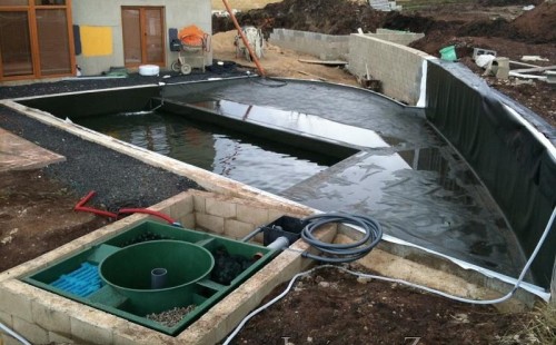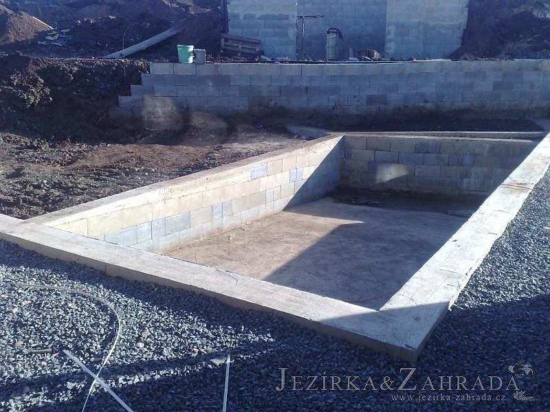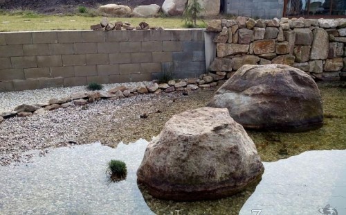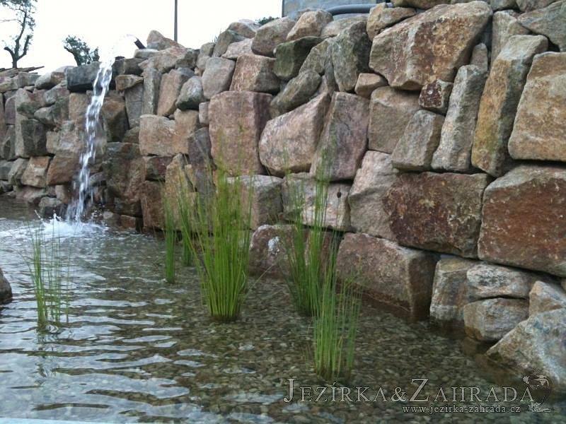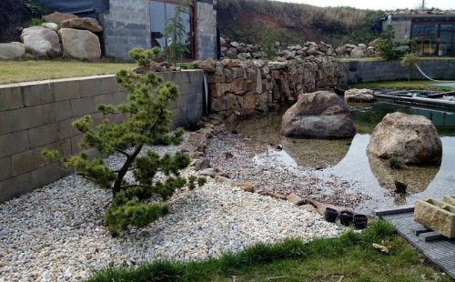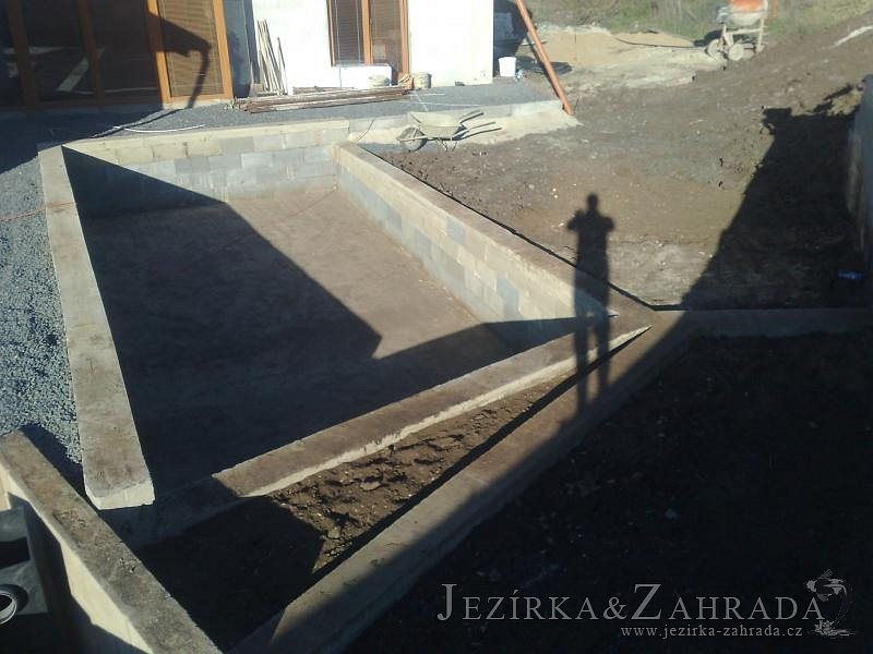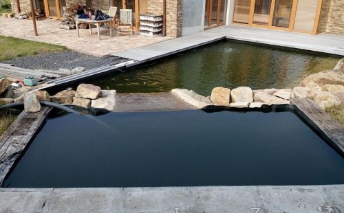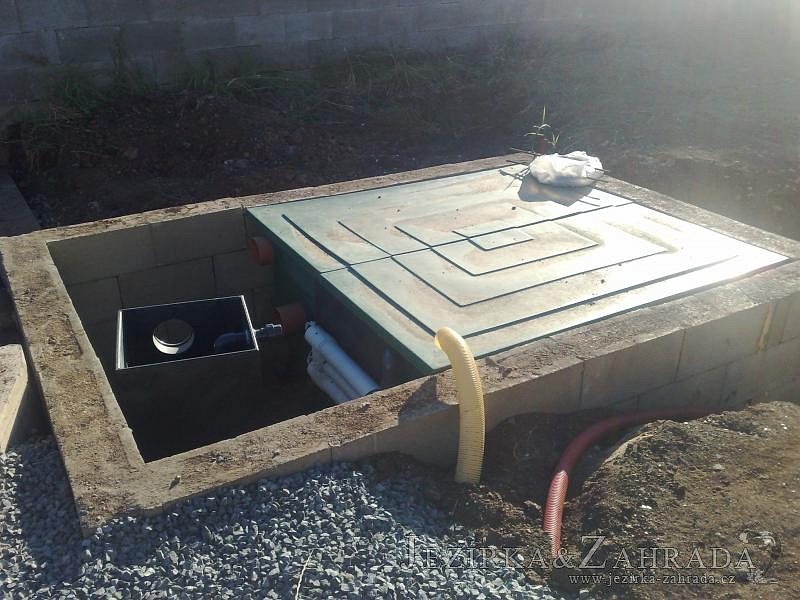 U moderní novostavby si klient přál postavit koupací jezírka o velikosti cca. 65m3. Ze ztraceného bednění se postavil obvod jezírka a technická místnost. Připravilo se potrubí vedoucí k technologii, zabetonovalo se, položila se geotextílie 500g, přidělaly se speciální fóliové lišty pro uchycení jezírkové fólie Fatra Aquaplast 805/V 1,5mm olivově zelené. K jezírku navazuje stěna obložená okrasnými kameny a po nich padá voda z malého horního jezírka. Stavba terasy okolo koupací části z exotického dřeva (Bankgirai). V mělčině je použit kačírek s 2 velkými okrasnými kameny. Systém je zapojen gravitačně: biologicko-mechanická filtrace Tripond Center-Vortex C115, odkalovací jímka s kalovým čerpadlem, UV lampa TMC Pro Pond Advantage 110W, čerpadlo 28000l/hod, vzduchovací čerpadlo Resun LP 100.