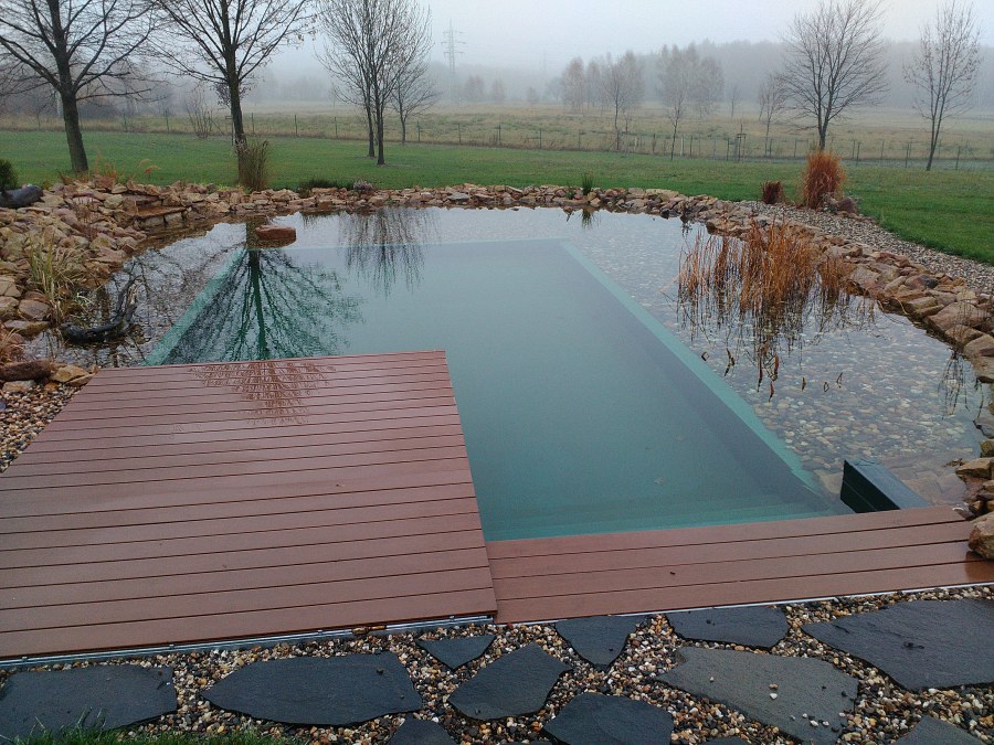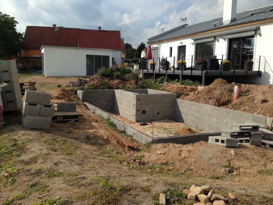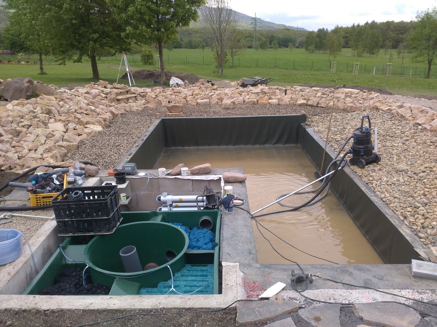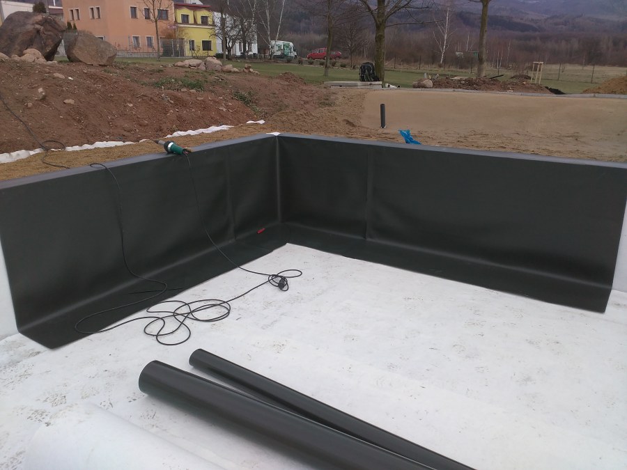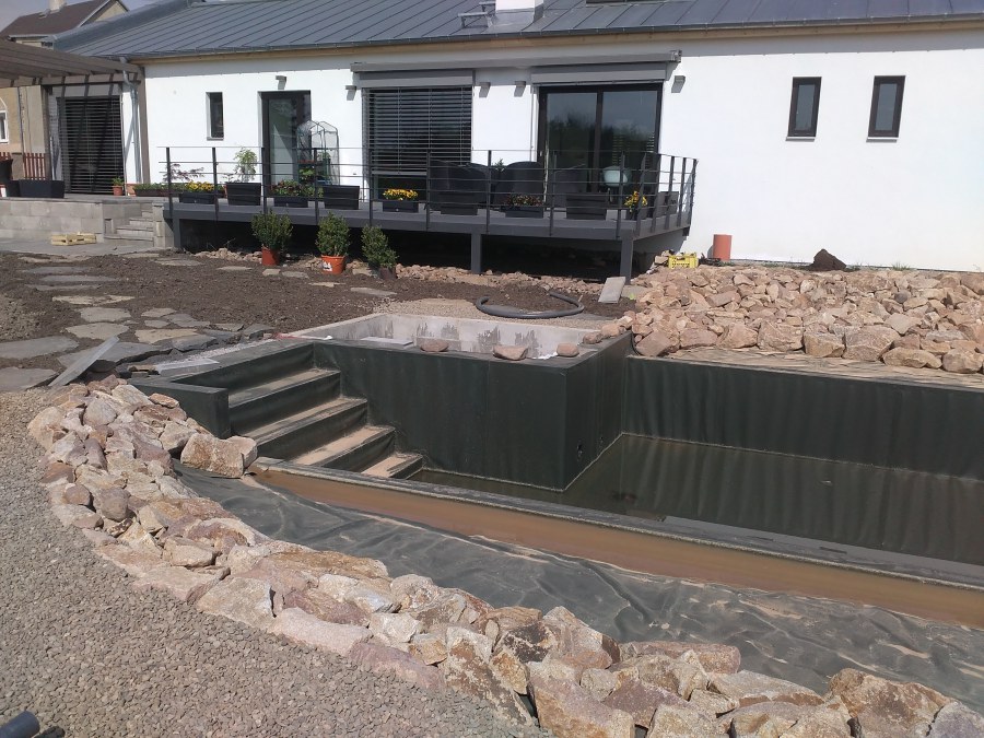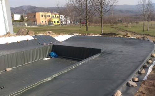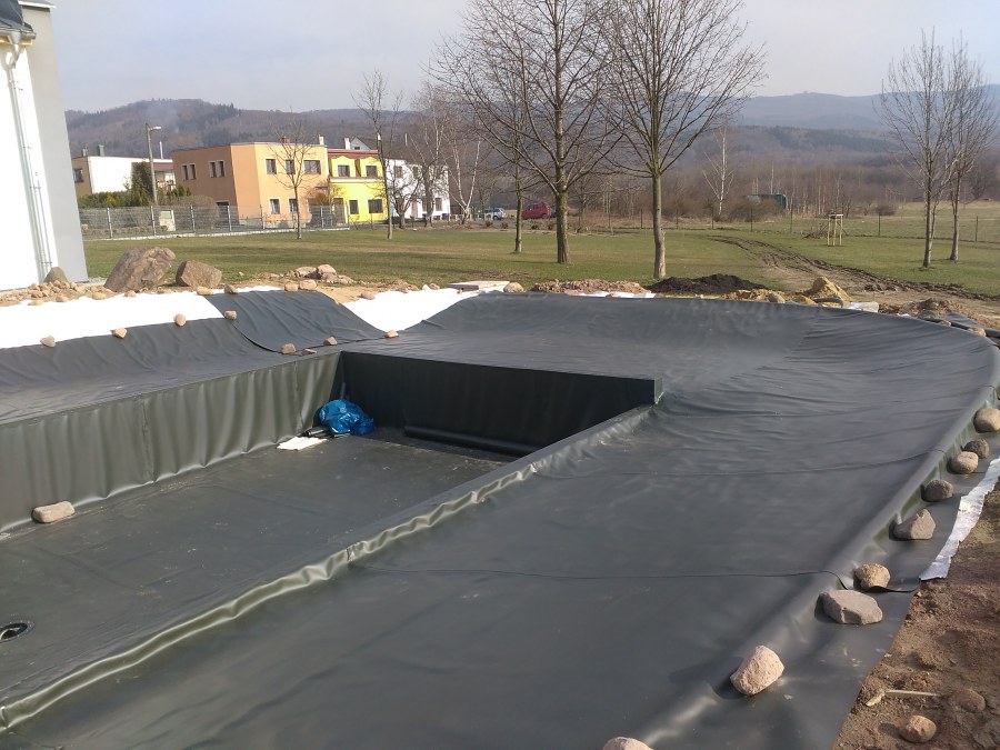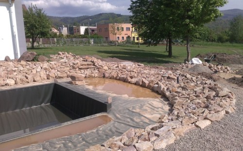 Obrátil se na nás klient s žádostí o výstavbu koupacího jezírka u Chabařovic. Výkopové práce si klient zařídil sám, svépomocí dle našich pokynů. Naše práce začala hned poté. Technici vystavěli základ jezírka a technické místnosti ze ztraceného bednění. Na dno jezírka zabudovali gulu a do stěny k technické místnosti fóliovou přírubu pro skimmer Oase AquaSkim Gravity. Potrubí je vedeno dnem do technické místnosti. Po zarovnání, vyčištění dna a vypískování kopaným pískem se začalo s fóliováním jezírka. Po celé ploše jezírka se natáhla geotextílie 500g, na hrany se připevnili speciální fóliové lišty na upevnění fólie a začalo se svařovat. Fólii používáme Aquaplast 805/V 1,5mm olivově zelenou. Při napouštění jezírka vodou jsme použili vodoměr a tím jsme přesně určili množství vody v jezírku. Technologii na 30m3 vody jsme zvolili biologicko-mechanickou, filtr Tripond Center-Vortex C80, UV lampa TMC Pro Pond Advantage 110W, čerpadlo Oase Aquamax Eco Gravity 15000 a vzduchovací motor Hailea V-60. Pro snadnější údržbu čistoty v jezírku a hlavně na fólii doporučujeme pravidelně používat jezírkový robotický vysavač Zodiac RA 63 iQ Bio Alpha.