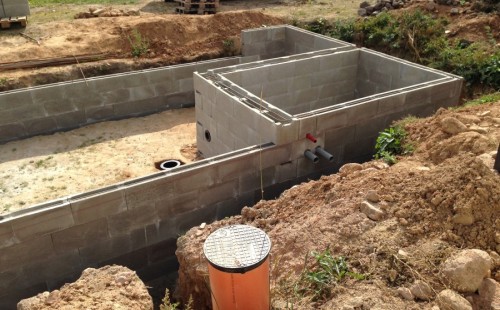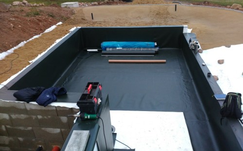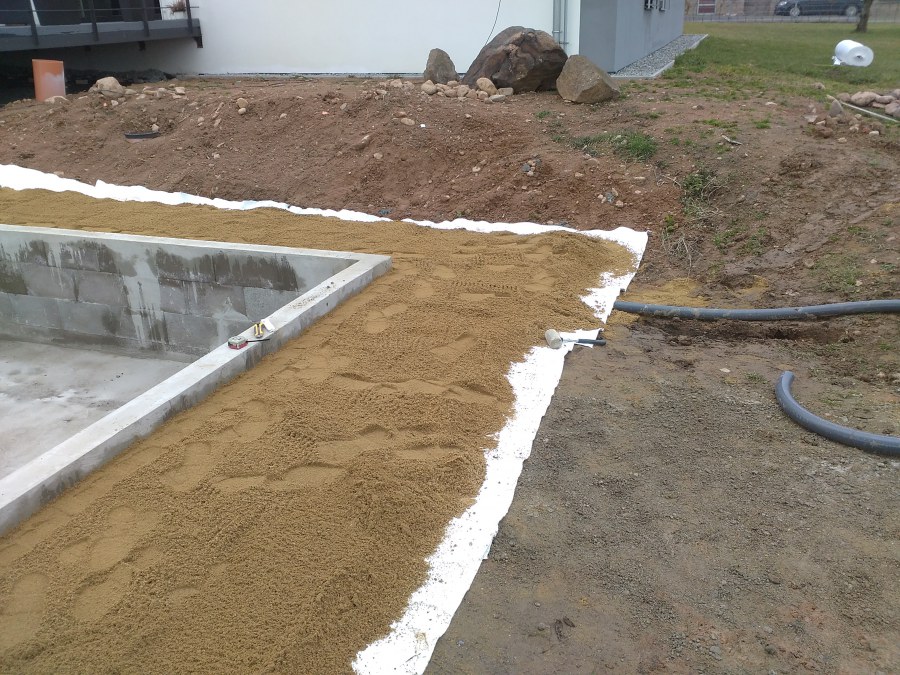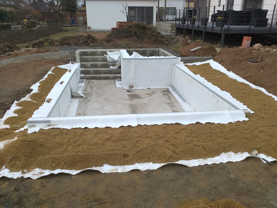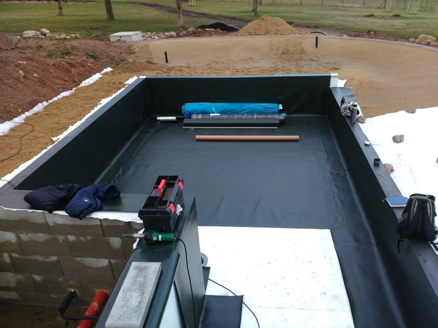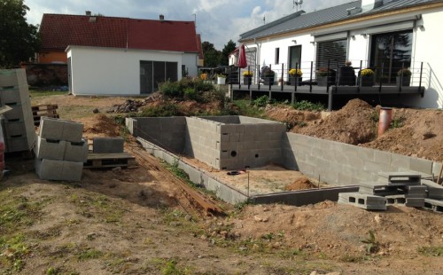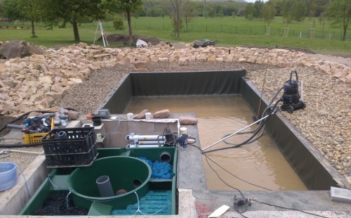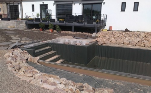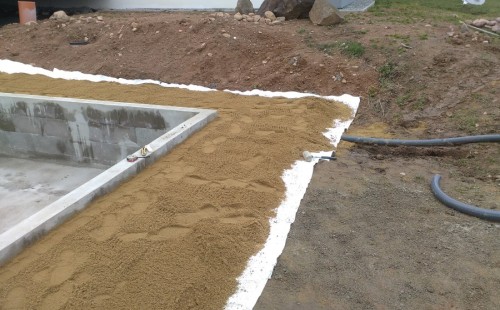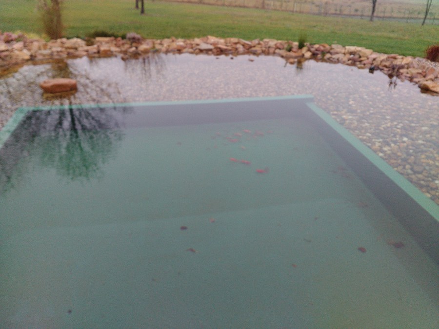Obrátil se na nás klient s žádostí o výstavbu koupacího jezírka u Chabařovic. Výkopové práce si klient zařídil sám, svépomocí dle našich pokynů. Naše práce začala hned poté. Technici vystavěli základ jezírka a technické místnosti ze ztraceného bednění. Na dno jezírka zabudovali gulu a do stěny k technické místnosti fóliovou přírubu pro skimmer Oase AquaSkim Gravity. Potrubí je vedeno dnem do technické místnosti. Po zarovnání, vyčištění dna a vypískování kopaným pískem se začalo s fóliováním jezírka. Po celé ploše jezírka se natáhla geotextílie 500g, na hrany se připevnili speciální fóliové lišty na upevnění fólie a začalo se svařovat. Fólii používáme Aquaplast 805/V 1,5mm olivově zelenou. Při napouštění jezírka vodou jsme použili vodoměr a tím jsme přesně určili množství vody v jezírku. Technologii na 30m3 vody jsme zvolili biologicko-mechanickou, filtr Tripond Center-Vortex C80, UV lampa TMC Pro Pond Advantage 110W, čerpadlo Oase Aquamax Eco Gravity 15000 a vzduchovací motor Hailea V-60. Pro snadnější údržbu čistoty v jezírku a hlavně na fólii doporučujeme pravidelně používat jezírkový robotický vysavač Zodiac RA 63 iQ Bio Alpha.