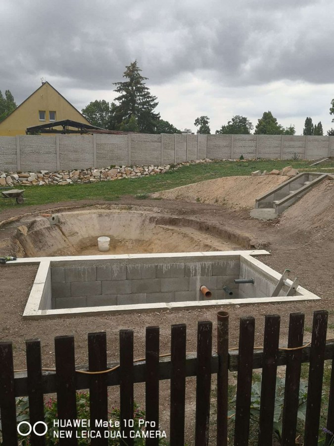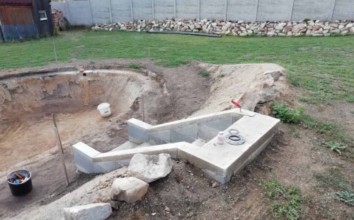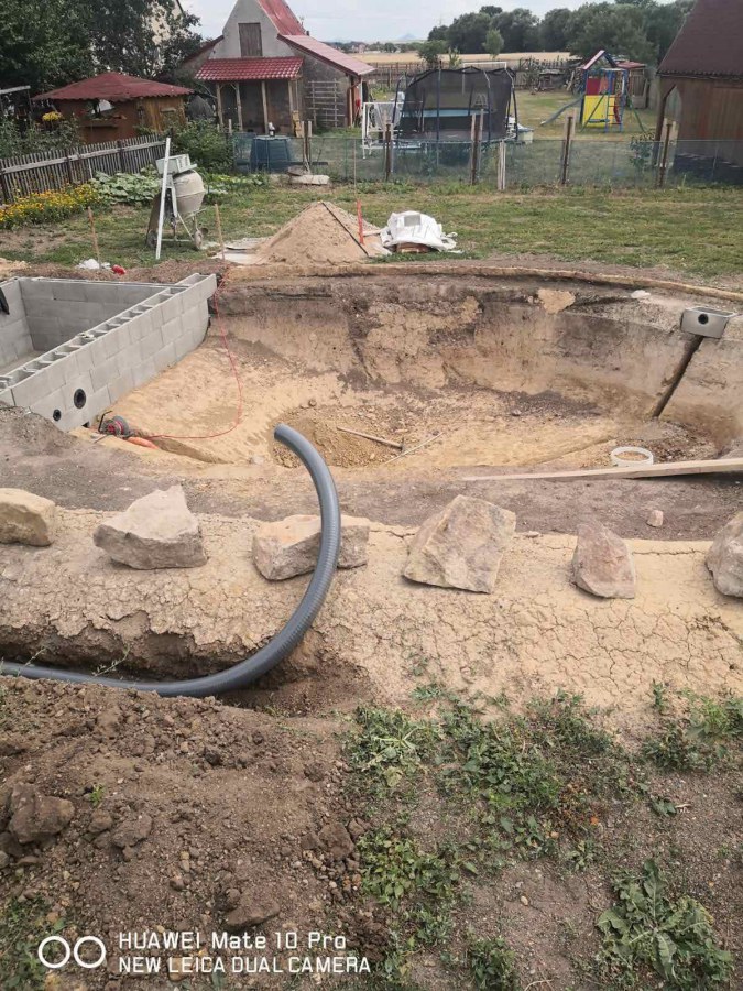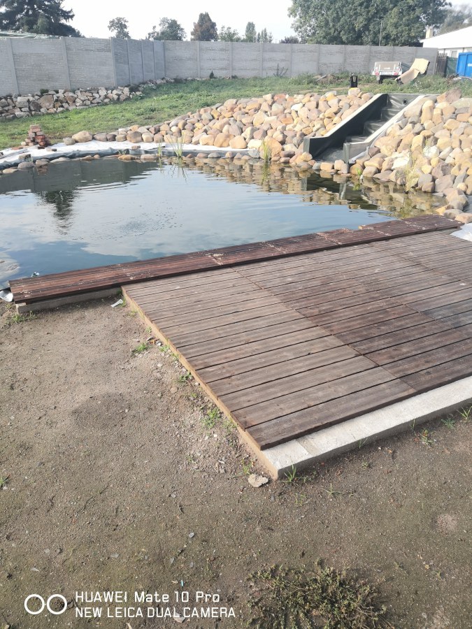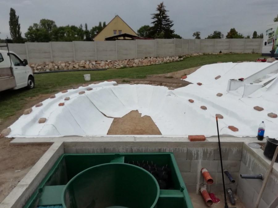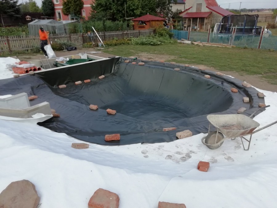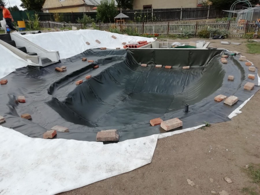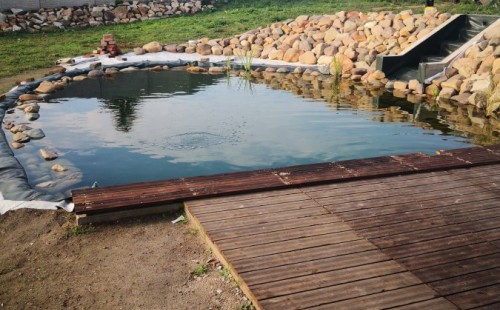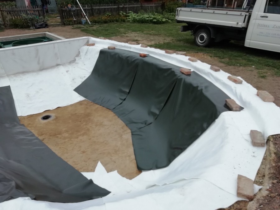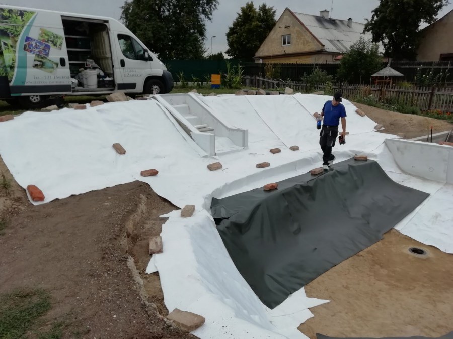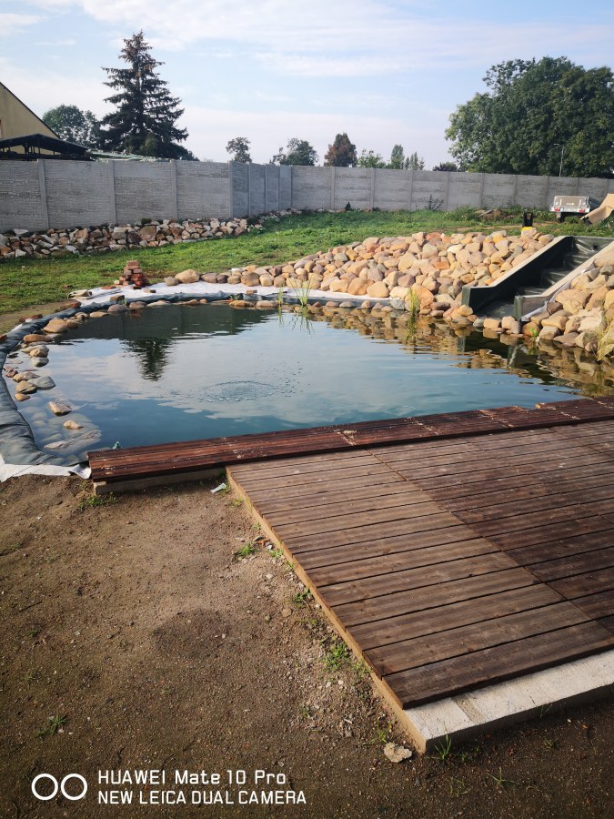 Při stavbě tohoto jezírka jsme jako skoro vždy úzce spolupracovali s klientem. Klient nás navštívil v prodejně, chtěl informace ke stavbě jezírka, měl na pozemku již několik let nedodělanou nádrž na vodu, a napadlo ho ji předělat na koupací jezírko. Na prodejně jsme se mu snažili vše vysvětlit, ukázat a poradit jak postupovat dál. Následně kontaktoval majitele naší firmy, který mu poskytl konzultaci na místě, poradil kam umístit filtr, jak položit potrubí, jak vystavět technickou místnost. Poté si již klient sám vyčistil nádrž, upravil stěny dle našich rad, postavil technickou místnost ze ztraceného bednění, do stěny zabetonoval fóliovou přírubu pro skimmer Oase AquaSkim Gravity a na dno jezírka uložil gulu, natáhl od ní potrubí do technické místnosti, a z technické místnosti vedl hadici, z které potáhne vodu z filtrace do jezírka. Do svahu, který je ihned nad jezírkem vystavěl základ pro vodopád. Poté se jezírko vypískovalo kopaným pískem, pak už mohli naši technici přijet fóliovat. Nejprve položili geotextílii 500g pak na ostrých hranách přivrtali speciální lišty a na ně mohli začít navařovat jezírkovou fólii Fatra Aquaplast 805/V olivově zelenou. Do technické místnosti se usadil biologicko-mechanický filtr Tripond Vortex C-115, UV lampa TMC ProClear 110W, systémové čerpadlo Oase AquaMax Eco Gravity 20000 a efektové čerpadlo AquaForte O-series 18000 na vodopád .