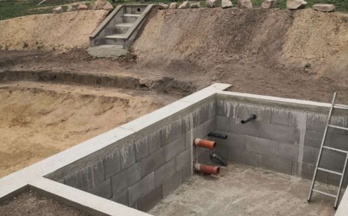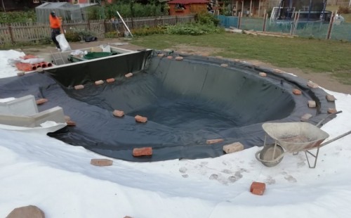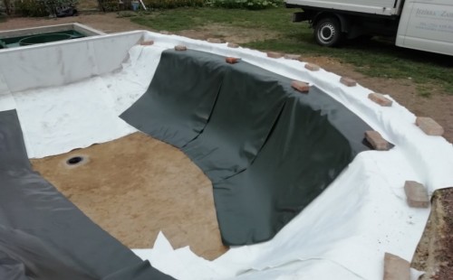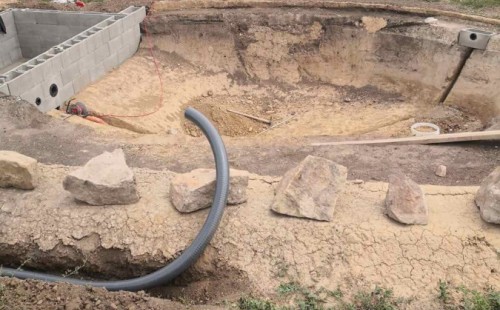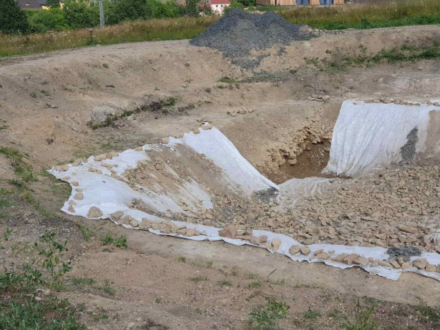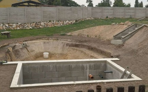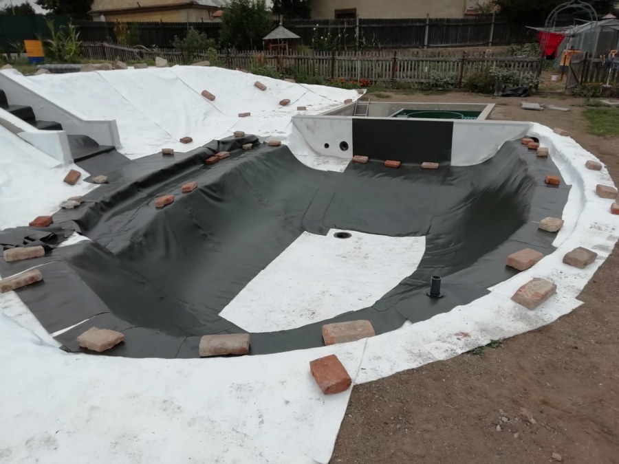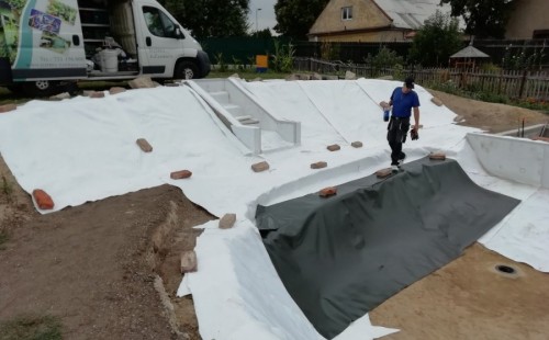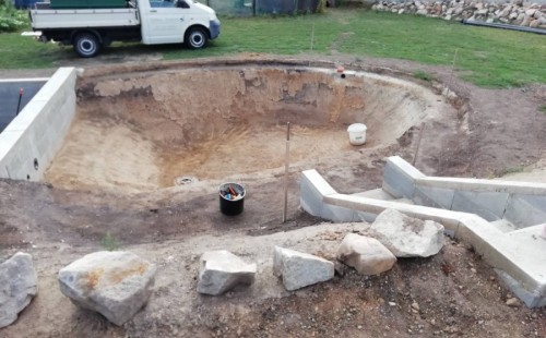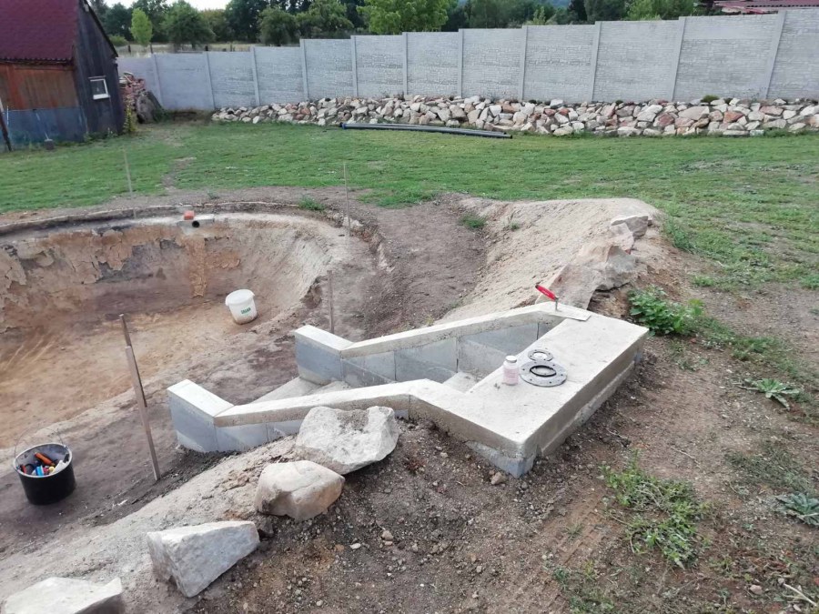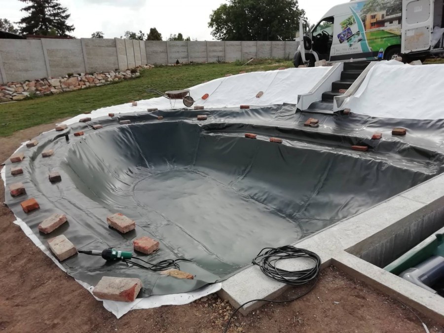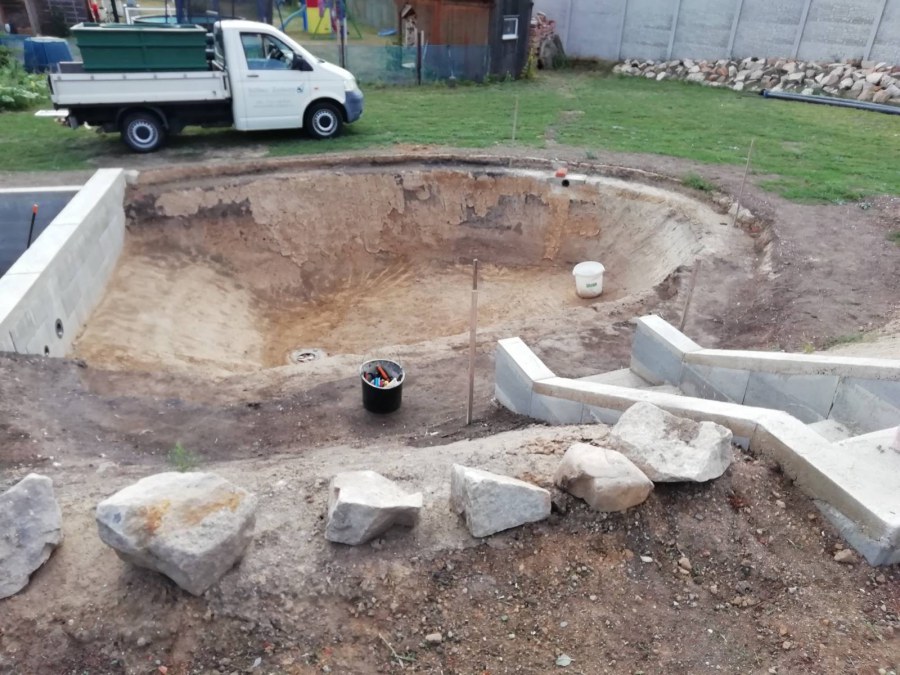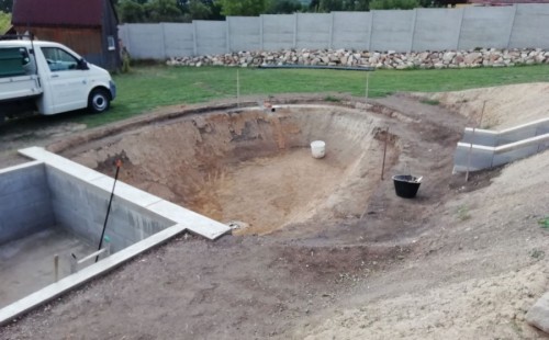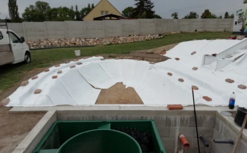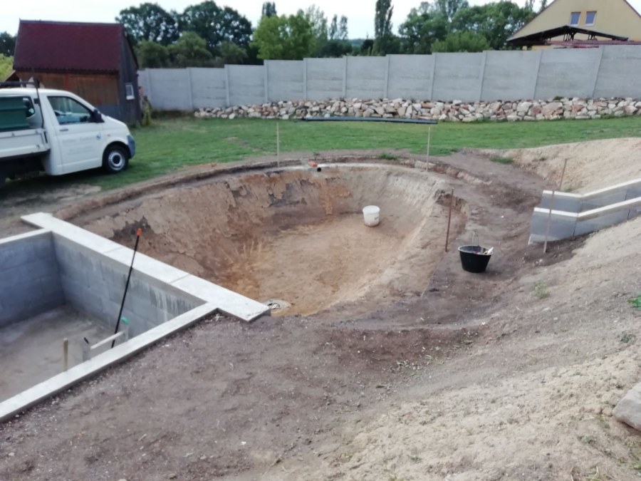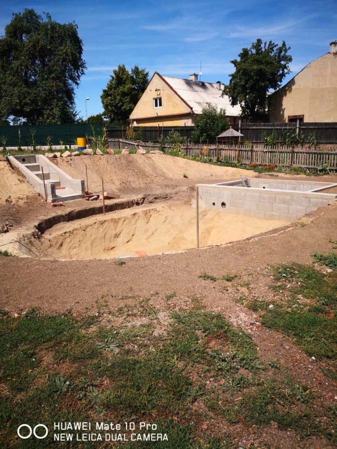 Při stavbě tohoto jezírka jsme jako skoro vždy úzce spolupracovali s klientem. Klient nás navštívil v prodejně, chtěl informace ke stavbě jezírka, měl na pozemku již několik let nedodělanou nádrž na vodu, a napadlo ho ji předělat na koupací jezírko. Na prodejně jsme se mu snažili vše vysvětlit, ukázat a poradit jak postupovat dál. Následně kontaktoval majitele naší firmy, který mu poskytl konzultaci na místě, poradil kam umístit filtr, jak položit potrubí, jak vystavět technickou místnost. Poté si již klient sám vyčistil nádrž, upravil stěny dle našich rad, postavil technickou místnost ze ztraceného bednění, do stěny zabetonoval fóliovou přírubu pro skimmer Oase AquaSkim Gravity a na dno jezírka uložil gulu, natáhl od ní potrubí do technické místnosti, a z technické místnosti vedl hadici, z které potáhne vodu z filtrace do jezírka. Do svahu, který je ihned nad jezírkem vystavěl základ pro vodopád. Poté se jezírko vypískovalo kopaným pískem, pak už mohli naši technici přijet fóliovat. Nejprve položili geotextílii 500g pak na ostrých hranách přivrtali speciální lišty a na ně mohli začít navařovat jezírkovou fólii Fatra Aquaplast 805/V olivově zelenou. Do technické místnosti se usadil biologicko-mechanický filtr Tripond Vortex C-115, UV lampa TMC ProClear 110W, systémové čerpadlo Oase AquaMax Eco Gravity 20000 a efektové čerpadlo AquaForte O-series 18000 na vodopád .