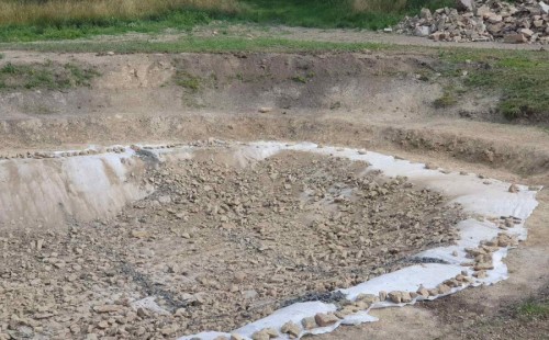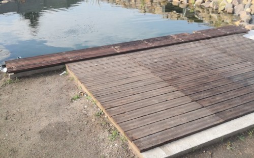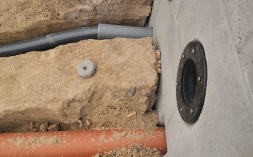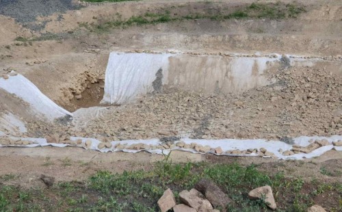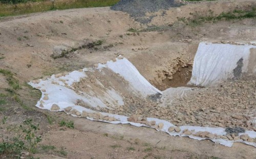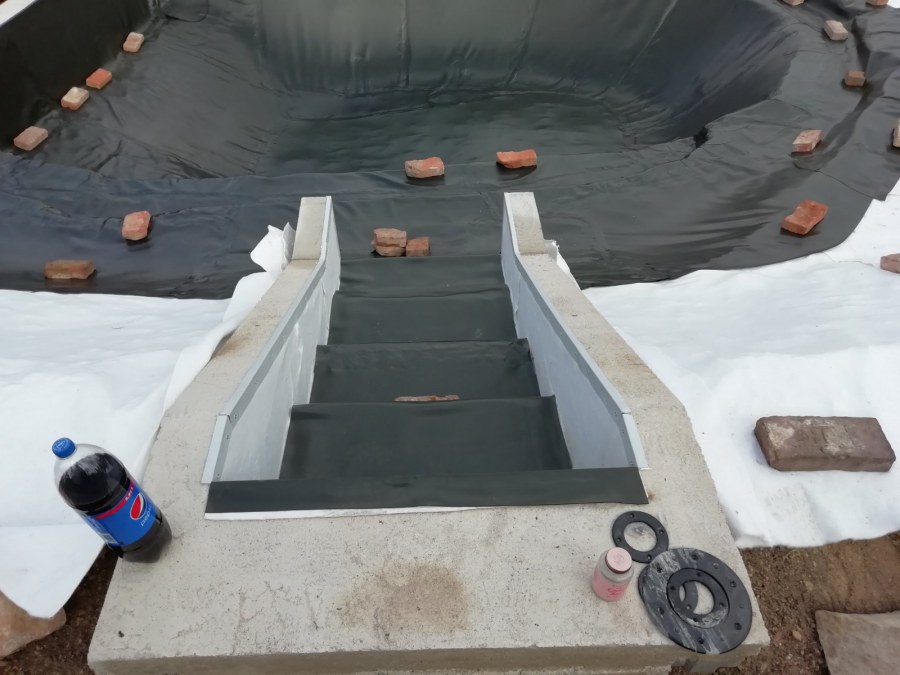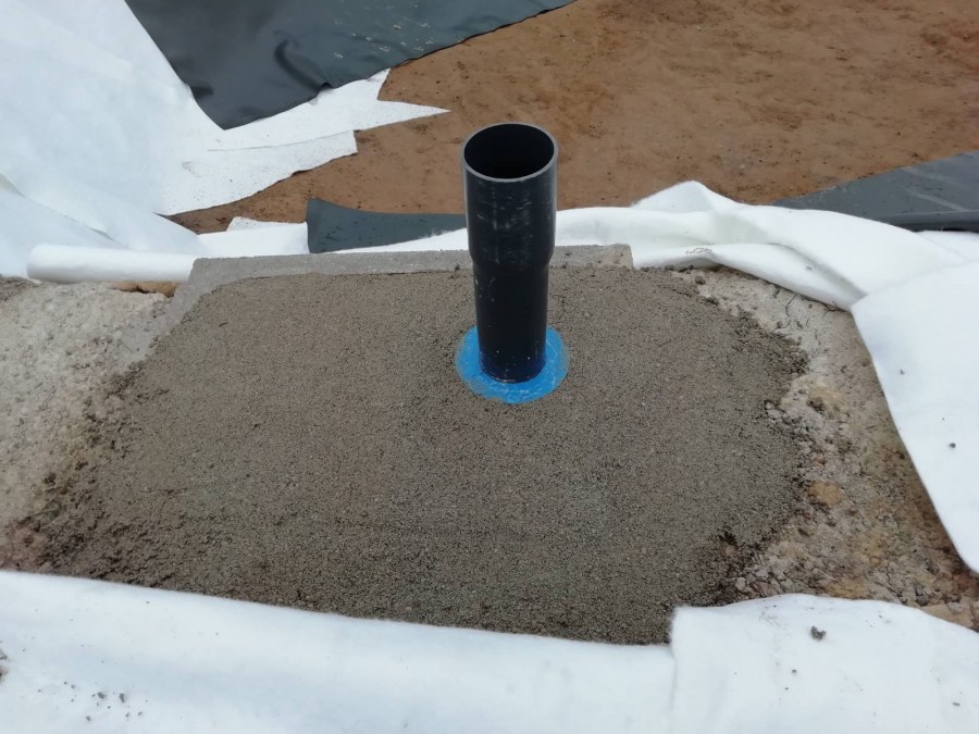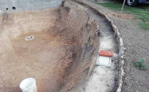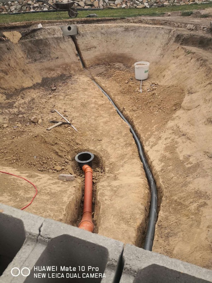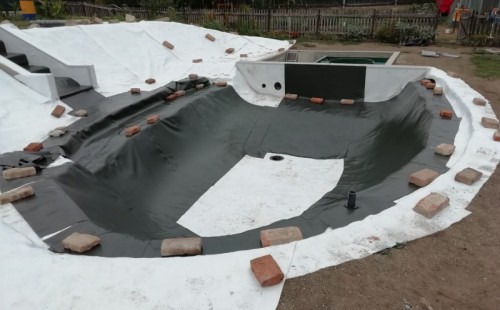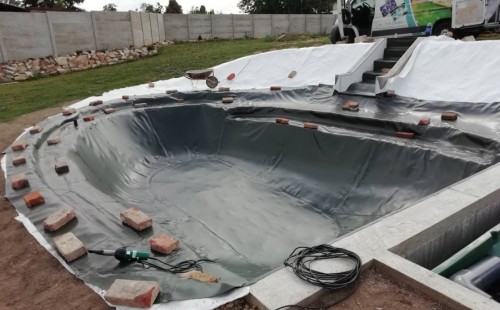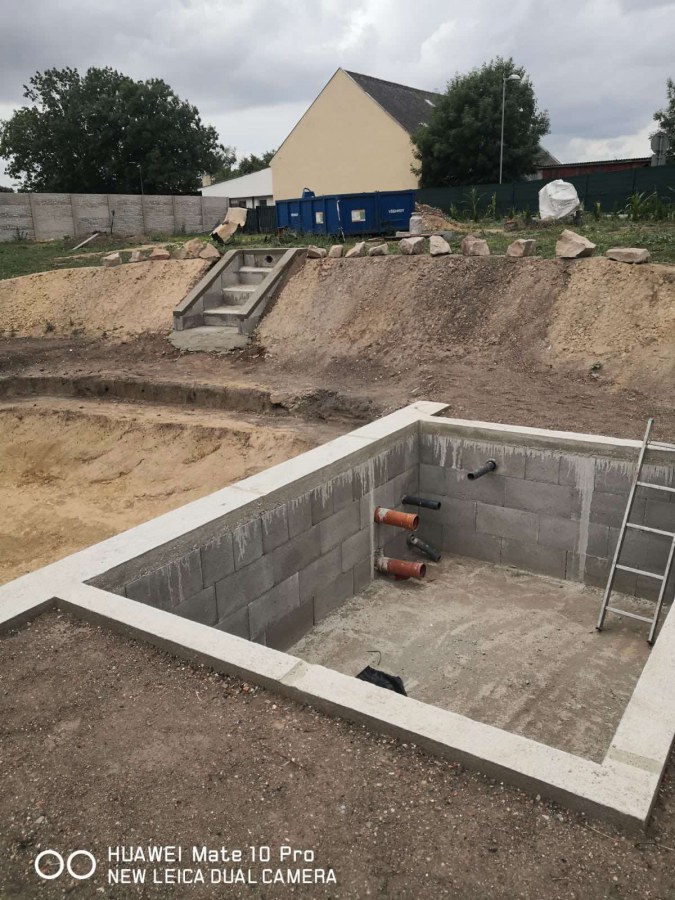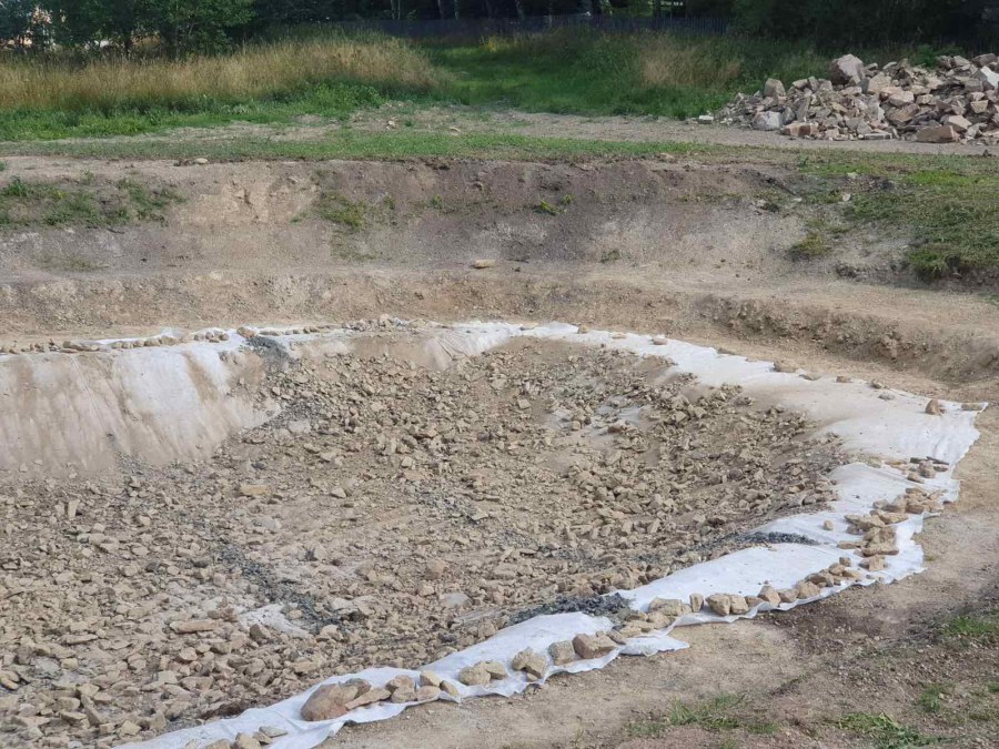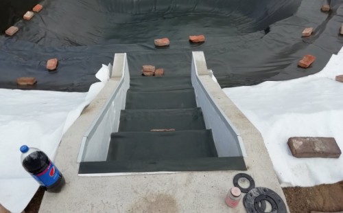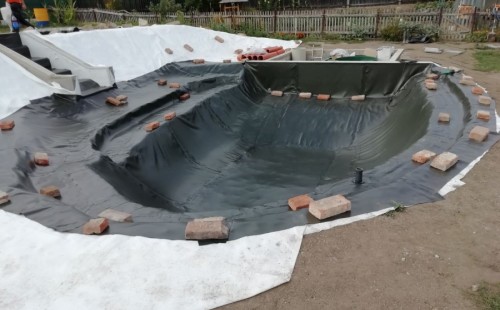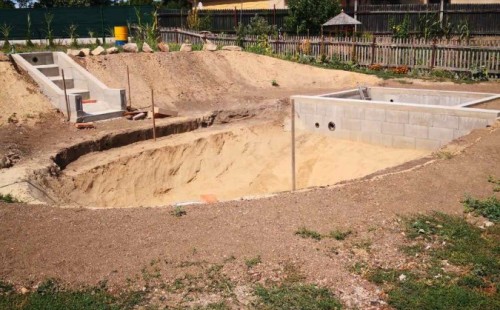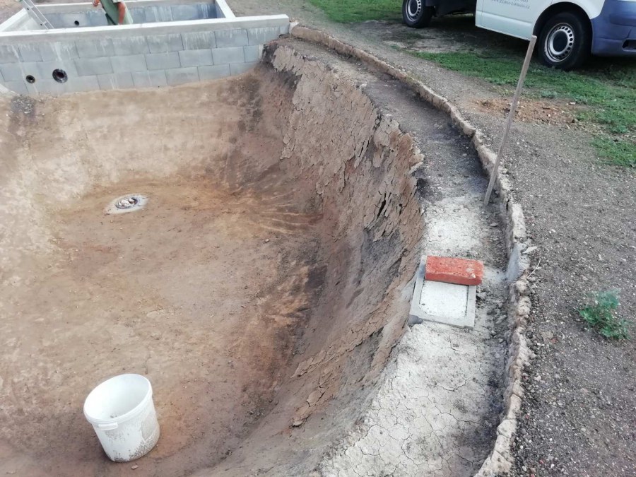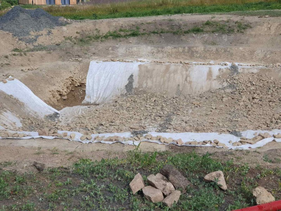 Při stavbě tohoto jezírka jsme jako skoro vždy úzce spolupracovali s klientem. Klient nás navštívil v prodejně, chtěl informace ke stavbě jezírka, měl na pozemku již několik let nedodělanou nádrž na vodu, a napadlo ho ji předělat na koupací jezírko. Na prodejně jsme se mu snažili vše vysvětlit, ukázat a poradit jak postupovat dál. Následně kontaktoval majitele naší firmy, který mu poskytl konzultaci na místě, poradil kam umístit filtr, jak položit potrubí, jak vystavět technickou místnost. Poté si již klient sám vyčistil nádrž, upravil stěny dle našich rad, postavil technickou místnost ze ztraceného bednění, do stěny zabetonoval fóliovou přírubu pro skimmer Oase AquaSkim Gravity a na dno jezírka uložil gulu, natáhl od ní potrubí do technické místnosti, a z technické místnosti vedl hadici, z které potáhne vodu z filtrace do jezírka. Do svahu, který je ihned nad jezírkem vystavěl základ pro vodopád. Poté se jezírko vypískovalo kopaným pískem, pak už mohli naši technici přijet fóliovat. Nejprve položili geotextílii 500g pak na ostrých hranách přivrtali speciální lišty a na ně mohli začít navařovat jezírkovou fólii Fatra Aquaplast 805/V olivově zelenou. Do technické místnosti se usadil biologicko-mechanický filtr Tripond Vortex C-115, UV lampa TMC ProClear 110W, systémové čerpadlo Oase AquaMax Eco Gravity 20000 a efektové čerpadlo AquaForte O-series 18000 na vodopád .