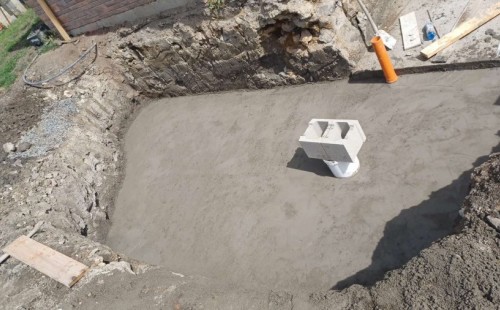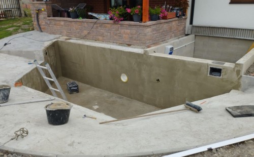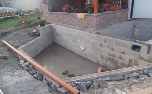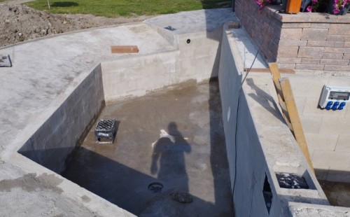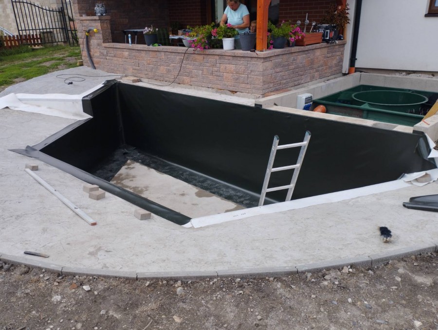 Stavba okrasného jezírka u terasy rodinného domu. Toto jezírko se majitel rozhodl stavit v průběhu sezóny, vzhledem k tomu, že byl připravený si stavební práce provést sám se jezírko mohlo dokončit ještě v létě, vlastně během několika týdnů). Po konzultaci s technikem si postavil hrubou stavbu ze ztraceného bednění, na dno zabetonoval spodní vpusť, gulu, do zdi k technické místnosti stěnový skimmer Oase ProfiSkim Wall 100 a bazénové světlo. Poté stěny, dno a pobřežní zónu pokryl betonovou stěrkou aby bylo vše hladké a nestalo se, že by případné nerovnosti vystupovali pod fólií. Po dokončení těchto prací mohli naši technici začít s pokládkou fólie. Nejprve položili geotextílii 500g, pak ne ostré hrany přivrtali speciální fóliové lišty a na ty následně navařili jezírkovou fólii Fatra Aquaplast 805/V olivově zelenou, tak aby kopírovala tvar jezírka. Po dokončení těchto prací se usadil biologicko-mechanický filtr Tripond Vortex Center C 115, na něj se napojila UV lampa TMC Pro Pond Titan 110W a čerpadlo, které žene vodu zpět do jezírka Oase AquaMax Gravity Eco 20000.