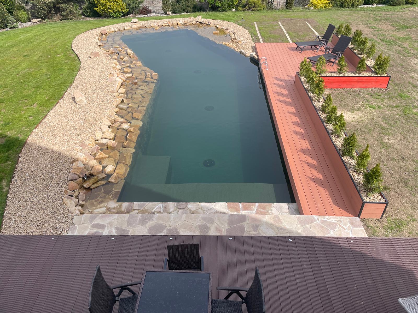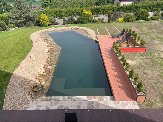 Jedno z posledních koupacích jezírek tohoto roku. S klientem jsme vše plánovali na podzim, ale uvolnilo se nám okno v kalendáři na léto a tak jsme se do toho pustili. Bagrem se vyhloubil tvar jezírka a technické místnosti. Stěny koupací části se zpevnili betonem a technická místnost se vystavěla ze ztraceného bednění. Na dno jezírka se zabetonovali spodní vpusti – gule a do stěny technické místnosti stěnové skimmery Oase ProfiSkim Wall 100, od nich se natáhlo potrubí do technické místnosti. A stavba místnosti se dokončila. Pobřežní zóny se pokryli kopaným pískem, na něj se položila geotextílie 500g, na schody se přes geotextílii navrtali speciální fóliové lišty aby později fólie hezky držela tvar, hned poté se mohlo začít s pokládkou jezírkové fólie Fatra Aquaplast 805/V olivově zelené.