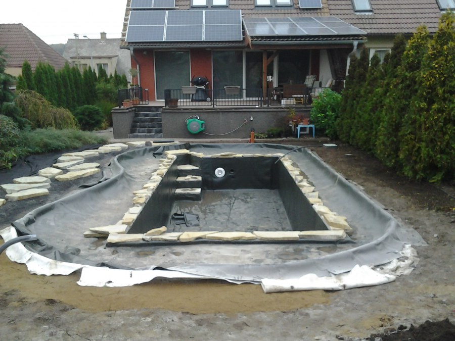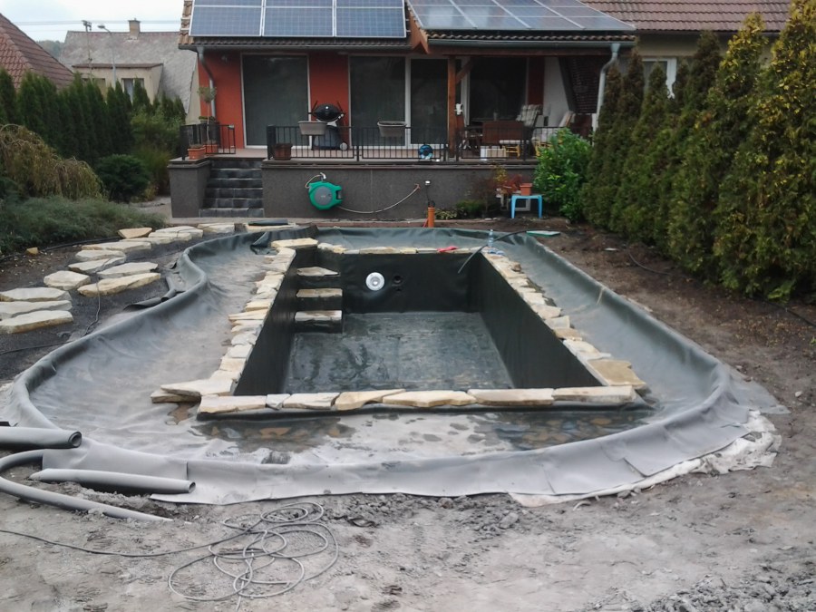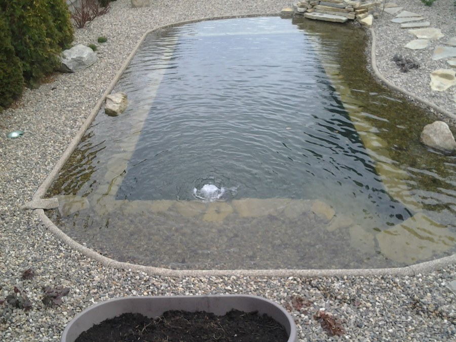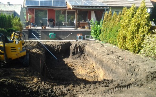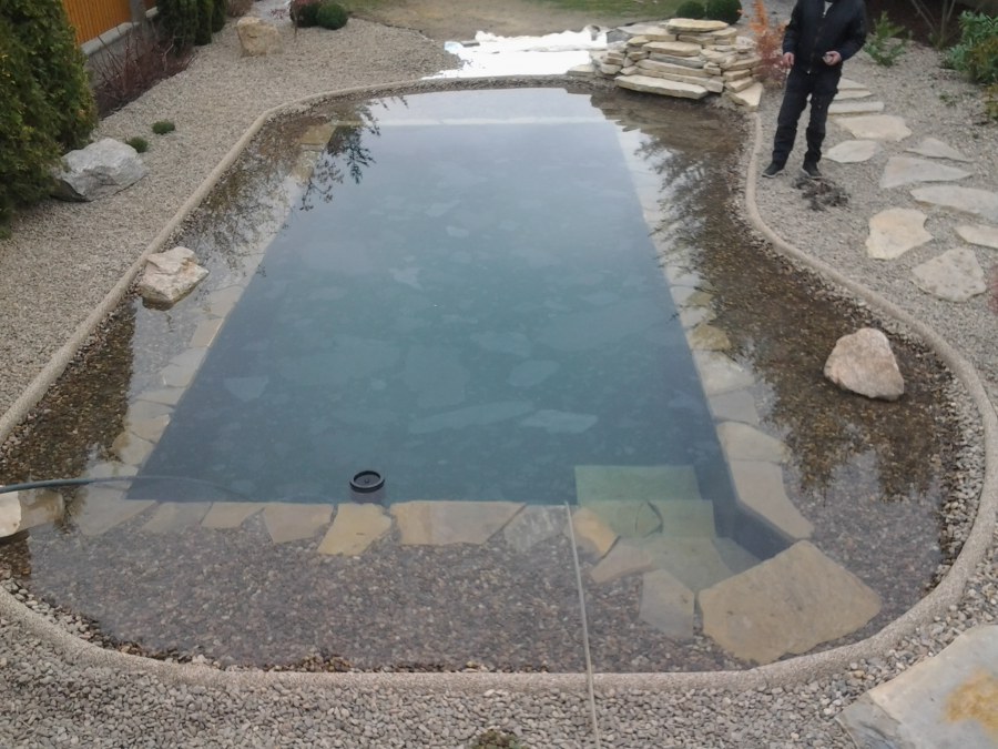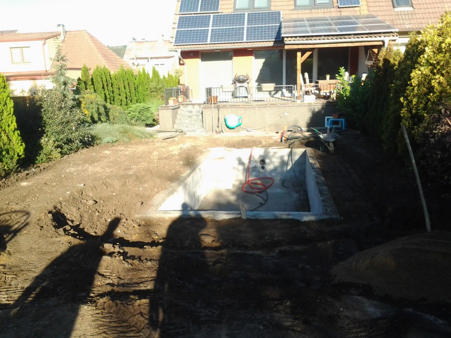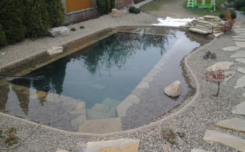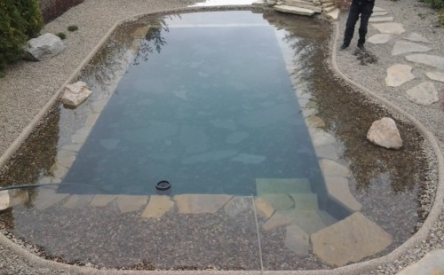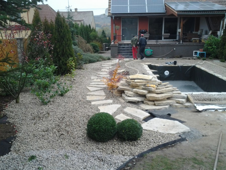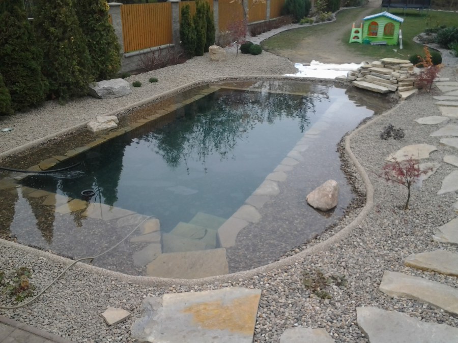 Na přání zákazníka byl nejprve zpracován grafický návrh zahrady. Koncem září započala realizace koupacího jezírka při které zároveň došlo i k celkové úpravě zahrady. Bylo nutné předělat (přeložit) závlahu z důvodu výstavby koupacího jezírka. Vytvořil se tvar jezírka a začala se bagrovat koupací část malým bagříkem. Technická místnost vznikla ve sklepě uvnitř obytného domu, proto bylo nutné vytvořit prostupy pro potrubí. Obvod koupací části byl postaven ze ztraceného bednění, položila se technologie a vytvořily se mělké zóny. Po vystavění odvodu jezírka došlo k protažení potřebných trubek a hadic k technologii. Mělké zóny se vypískovaly a začalo se s pokládkou geotextílie 500g a fólie Fatra Aquaplast 805/V 1,5mm olivově zelené. K foliování se použily speciální lišty na připevnění fólie a přidělalo se bazénové světlo. Následně začala úprava zbytku zahrady, odstranili se a prořezali staré keře. Skrytým obrubníkem se oddělila tráva a zóny kde budou vysázeny nové okrasné keře a rostliny. Zároveň se zapojila závlaha, tak aby správně zalévala co bude potřeba. Byly dosázeny okrasné stromky, keře a byla položena mulčovací textílie proti prorůstání trávy. Na přání zákazníka se položil okrasný kačírek a mulčovací kůra do těchto zón. Z pískovcového kamene se vytvořili pochozí šlapáky kolem jezírka a dále se pak obložil obvod jezírka a obložily se z nich schody v koupacím jezírku. Z pískovce se tvořil i vodopád, který bude napájen extra čerpadlem, aby bylo možno ho zapínat dle potřeby. Mezi šlapáky a do mělkých zón byl naaranžován okrasný kačírek. Pro tento systém bylo navrženo: biologicko-mechanický filtr Tripond Center-Vortex C115, úsporné čerpadlo Oase Aquamax Gravity Eco 15000, UV lampa TMC Pro Pond Advantage 110W, na vodopád bylo použito úsporné čerpadlo AquaForte O-series 10000 + nasávání pro efekt vodopádu, gula dnová spodní 110mm a skimmer Oase AquaSkim Gravity.