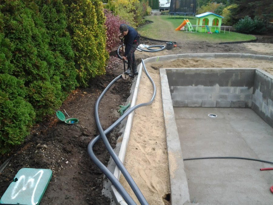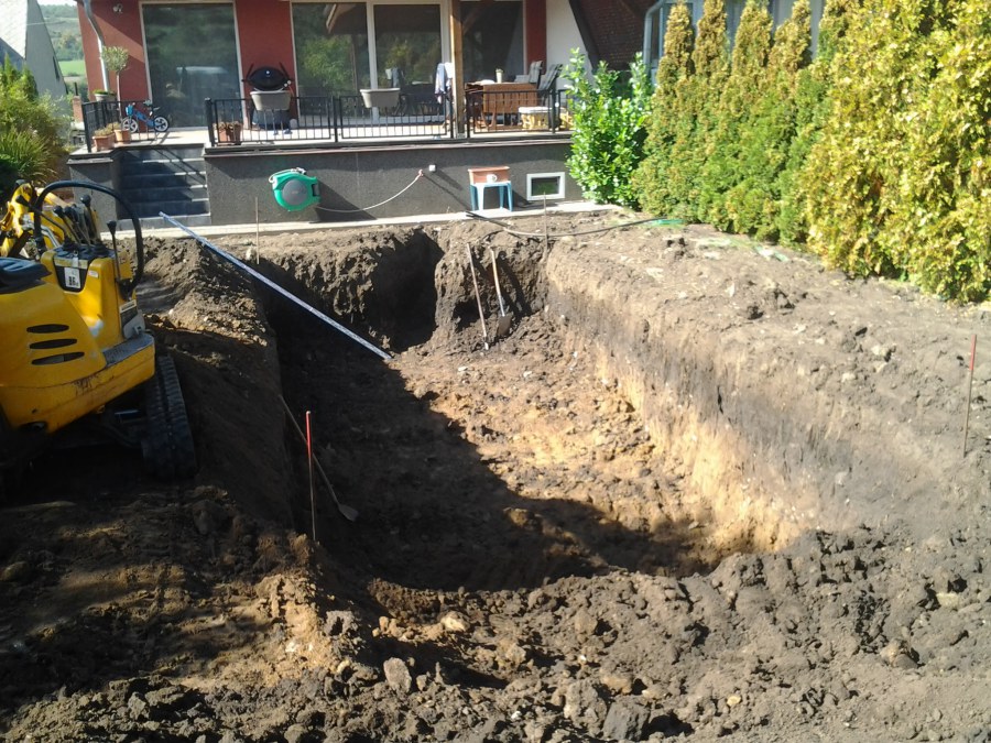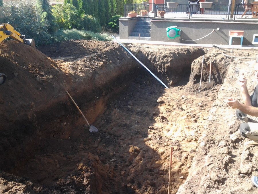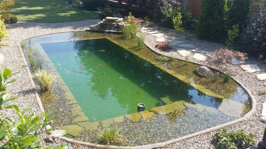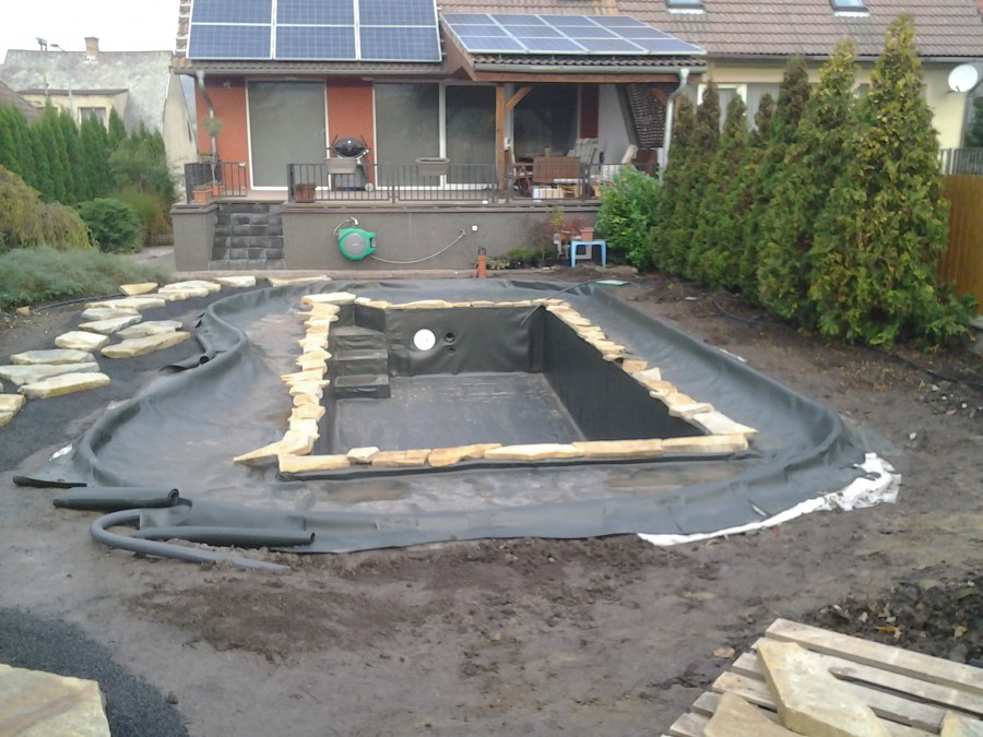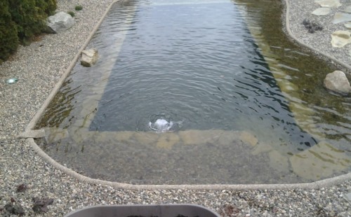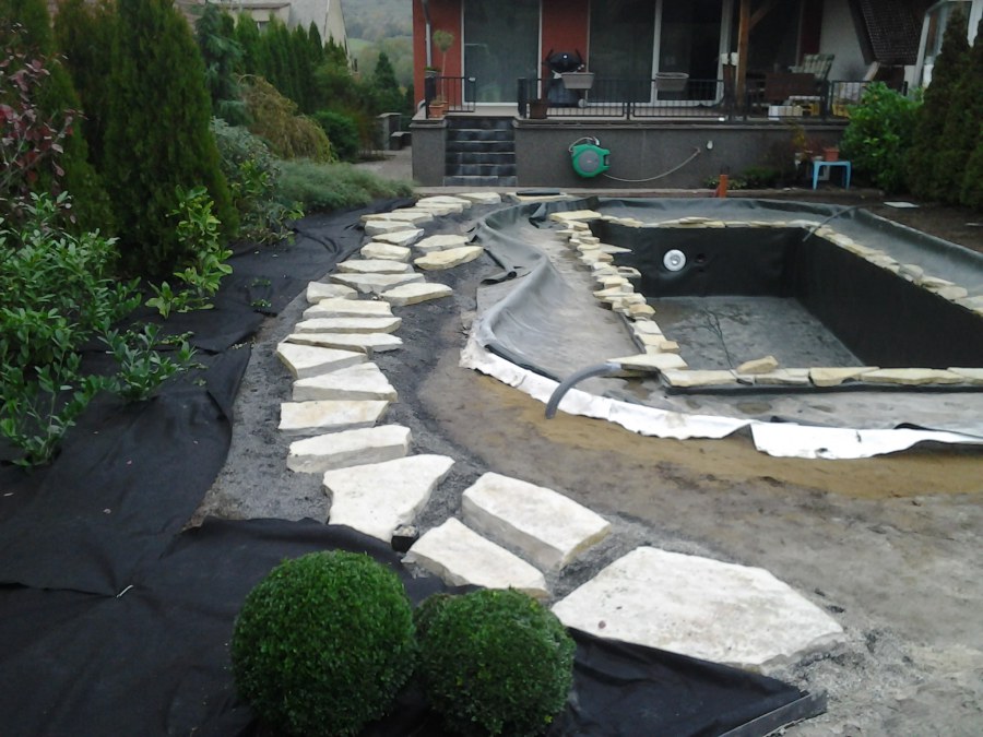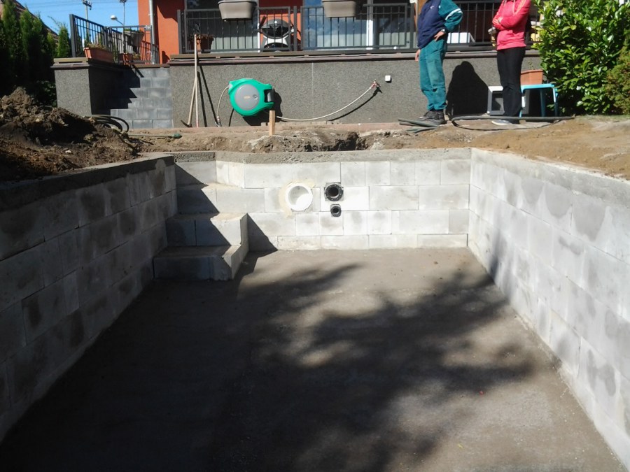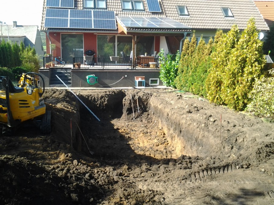 Na přání zákazníka byl nejprve zpracován grafický návrh zahrady. Koncem září započala realizace koupacího jezírka při které zároveň došlo i k celkové úpravě zahrady. Bylo nutné předělat (přeložit) závlahu z důvodu výstavby koupacího jezírka. Vytvořil se tvar jezírka a začala se bagrovat koupací část malým bagříkem. Technická místnost vznikla ve sklepě uvnitř obytného domu, proto bylo nutné vytvořit prostupy pro potrubí. Obvod koupací části byl postaven ze ztraceného bednění, položila se technologie a vytvořily se mělké zóny. Po vystavění odvodu jezírka došlo k protažení potřebných trubek a hadic k technologii. Mělké zóny se vypískovaly a začalo se s pokládkou geotextílie 500g a fólie Fatra Aquaplast 805/V 1,5mm olivově zelené. K foliování se použily speciální lišty na připevnění fólie a přidělalo se bazénové světlo. Následně začala úprava zbytku zahrady, odstranili se a prořezali staré keře. Skrytým obrubníkem se oddělila tráva a zóny kde budou vysázeny nové okrasné keře a rostliny. Zároveň se zapojila závlaha, tak aby správně zalévala co bude potřeba. Byly dosázeny okrasné stromky, keře a byla položena mulčovací textílie proti prorůstání trávy. Na přání zákazníka se položil okrasný kačírek a mulčovací kůra do těchto zón. Z pískovcového kamene se vytvořili pochozí šlapáky kolem jezírka a dále se pak obložil obvod jezírka a obložily se z nich schody v koupacím jezírku. Z pískovce se tvořil i vodopád, který bude napájen extra čerpadlem, aby bylo možno ho zapínat dle potřeby. Mezi šlapáky a do mělkých zón byl naaranžován okrasný kačírek. Pro tento systém bylo navrženo: biologicko-mechanický filtr Tripond Center-Vortex C115, úsporné čerpadlo Oase Aquamax Gravity Eco 15000, UV lampa TMC Pro Pond Advantage 110W, na vodopád bylo použito úsporné čerpadlo AquaForte O-series 10000 + nasávání pro efekt vodopádu, gula dnová spodní 110mm a skimmer Oase AquaSkim Gravity.