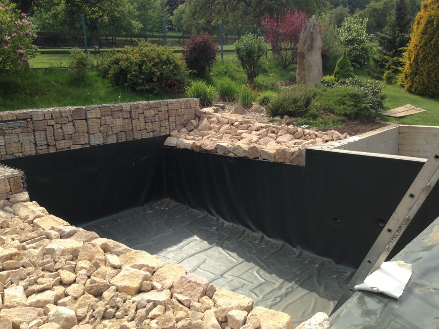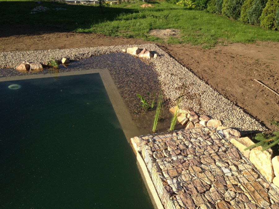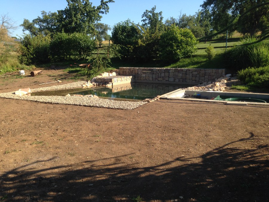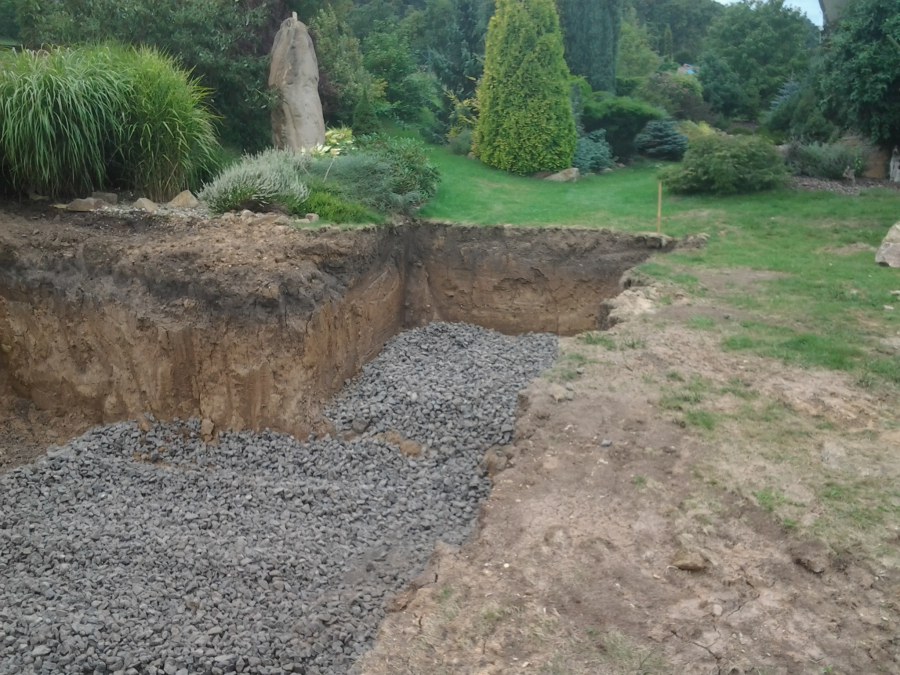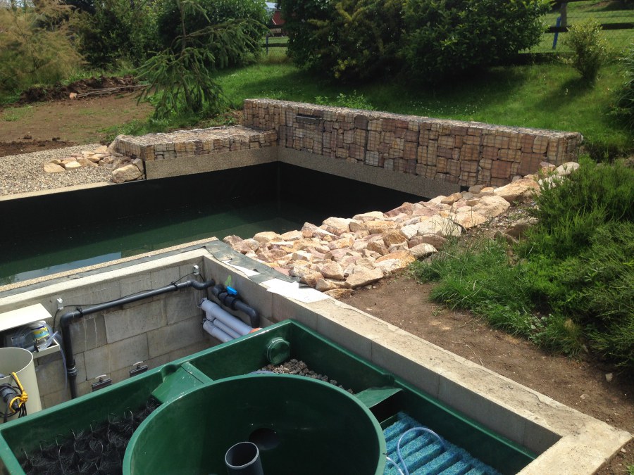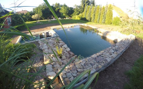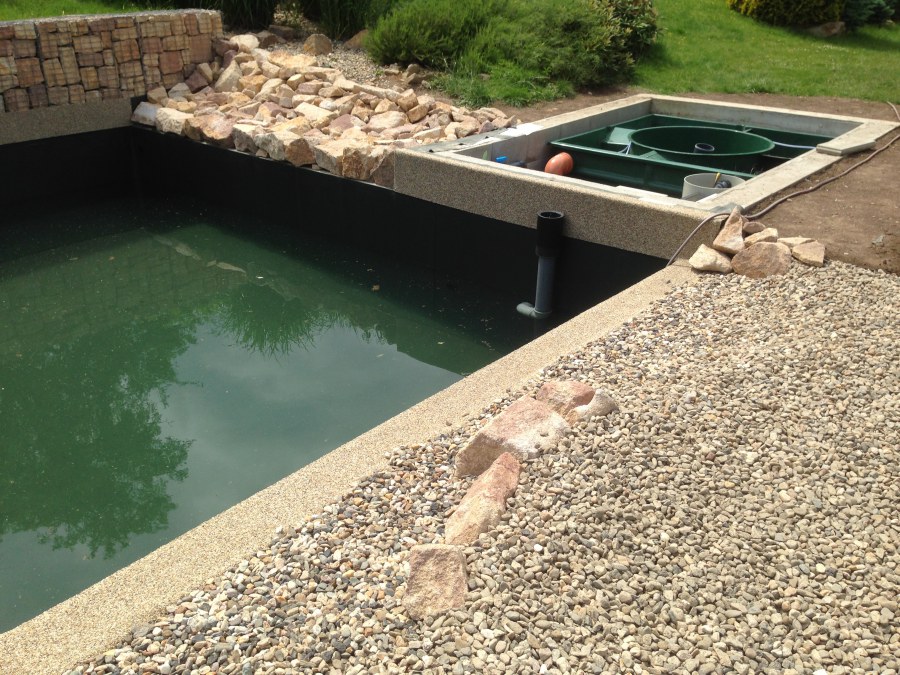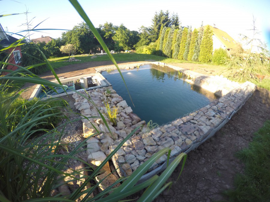 V záři 2015 započala výstavba koupacího jezírka v Drahkově u Teplic. Po vytýčení tvaru jezírka došlo k vyhrabání jezírka bagříkem. Poté bylo dno vysypáno štěrkem pro jeho zpevnění. Koupací část a technická místnost byla vystavěna ze ztraceného bednění. Na fotografiích jsou detaily postupů přípravy na protažení technologie a pro umístění bazénového světla 300W. Jezírko se vybetonovalo a byla položena geotextílie 500 g, na hrany se připevnily speciální lišty pro upevnění fólie a svařila se na míru jezírková fólie Aquaplast 805/V 1,5 mm olivově zelená. Dominantou tohoto koupacího jezírka je gabion s vestavěným nerezovým chrličem Oase Waterfall 60. Pro toto jezírko o velikosti 37 m3 byla použita technologie: bilogicko-mechanický filtr Tripond Center-Vortex C115, UV lampa TMC Pro Pond Advantage 110W, čerpadlo Oase Aquamax Gravity Eco 20000, efektové čerpadlo pro vodopád Aquaking ECO-FTP 13000, vzduchovací motor Hailea HAP-80, elektrický rozvaděč na 7 zásuvek a zásuvky na dálkové ovládání Oase Inscenio FM Master 3. Pro odvod kalů byla použita odkalovací jímka včetně kalového čerpadla.