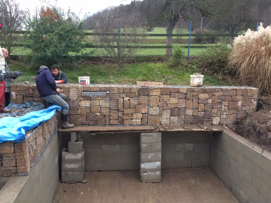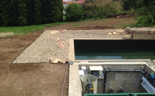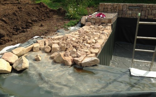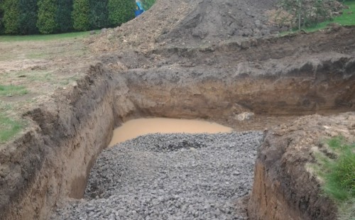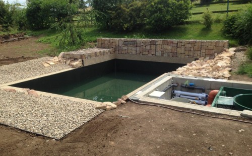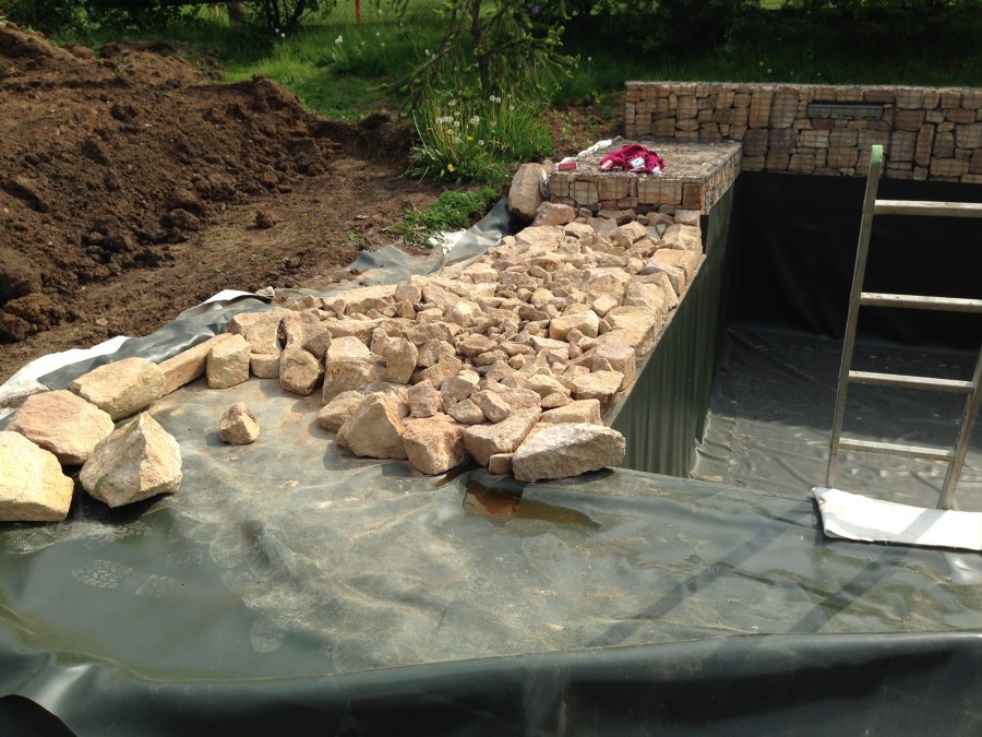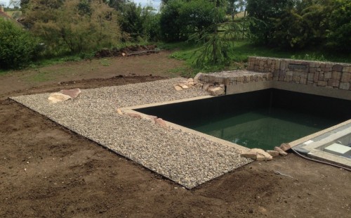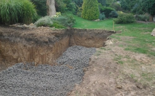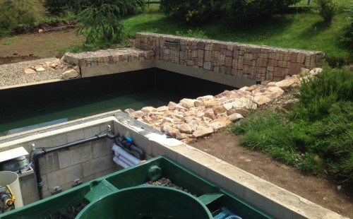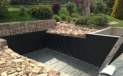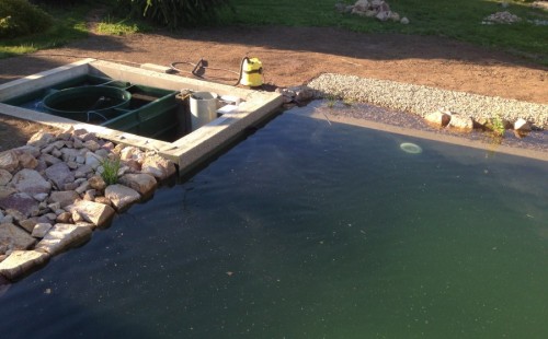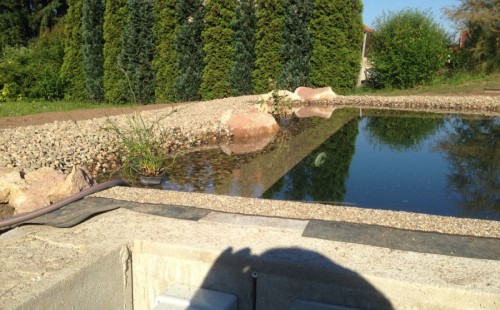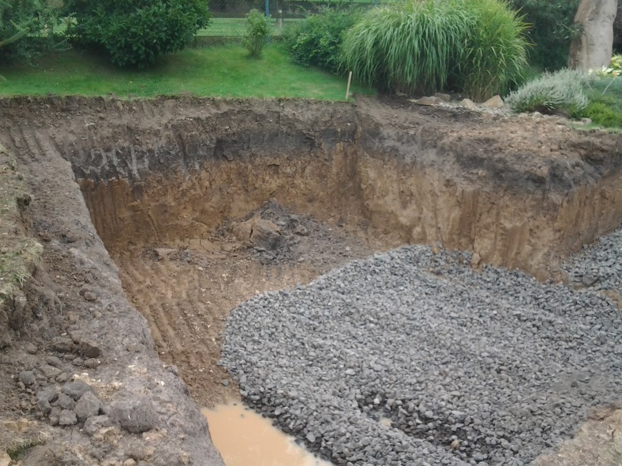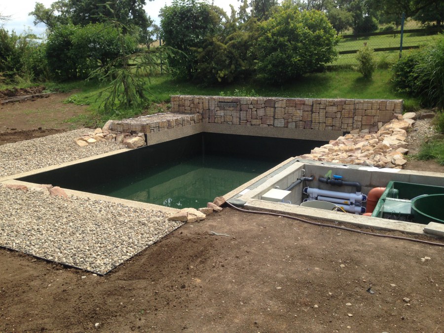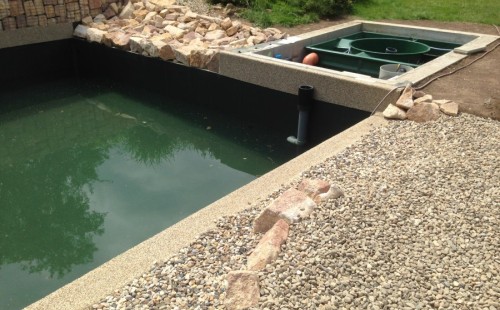 V záři 2015 započala výstavba koupacího jezírka v Drahkově u Teplic. Po vytýčení tvaru jezírka došlo k vyhrabání jezírka bagříkem. Poté bylo dno vysypáno štěrkem pro jeho zpevnění. Koupací část a technická místnost byla vystavěna ze ztraceného bednění. Na fotografiích jsou detaily postupů přípravy na protažení technologie a pro umístění bazénového světla 300W. Jezírko se vybetonovalo a byla položena geotextílie 500 g, na hrany se připevnily speciální lišty pro upevnění fólie a svařila se na míru jezírková fólie Aquaplast 805/V 1,5 mm olivově zelená. Dominantou tohoto koupacího jezírka je gabion s vestavěným nerezovým chrličem Oase Waterfall 60. Pro toto jezírko o velikosti 37 m3 byla použita technologie: bilogicko-mechanický filtr Tripond Center-Vortex C115, UV lampa TMC Pro Pond Advantage 110W, čerpadlo Oase Aquamax Gravity Eco 20000, efektové čerpadlo pro vodopád Aquaking ECO-FTP 13000, vzduchovací motor Hailea HAP-80, elektrický rozvaděč na 7 zásuvek a zásuvky na dálkové ovládání Oase Inscenio FM Master 3. Pro odvod kalů byla použita odkalovací jímka včetně kalového čerpadla.