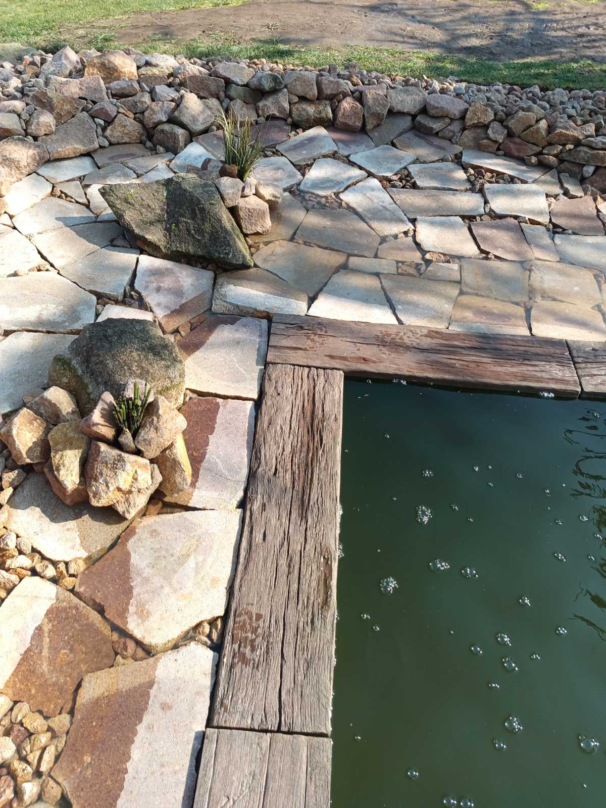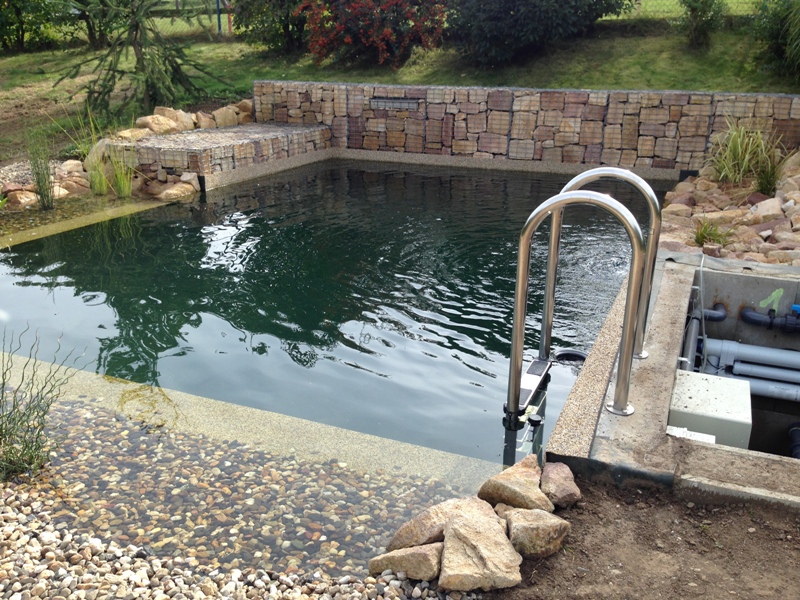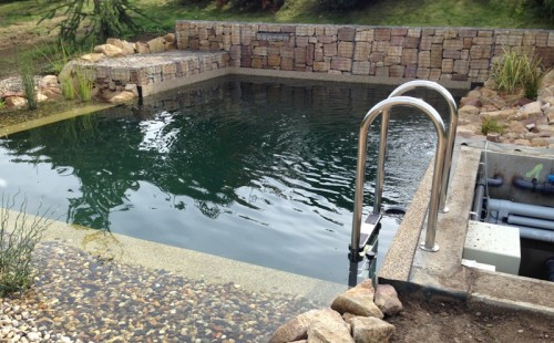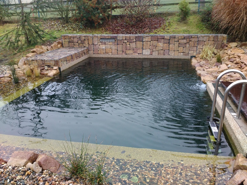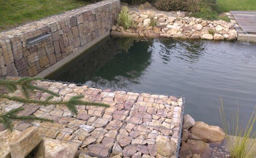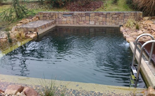 V záři 2015 započala výstavba koupacího jezírka v Drahkově u Teplic. Po vytýčení tvaru jezírka došlo k vyhrabání jezírka bagříkem. Poté bylo dno vysypáno štěrkem pro jeho zpevnění. Koupací část a technická místnost byla vystavěna ze ztraceného bednění. Na fotografiích jsou detaily postupů přípravy na protažení technologie a pro umístění bazénového světla 300W. Jezírko se vybetonovalo a byla položena geotextílie 500 g, na hrany se připevnily speciální lišty pro upevnění fólie a svařila se na míru jezírková fólie Aquaplast 805/V 1,5 mm olivově zelená. Dominantou tohoto koupacího jezírka je gabion s vestavěným nerezovým chrličem Oase Waterfall 60. Pro toto jezírko o velikosti 37 m3 byla použita technologie: bilogicko-mechanický filtr Tripond Center-Vortex C115, UV lampa TMC Pro Pond Advantage 110W, čerpadlo Oase Aquamax Gravity Eco 20000, efektové čerpadlo pro vodopád Aquaking ECO-FTP 13000, vzduchovací motor Hailea HAP-80, elektrický rozvaděč na 7 zásuvek a zásuvky na dálkové ovládání Oase Inscenio FM Master 3. Pro odvod kalů byla použita odkalovací jímka včetně kalového čerpadla. Pro snadnější údržbu dna a stěn jezírka vždy doporučujeme použití robotického vysavače Zodiac Ra 63 iQ Bio.