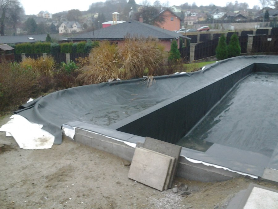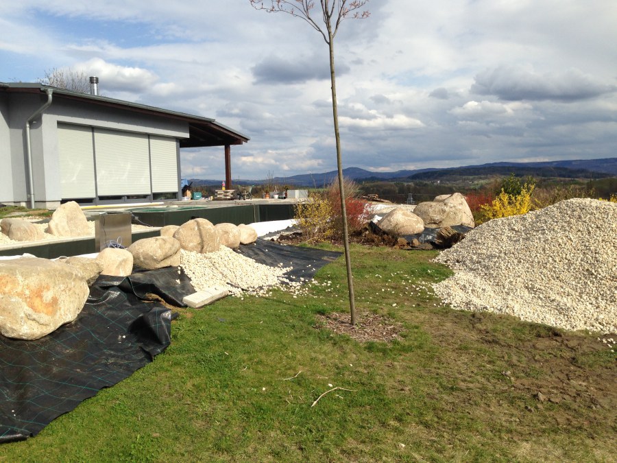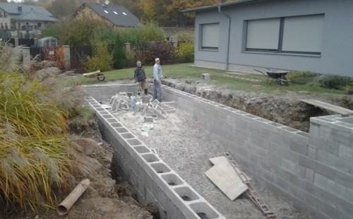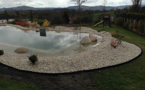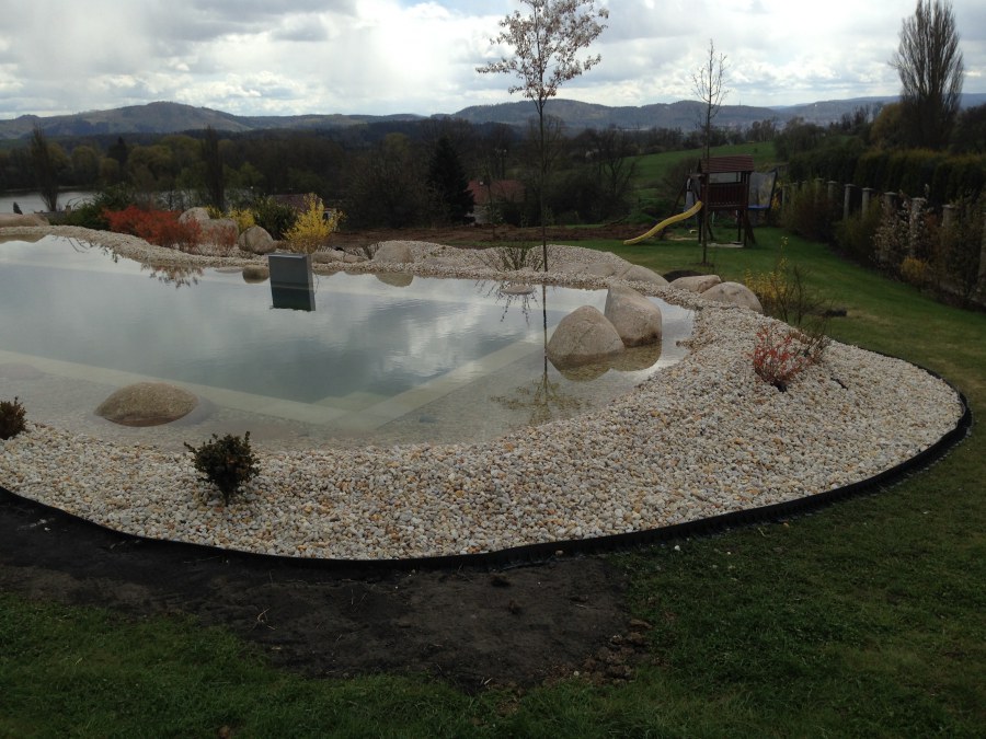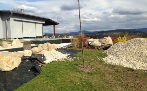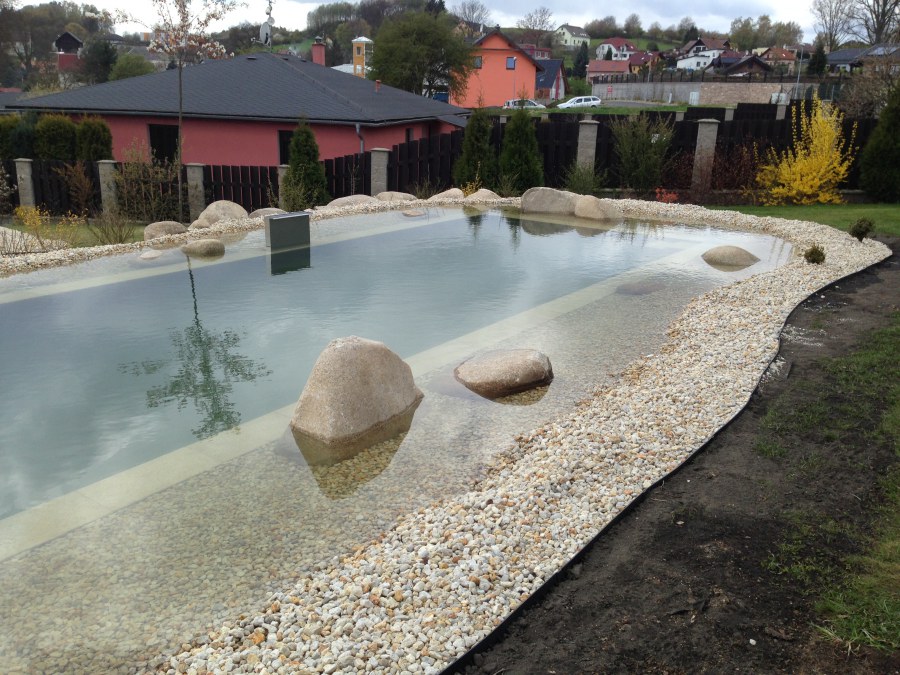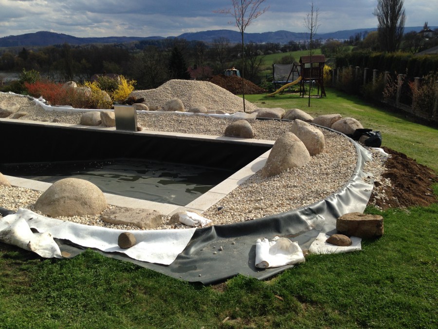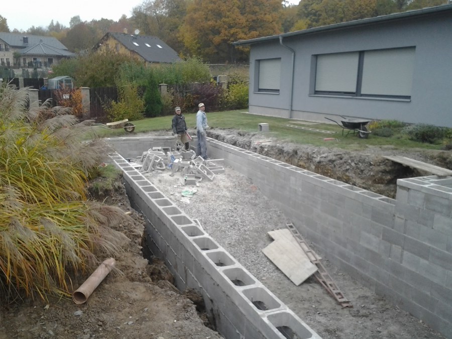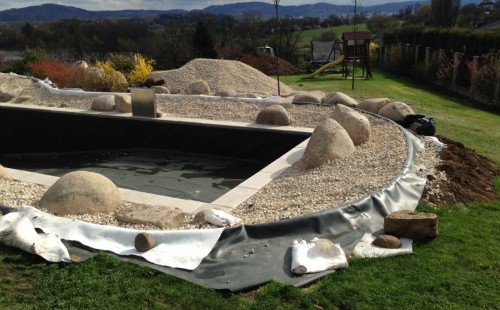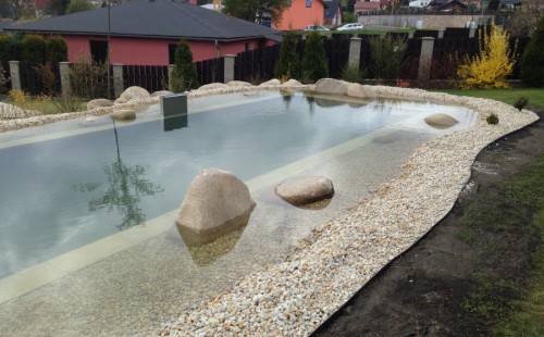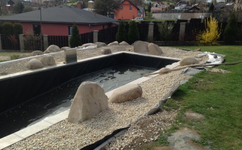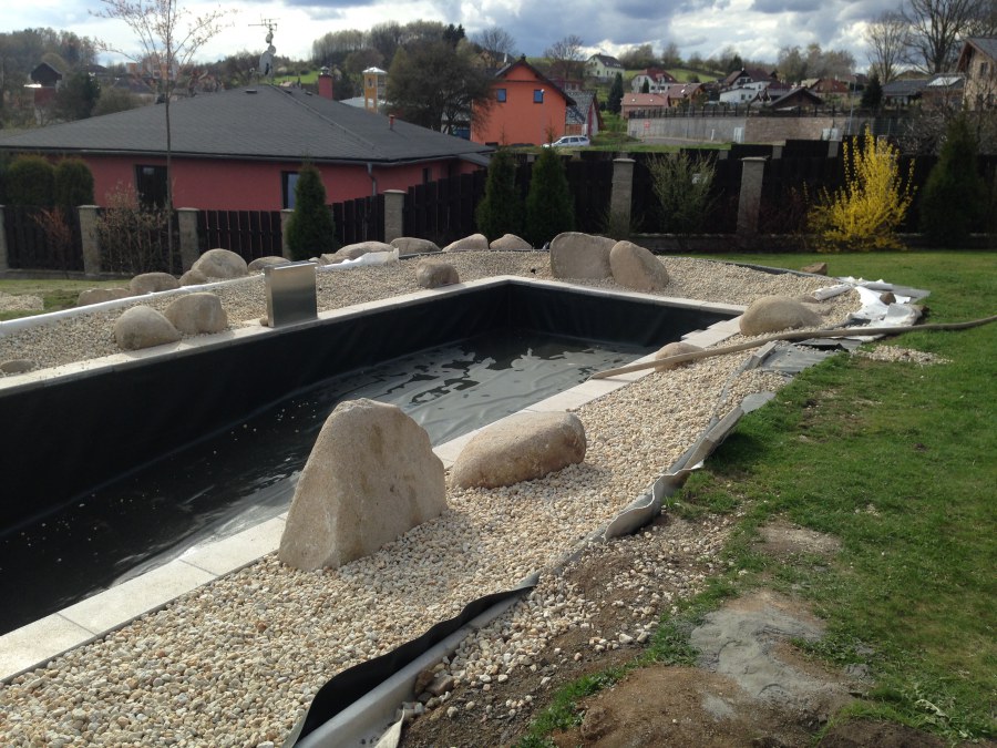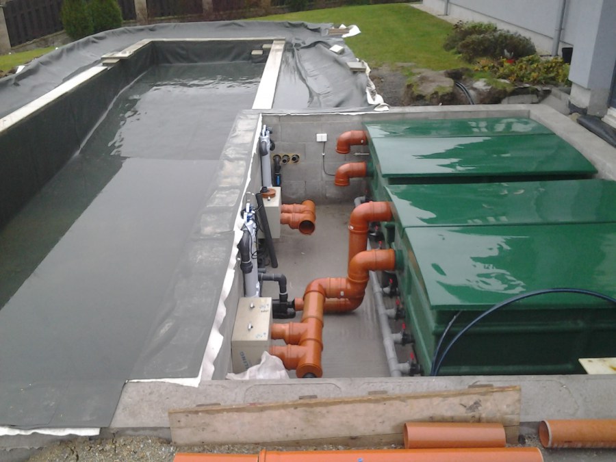 Tato stavba se poměrně dlouho plánovala a začalo se začátkem října letošního roku. Nejprve se vytýčil tvar jezírka, poté se začalo bagříkem vykopávat koupací jezírko. Poté se dno vysypalo štěrkem a začal se stavět obvod koupací části a technické místnosti ze ztraceného bednění. Protáhlo se potřebné potrubí k technologii, začalo se pokládkou kari sítí v technické místnosti. Dorazil mixovací vůz s betonem a začalo se vyléváním betonu do ztraceného bednění a do podlahy. Vytvořila se pobřežní zóna, kde se dno zhutnilo vibrační deskou. Poté se pokračovalo se instalací technologie a potřebného propojení. Koupací zóna se vysypala pískem a také zhutnila vibrační deskou. Speciální poplastovanou lištou se přidělala geotextílie 500g a začala se svařovat fólie Fatra Aquaplast 805 1,5mm. Pro tento systém bylo navrženo: 2x filtr Tripond Center Vortex C-115, 2x UV lampa TMC Pro Clear Advantage 110W, 2x úsporné čerpadlo Oase AquaMax Eco Gravity 15000, vzduchovací motor Hailea HAP-100 + vzduchovací kameny. Na přání zákazníka bude u jezírka nerezový chrlič Oase Waterfall set 60 a osvětlení vodopádu Oase Waterfall Illumination 60.