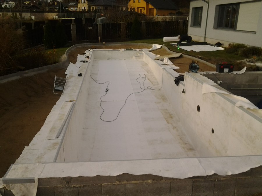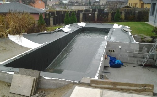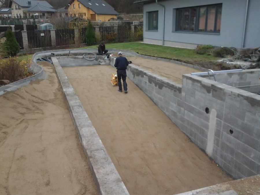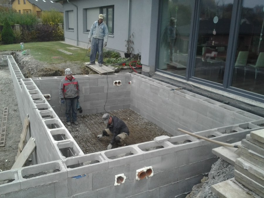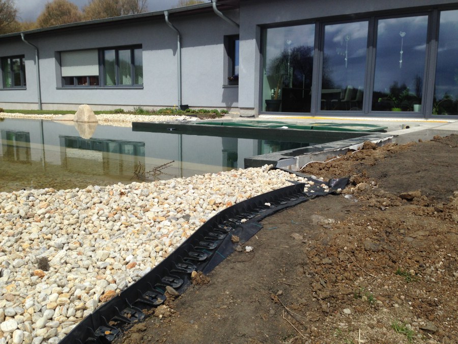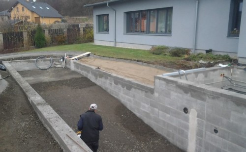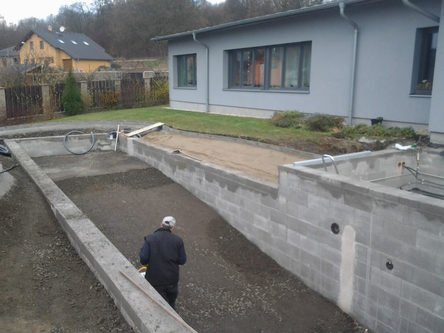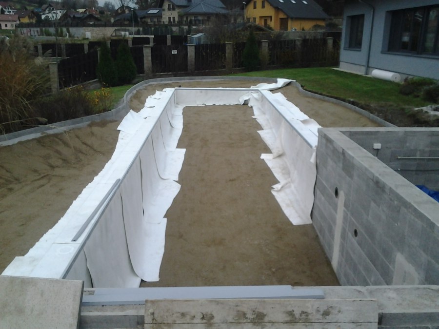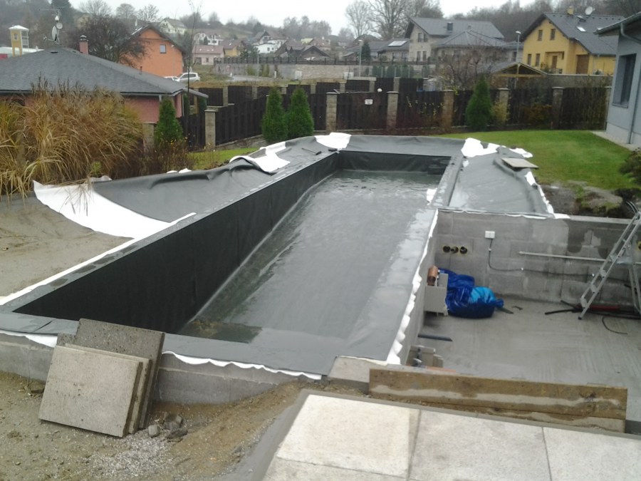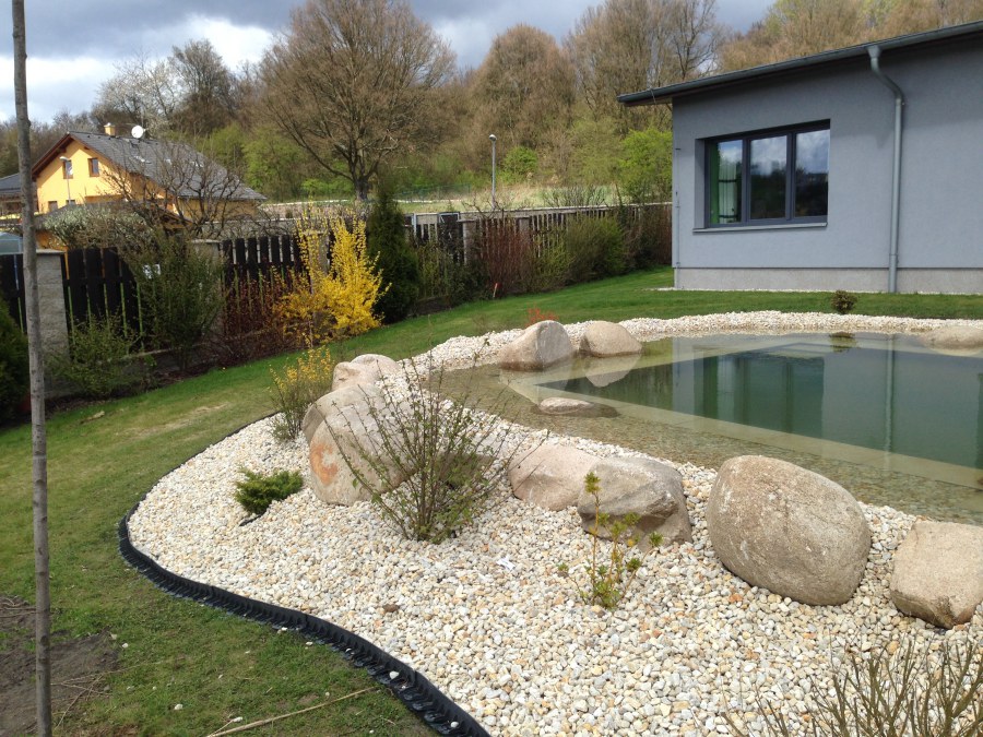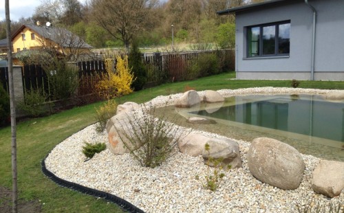 Tato stavba se poměrně dlouho plánovala a začalo se začátkem října letošního roku. Nejprve se vytýčil tvar jezírka, poté se začalo bagříkem vykopávat koupací jezírko. Poté se dno vysypalo štěrkem a začal se stavět obvod koupací části a technické místnosti ze ztraceného bednění. Protáhlo se potřebné potrubí k technologii, začalo se pokládkou kari sítí v technické místnosti. Dorazil mixovací vůz s betonem a začalo se vyléváním betonu do ztraceného bednění a do podlahy. Vytvořila se pobřežní zóna, kde se dno zhutnilo vibrační deskou. Poté se pokračovalo se instalací technologie a potřebného propojení. Koupací zóna se vysypala pískem a také zhutnila vibrační deskou. Speciální poplastovanou lištou se přidělala geotextílie 500g a začala se svařovat fólie Fatra Aquaplast 805 1,5mm. Pro tento systém bylo navrženo: 2x filtr Tripond Center Vortex C-115, 2x UV lampa TMC Pro Clear Advantage 110W, 2x úsporné čerpadlo Oase AquaMax Eco Gravity 15000, vzduchovací motor Hailea HAP-100 + vzduchovací kameny. Na přání zákazníka bude u jezírka nerezový chrlič Oase Waterfall set 60 a osvětlení vodopádu Oase Waterfall Illumination 60.