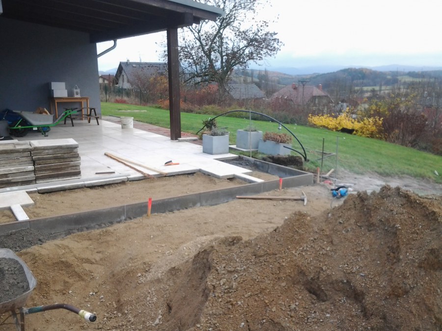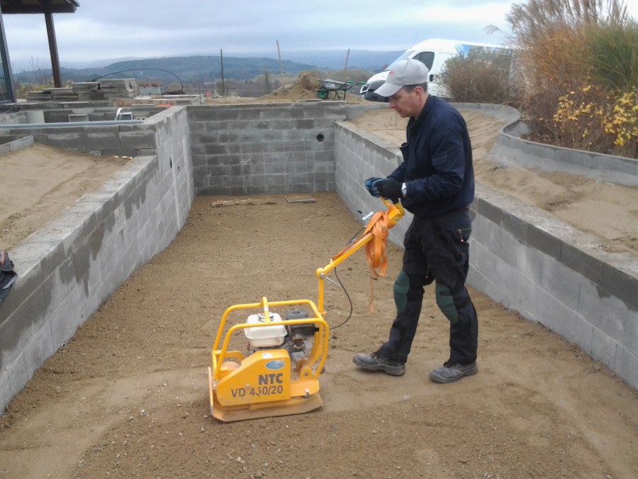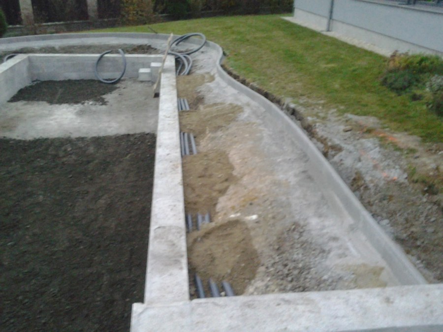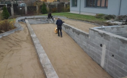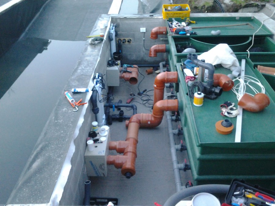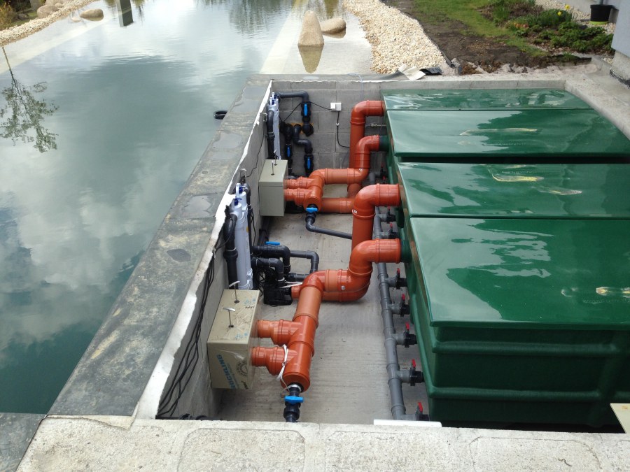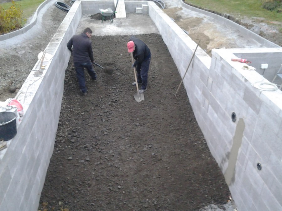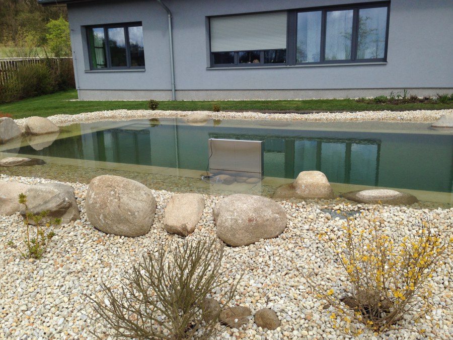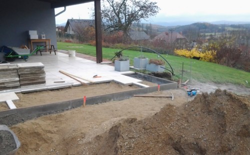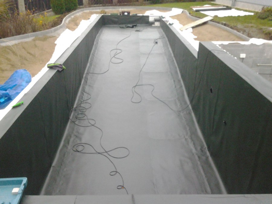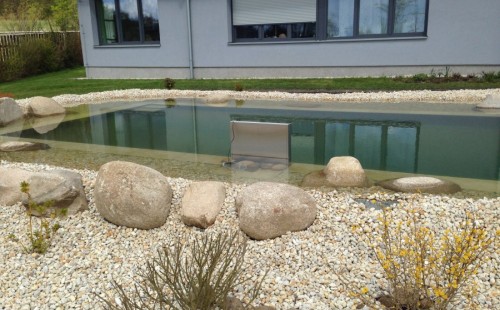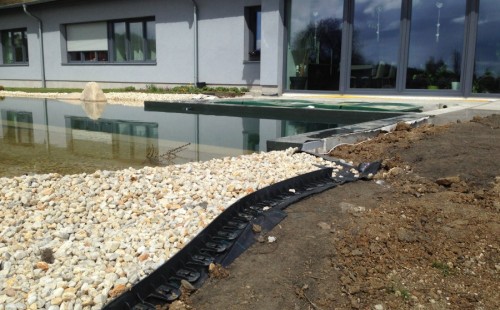 Tato stavba se poměrně dlouho plánovala a začalo se začátkem října letošního roku. Nejprve se vytýčil tvar jezírka, poté se začalo bagříkem vykopávat koupací jezírko. Poté se dno vysypalo štěrkem a začal se stavět obvod koupací části a technické místnosti ze ztraceného bednění. Protáhlo se potřebné potrubí k technologii, začalo se pokládkou kari sítí v technické místnosti. Dorazil mixovací vůz s betonem a začalo se vyléváním betonu do ztraceného bednění a do podlahy. Vytvořila se pobřežní zóna, kde se dno zhutnilo vibrační deskou. Poté se pokračovalo se instalací technologie a potřebného propojení. Koupací zóna se vysypala pískem a také zhutnila vibrační deskou. Speciální poplastovanou lištou se přidělala geotextílie 500g a začala se svařovat fólie Fatra Aquaplast 805 1,5mm. Pro tento systém bylo navrženo: 2x filtr Tripond Center Vortex C-115, 2x UV lampa TMC Pro Clear Advantage 110W, 2x úsporné čerpadlo Oase AquaMax Eco Gravity 15000, vzduchovací motor Hailea HAP-100 + vzduchovací kameny. Na přání zákazníka bude u jezírka nerezový chrlič Oase Waterfall set 60 a osvětlení vodopádu Oase Waterfall Illumination 60.