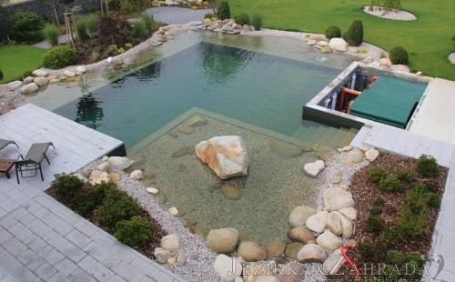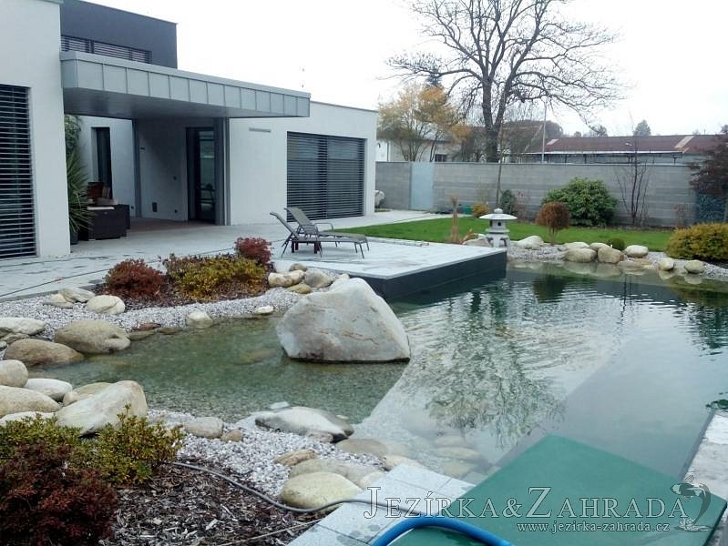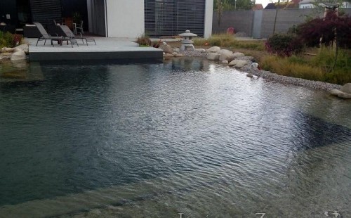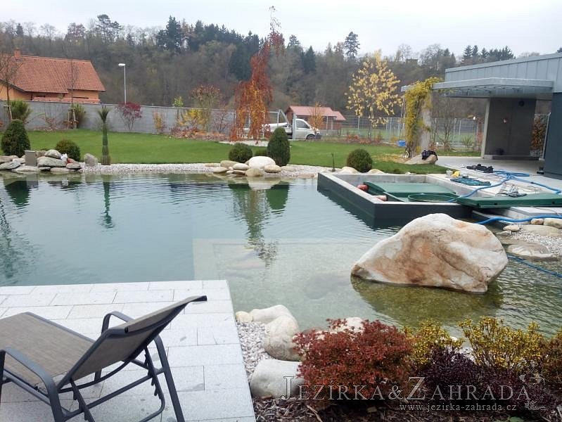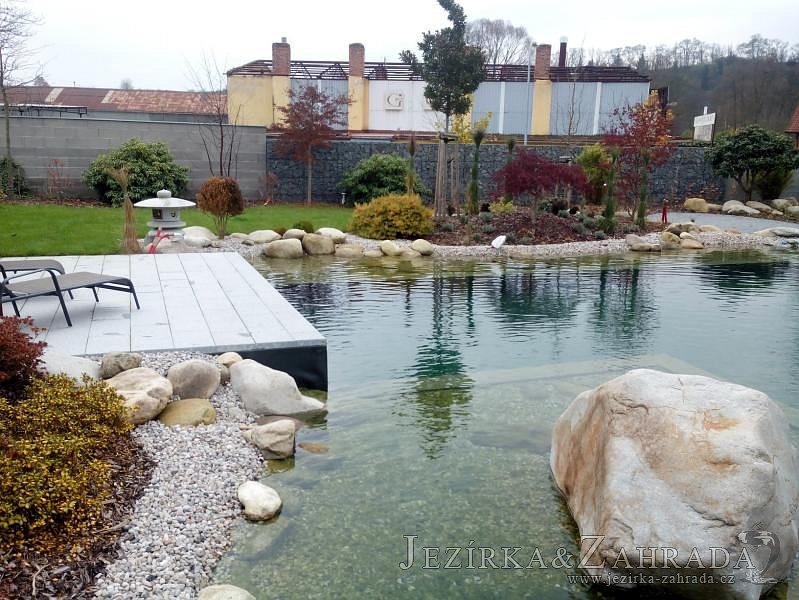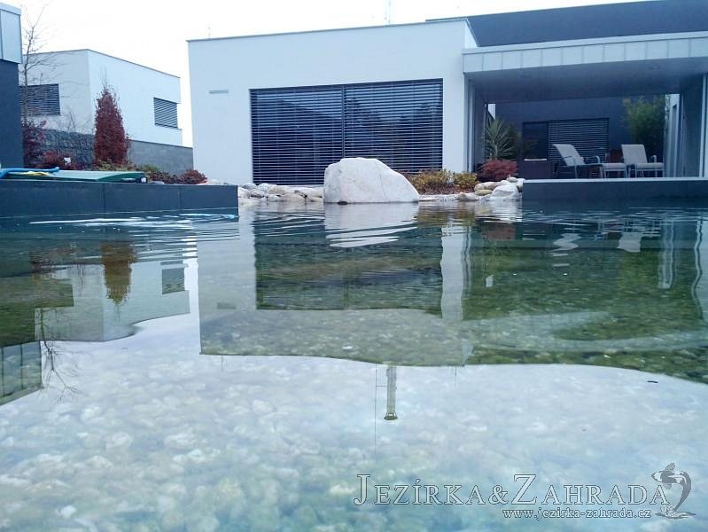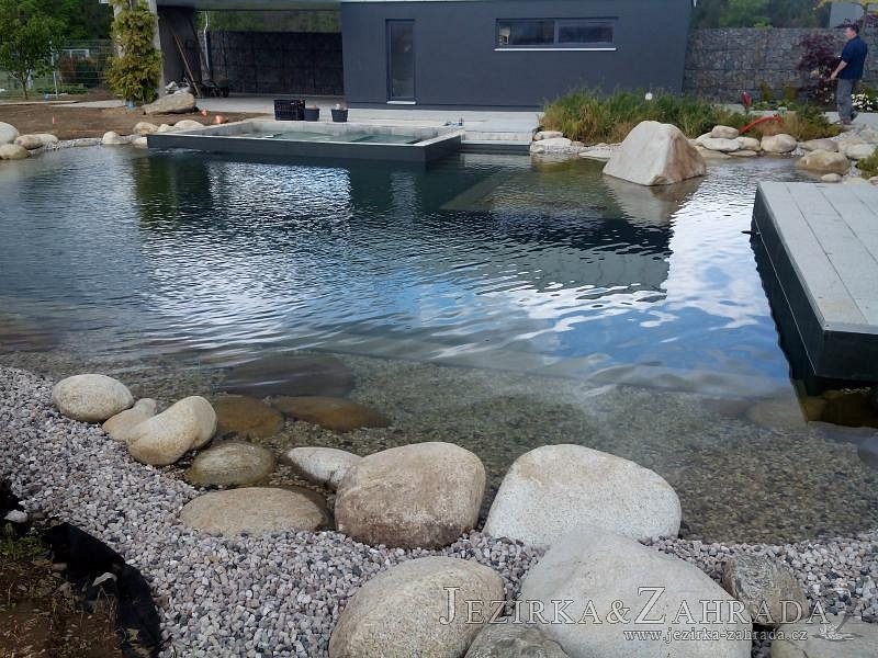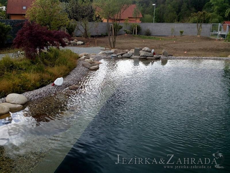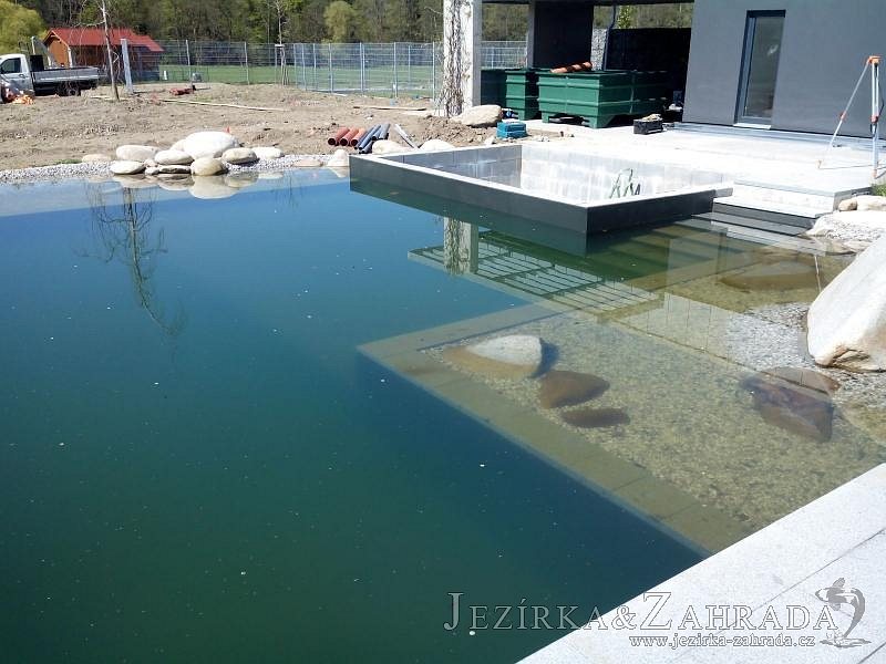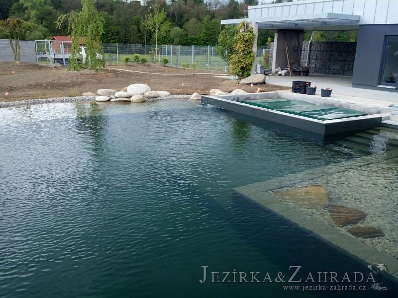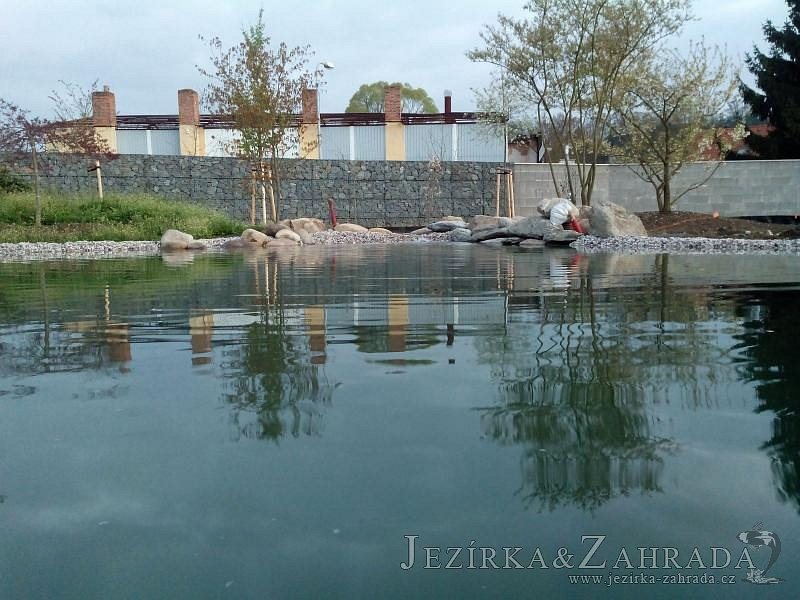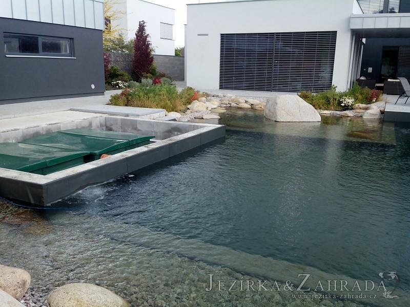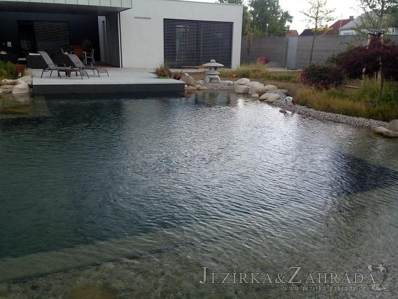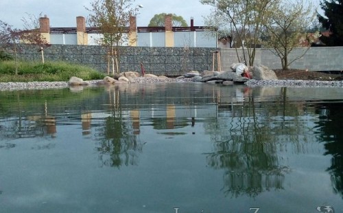 V tomto případě se jedná o moderní koupací jezírko, které doplňuje přechod z obytné plochy přes zastřešenou terasu do rozlehlé zahrady. Realizace byla rozdělena do dvou fází: 2013 - výstavba jezírka... položení potrubí, zabetonování spodní vpusti-gule, na stěnu technické místnosti se přidělala fóliová příruba pro skimmer Oase Aquaskim Gravity, zapískovalo se, položila se geotextílie 500g, na ostré hrany se připevnili speciální fóliové lišty a na ně se svařila jezírková fólie Fatra Aquaplast 805/V 1,5mm olivově zelená. Napustila se voda. V roce 2014 jsme pokračovali dodávkou technologie. Na jezírko o objemu 150m3 jsme navrhli 2x mechanicko-biologický filtr Tripond Center-Vortex C115 zapojený gravitačně, ke každému filtru jsme připojili UV lampu TMC Pro Pond Advantage 110W a úsporné gravitační čerpadlo Oase Aquamax Gravity Eco 20000, které žene vodu zpět do jezírka. Na přání zadavatele byl nainstalován nerezový chrlič Oase Waterfall set 30 s možností regulace průtoku. Vzduchovací motor Hailea HAP-80 zásobuje přes rozvaděč jak jezírko, tak i obě filtrace. Do jezírka byly naistalovány velké okrasné kameny a kačírek. Břeh jezírka byl obložen okrasnými dlaždicemi a technická místnost byla zakryta podlahou z exotického dřeva. Pro snadnou údržbu koupací části doporučujeme pravidelné používání robotického vysavače Zodiac RA 63 iQ BIO a do pobřežní zóny vysavač Aqualogistic Profi.