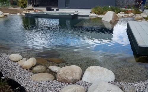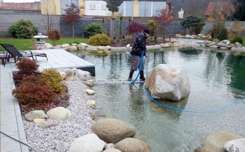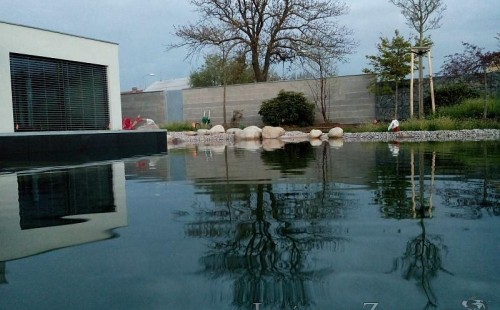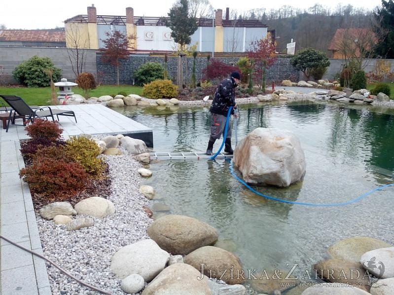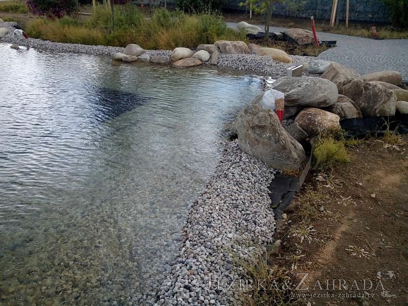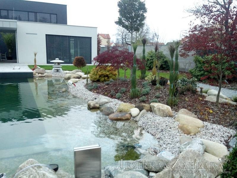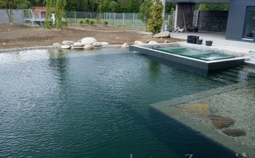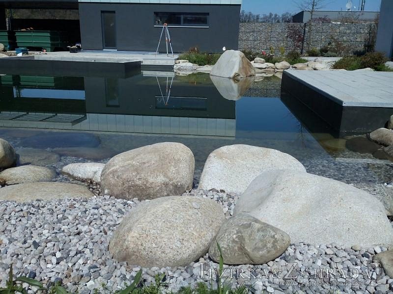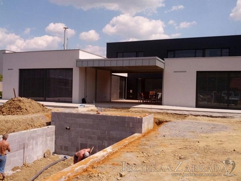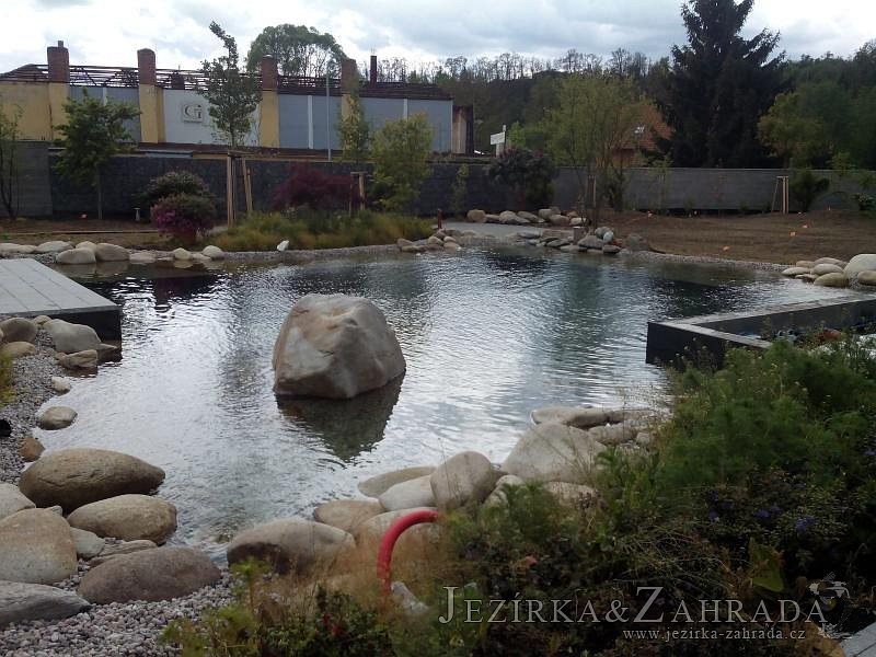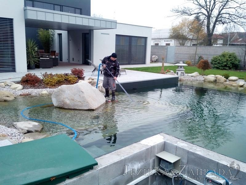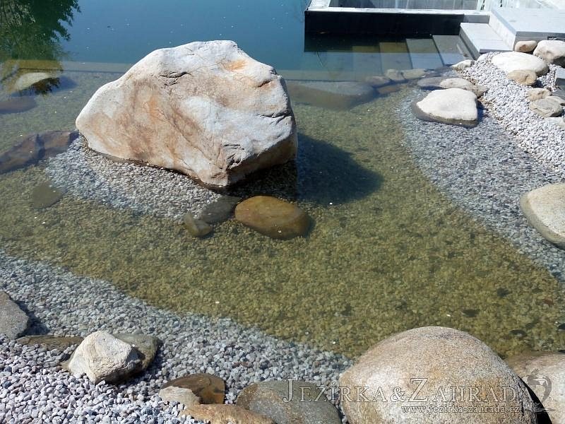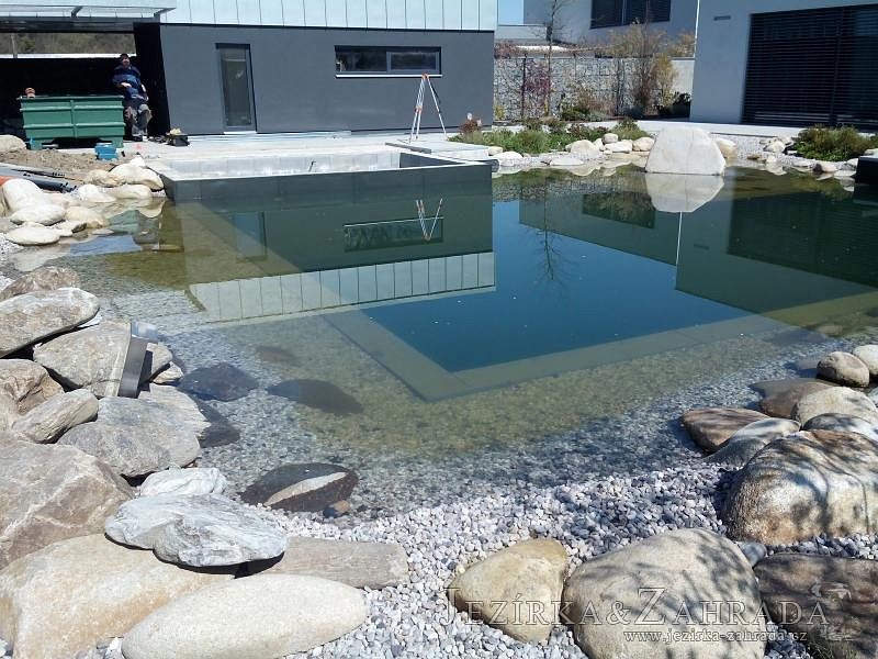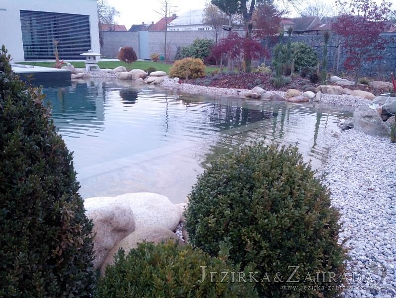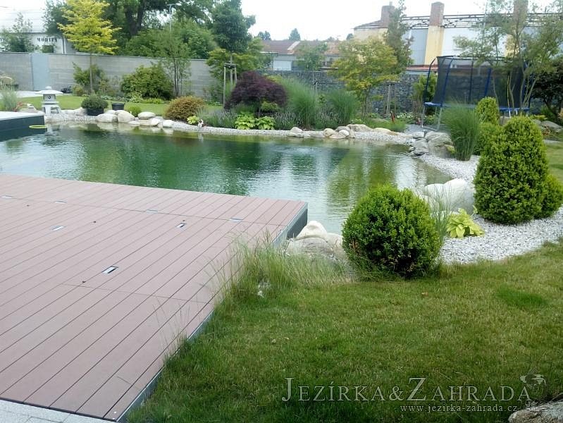 V tomto případě se jedná o moderní koupací jezírko, které doplňuje přechod z obytné plochy přes zastřešenou terasu do rozlehlé zahrady. Realizace byla rozdělena do dvou fází: 2013 - výstavba jezírka... položení potrubí, zabetonování spodní vpusti-gule, na stěnu technické místnosti se přidělala fóliová příruba pro skimmer Oase Aquaskim Gravity, zapískovalo se, položila se geotextílie 500g, na ostré hrany se připevnili speciální fóliové lišty a na ně se svařila jezírková fólie Fatra Aquaplast 805/V 1,5mm olivově zelená. Napustila se voda. V roce 2014 jsme pokračovali dodávkou technologie. Na jezírko o objemu 150m3 jsme navrhli 2x mechanicko-biologický filtr Tripond Center-Vortex C115 zapojený gravitačně, ke každému filtru jsme připojili UV lampu TMC Pro Pond Advantage 110W a úsporné gravitační čerpadlo Oase Aquamax Gravity Eco 20000, které žene vodu zpět do jezírka. Na přání zadavatele byl nainstalován nerezový chrlič Oase Waterfall set 30 s možností regulace průtoku. Vzduchovací motor Hailea HAP-80 zásobuje přes rozvaděč jak jezírko, tak i obě filtrace. Do jezírka byly naistalovány velké okrasné kameny a kačírek. Břeh jezírka byl obložen okrasnými dlaždicemi a technická místnost byla zakryta podlahou z exotického dřeva. Pro snadnou údržbu koupací části doporučujeme pravidelné používání robotického vysavače Zodiac RA 63 iQ BIO a do pobřežní zóny vysavač Aqualogistic Profi.