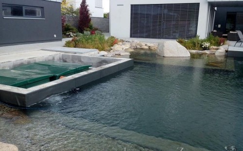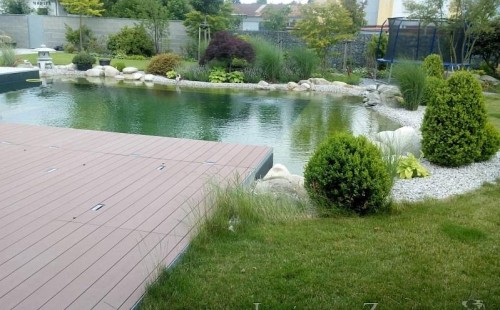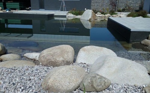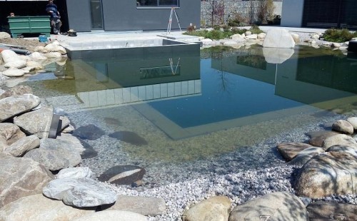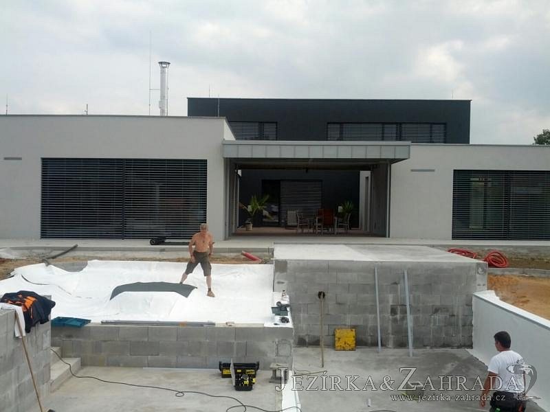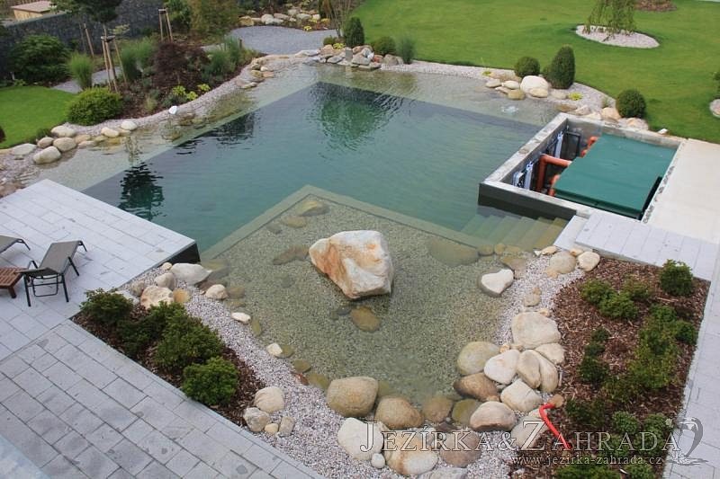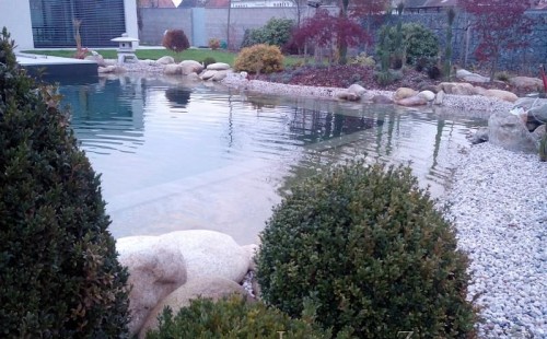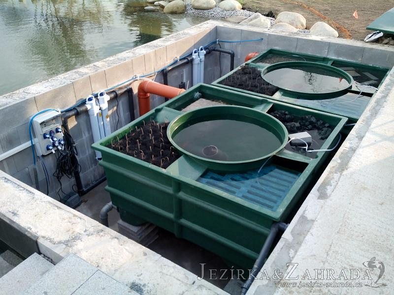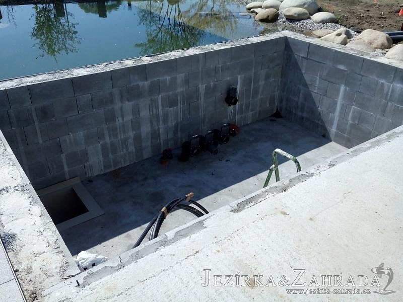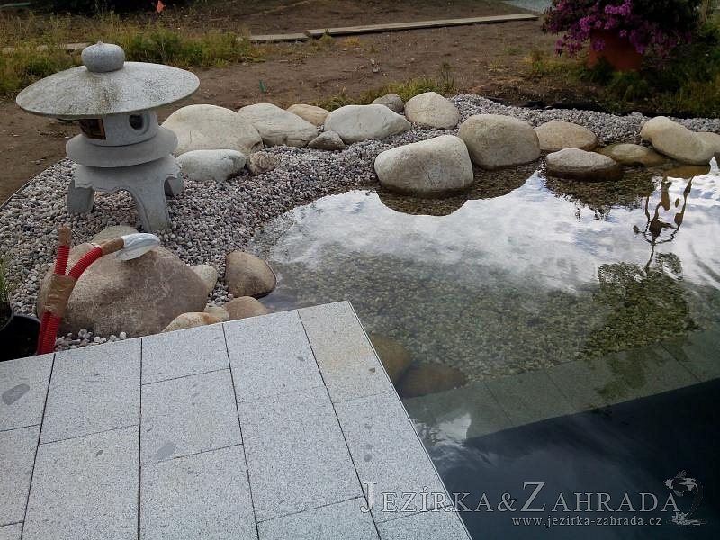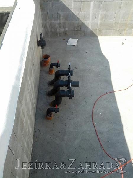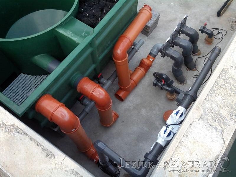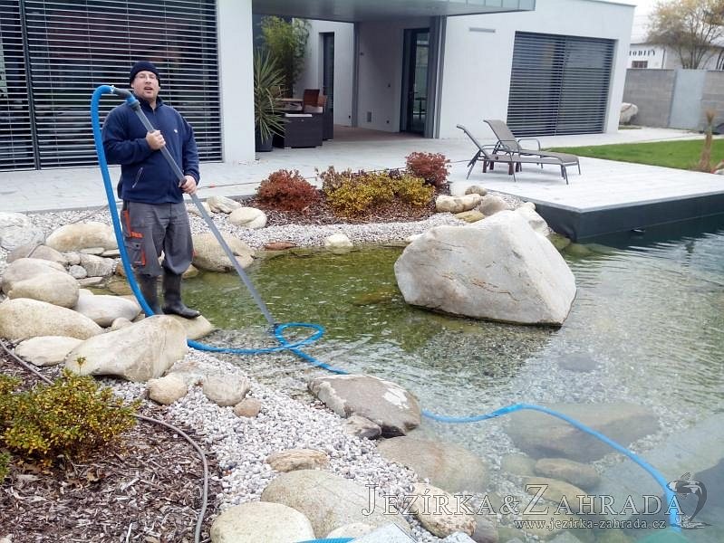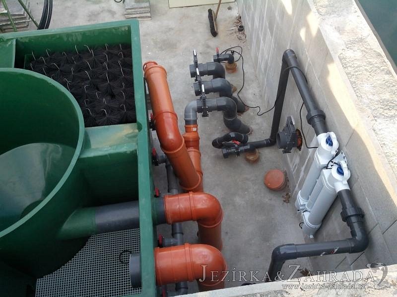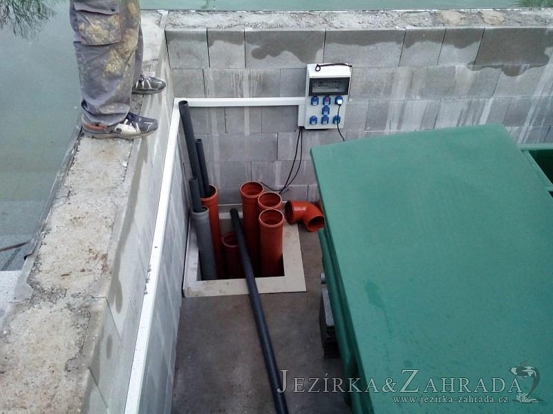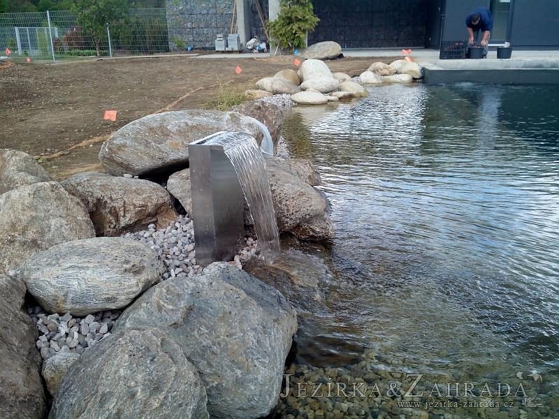 V tomto případě se jedná o moderní koupací jezírko, které doplňuje přechod z obytné plochy přes zastřešenou terasu do rozlehlé zahrady. Realizace byla rozdělena do dvou fází: 2013 - výstavba jezírka... položení potrubí, zabetonování spodní vpusti-gule, na stěnu technické místnosti se přidělala fóliová příruba pro skimmer Oase Aquaskim Gravity, zapískovalo se, položila se geotextílie 500g, na ostré hrany se připevnili speciální fóliové lišty a na ně se svařila jezírková fólie Fatra Aquaplast 805/V 1,5mm olivově zelená. Napustila se voda. V roce 2014 jsme pokračovali dodávkou technologie. Na jezírko o objemu 150m3 jsme navrhli 2x mechanicko-biologický filtr Tripond Center-Vortex C115 zapojený gravitačně, ke každému filtru jsme připojili UV lampu TMC Pro Pond Advantage 110W a úsporné gravitační čerpadlo Oase Aquamax Gravity Eco 20000, které žene vodu zpět do jezírka. Na přání zadavatele byl nainstalován nerezový chrlič Oase Waterfall set 30 s možností regulace průtoku. Vzduchovací motor Hailea HAP-80 zásobuje přes rozvaděč jak jezírko, tak i obě filtrace. Do jezírka byly naistalovány velké okrasné kameny a kačírek. Břeh jezírka byl obložen okrasnými dlaždicemi a technická místnost byla zakryta podlahou z exotického dřeva. Pro snadnou údržbu koupací části doporučujeme pravidelné používání robotického vysavače Zodiac RA 63 iQ BIO a do pobřežní zóny vysavač Aqualogistic Profi.