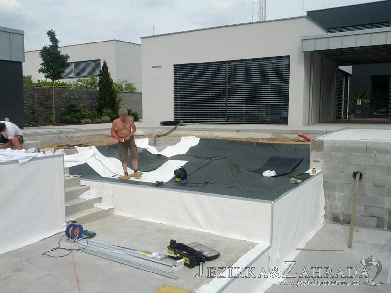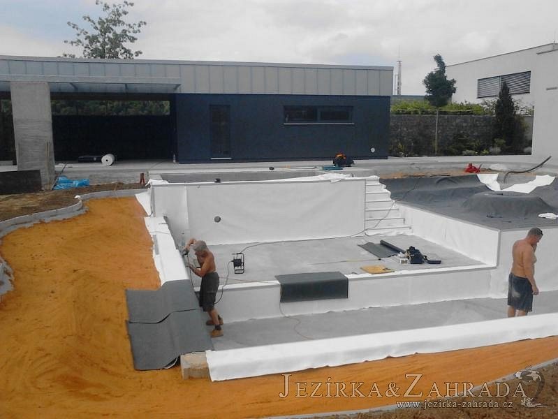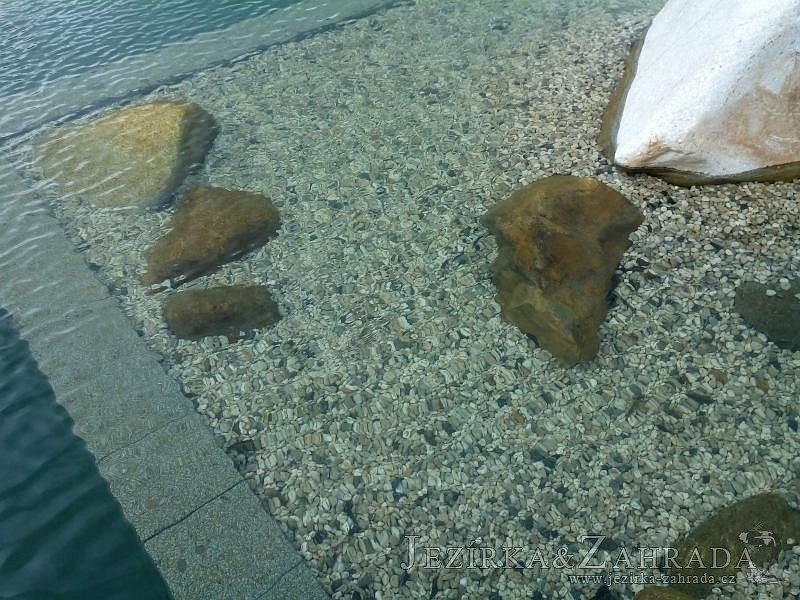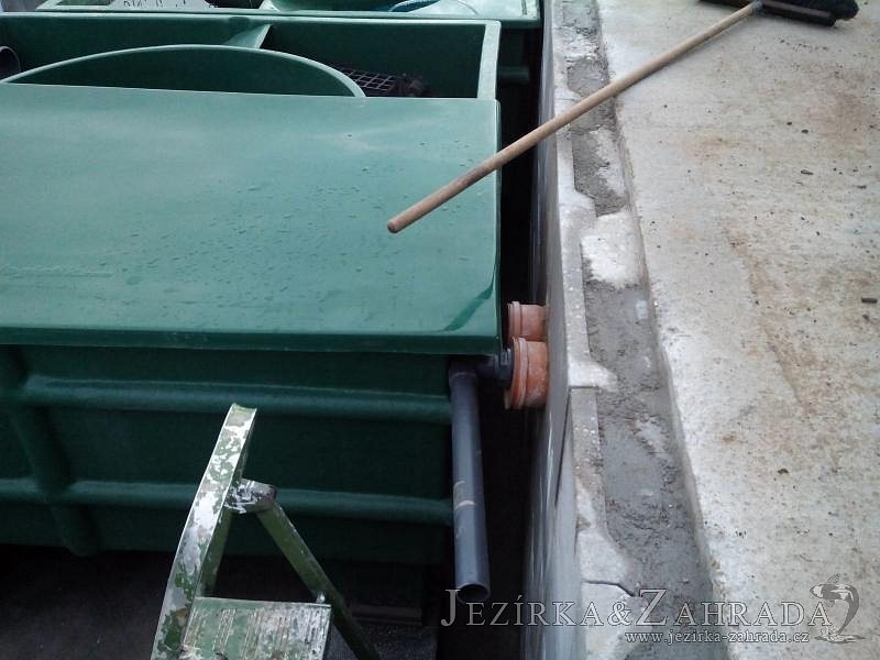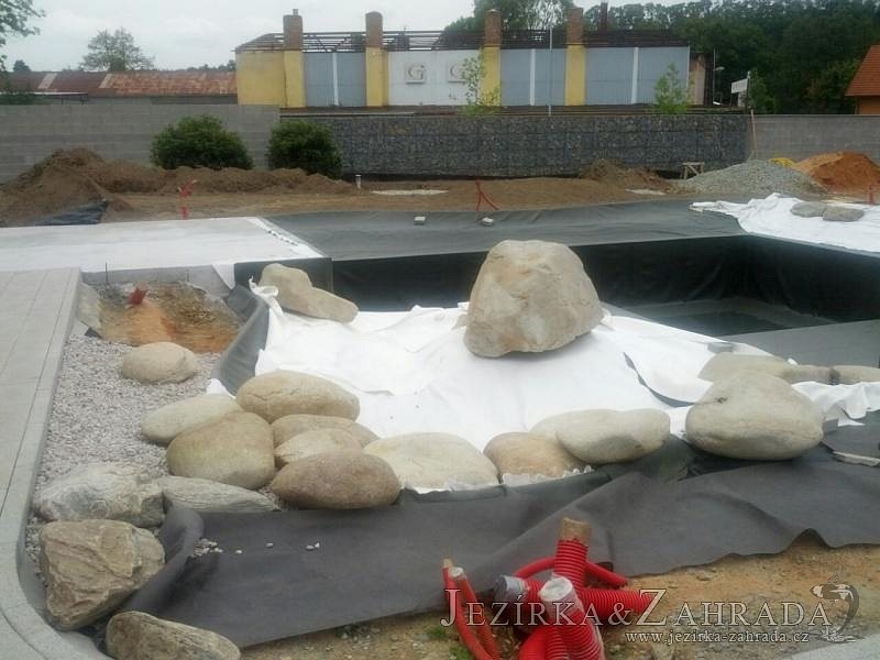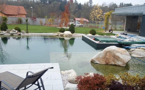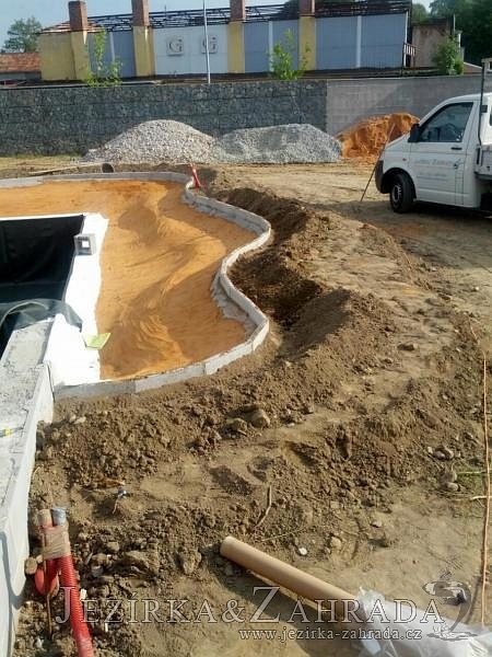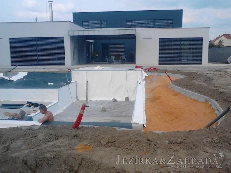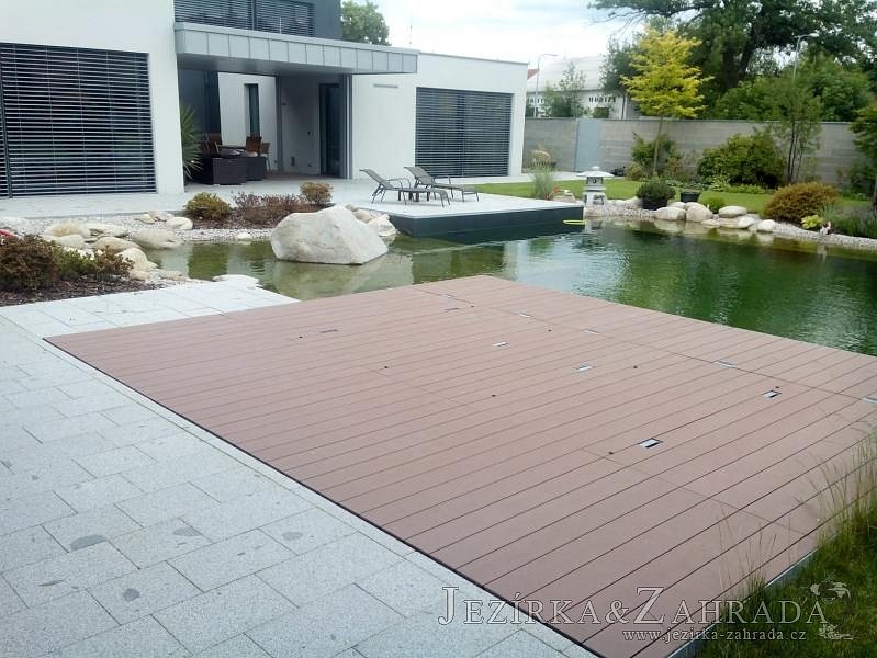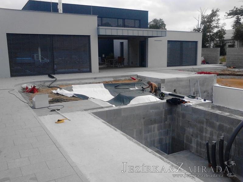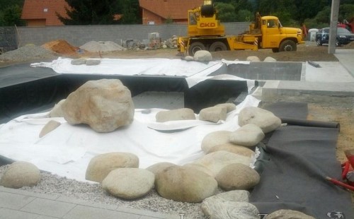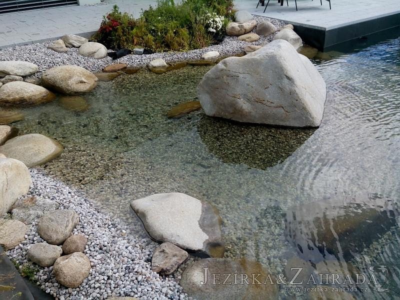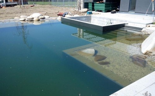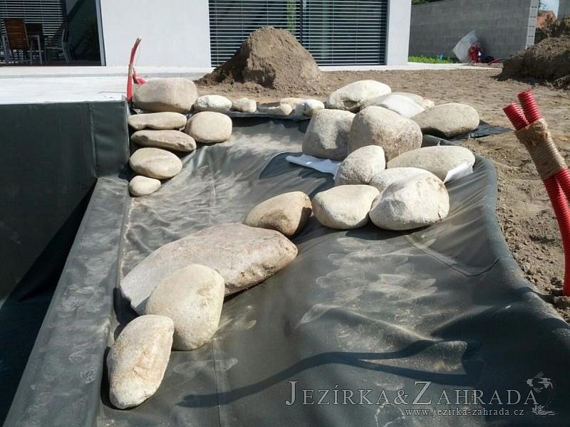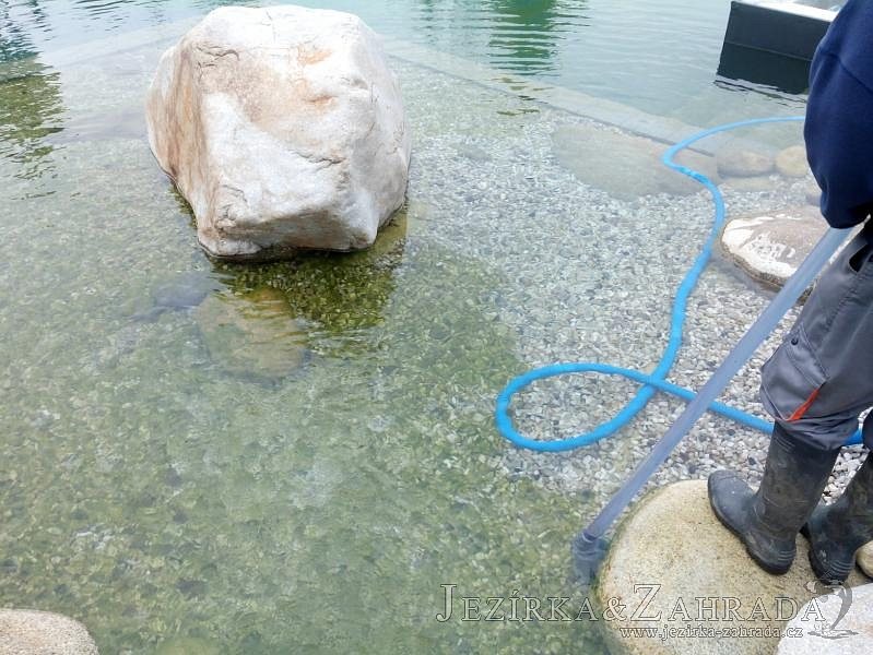 V tomto případě se jedná o moderní koupací jezírko, které doplňuje přechod z obytné plochy přes zastřešenou terasu do rozlehlé zahrady. Realizace byla rozdělena do dvou fází: 2013 - výstavba jezírka... položení potrubí, zabetonování spodní vpusti-gule, na stěnu technické místnosti se přidělala fóliová příruba pro skimmer Oase Aquaskim Gravity, zapískovalo se, položila se geotextílie 500g, na ostré hrany se připevnili speciální fóliové lišty a na ně se svařila jezírková fólie Fatra Aquaplast 805/V 1,5mm olivově zelená. Napustila se voda. V roce 2014 jsme pokračovali dodávkou technologie. Na jezírko o objemu 150m3 jsme navrhli 2x mechanicko-biologický filtr Tripond Center-Vortex C115 zapojený gravitačně, ke každému filtru jsme připojili UV lampu TMC Pro Pond Advantage 110W a úsporné gravitační čerpadlo Oase Aquamax Gravity Eco 20000, které žene vodu zpět do jezírka. Na přání zadavatele byl nainstalován nerezový chrlič Oase Waterfall set 30 s možností regulace průtoku. Vzduchovací motor Hailea HAP-80 zásobuje přes rozvaděč jak jezírko, tak i obě filtrace. Do jezírka byly naistalovány velké okrasné kameny a kačírek. Břeh jezírka byl obložen okrasnými dlaždicemi a technická místnost byla zakryta podlahou z exotického dřeva. Pro snadnou údržbu koupací části doporučujeme pravidelné používání robotického vysavače Zodiac RA 63 iQ BIO a do pobřežní zóny vysavač Aqualogistic Profi.