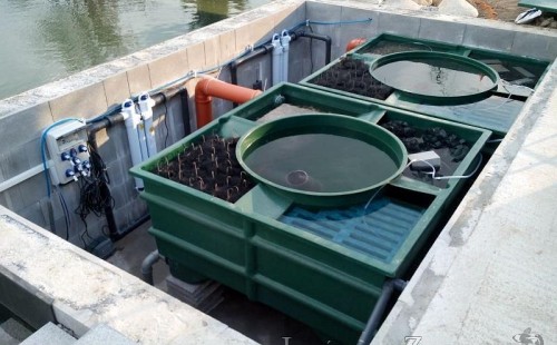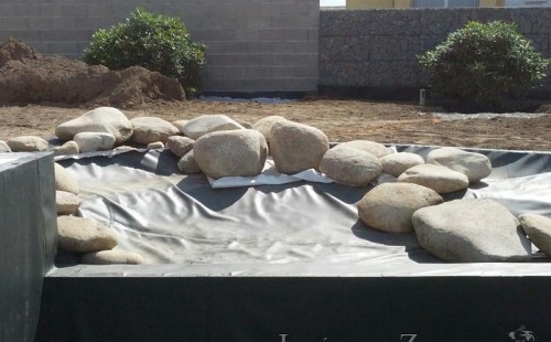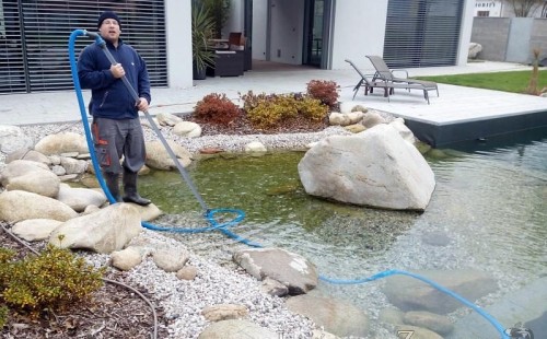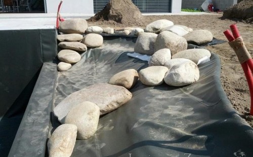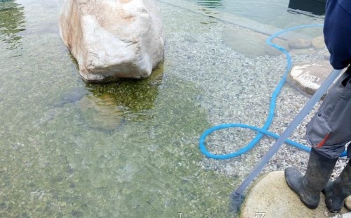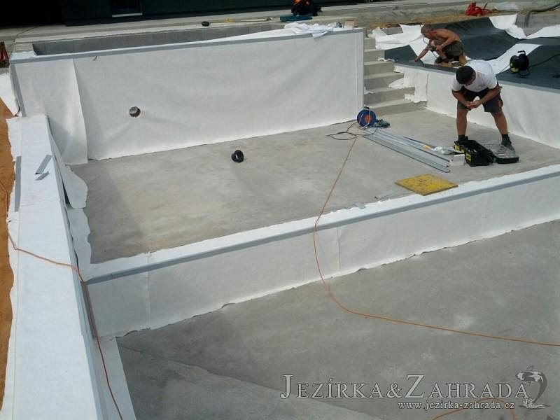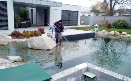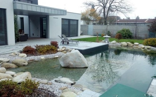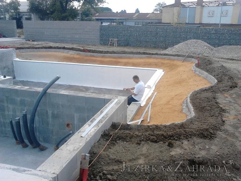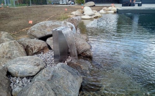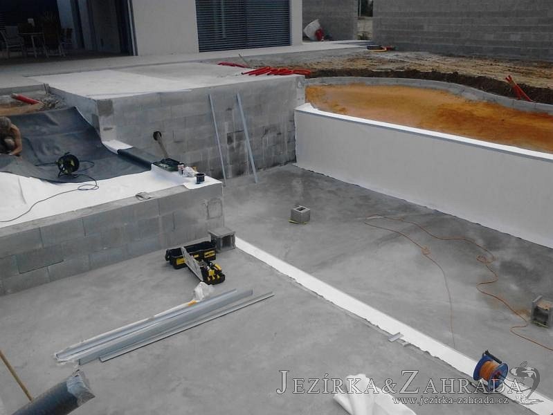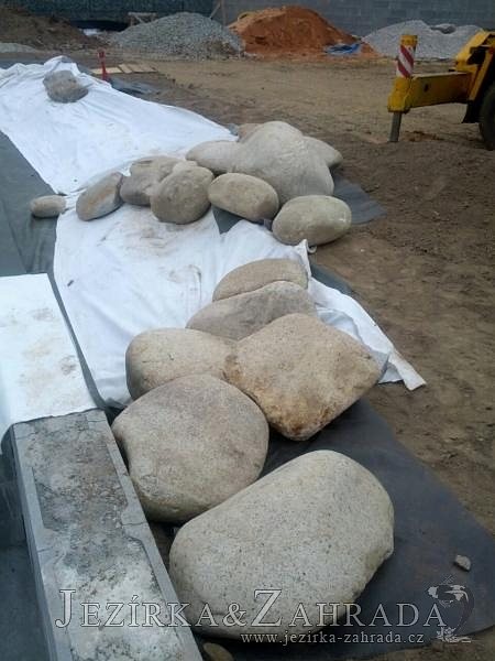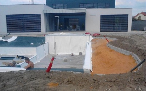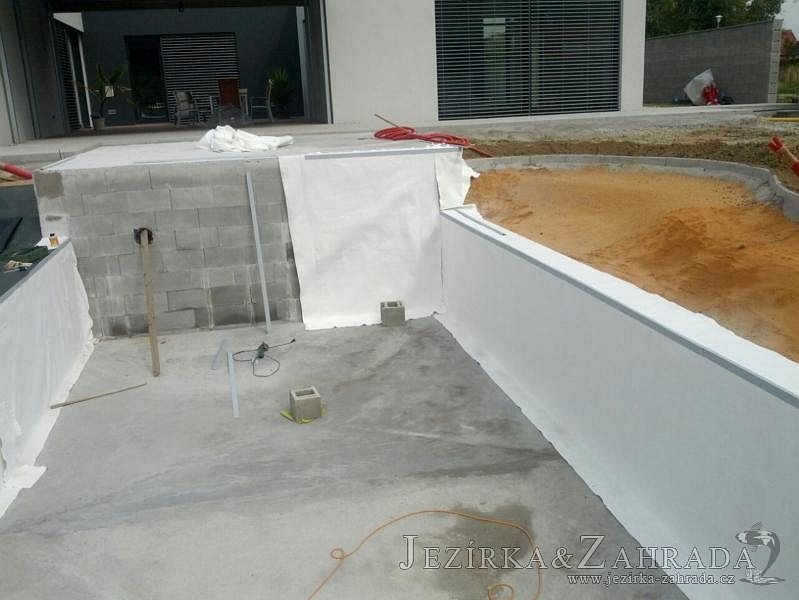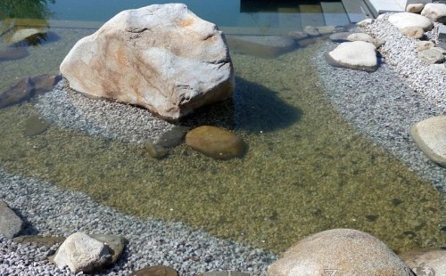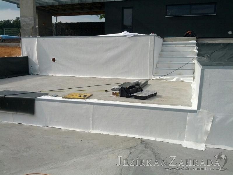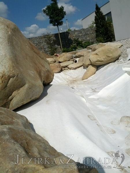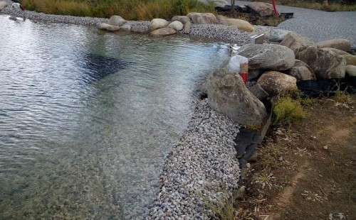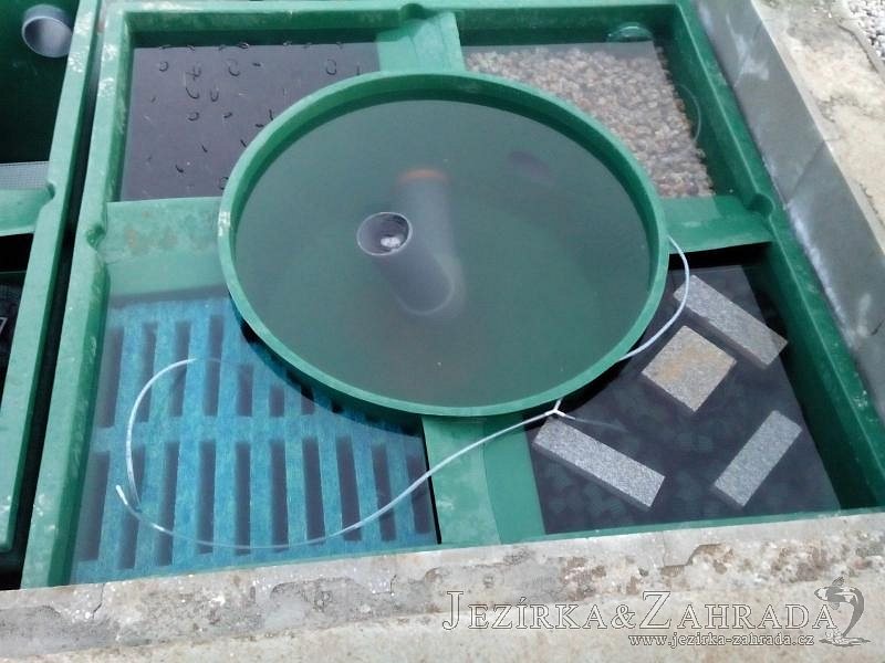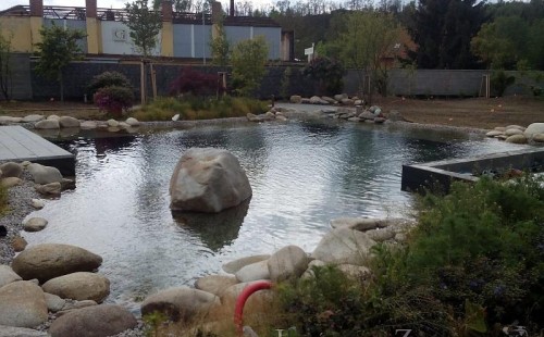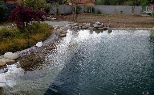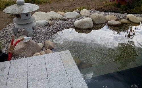 V tomto případě se jedná o moderní koupací jezírko, které doplňuje přechod z obytné plochy přes zastřešenou terasu do rozlehlé zahrady. Realizace byla rozdělena do dvou fází: 2013 - výstavba jezírka... položení potrubí, zabetonování spodní vpusti-gule, na stěnu technické místnosti se přidělala fóliová příruba pro skimmer Oase Aquaskim Gravity, zapískovalo se, položila se geotextílie 500g, na ostré hrany se připevnili speciální fóliové lišty a na ně se svařila jezírková fólie Fatra Aquaplast 805/V 1,5mm olivově zelená. Napustila se voda. V roce 2014 jsme pokračovali dodávkou technologie. Na jezírko o objemu 150m3 jsme navrhli 2x mechanicko-biologický filtr Tripond Center-Vortex C115 zapojený gravitačně, ke každému filtru jsme připojili UV lampu TMC Pro Pond Advantage 110W a úsporné gravitační čerpadlo Oase Aquamax Gravity Eco 20000, které žene vodu zpět do jezírka. Na přání zadavatele byl nainstalován nerezový chrlič Oase Waterfall set 30 s možností regulace průtoku. Vzduchovací motor Hailea HAP-80 zásobuje přes rozvaděč jak jezírko, tak i obě filtrace. Do jezírka byly naistalovány velké okrasné kameny a kačírek. Břeh jezírka byl obložen okrasnými dlaždicemi a technická místnost byla zakryta podlahou z exotického dřeva. Pro snadnou údržbu koupací části doporučujeme pravidelné používání robotického vysavače Zodiac RA 63 iQ BIO a do pobřežní zóny vysavač Aqualogistic Profi.