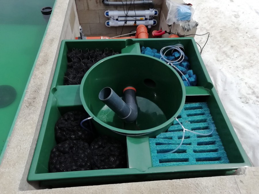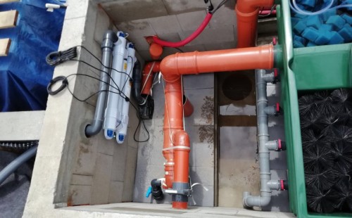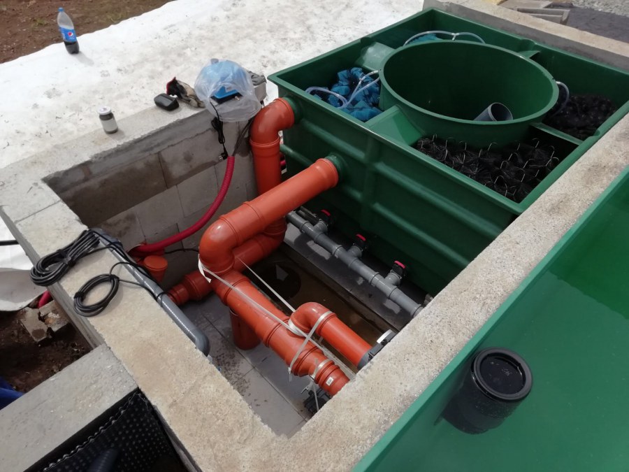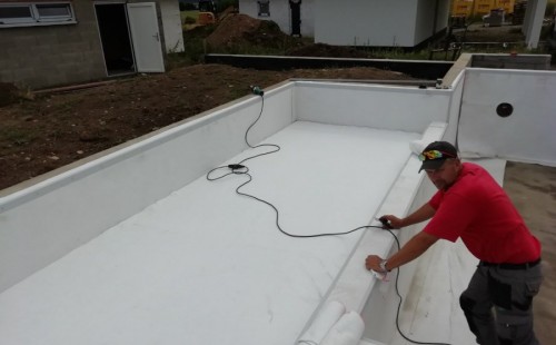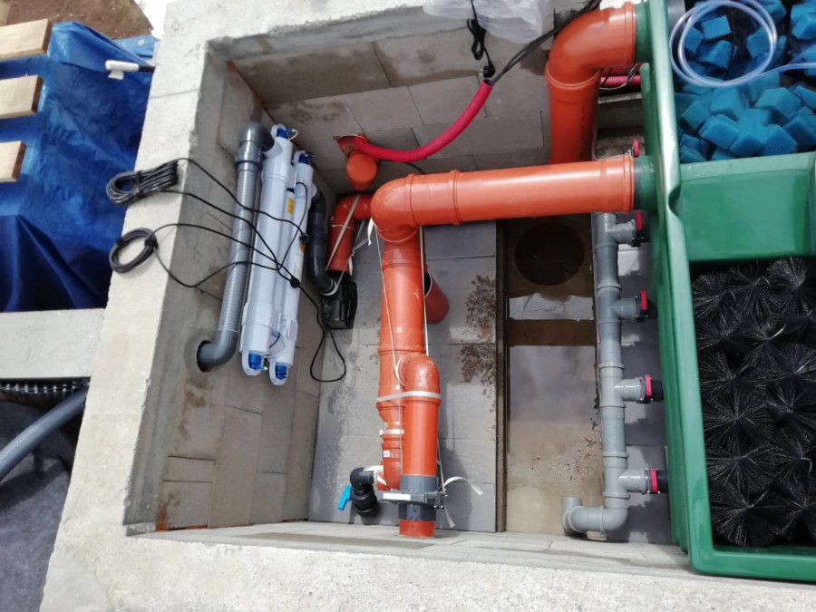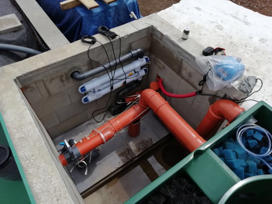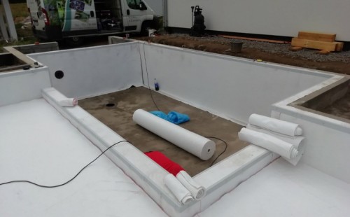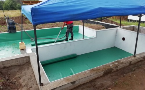 Od jara jsme připravovali stavbu koupacího jezírka v Přestanově. Klient si pod naším stavebním dozorem vystavěl základy koupacího jezírka a technické místnosti ze ztraceného bednění. Položil guly, fóliovou přírubu pro skimmer Oase AquaSkim Gravity a na dno položil potrubí k technické místnosti. Poté vybetonoval dno a vše zpevnil. Po dokončení těchto prací začali naši technici s pokládkou jezírkové fólie. Nejdřív položili geotextílii 500g, přes ní na všechny hrany navrtali koutové lišty a ně potom navařili jezírkovou fólii Fatra Aquaplast 805/V světle zelenou. Po napuštění má jezírko cca 30m3, proto jsme doporučili biologicko-mechanický filtr Tripond Center-Vortex C80, UV lampu TMC Pro Clear 110W a čerpadlo Oase AquaMax Gravity Eco 15000.