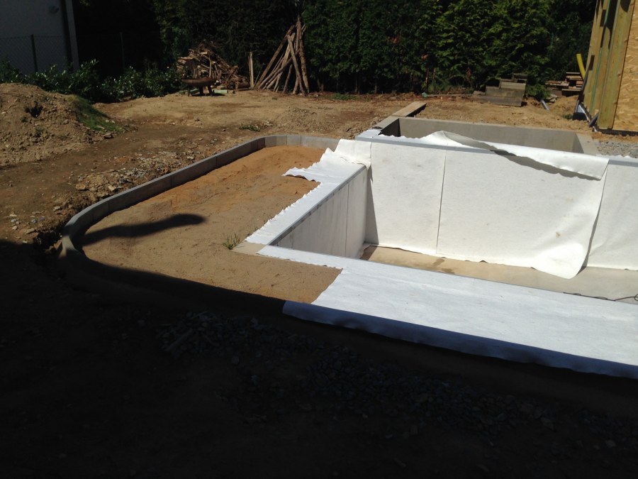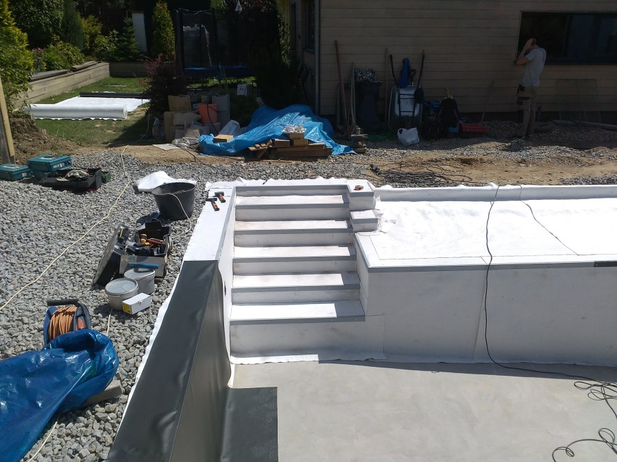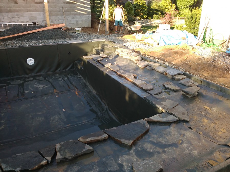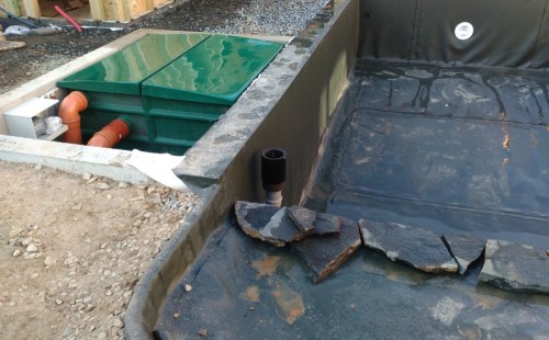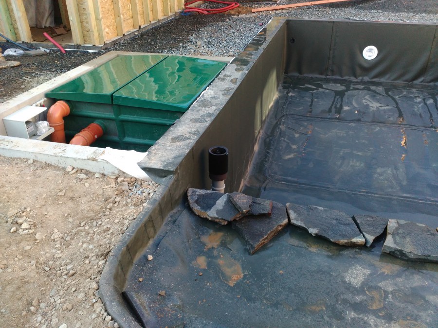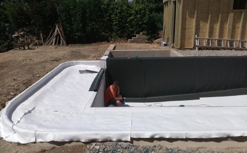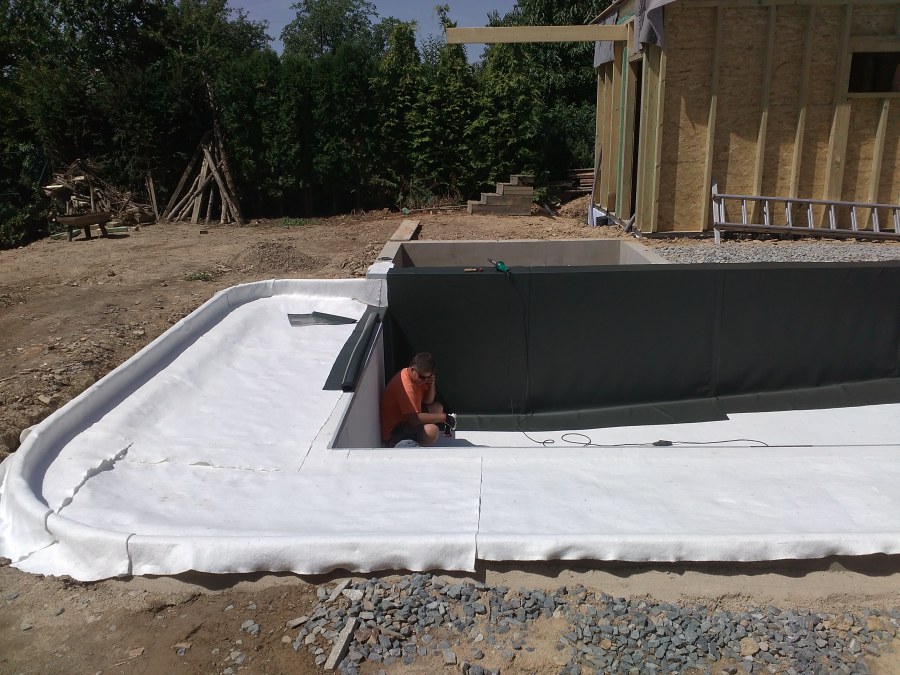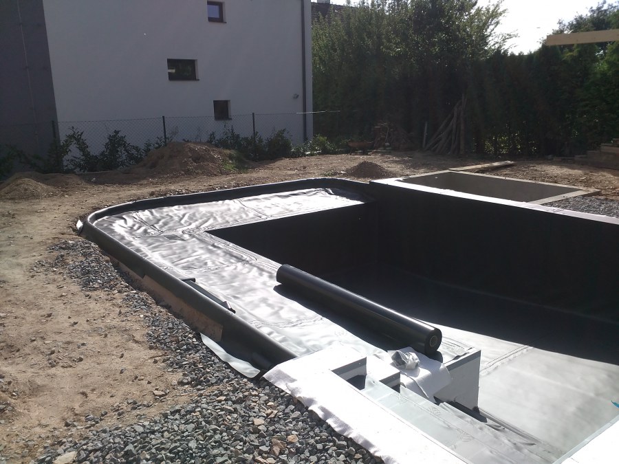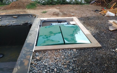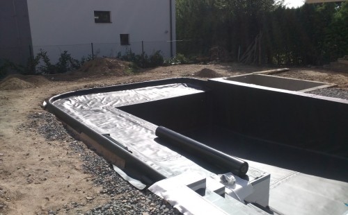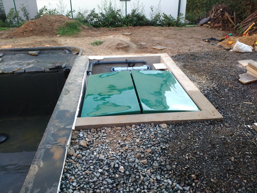 V roce 2018 jsme byli přivoláni k již rozdělanému jezírku. Klient měl postaveny základy pro bazén a v průběhu stavby se rozhodl pro stavbu koupacího jezírka. Základy jsme využili, k jedné stěně se přistavila technická místnost, na dno se uložila gule a natáhlo potrubí, do zdí se zabudovala bazénová světla, fóliová příruba pro skimmer Oase Aquaskim Gravity. Poté se zdi a dno zahladili vrstvou betonu. Po dokončení těchto přípravných prací se mohlo začít s fóliováním jezírka. Nejprve se položila geotextílie 500g na hrany a na schody se přivrtali fóliové lišty a na ně se následně začala navařovat jezírková fólie Fatra Aquaplast 805/V olivově zelená. Do technické místnosti se uložil biologicko-mechanický filtr na cca 35m3 Tripond Center Vortex C115, na něj se napojila UV lampa TMC Pro Clear 110W a čerpadlo Oase Aquamax Gravity Eco 20000.
