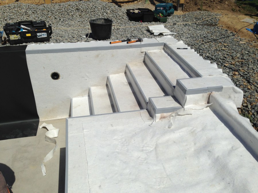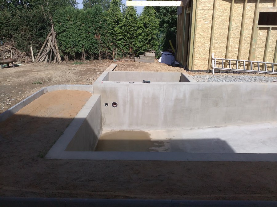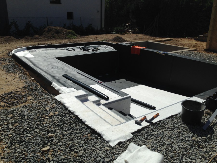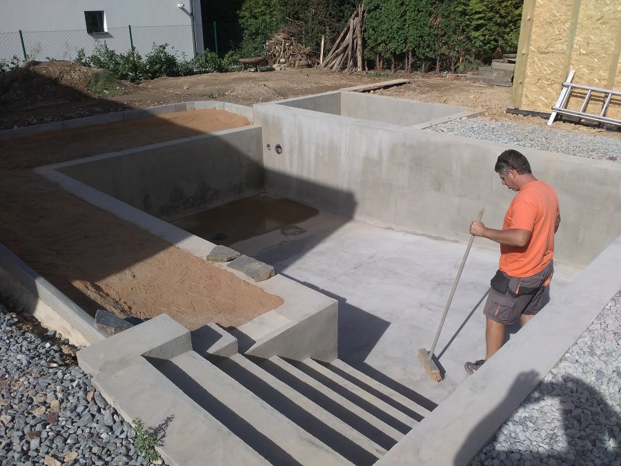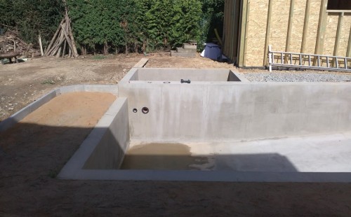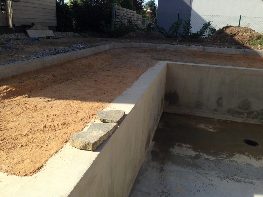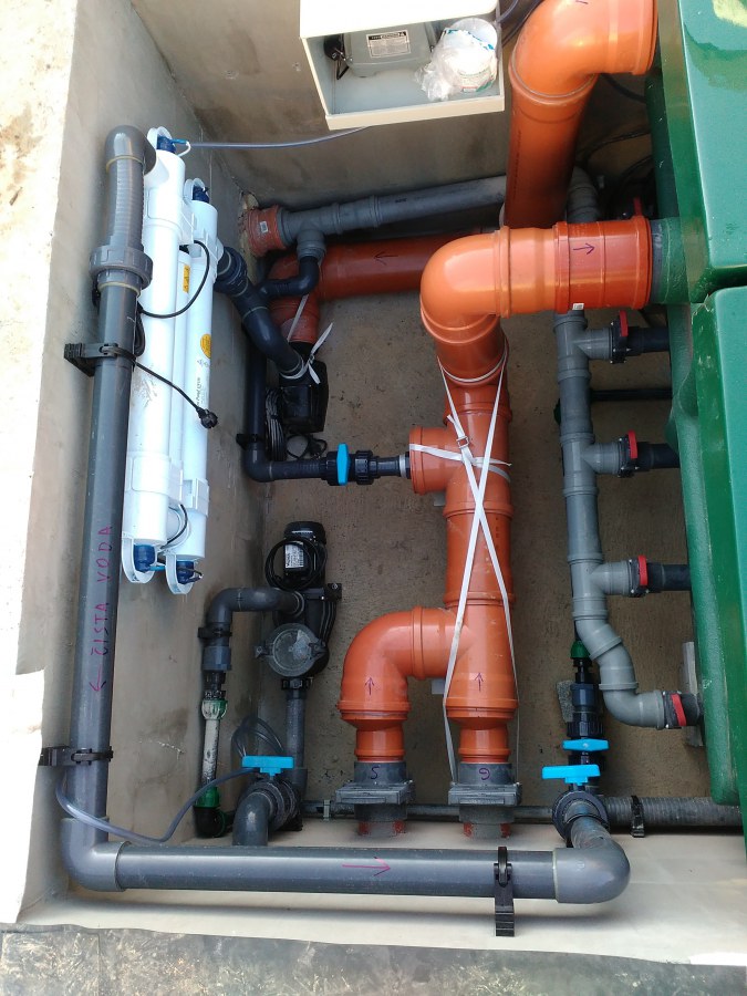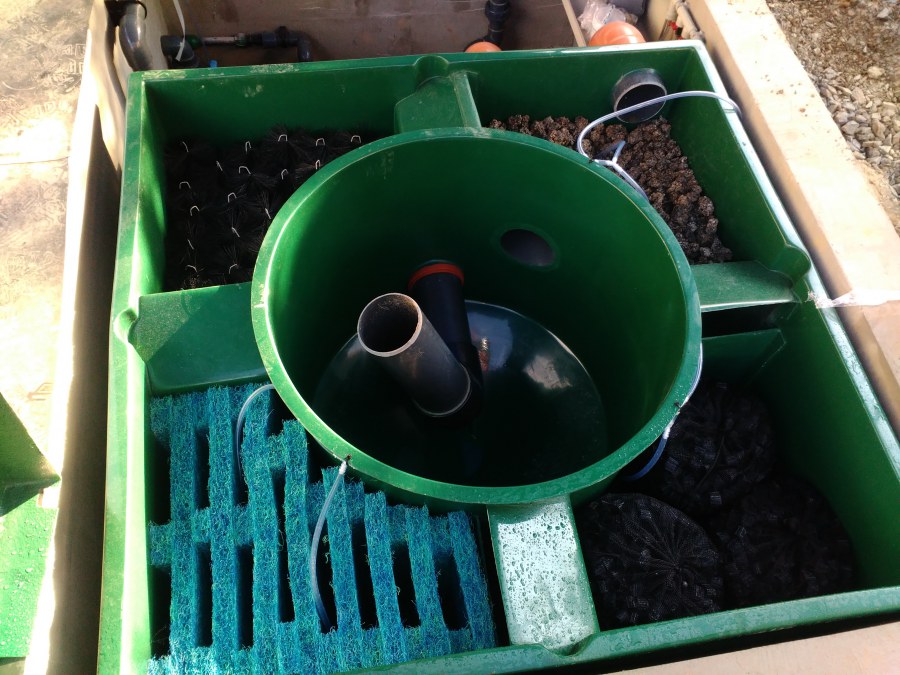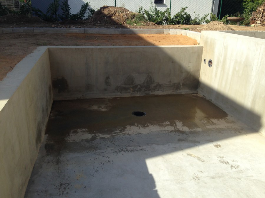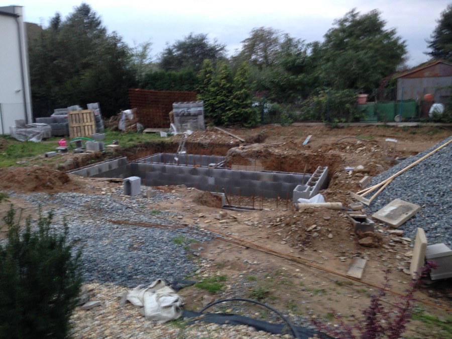 V roce 2018 jsme byli přivoláni k již rozdělanému jezírku. Klient měl postaveny základy pro bazén a v průběhu stavby se rozhodl pro stavbu koupacího jezírka. Základy jsme využili, k jedné stěně se přistavila technická místnost, na dno se uložila gule a natáhlo potrubí, do zdí se zabudovala bazénová světla, fóliová příruba pro skimmer Oase Aquaskim Gravity. Poté se zdi a dno zahladili vrstvou betonu. Po dokončení těchto přípravných prací se mohlo začít s fóliováním jezírka. Nejprve se položila geotextílie 500g na hrany a na schody se přivrtali fóliové lišty a na ně se následně začala navařovat jezírková fólie Fatra Aquaplast 805/V olivově zelená. Do technické místnosti se uložil biologicko-mechanický filtr na cca 35m3 Tripond Center Vortex C115, na něj se napojila UV lampa TMC Pro Clear 110W a čerpadlo Oase Aquamax Gravity Eco 20000.