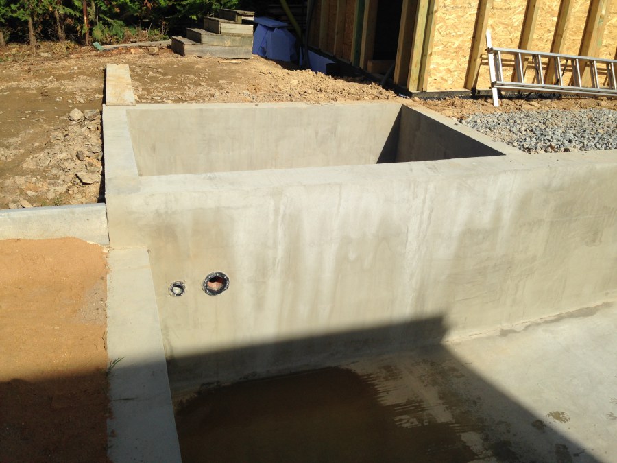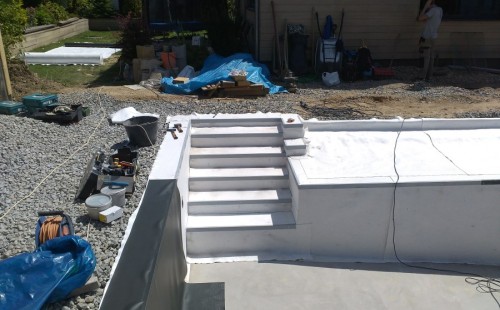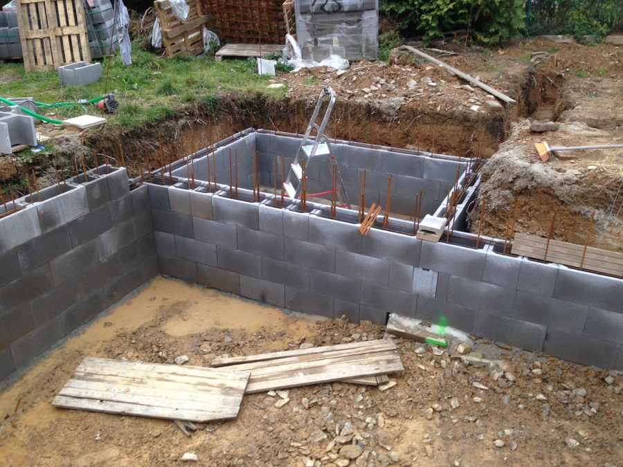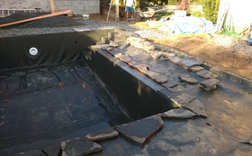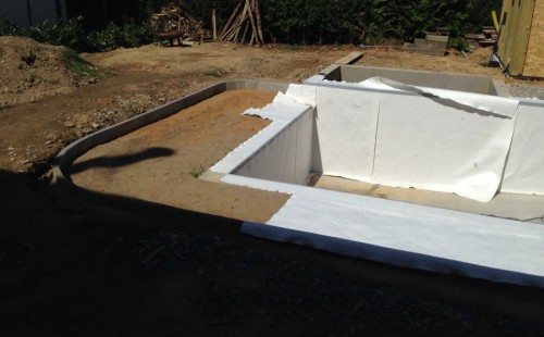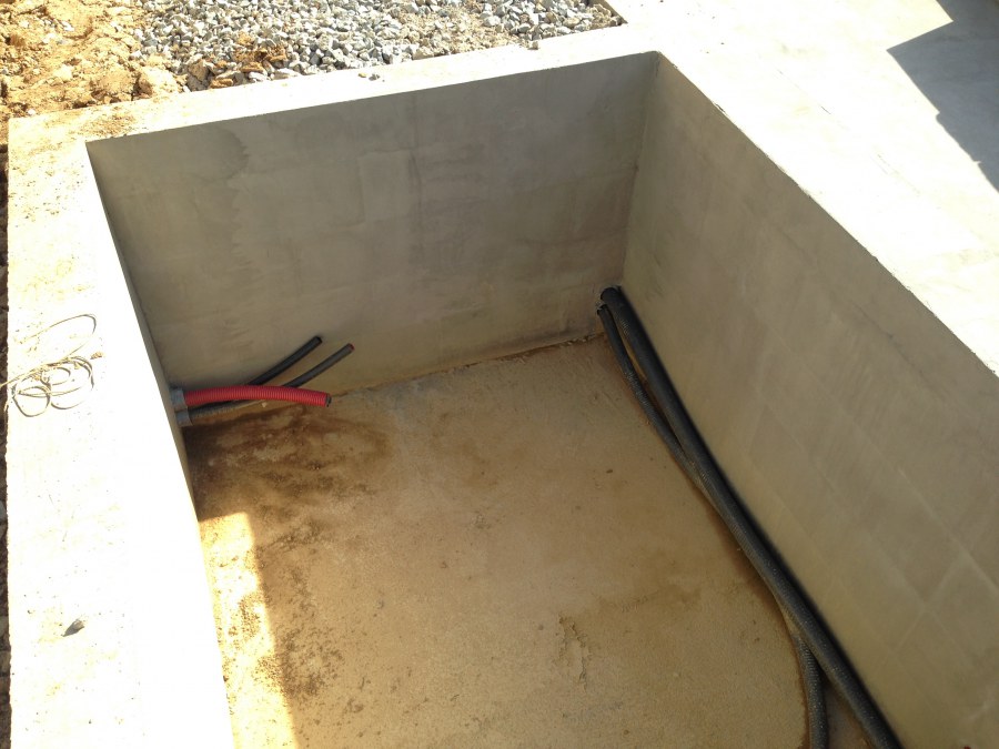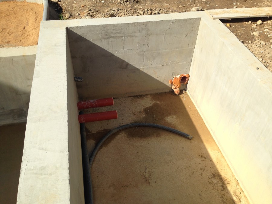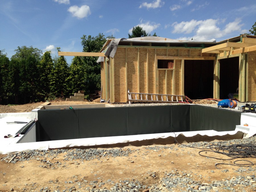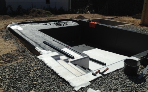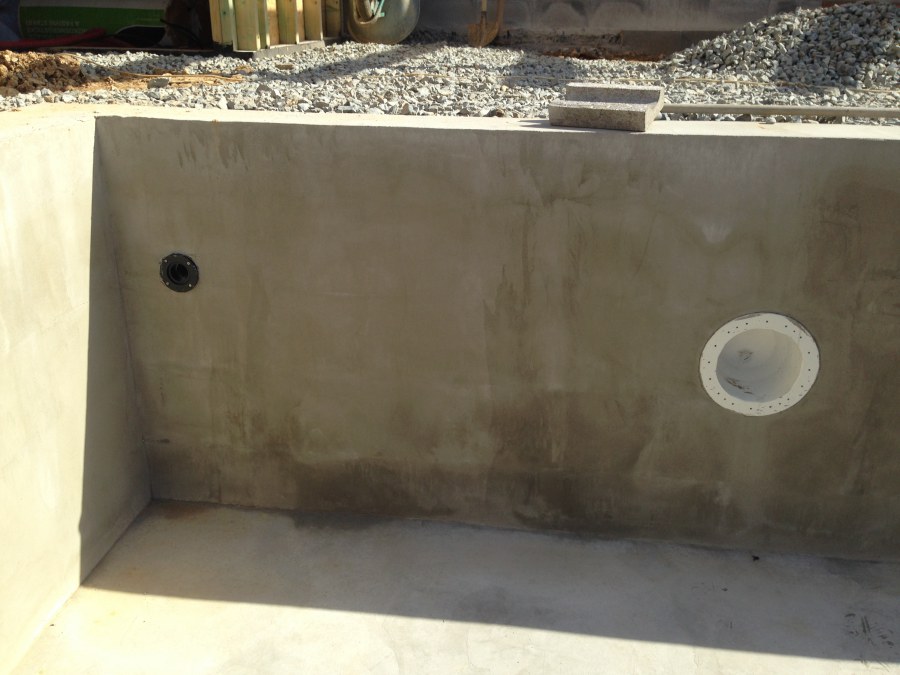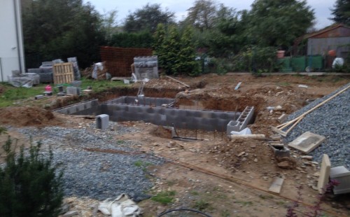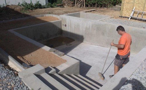 V roce 2018 jsme byli přivoláni k již rozdělanému jezírku. Klient měl postaveny základy pro bazén a v průběhu stavby se rozhodl pro stavbu koupacího jezírka. Základy jsme využili, k jedné stěně se přistavila technická místnost, na dno se uložila gule a natáhlo potrubí, do zdí se zabudovala bazénová světla, fóliová příruba pro skimmer Oase Aquaskim Gravity. Poté se zdi a dno zahladili vrstvou betonu. Po dokončení těchto přípravných prací se mohlo začít s fóliováním jezírka. Nejprve se položila geotextílie 500g na hrany a na schody se přivrtali fóliové lišty a na ně se následně začala navařovat jezírková fólie Fatra Aquaplast 805/V olivově zelená. Do technické místnosti se uložil biologicko-mechanický filtr na cca 35m3 Tripond Center Vortex C115, na něj se napojila UV lampa TMC Pro Clear 110W a čerpadlo Oase Aquamax Gravity Eco 20000.