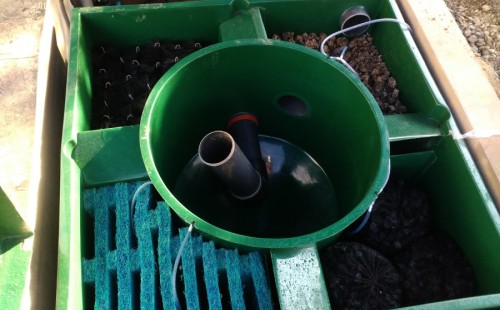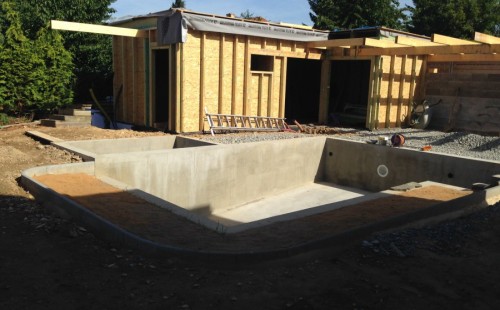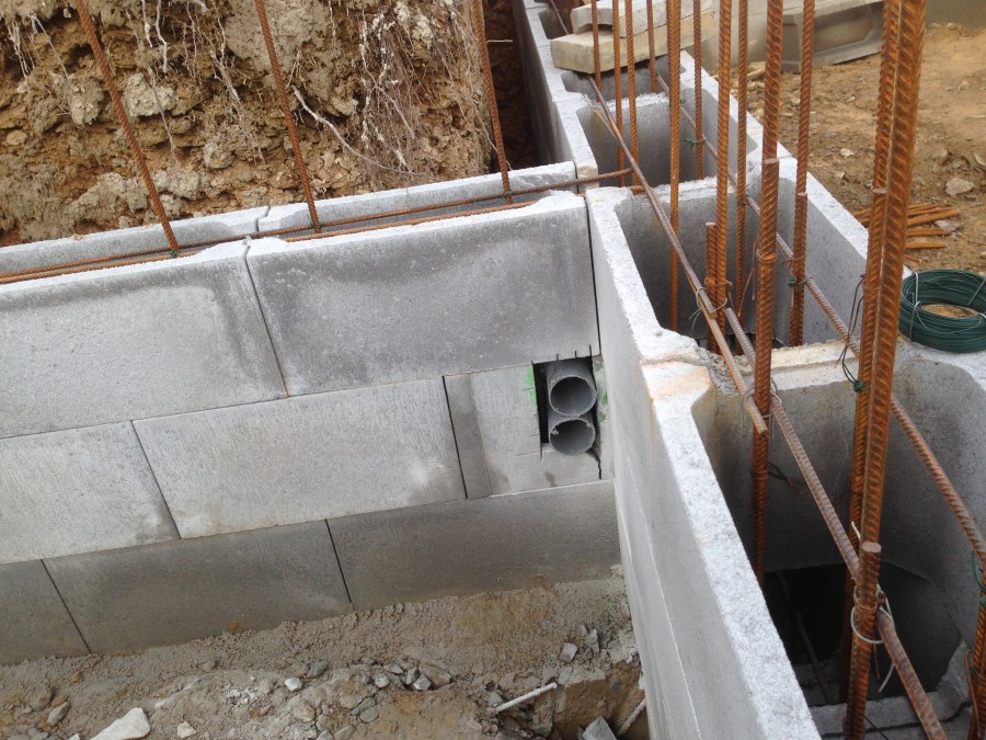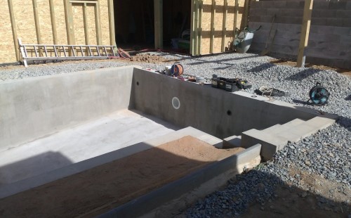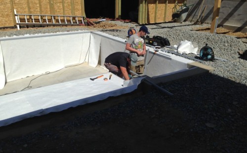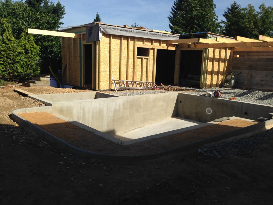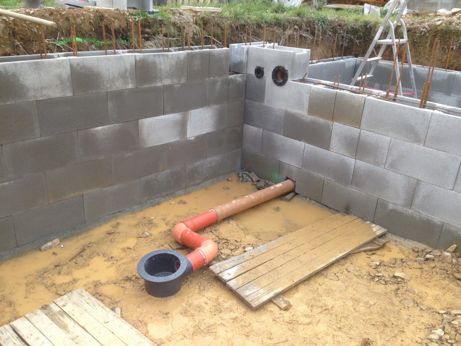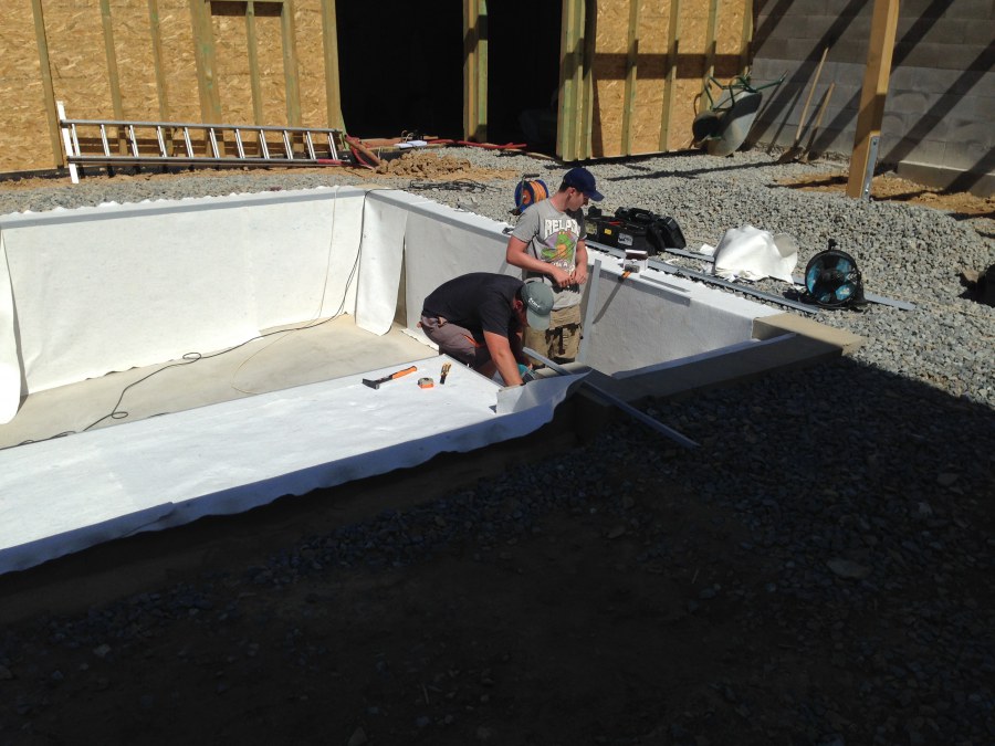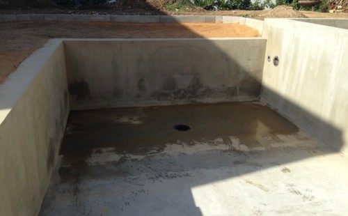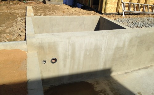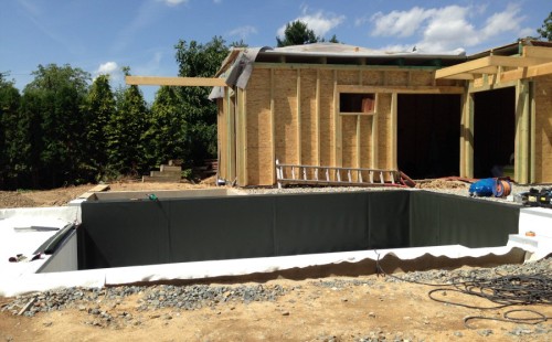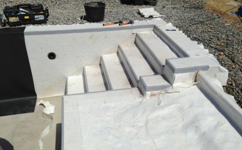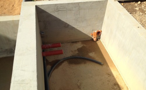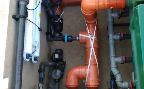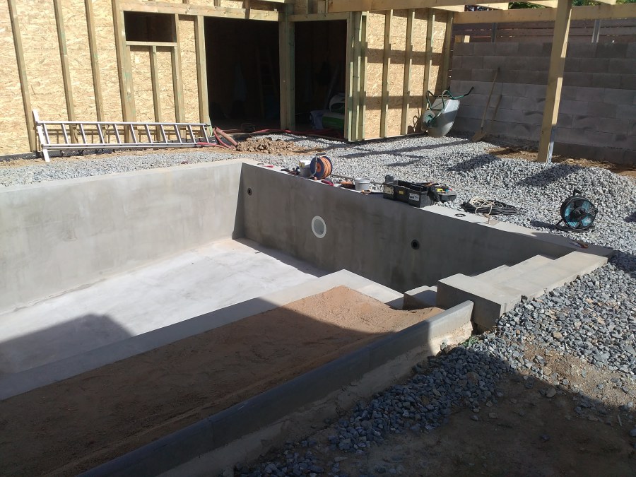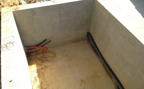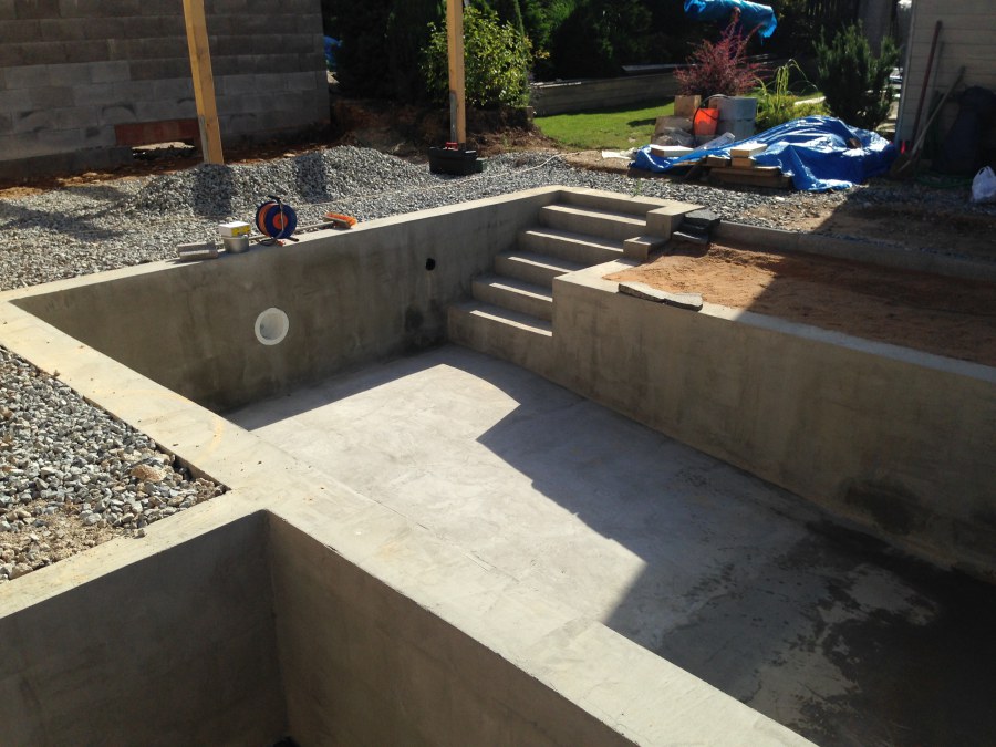 V roce 2018 jsme byli přivoláni k již rozdělanému jezírku. Klient měl postaveny základy pro bazén a v průběhu stavby se rozhodl pro stavbu koupacího jezírka. Základy jsme využili, k jedné stěně se přistavila technická místnost, na dno se uložila gule a natáhlo potrubí, do zdí se zabudovala bazénová světla, fóliová příruba pro skimmer Oase Aquaskim Gravity. Poté se zdi a dno zahladili vrstvou betonu. Po dokončení těchto přípravných prací se mohlo začít s fóliováním jezírka. Nejprve se položila geotextílie 500g na hrany a na schody se přivrtali fóliové lišty a na ně se následně začala navařovat jezírková fólie Fatra Aquaplast 805/V olivově zelená. Do technické místnosti se uložil biologicko-mechanický filtr na cca 35m3 Tripond Center Vortex C115, na něj se napojila UV lampa TMC Pro Clear 110W a čerpadlo Oase Aquamax Gravity Eco 20000.