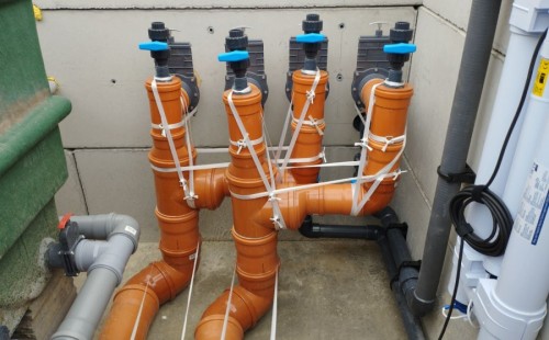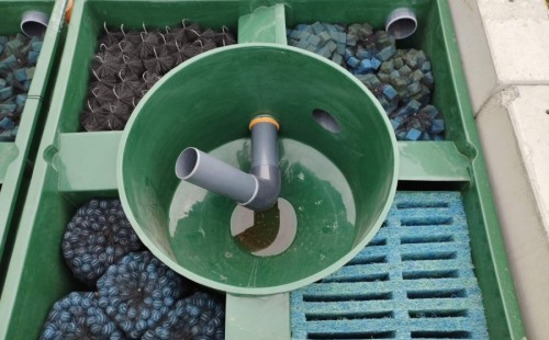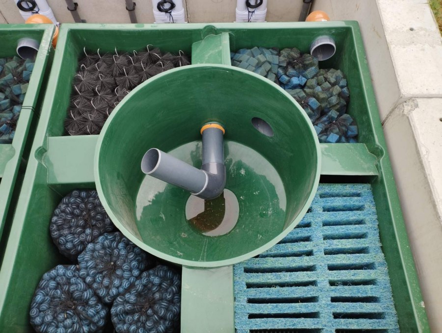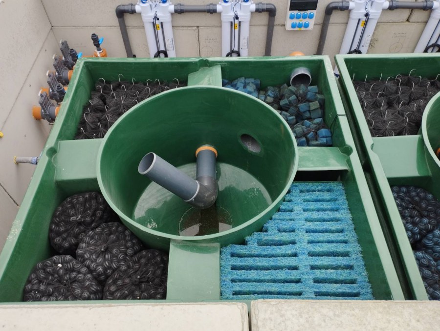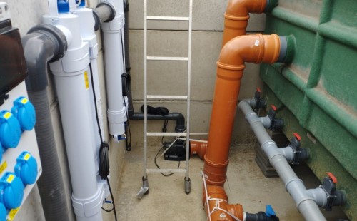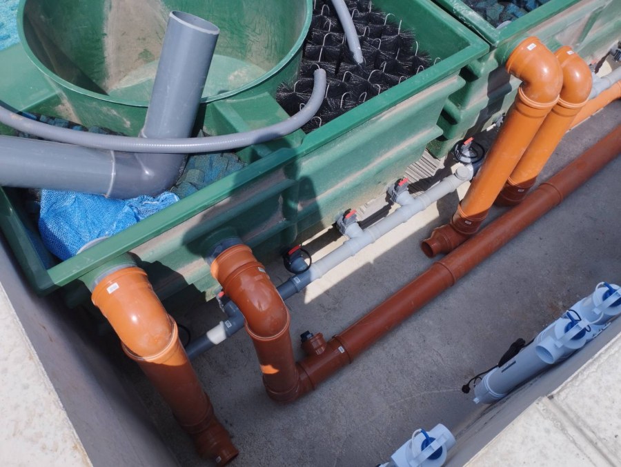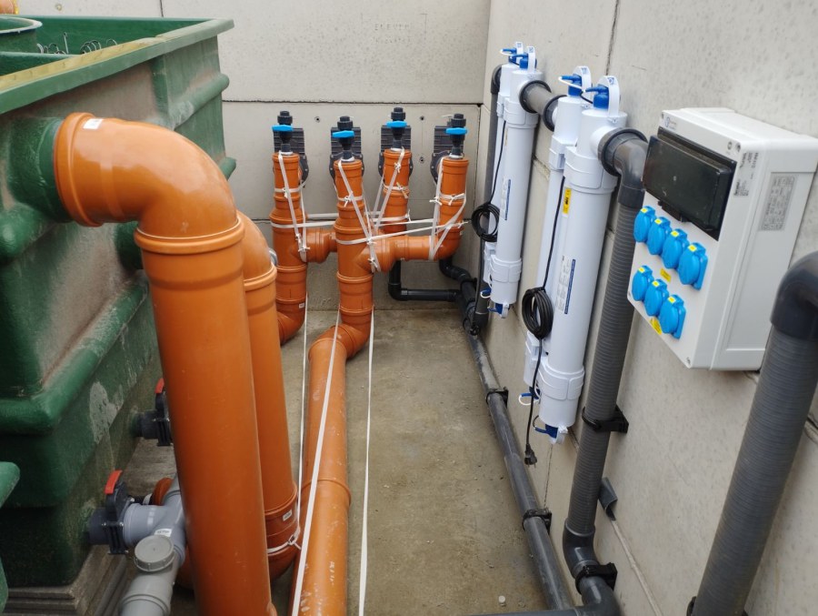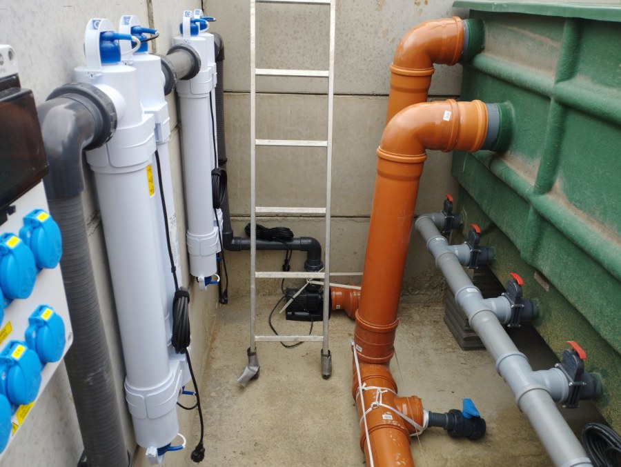 Naše práce byla zapojit technologii. Do technické místnosti jsme umístili 2x biologicko-mechanický filtr Tripond Vortex Center C115, 4x UV lampa TMC Pro Clear 110W, čerpadla 2x Oase AquaMax Gravity 20000.