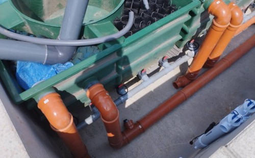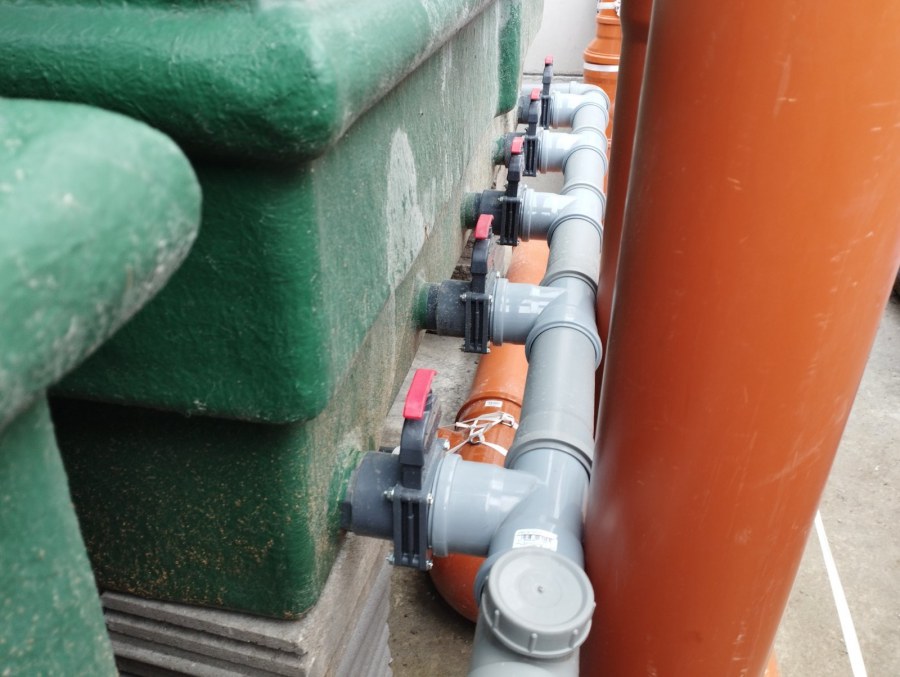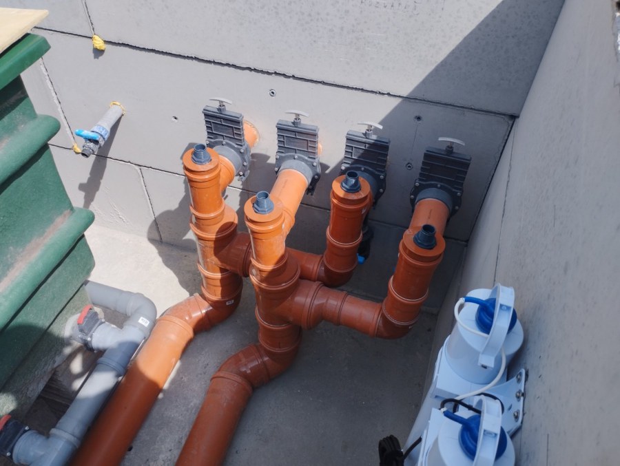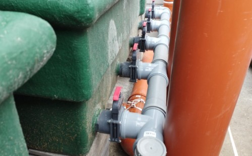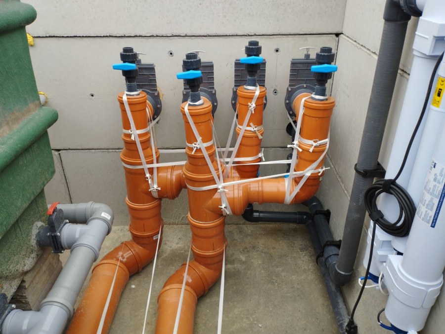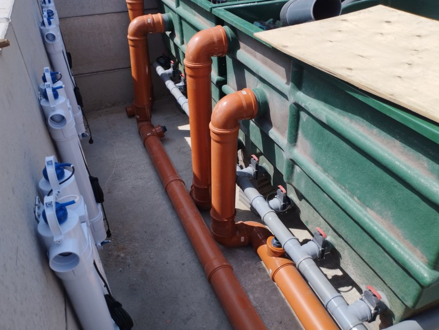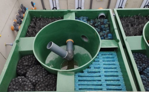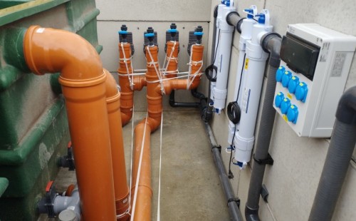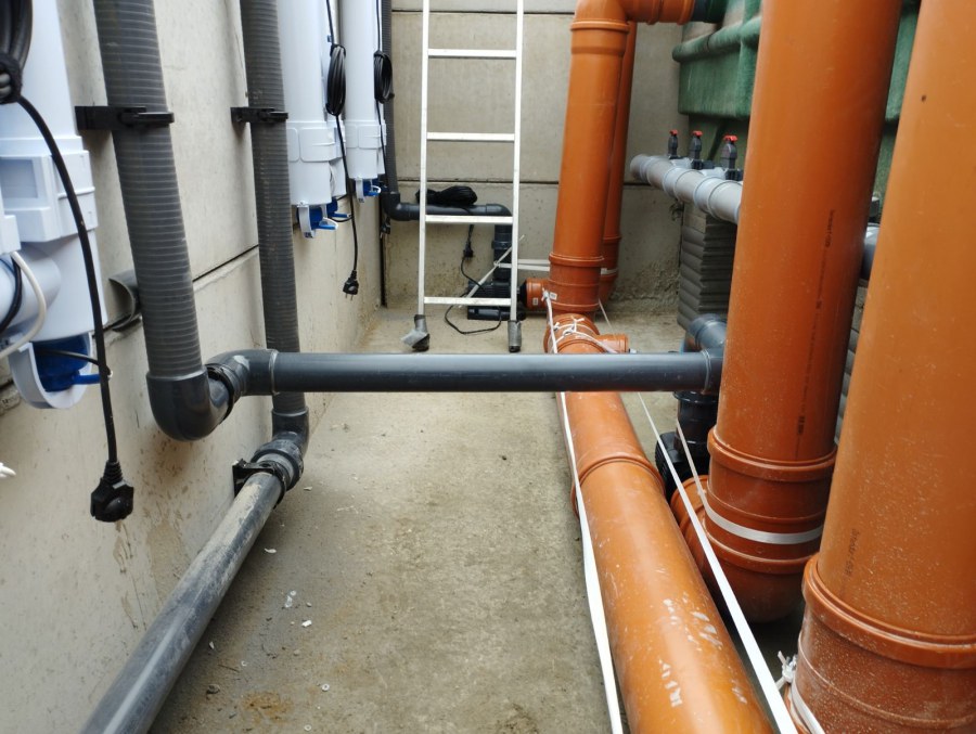 Naše práce byla zapojit technologii. Do technické místnosti jsme umístili 2x biologicko-mechanický filtr Tripond Vortex Center C115, 4x UV lampa TMC Pro Clear 110W, čerpadla 2x Oase AquaMax Gravity 20000.