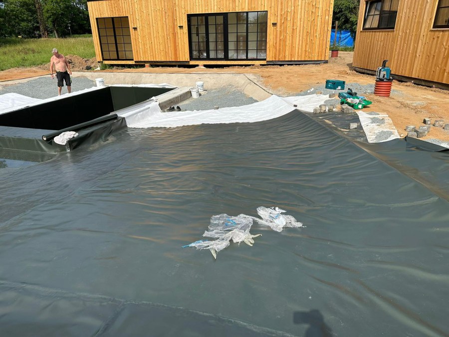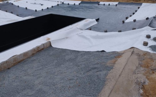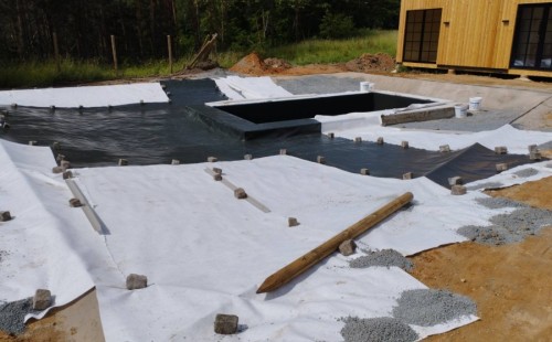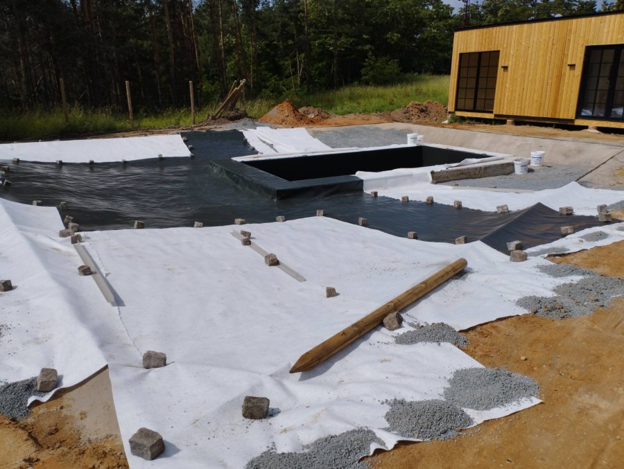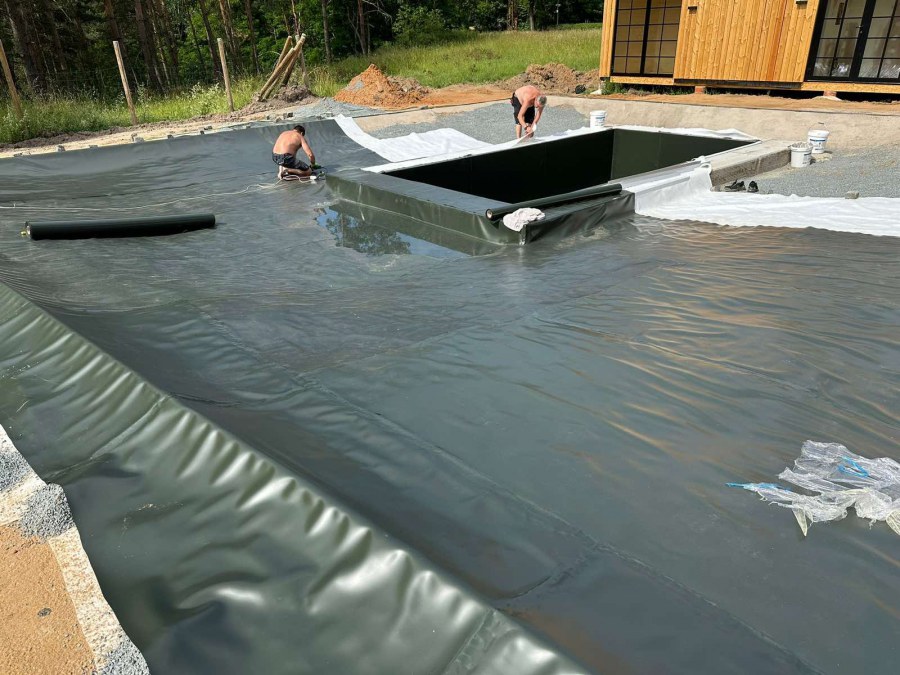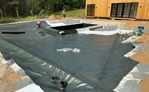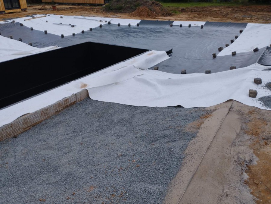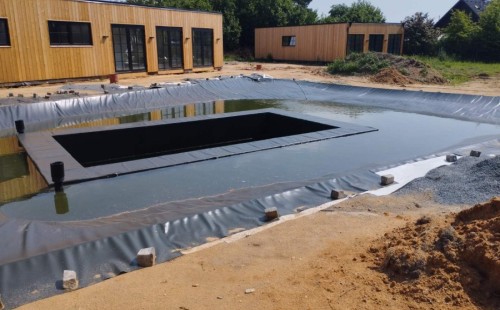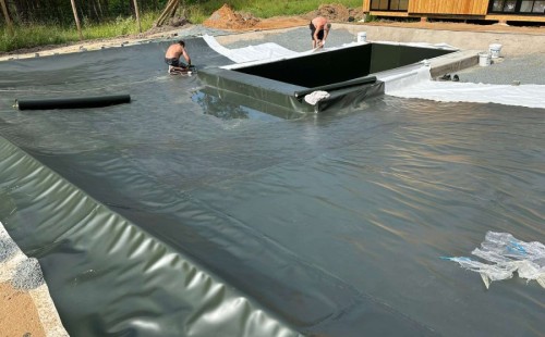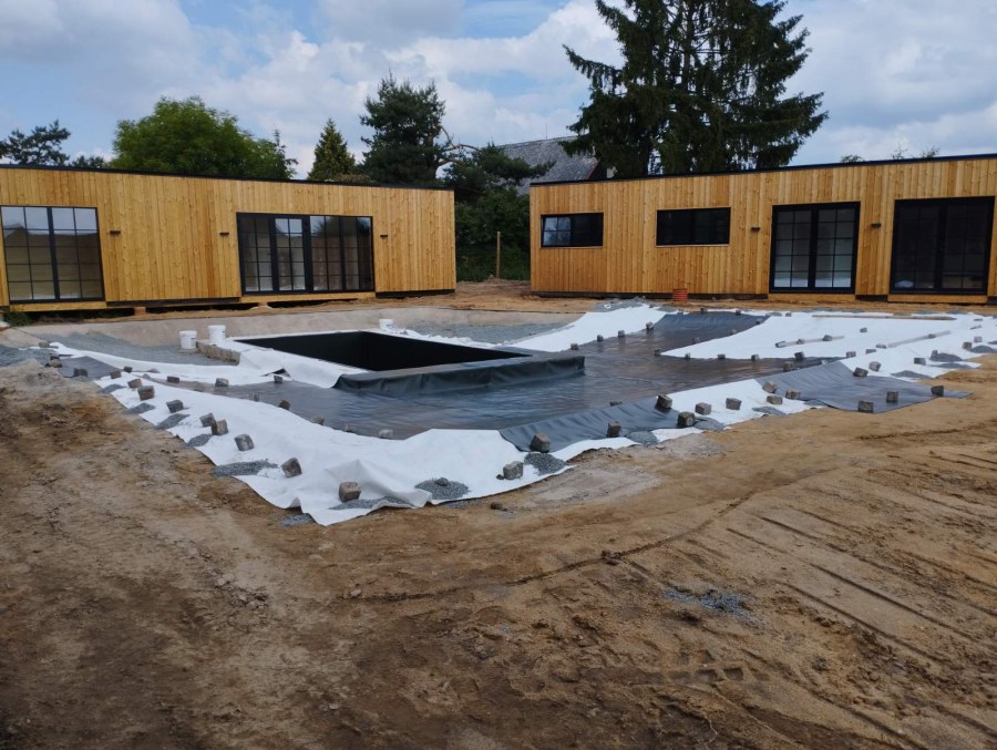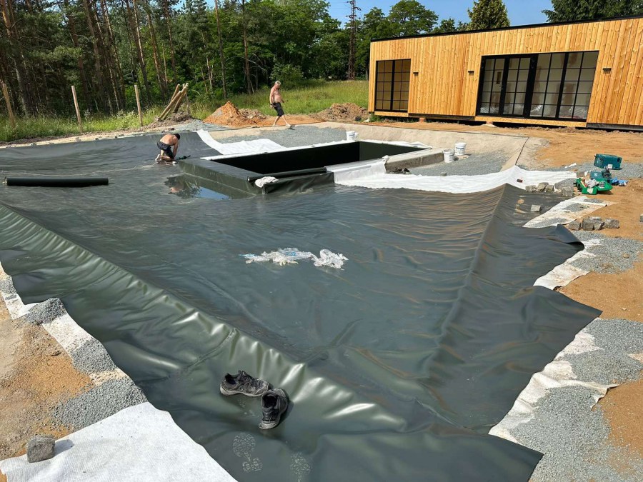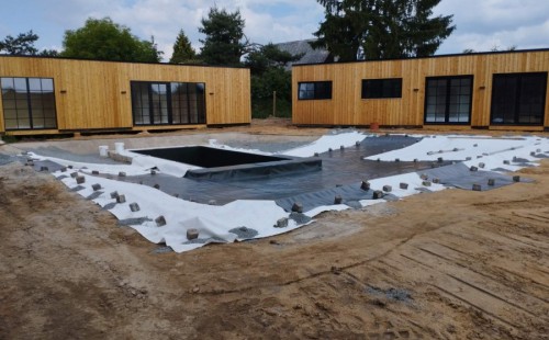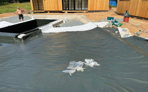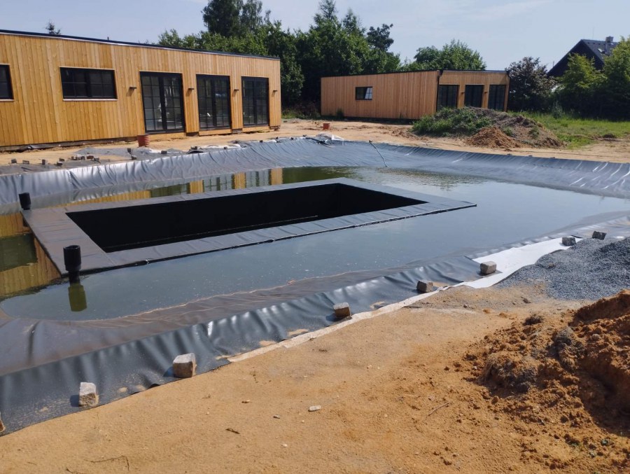 Po pečlivém plánování jsme se s klientem dohodli na rozdělení prací, tak aby bylo rychle vše v provozu a stihl se začátek sezóny. Klient si pod naším stavebním dozorem postavil základ koupacího jezírka ze ztraceného bednění, na dno zabetonoval spodní výpusť - gulu a do pobřežních zón na dno fóliové příruby na skimmer Oase Aquaskim Gravity, od nich natáhl potrubí do technické místnosti které uzavřel šoupaty. Připravil technickou místnost na zapojení technologie, natáhl potřebné potrubí pro vývěr čisté vody. Po těchto přípravách začali s pokládkou fólie, nejprve celou plochu jezírka pokryli kopaným pískem poté položil námi dodanou geotextílii 500g a jezírkovou fólii Fatra Aquaplast 805/V olivově zelenou.