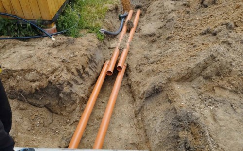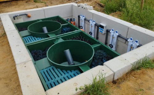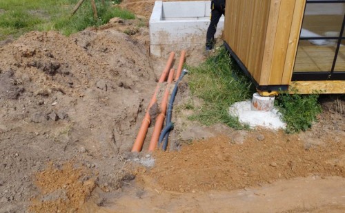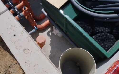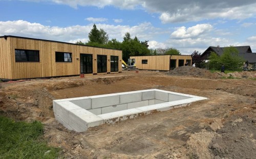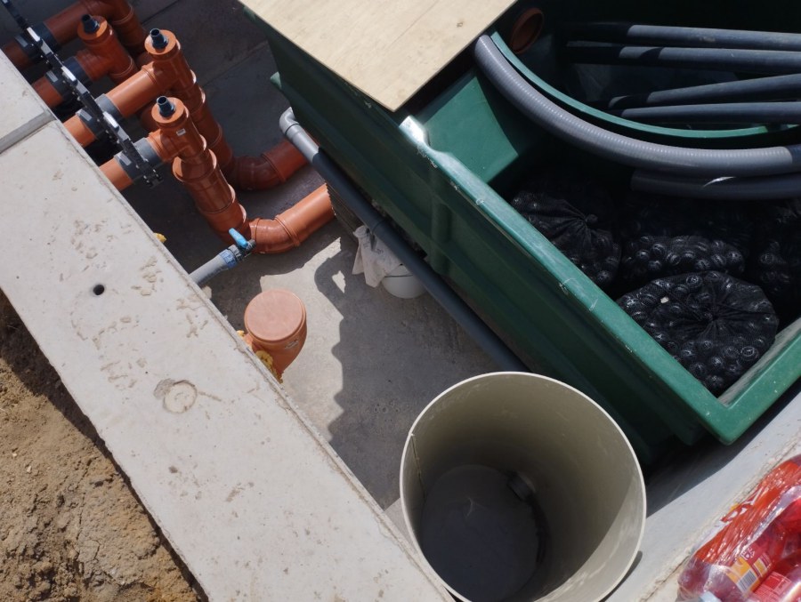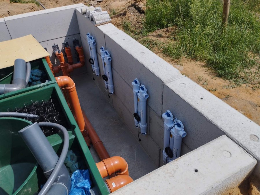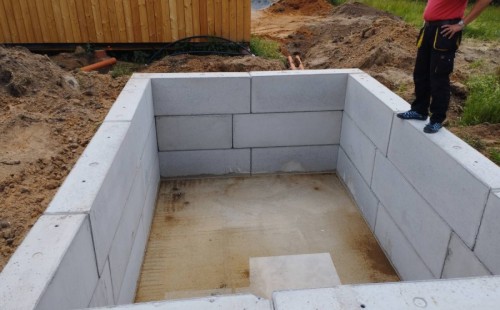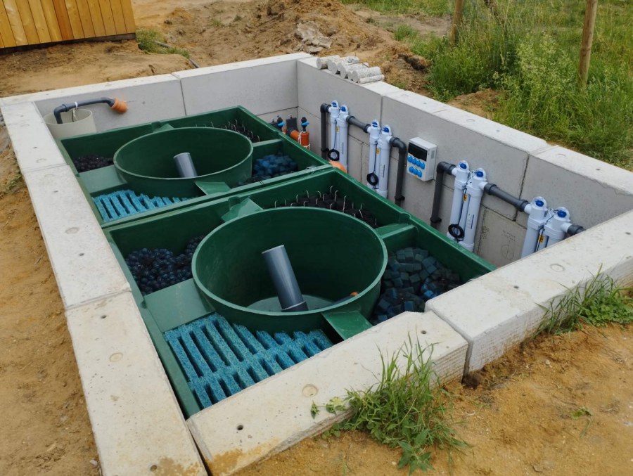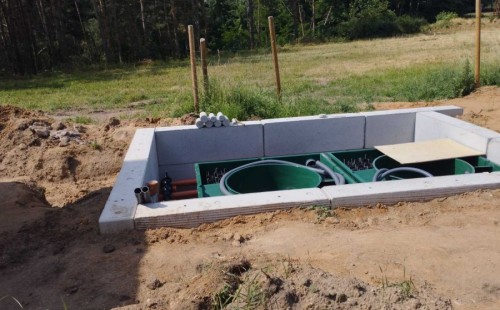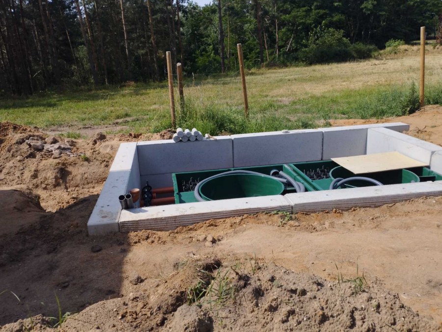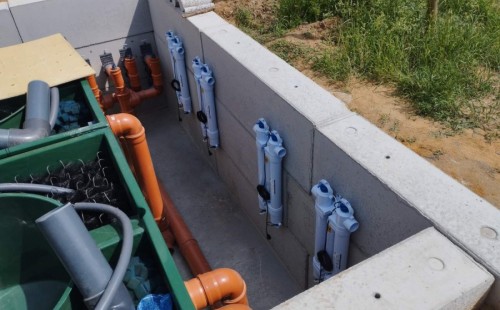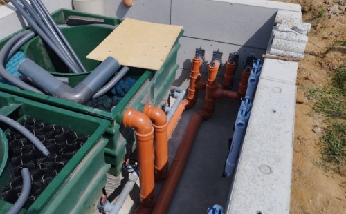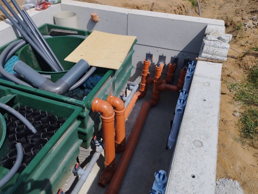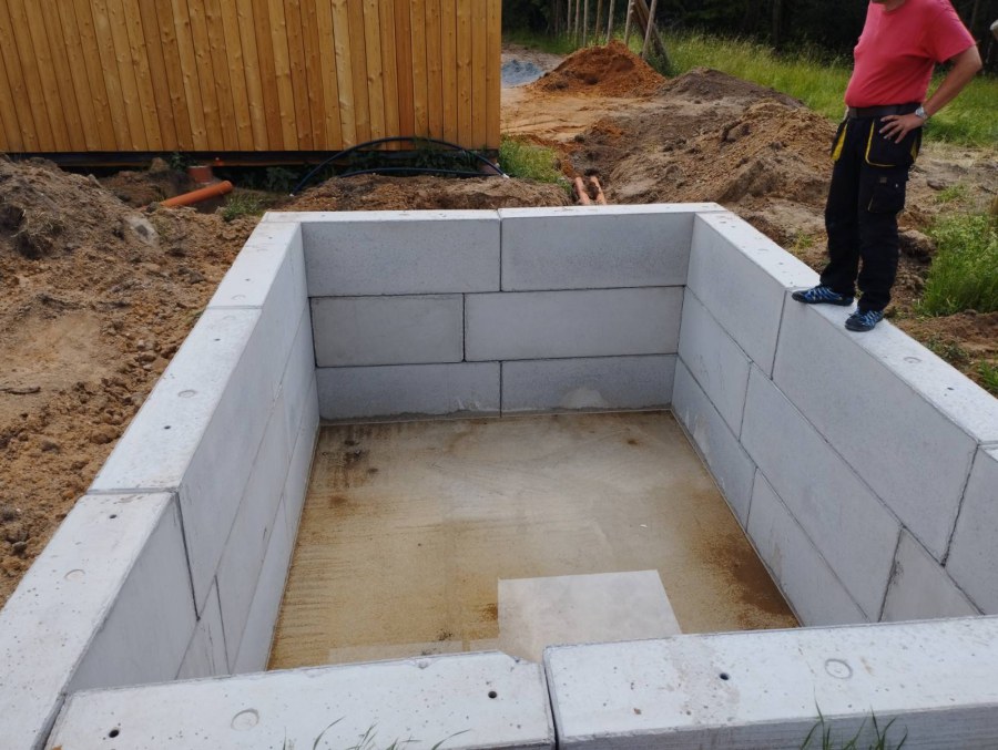 Po pečlivém plánování jsme se s klientem dohodli na rozdělení prací, tak aby bylo rychle vše v provozu a stihl se začátek sezóny. Klient si pod naším stavebním dozorem postavil základ koupacího jezírka ze ztraceného bednění, na dno zabetonoval spodní výpusť - gulu a do pobřežních zón na dno fóliové příruby na skimmer Oase Aquaskim Gravity, od nich natáhl potrubí do technické místnosti které uzavřel šoupaty. Připravil technickou místnost na zapojení technologie, natáhl potřebné potrubí pro vývěr čisté vody. Po těchto přípravách začali s pokládkou fólie, nejprve celou plochu jezírka pokryli kopaným pískem poté položil námi dodanou geotextílii 500g a jezírkovou fólii Fatra Aquaplast 805/V olivově zelenou.