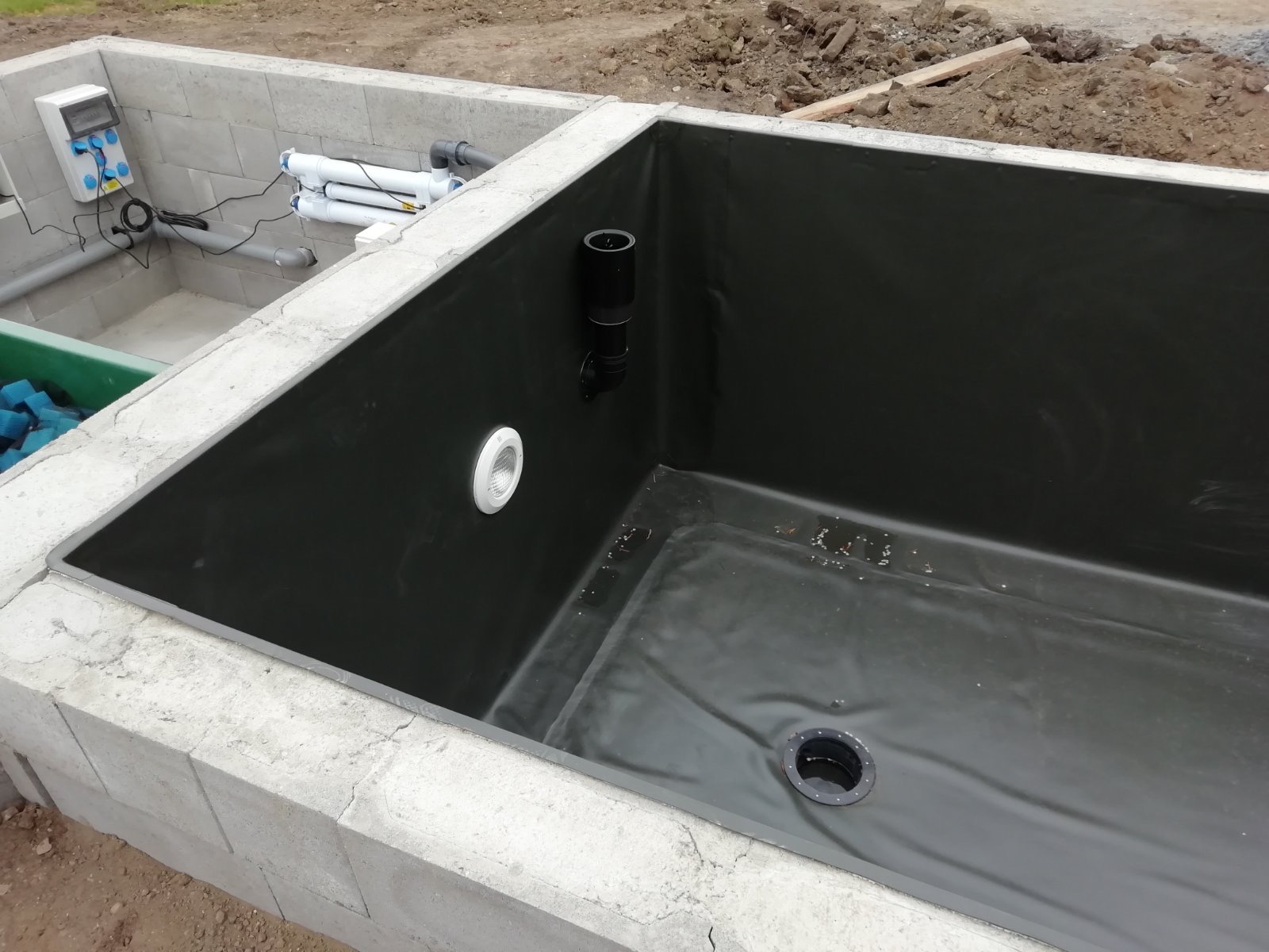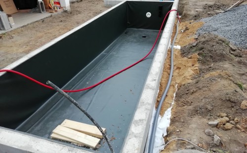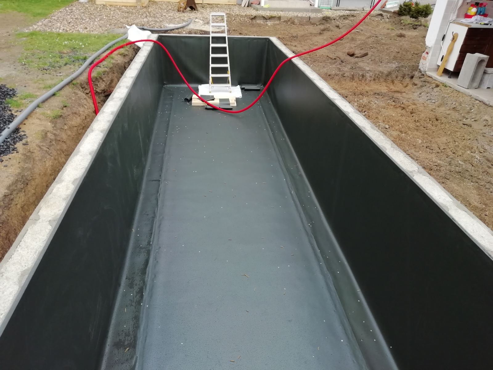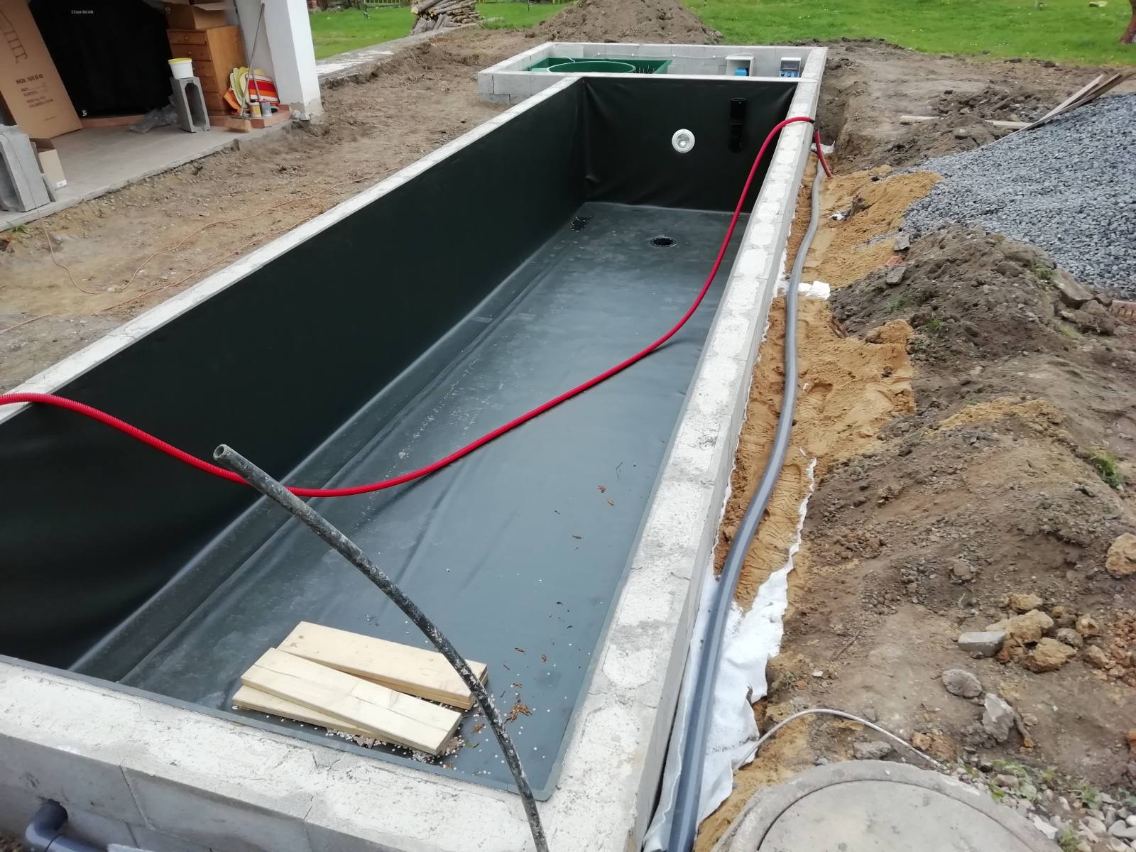 V poslední době se na nás obrací stále více klientů s žádostí o stavbu koupacího bazénu/jezírka, ve kterém je ale místo chlorované vody voda živá. Takové jezírko jsme pomáhali budovat v květnu. Oslovili nás klienti s žádostí o stavbu obdélníkového jezírka, plánovaného bez ryb a květin a bez chemické údržby. Po konzultaci u nás na firmě se klienti nakonec rozhodli si výkopové a stavební práce realizovat sami, pod naším technickým dozorem. Dle našich instrukcí nechali vykopat tvar jezírka a technické místnosti, ty poté nechali obezdít ztraceným bedněním. Na dno položili gulu, od ní natáhli potrubí do technické místnosti kde ho uzavřeli šoupaty 110mm, do zdi vložili fóliovou přírubu pro skimmer Oase AquaSkim Gravity. Po dokončení těchto prací mohli přijet naši technici začít pokládat fólii. Nejprve vypískovali dno kopaným pískem, pak začali s pokládkou geotextílie 500g, na hrany jezírka připevnili speciální koutové lišty, na které začali navařovat jezírkovou olivově zelenou fólii Fatra Aquaplast 805/V. Tu svařili dle tvaru jezírka. Do technické místnosti položili biologicko-mechanický filtr Tripond Center-Vortex C115, UV lampu TMC Pro Pond Advantage 110W a čerpadlo Oase AquaMax Gravity Eco 20000.