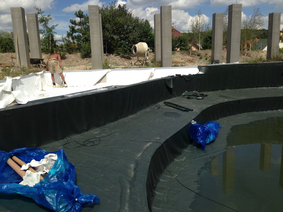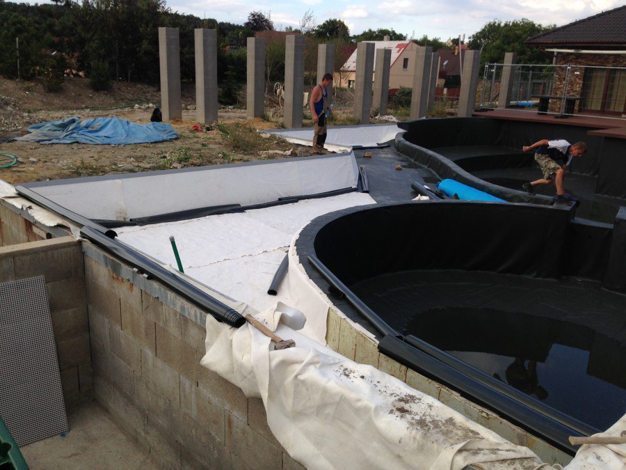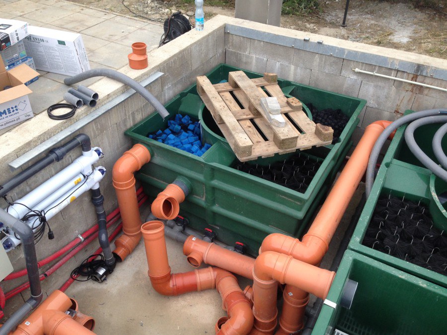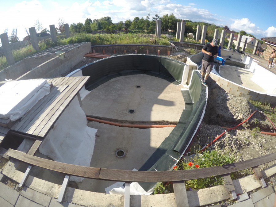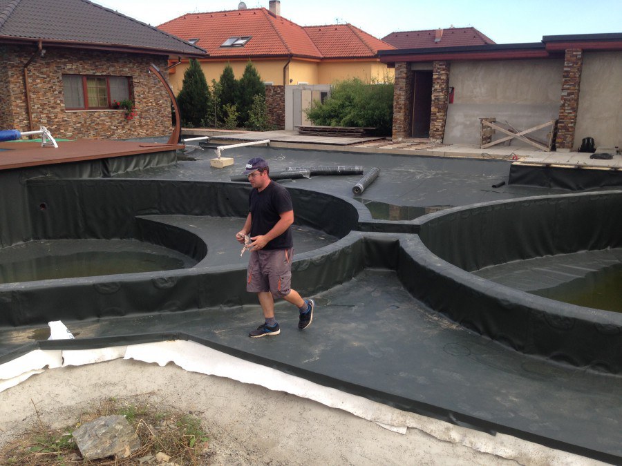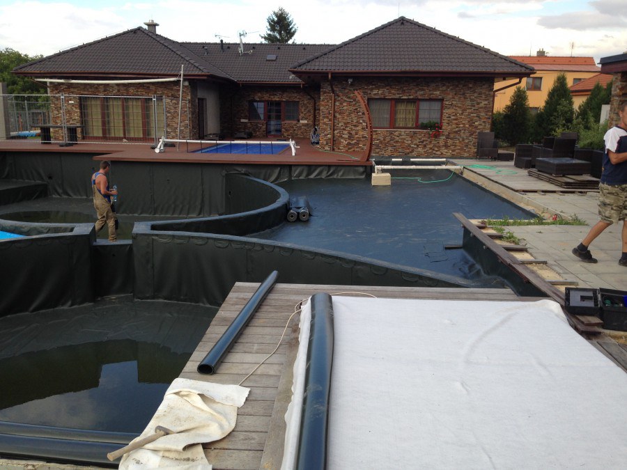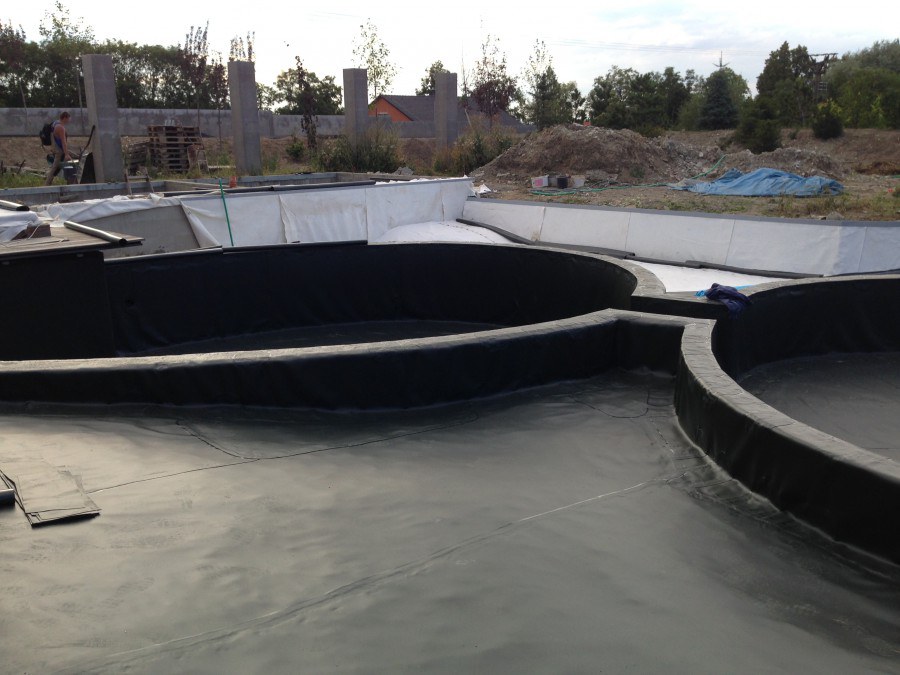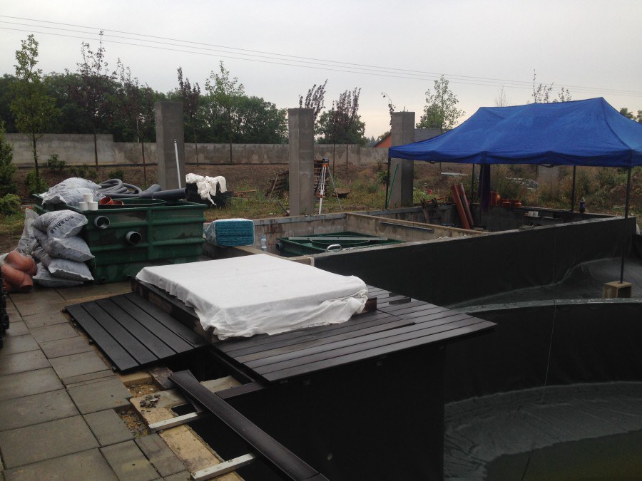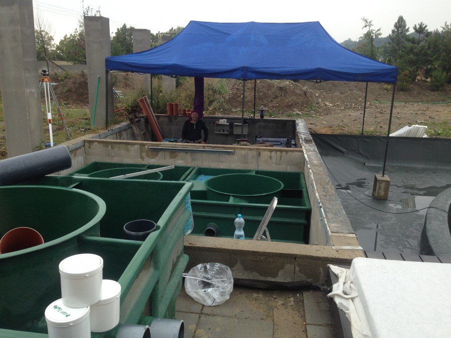 Po nezbytných úpravách se začalo s pokládkou geotextílie 500g, přiděláním speciální poplastované lišty na uchycení fólie a svařením fólie Fatra Aquaplast 805 1,5 mm. Pro tento systém byla navržena technologie: filtry 4x Tripond Center Vortex C-115 a 2x Tripond Center Vortex C-80, čerpadla 4x Oase AquaMax Eco Gravity 20000, 2x Oase AquaMax Eco Premium 16000, 2x regulátor výkonu Messner, 6x UV lampa TMC Pro Clear Advantage 110W, 3x vzduchovací motor Hailea HAP 100, rozvod vzduchu v PPR, 2x velký elektrický rozvaděč, 4x trubkový skimmer Oase Aquaskim Gravity a 4x vzduchovací gula.