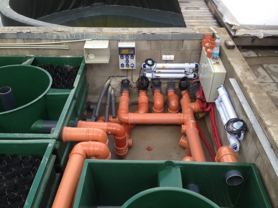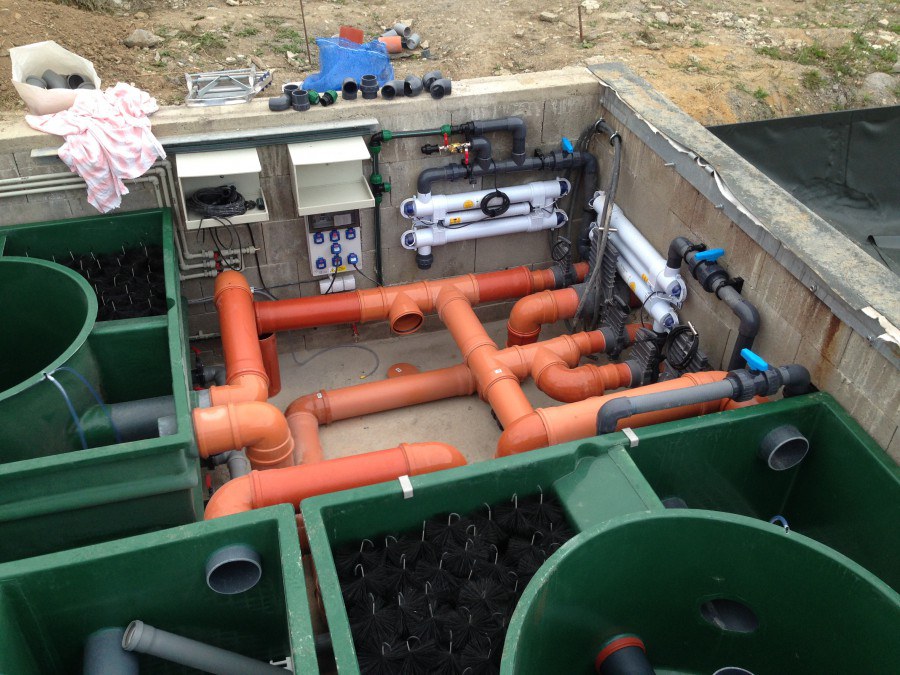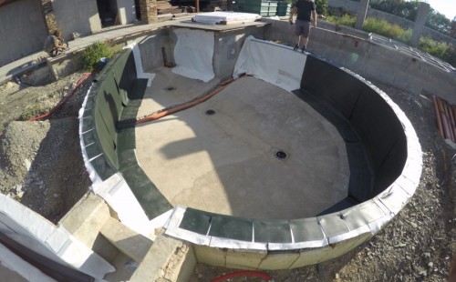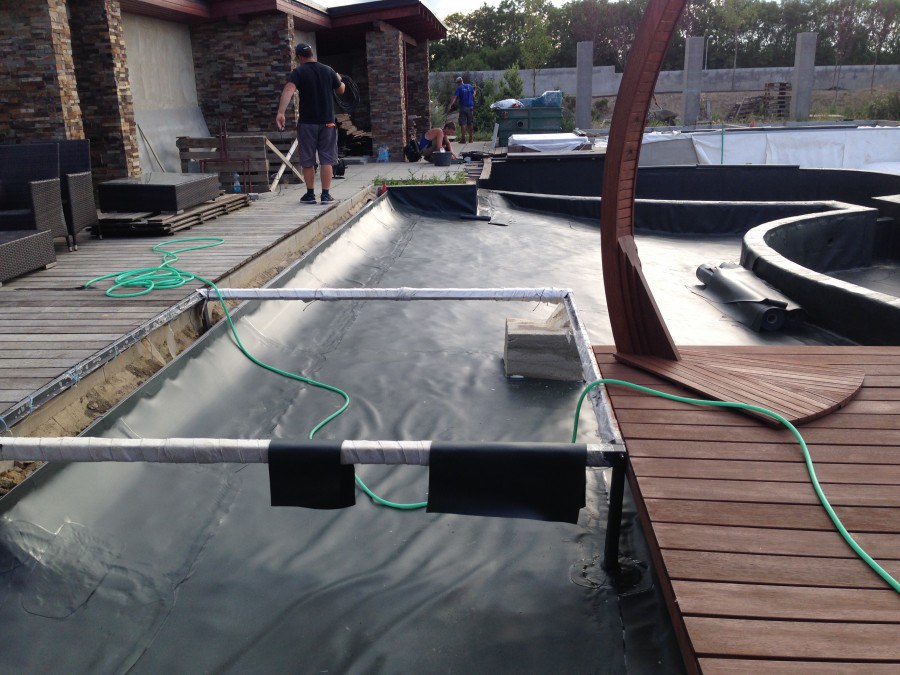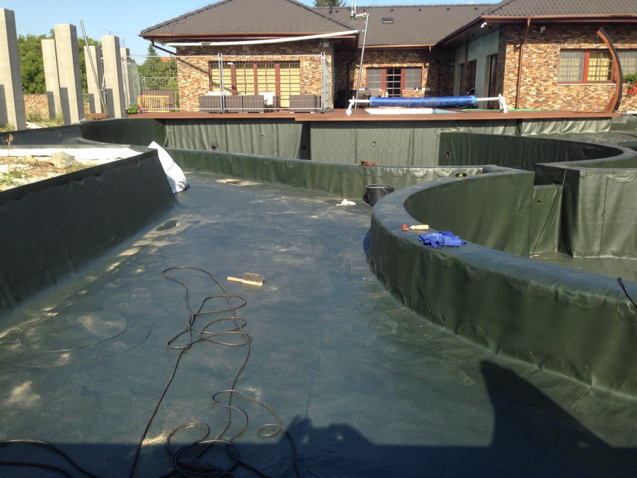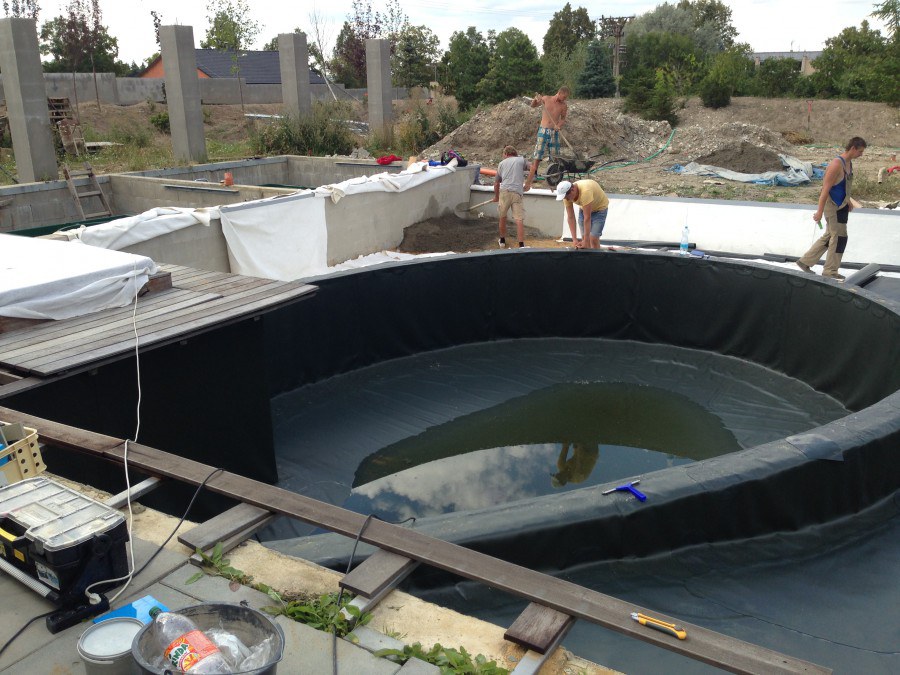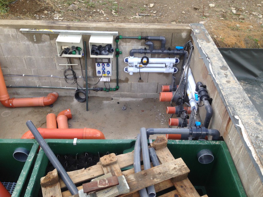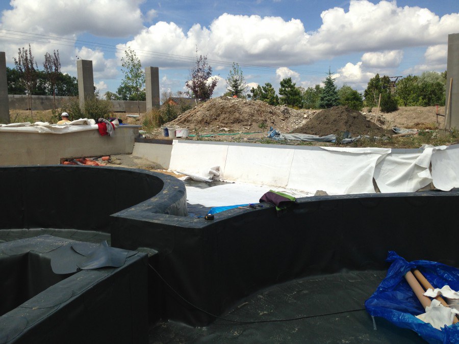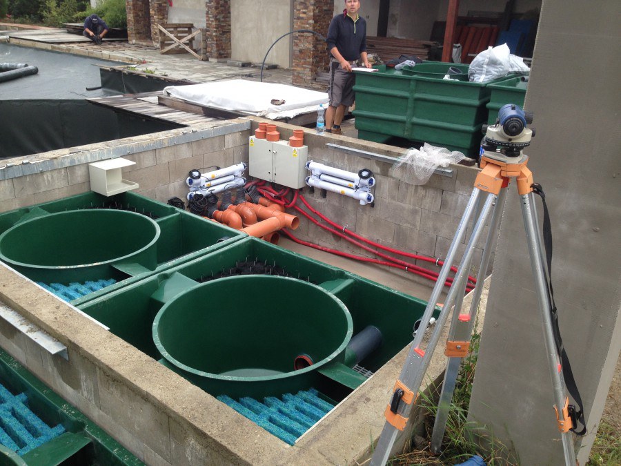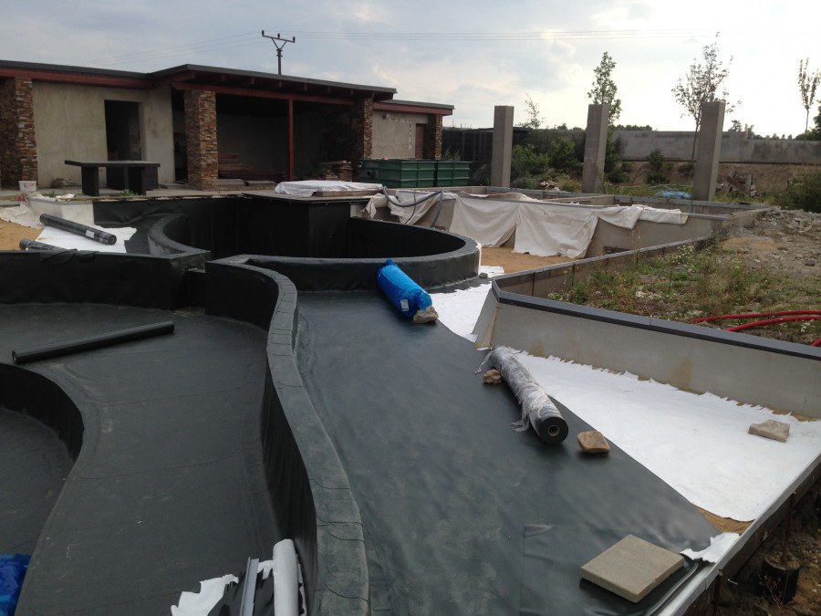 Po nezbytných úpravách se začalo s pokládkou geotextílie 500g, přiděláním speciální poplastované lišty na uchycení fólie a svařením fólie Fatra Aquaplast 805 1,5 mm. Pro tento systém byla navržena technologie: filtry 4x Tripond Center Vortex C-115 a 2x Tripond Center Vortex C-80, čerpadla 4x Oase AquaMax Eco Gravity 20000, 2x Oase AquaMax Eco Premium 16000, 2x regulátor výkonu Messner, 6x UV lampa TMC Pro Clear Advantage 110W, 3x vzduchovací motor Hailea HAP 100, rozvod vzduchu v PPR, 2x velký elektrický rozvaděč, 4x trubkový skimmer Oase Aquaskim Gravity a 4x vzduchovací gula.