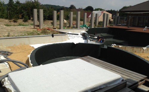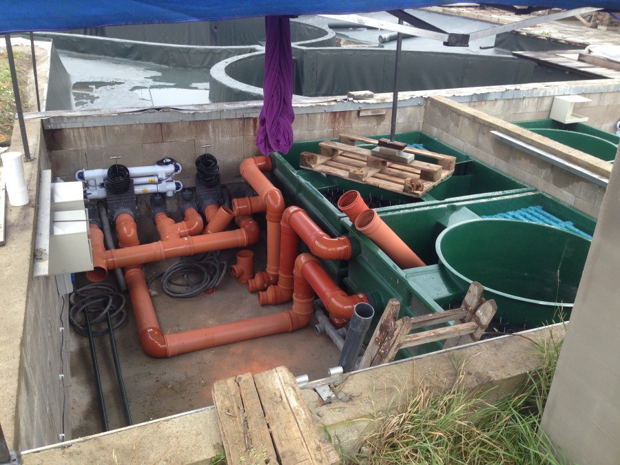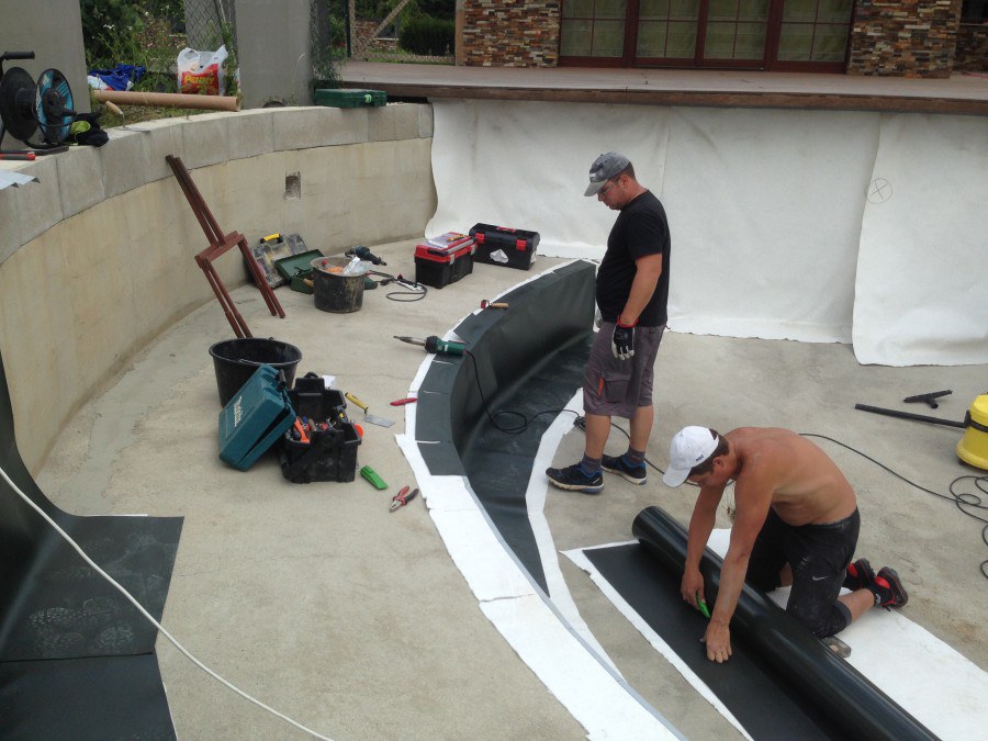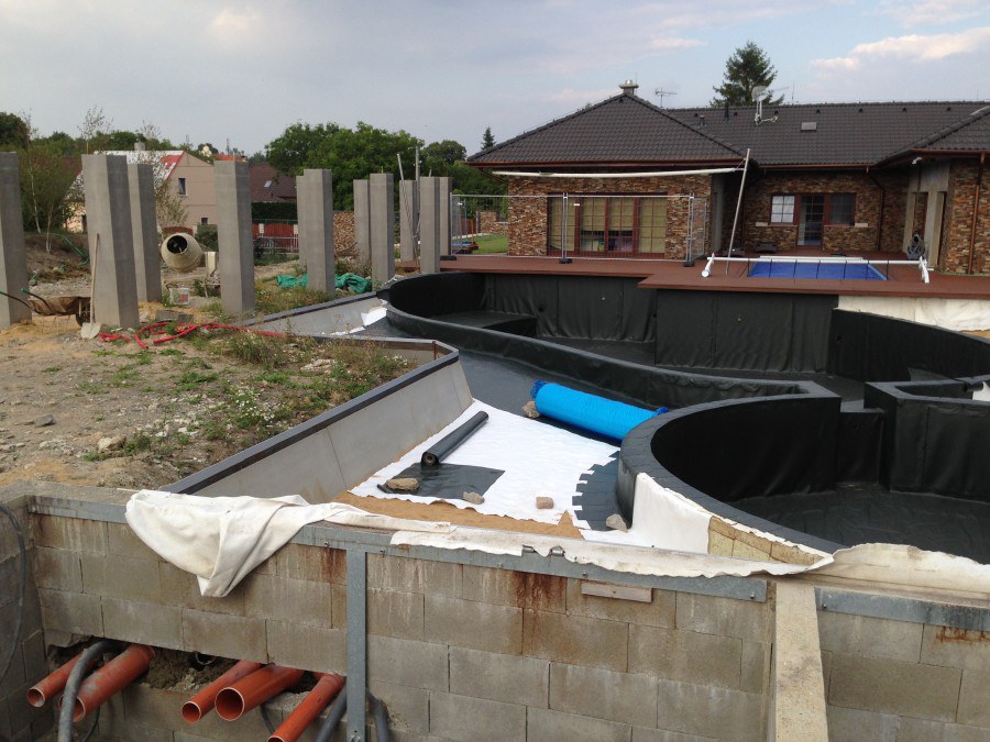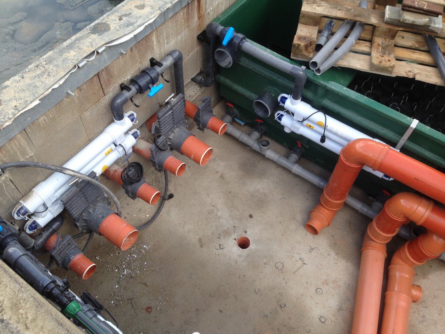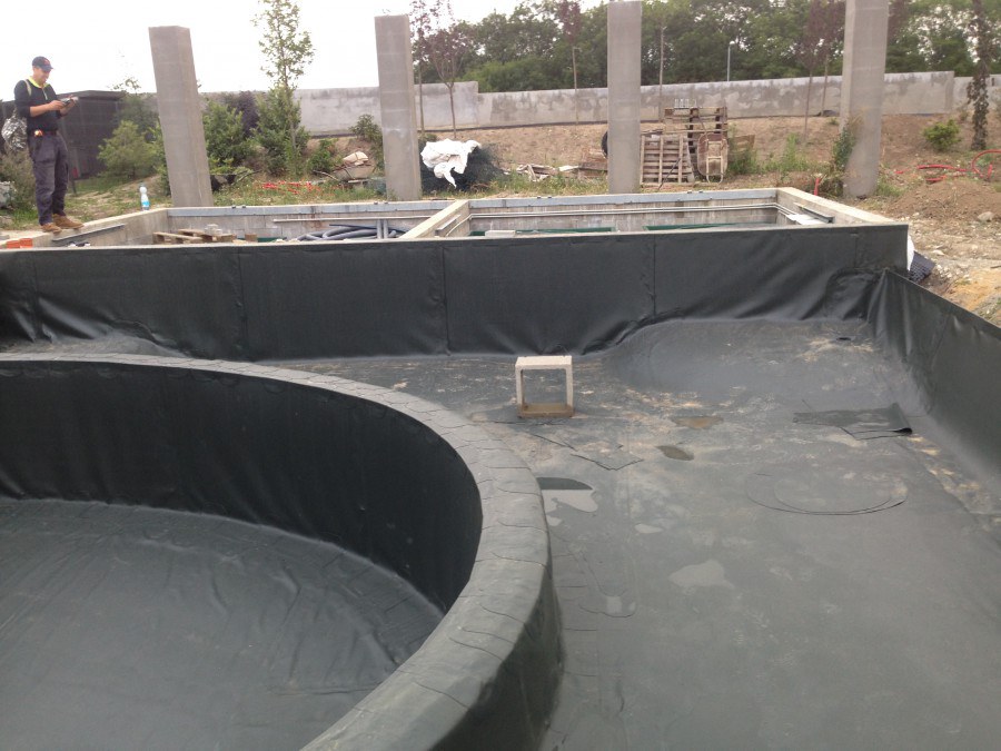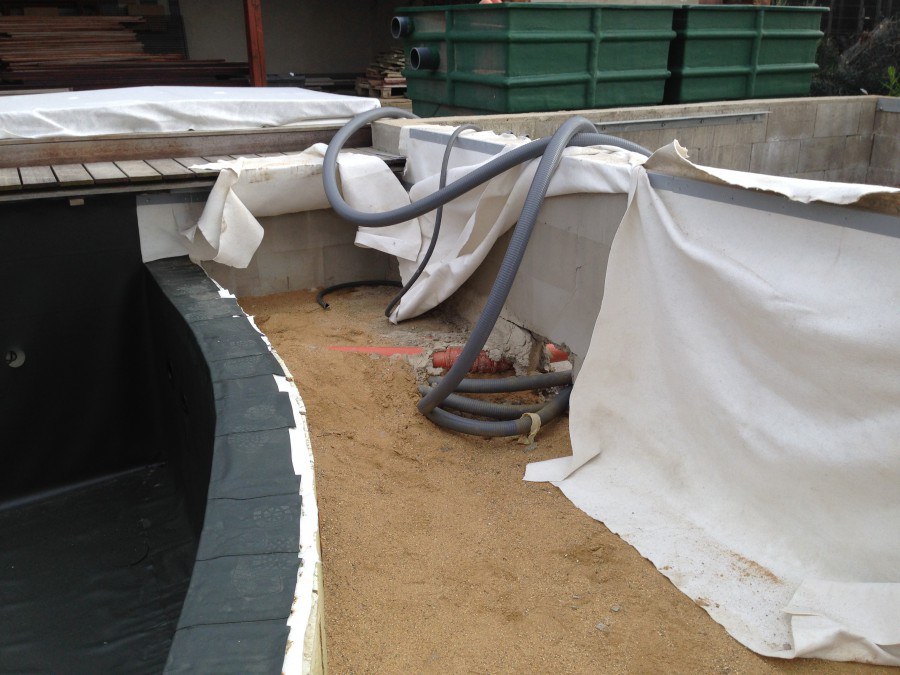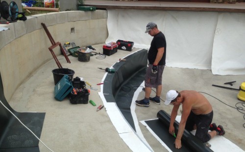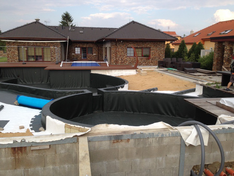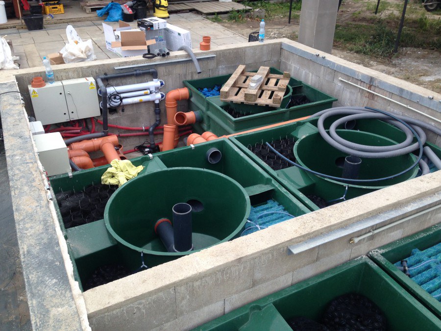 Po nezbytných úpravách se začalo s pokládkou geotextílie 500g, přiděláním speciální poplastované lišty na uchycení fólie a svařením fólie Fatra Aquaplast 805 1,5 mm. Pro tento systém byla navržena technologie: filtry 4x Tripond Center Vortex C-115 a 2x Tripond Center Vortex C-80, čerpadla 4x Oase AquaMax Eco Gravity 20000, 2x Oase AquaMax Eco Premium 16000, 2x regulátor výkonu Messner, 6x UV lampa TMC Pro Clear Advantage 110W, 3x vzduchovací motor Hailea HAP 100, rozvod vzduchu v PPR, 2x velký elektrický rozvaděč, 4x trubkový skimmer Oase Aquaskim Gravity a 4x vzduchovací gula.