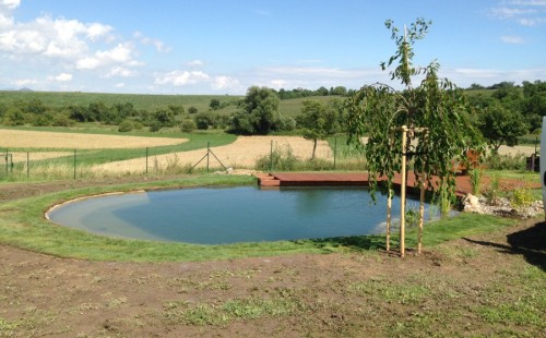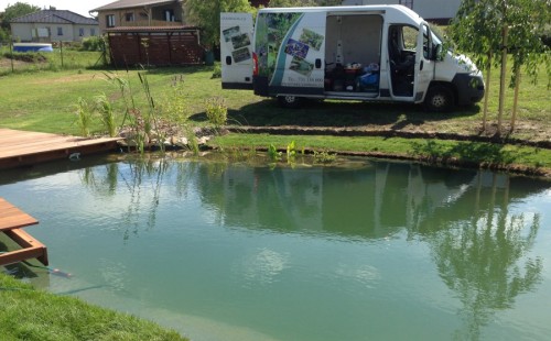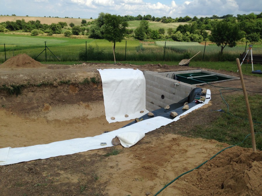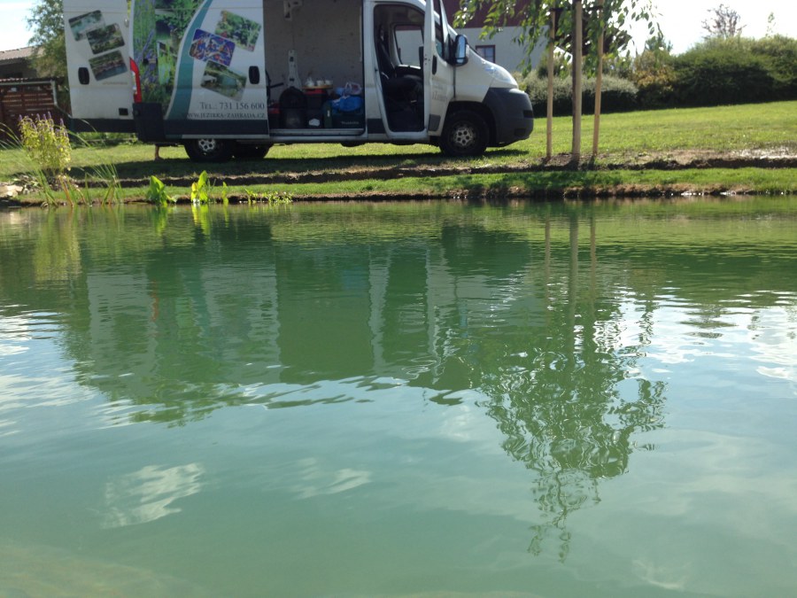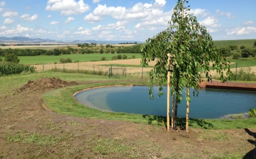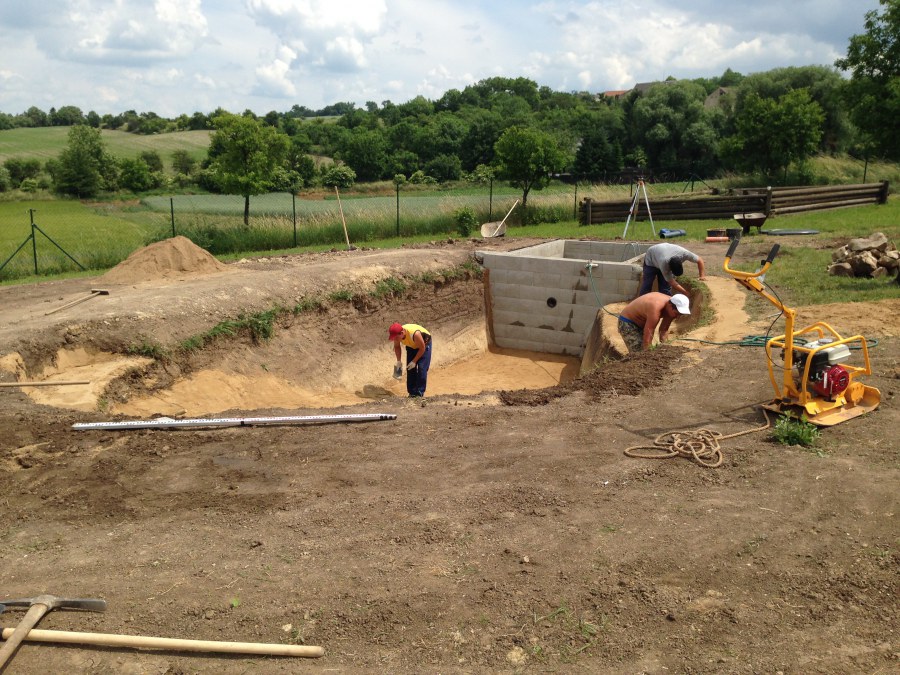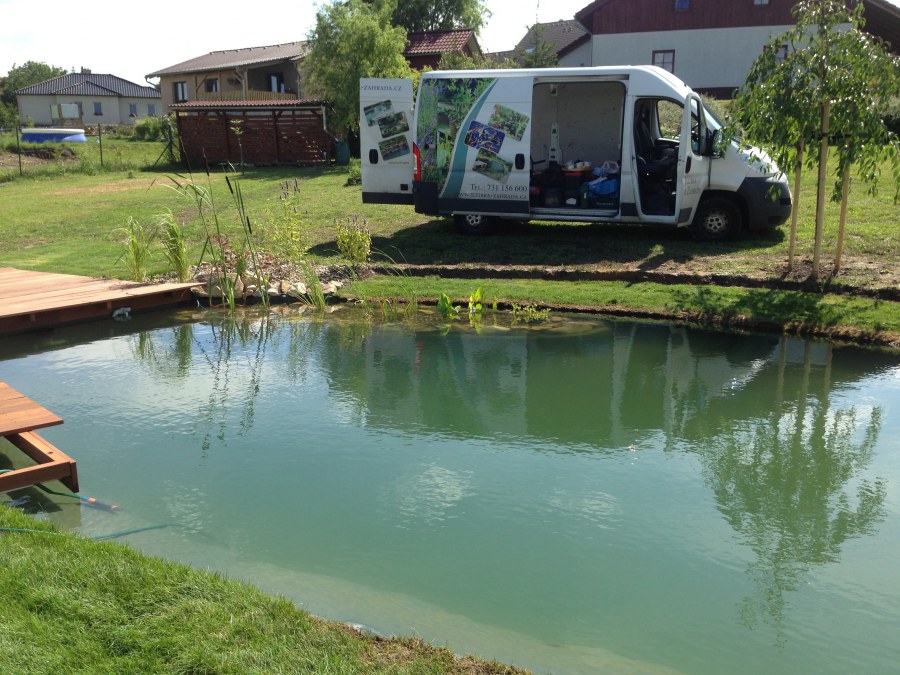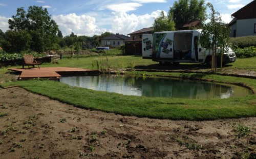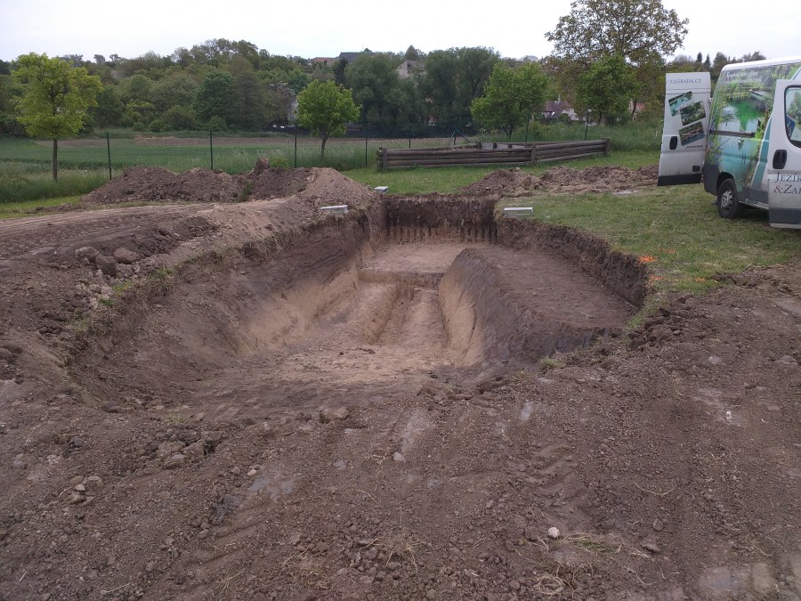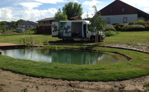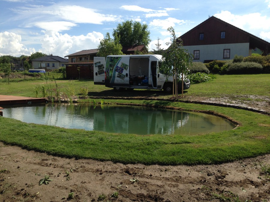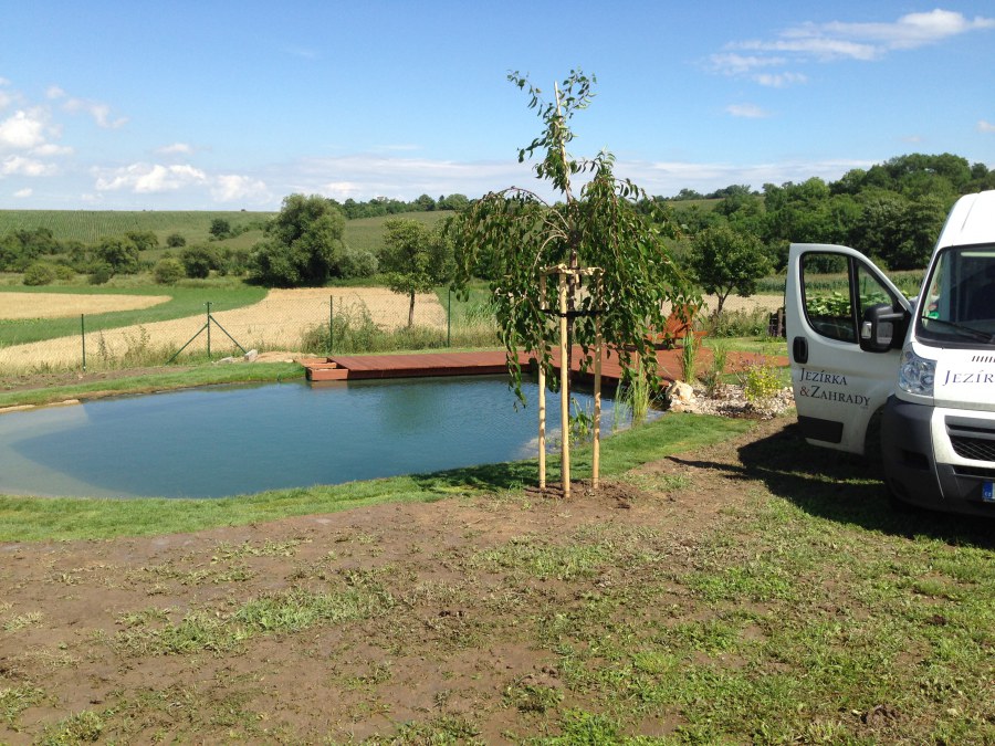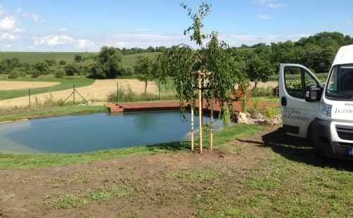 Tuto stavbu jsme realizovali celou od prvního rýpnutí bagrem do napuštění vody a zasazení květin. Po domluvení všech formalit, velikosti, tvaru a technologie se začalo se samotnou stavbou. Bagrem se vyhloubil požadovaný tvar jezírka a také technické místnosti. Také se udělal výkop na odkalovací potrubí od filtru. Do dna jezírka se zabetonovala gule a natáhlo potrubí do technické místnosti. Dno jezírka se potom zpevnilo a pokrylo vrstvou kopaného písku. Na užší straně se vystavěla technická místnost ze ztraceného bednění. Po dokončení těchto prací mohli technici začít s pokládkou jezírkové fólie. Nejprve položili geotextílii 500g a na ní následně navařovali fólii Fatra Aquaplast 805/V olivově zelenou. Pak už se mohla začít napouštět voda. Než se napustila voda po okraj upravili se pobřežní zóny. Jedna se obložila většími kameny, doprostřed se zasadili vodní květiny a dosypal se kačírek. Další mělčí zóna se upravila kamínkovou fólii Oase, ta je velmi dobrá na údržbu a je protiskluzová. Technologii jsme vybrali biologicko-mechanickou, filtr Tripond Vortex Center C115,na něj jsme pověsili UV lampu TMC Pro Clear 110W a čerpadlo Oase AquaMax Eco Gravity 20000. Vzduchování jak do filtru pod média tak do jezírka zajistí motor Hailea V-60.