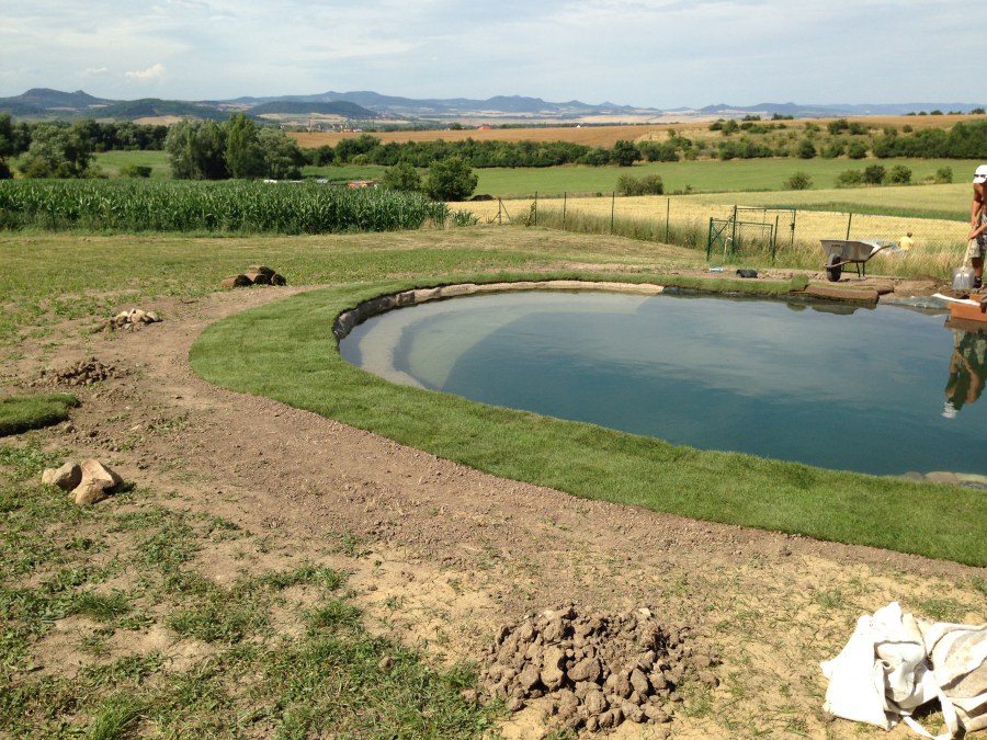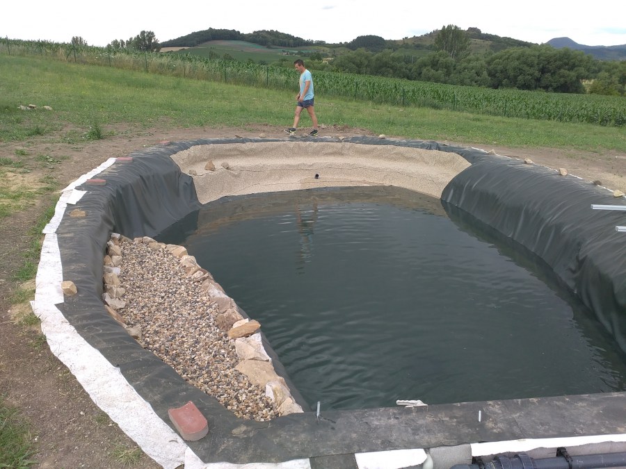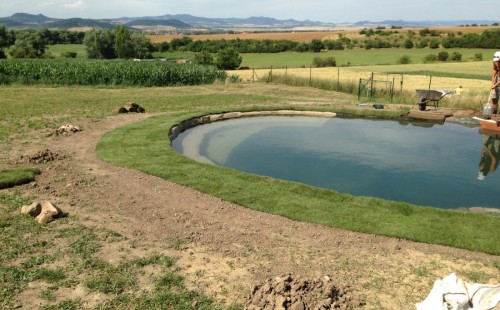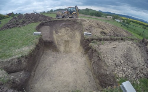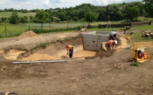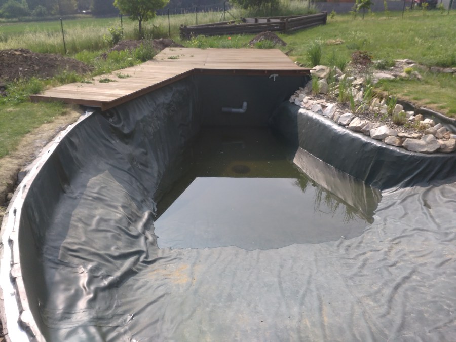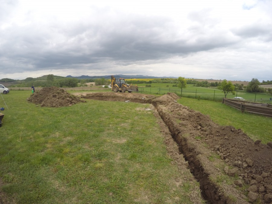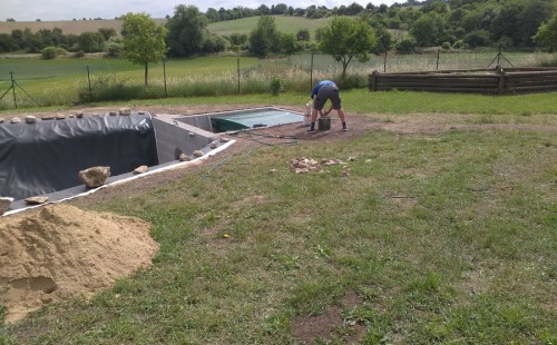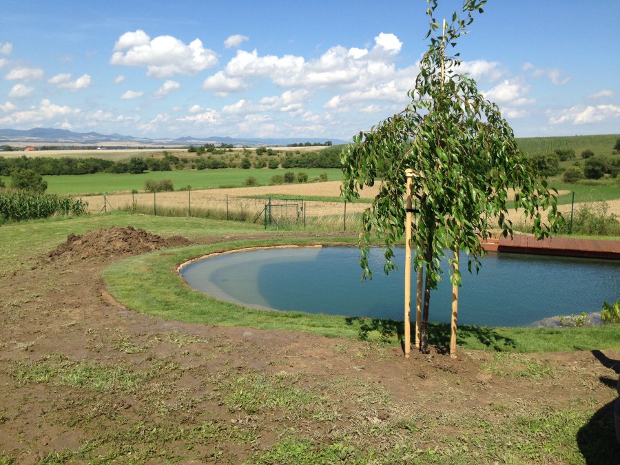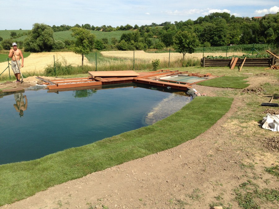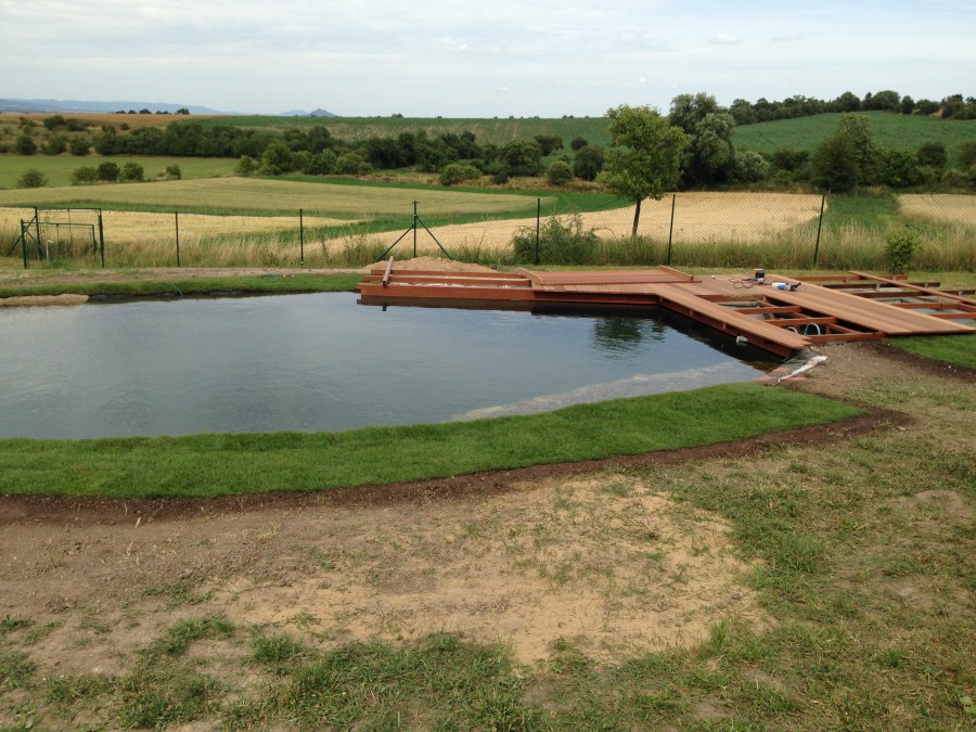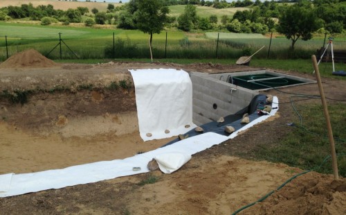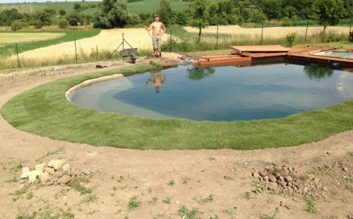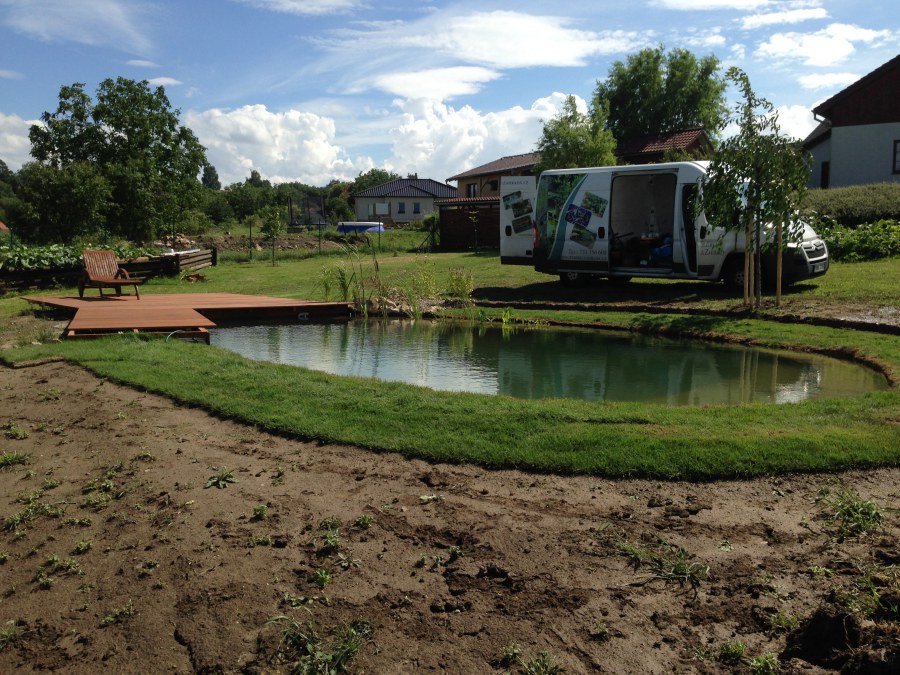 Tuto stavbu jsme realizovali celou od prvního rýpnutí bagrem do napuštění vody a zasazení květin. Po domluvení všech formalit, velikosti, tvaru a technologie se začalo se samotnou stavbou. Bagrem se vyhloubil požadovaný tvar jezírka a také technické místnosti. Také se udělal výkop na odkalovací potrubí od filtru. Do dna jezírka se zabetonovala gule a natáhlo potrubí do technické místnosti. Dno jezírka se potom zpevnilo a pokrylo vrstvou kopaného písku. Na užší straně se vystavěla technická místnost ze ztraceného bednění. Po dokončení těchto prací mohli technici začít s pokládkou jezírkové fólie. Nejprve položili geotextílii 500g a na ní následně navařovali fólii Fatra Aquaplast 805/V olivově zelenou. Pak už se mohla začít napouštět voda. Než se napustila voda po okraj upravili se pobřežní zóny. Jedna se obložila většími kameny, doprostřed se zasadili vodní květiny a dosypal se kačírek. Další mělčí zóna se upravila kamínkovou fólii Oase, ta je velmi dobrá na údržbu a je protiskluzová. Technologii jsme vybrali biologicko-mechanickou, filtr Tripond Vortex Center C115,na něj jsme pověsili UV lampu TMC Pro Clear 110W a čerpadlo Oase AquaMax Eco Gravity 20000. Vzduchování jak do filtru pod média tak do jezírka zajistí motor Hailea V-60.