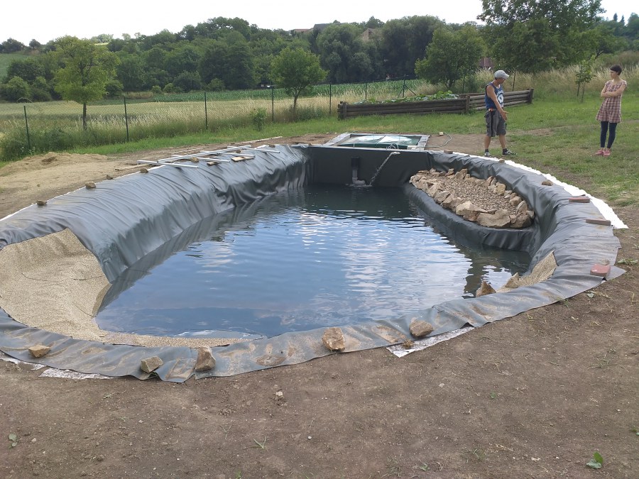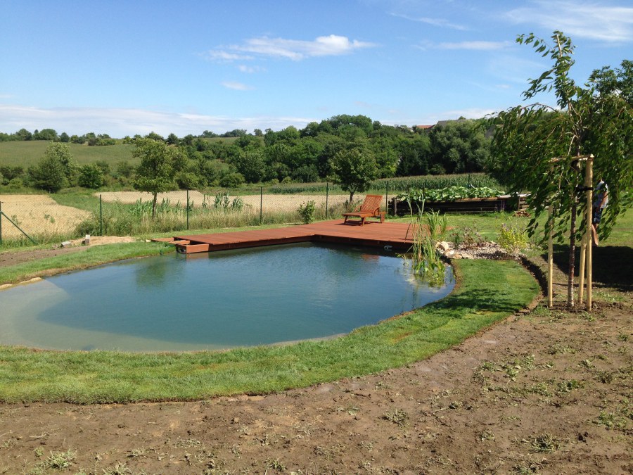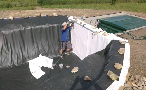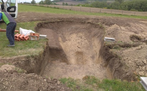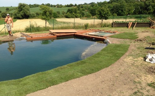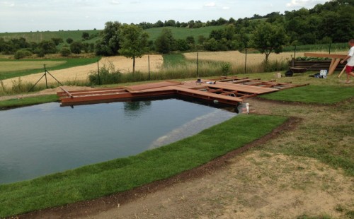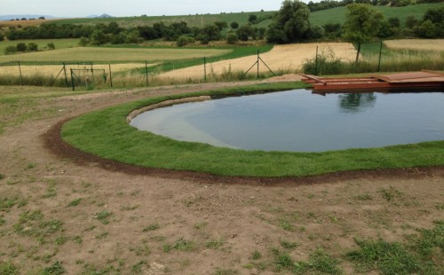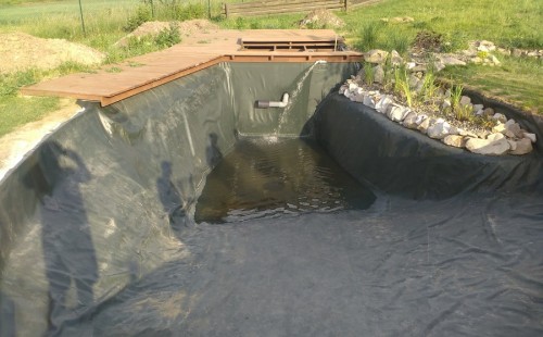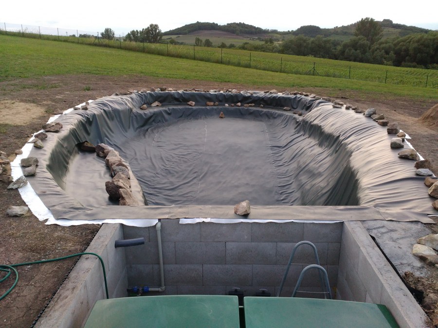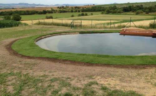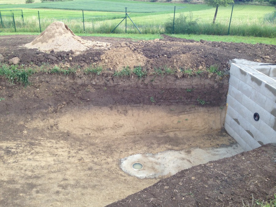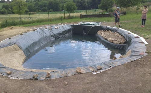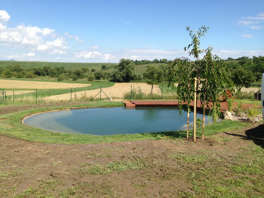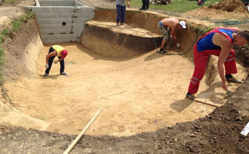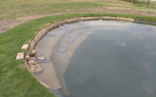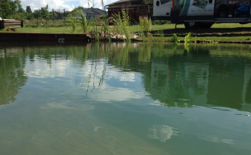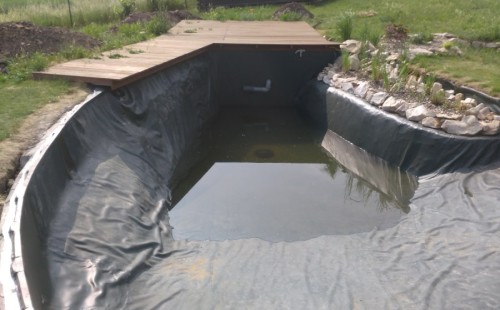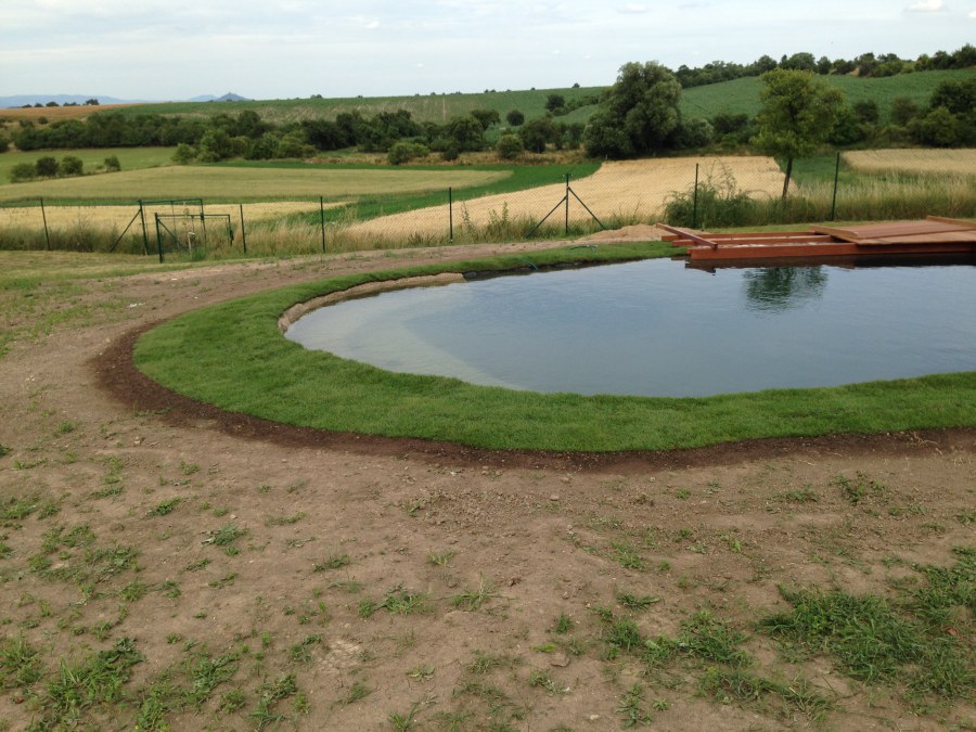 Tuto stavbu jsme realizovali celou od prvního rýpnutí bagrem do napuštění vody a zasazení květin. Po domluvení všech formalit, velikosti, tvaru a technologie se začalo se samotnou stavbou. Bagrem se vyhloubil požadovaný tvar jezírka a také technické místnosti. Také se udělal výkop na odkalovací potrubí od filtru. Do dna jezírka se zabetonovala gule a natáhlo potrubí do technické místnosti. Dno jezírka se potom zpevnilo a pokrylo vrstvou kopaného písku. Na užší straně se vystavěla technická místnost ze ztraceného bednění. Po dokončení těchto prací mohli technici začít s pokládkou jezírkové fólie. Nejprve položili geotextílii 500g a na ní následně navařovali fólii Fatra Aquaplast 805/V olivově zelenou. Pak už se mohla začít napouštět voda. Než se napustila voda po okraj upravili se pobřežní zóny. Jedna se obložila většími kameny, doprostřed se zasadili vodní květiny a dosypal se kačírek. Další mělčí zóna se upravila kamínkovou fólii Oase, ta je velmi dobrá na údržbu a je protiskluzová. Technologii jsme vybrali biologicko-mechanickou, filtr Tripond Vortex Center C115,na něj jsme pověsili UV lampu TMC Pro Clear 110W a čerpadlo Oase AquaMax Eco Gravity 20000. Vzduchování jak do filtru pod média tak do jezírka zajistí motor Hailea V-60.
