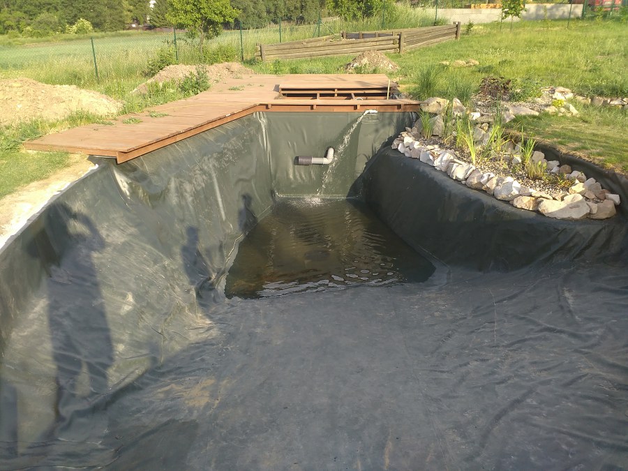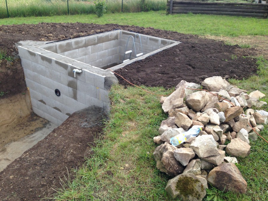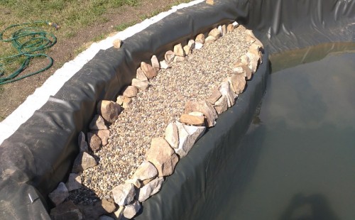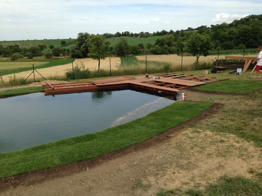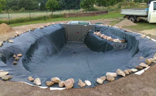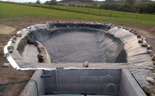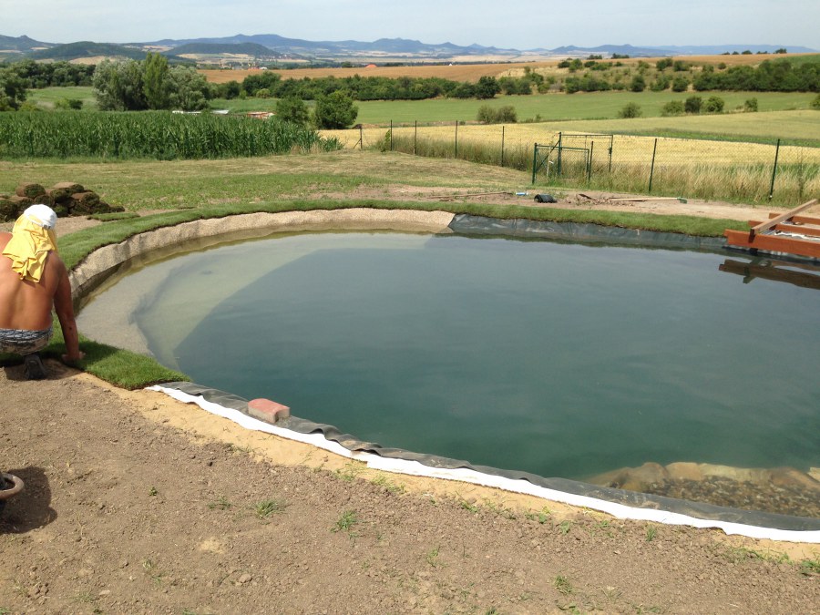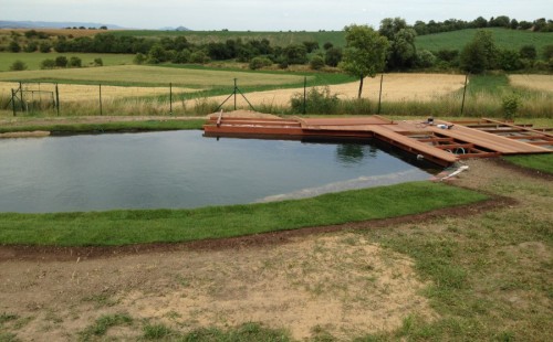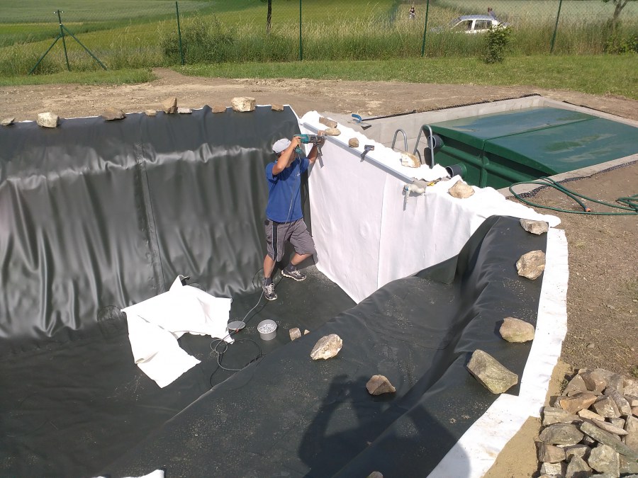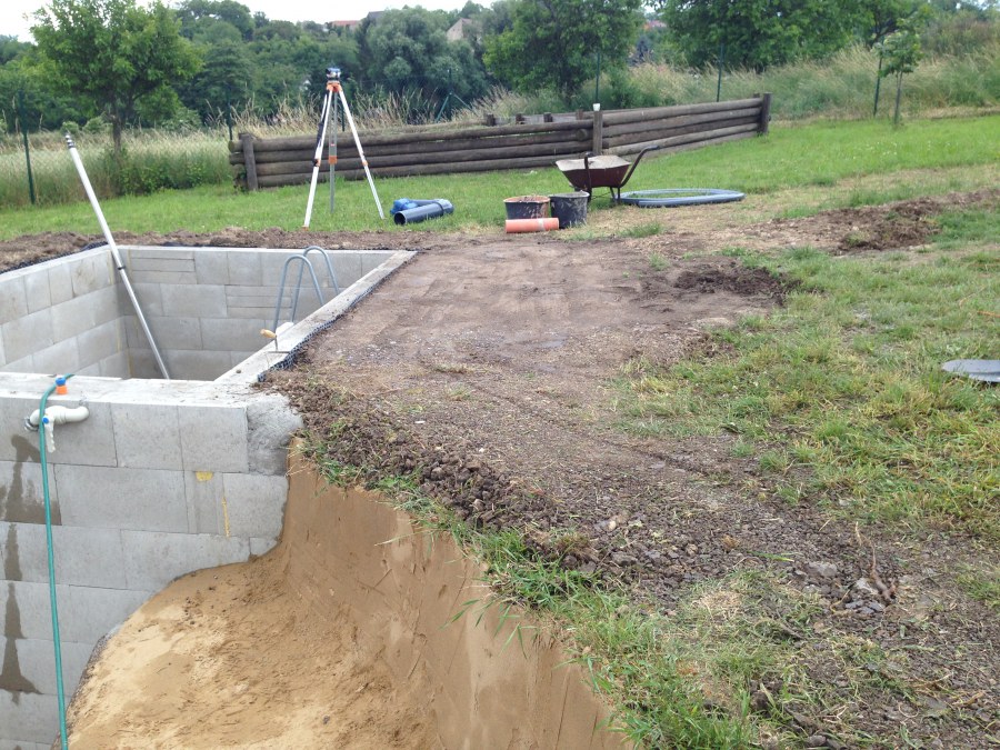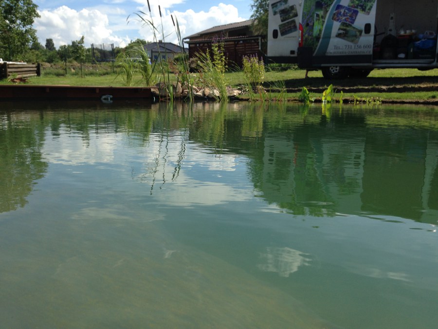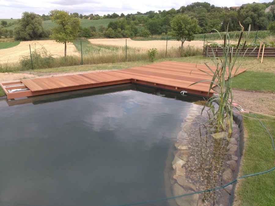 Tuto stavbu jsme realizovali celou od prvního rýpnutí bagrem do napuštění vody a zasazení květin. Po domluvení všech formalit, velikosti, tvaru a technologie se začalo se samotnou stavbou. Bagrem se vyhloubil požadovaný tvar jezírka a také technické místnosti. Také se udělal výkop na odkalovací potrubí od filtru. Do dna jezírka se zabetonovala gule a natáhlo potrubí do technické místnosti. Dno jezírka se potom zpevnilo a pokrylo vrstvou kopaného písku. Na užší straně se vystavěla technická místnost ze ztraceného bednění. Po dokončení těchto prací mohli technici začít s pokládkou jezírkové fólie. Nejprve položili geotextílii 500g a na ní následně navařovali fólii Fatra Aquaplast 805/V olivově zelenou. Pak už se mohla začít napouštět voda. Než se napustila voda po okraj upravili se pobřežní zóny. Jedna se obložila většími kameny, doprostřed se zasadili vodní květiny a dosypal se kačírek. Další mělčí zóna se upravila kamínkovou fólii Oase, ta je velmi dobrá na údržbu a je protiskluzová. Technologii jsme vybrali biologicko-mechanickou, filtr Tripond Vortex Center C115,na něj jsme pověsili UV lampu TMC Pro Clear 110W a čerpadlo Oase AquaMax Eco Gravity 20000. Vzduchování jak do filtru pod média tak do jezírka zajistí motor Hailea V-60.