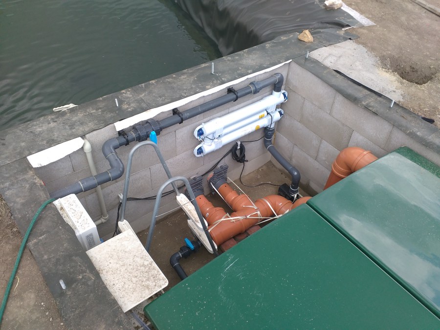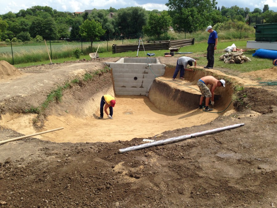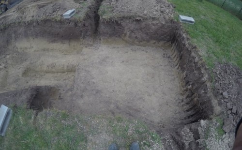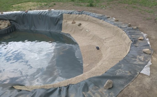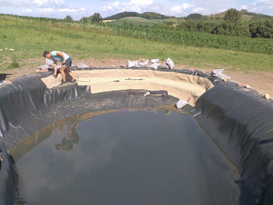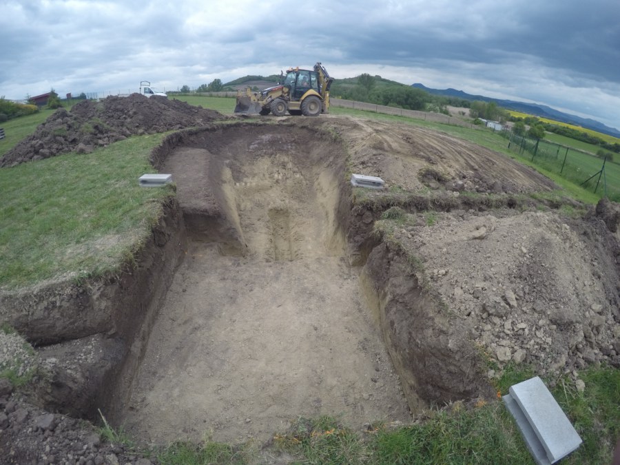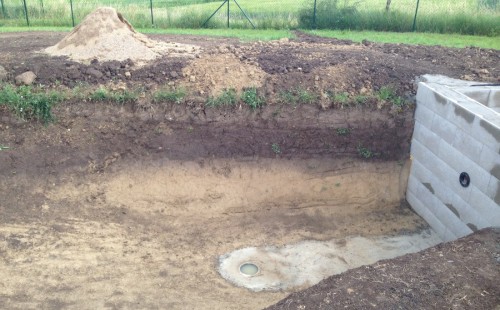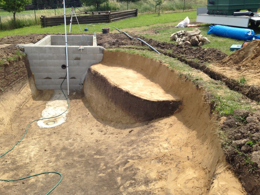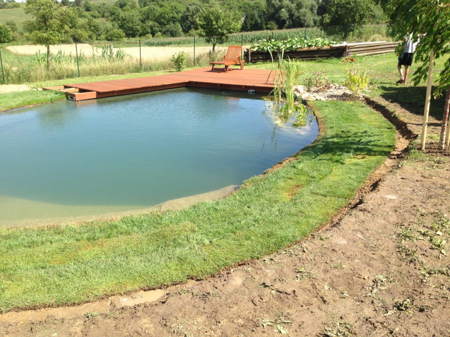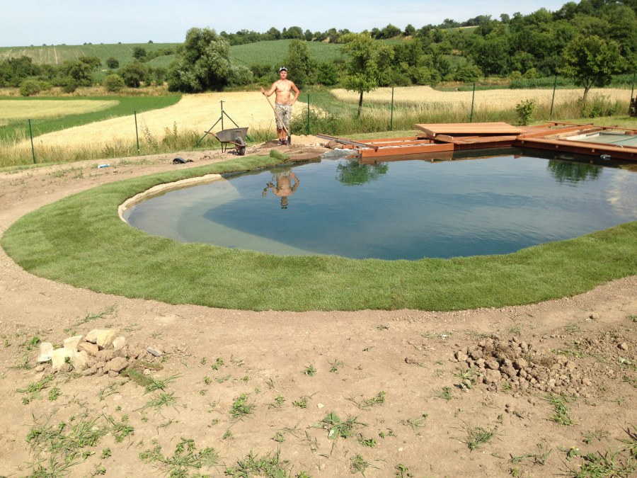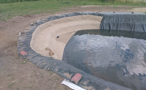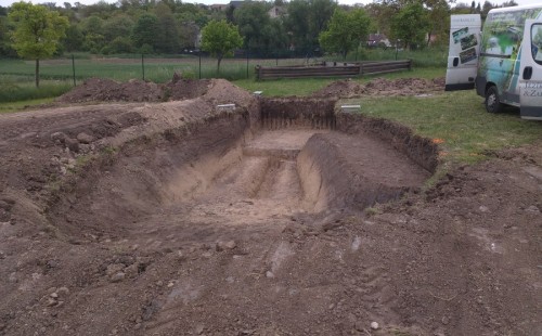 Tuto stavbu jsme realizovali celou od prvního rýpnutí bagrem do napuštění vody a zasazení květin. Po domluvení všech formalit, velikosti, tvaru a technologie se začalo se samotnou stavbou. Bagrem se vyhloubil požadovaný tvar jezírka a také technické místnosti. Také se udělal výkop na odkalovací potrubí od filtru. Do dna jezírka se zabetonovala gule a natáhlo potrubí do technické místnosti. Dno jezírka se potom zpevnilo a pokrylo vrstvou kopaného písku. Na užší straně se vystavěla technická místnost ze ztraceného bednění. Po dokončení těchto prací mohli technici začít s pokládkou jezírkové fólie. Nejprve položili geotextílii 500g a na ní následně navařovali fólii Fatra Aquaplast 805/V olivově zelenou. Pak už se mohla začít napouštět voda. Než se napustila voda po okraj upravili se pobřežní zóny. Jedna se obložila většími kameny, doprostřed se zasadili vodní květiny a dosypal se kačírek. Další mělčí zóna se upravila kamínkovou fólii Oase, ta je velmi dobrá na údržbu a je protiskluzová. Technologii jsme vybrali biologicko-mechanickou, filtr Tripond Vortex Center C115,na něj jsme pověsili UV lampu TMC Pro Clear 110W a čerpadlo Oase AquaMax Eco Gravity 20000. Vzduchování jak do filtru pod média tak do jezírka zajistí motor Hailea V-60.