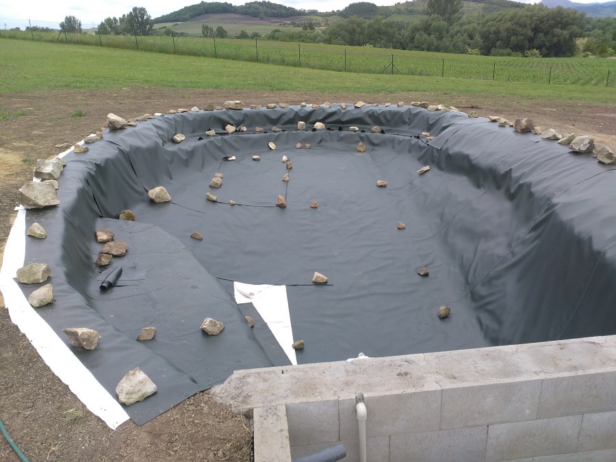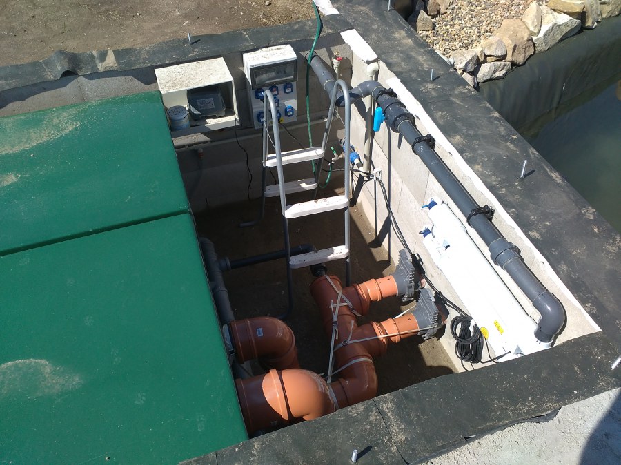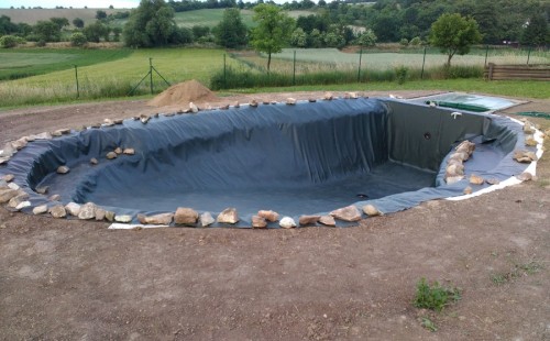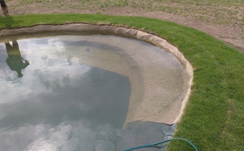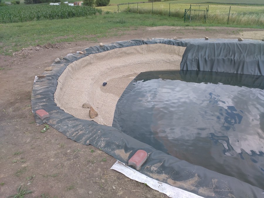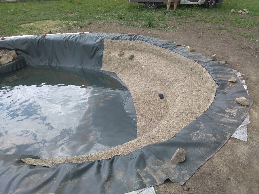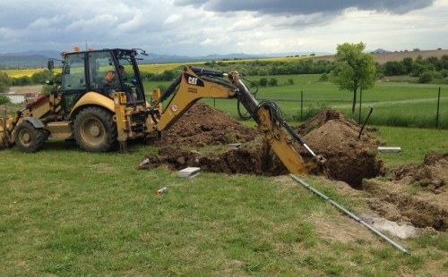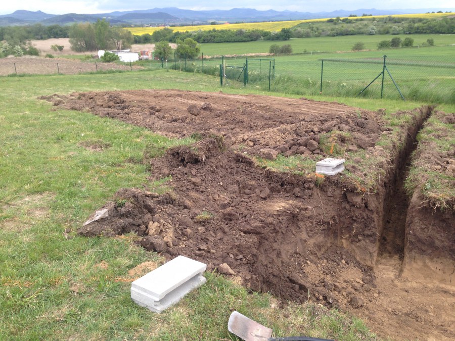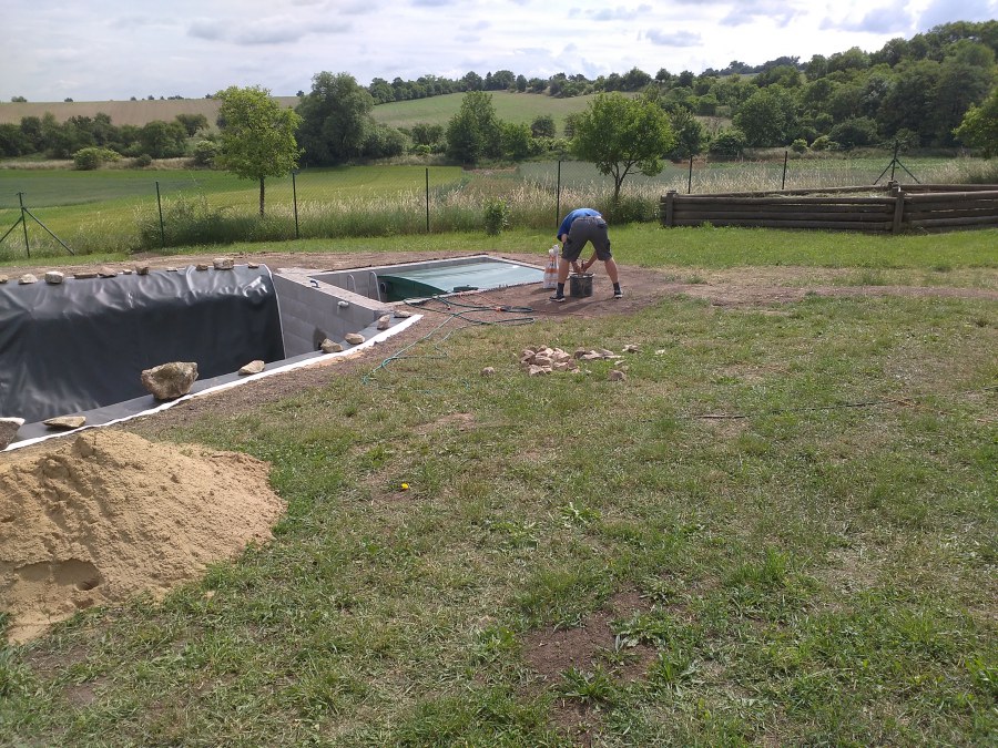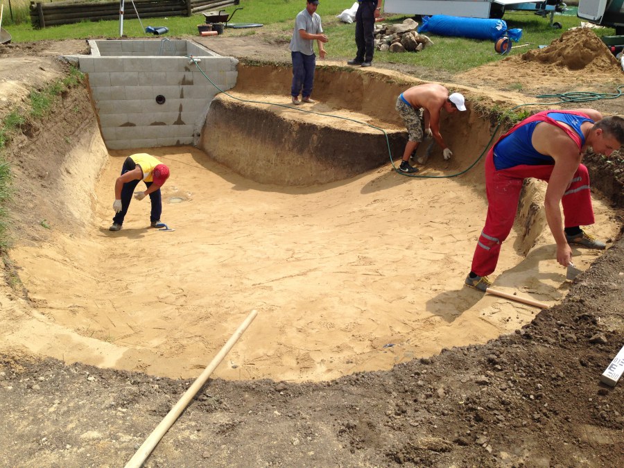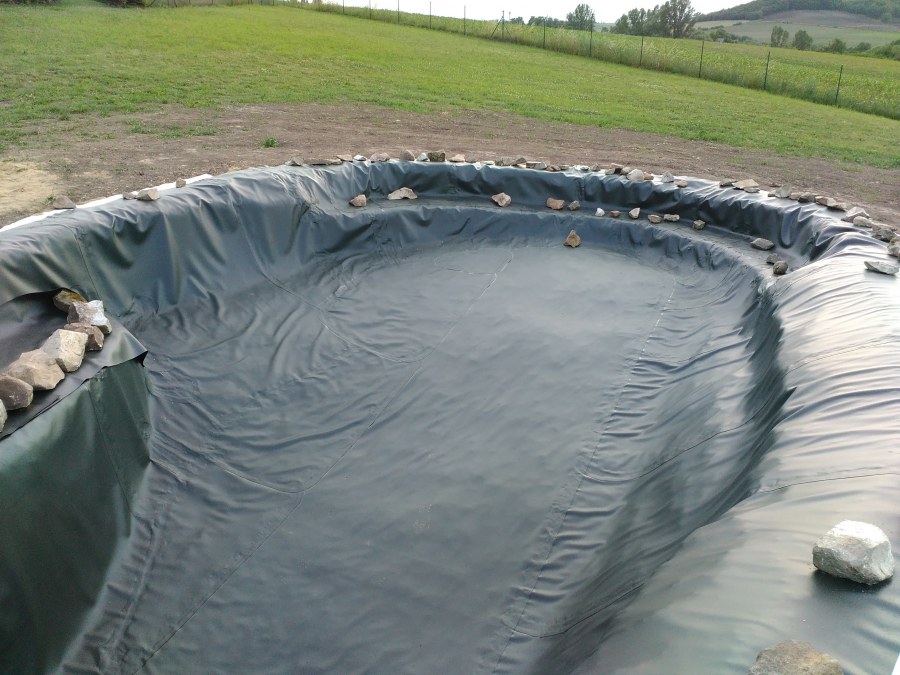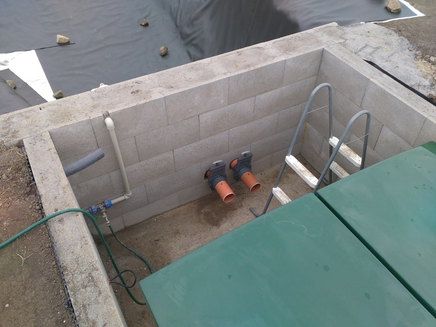 Tuto stavbu jsme realizovali celou od prvního rýpnutí bagrem do napuštění vody a zasazení květin. Po domluvení všech formalit, velikosti, tvaru a technologie se začalo se samotnou stavbou. Bagrem se vyhloubil požadovaný tvar jezírka a také technické místnosti. Také se udělal výkop na odkalovací potrubí od filtru. Do dna jezírka se zabetonovala gule a natáhlo potrubí do technické místnosti. Dno jezírka se potom zpevnilo a pokrylo vrstvou kopaného písku. Na užší straně se vystavěla technická místnost ze ztraceného bednění. Po dokončení těchto prací mohli technici začít s pokládkou jezírkové fólie. Nejprve položili geotextílii 500g a na ní následně navařovali fólii Fatra Aquaplast 805/V olivově zelenou. Pak už se mohla začít napouštět voda. Než se napustila voda po okraj upravili se pobřežní zóny. Jedna se obložila většími kameny, doprostřed se zasadili vodní květiny a dosypal se kačírek. Další mělčí zóna se upravila kamínkovou fólii Oase, ta je velmi dobrá na údržbu a je protiskluzová. Technologii jsme vybrali biologicko-mechanickou, filtr Tripond Vortex Center C115,na něj jsme pověsili UV lampu TMC Pro Clear 110W a čerpadlo Oase AquaMax Eco Gravity 20000. Vzduchování jak do filtru pod média tak do jezírka zajistí motor Hailea V-60.