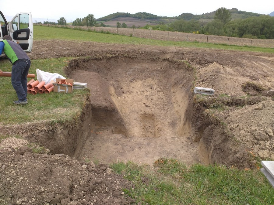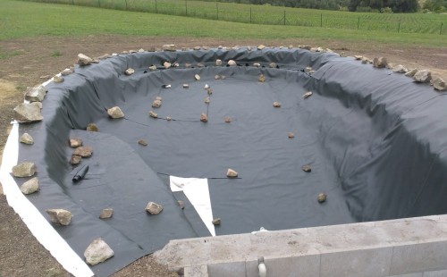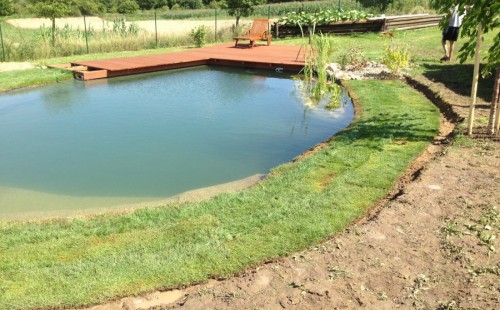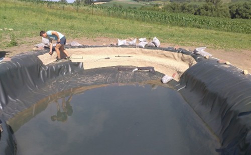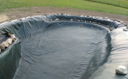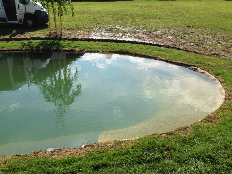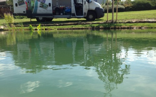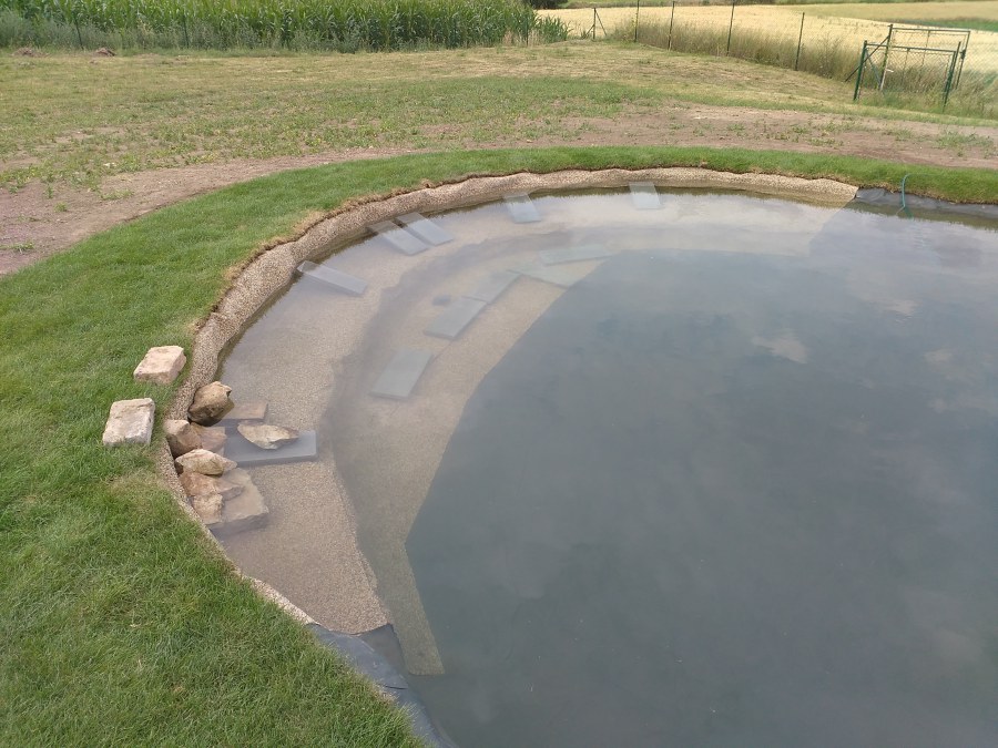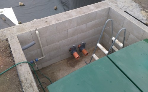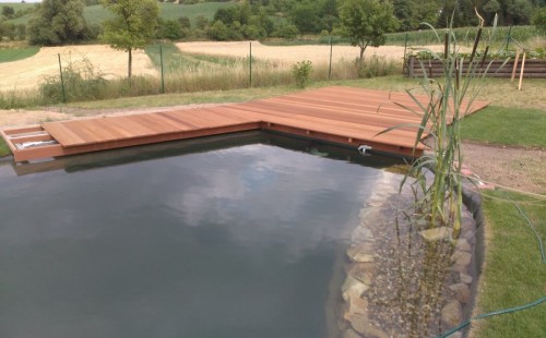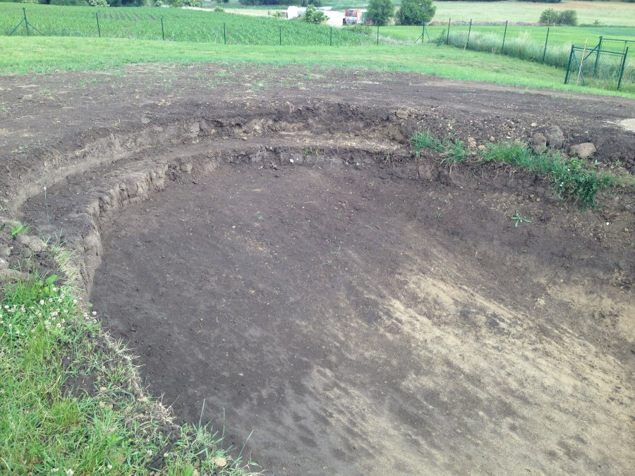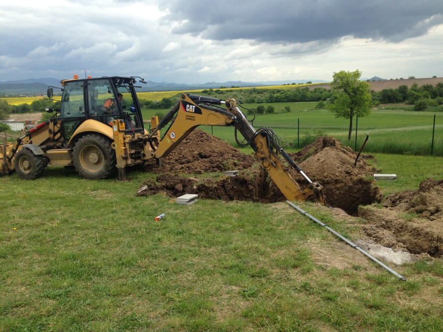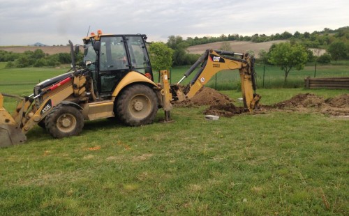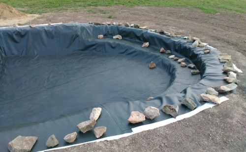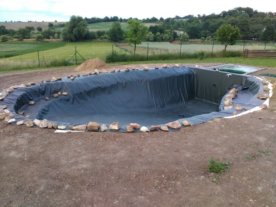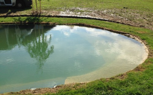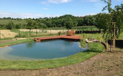 Tuto stavbu jsme realizovali celou od prvního rýpnutí bagrem do napuštění vody a zasazení květin. Po domluvení všech formalit, velikosti, tvaru a technologie se začalo se samotnou stavbou. Bagrem se vyhloubil požadovaný tvar jezírka a také technické místnosti. Také se udělal výkop na odkalovací potrubí od filtru. Do dna jezírka se zabetonovala gule a natáhlo potrubí do technické místnosti. Dno jezírka se potom zpevnilo a pokrylo vrstvou kopaného písku. Na užší straně se vystavěla technická místnost ze ztraceného bednění. Po dokončení těchto prací mohli technici začít s pokládkou jezírkové fólie. Nejprve položili geotextílii 500g a na ní následně navařovali fólii Fatra Aquaplast 805/V olivově zelenou. Pak už se mohla začít napouštět voda. Než se napustila voda po okraj upravili se pobřežní zóny. Jedna se obložila většími kameny, doprostřed se zasadili vodní květiny a dosypal se kačírek. Další mělčí zóna se upravila kamínkovou fólii Oase, ta je velmi dobrá na údržbu a je protiskluzová. Technologii jsme vybrali biologicko-mechanickou, filtr Tripond Vortex Center C115,na něj jsme pověsili UV lampu TMC Pro Clear 110W a čerpadlo Oase AquaMax Eco Gravity 20000. Vzduchování jak do filtru pod média tak do jezírka zajistí motor Hailea V-60.