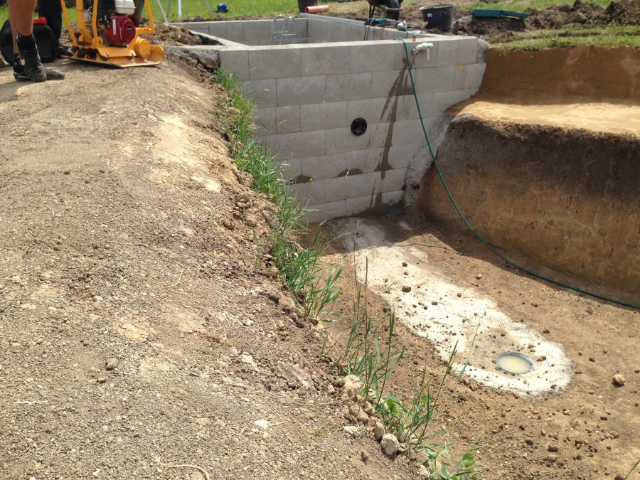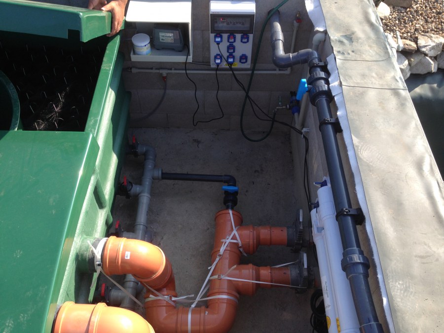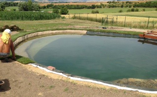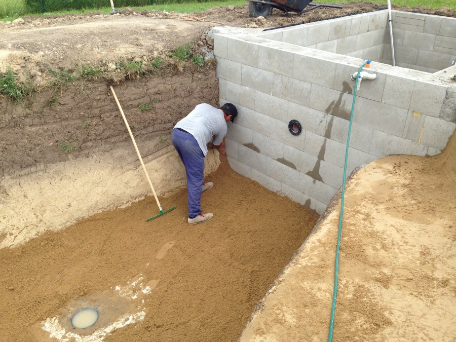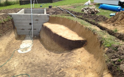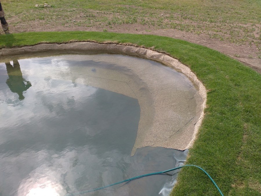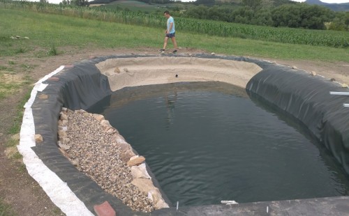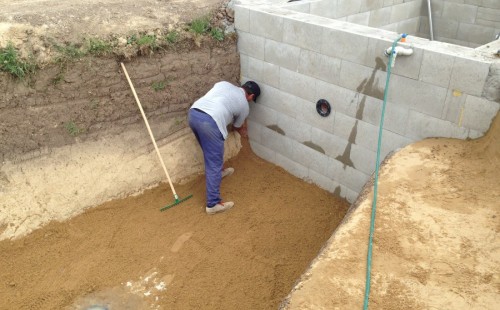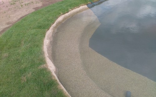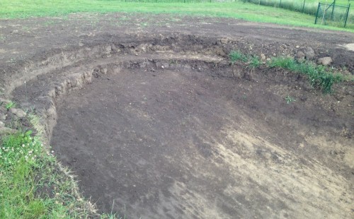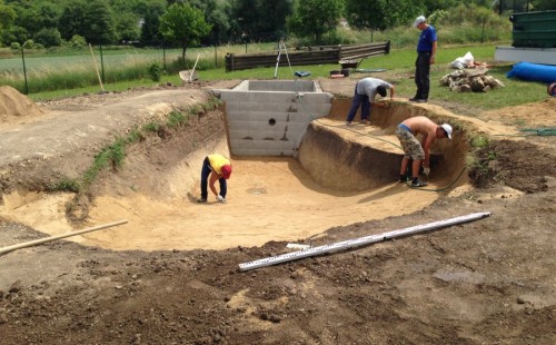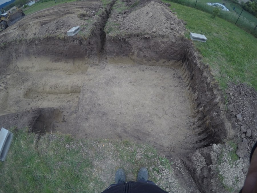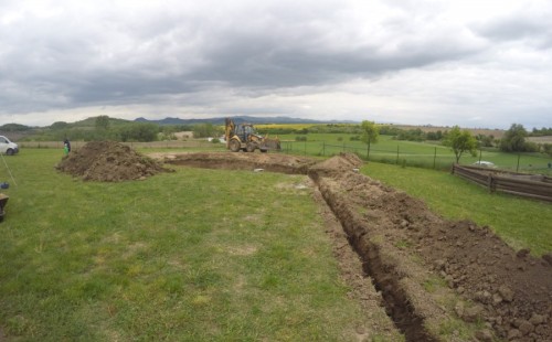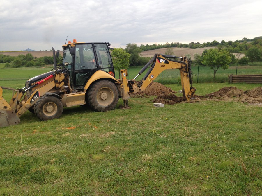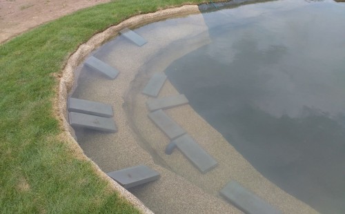 Tuto stavbu jsme realizovali celou od prvního rýpnutí bagrem do napuštění vody a zasazení květin. Po domluvení všech formalit, velikosti, tvaru a technologie se začalo se samotnou stavbou. Bagrem se vyhloubil požadovaný tvar jezírka a také technické místnosti. Také se udělal výkop na odkalovací potrubí od filtru. Do dna jezírka se zabetonovala gule a natáhlo potrubí do technické místnosti. Dno jezírka se potom zpevnilo a pokrylo vrstvou kopaného písku. Na užší straně se vystavěla technická místnost ze ztraceného bednění. Po dokončení těchto prací mohli technici začít s pokládkou jezírkové fólie. Nejprve položili geotextílii 500g a na ní následně navařovali fólii Fatra Aquaplast 805/V olivově zelenou. Pak už se mohla začít napouštět voda. Než se napustila voda po okraj upravili se pobřežní zóny. Jedna se obložila většími kameny, doprostřed se zasadili vodní květiny a dosypal se kačírek. Další mělčí zóna se upravila kamínkovou fólii Oase, ta je velmi dobrá na údržbu a je protiskluzová. Technologii jsme vybrali biologicko-mechanickou, filtr Tripond Vortex Center C115,na něj jsme pověsili UV lampu TMC Pro Clear 110W a čerpadlo Oase AquaMax Eco Gravity 20000. Vzduchování jak do filtru pod média tak do jezírka zajistí motor Hailea V-60.