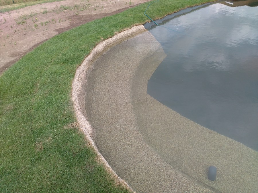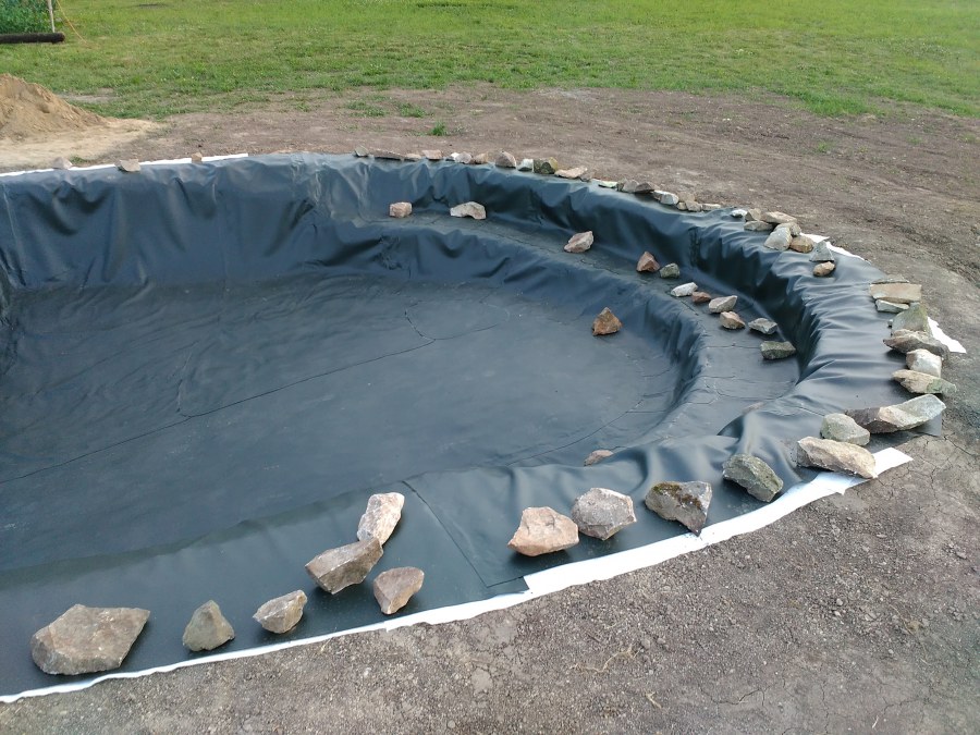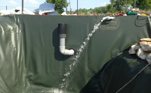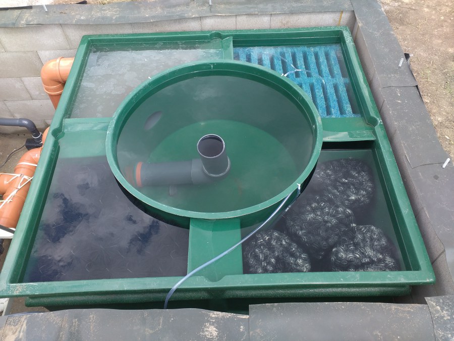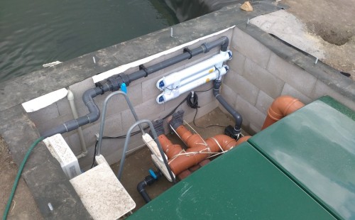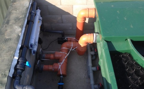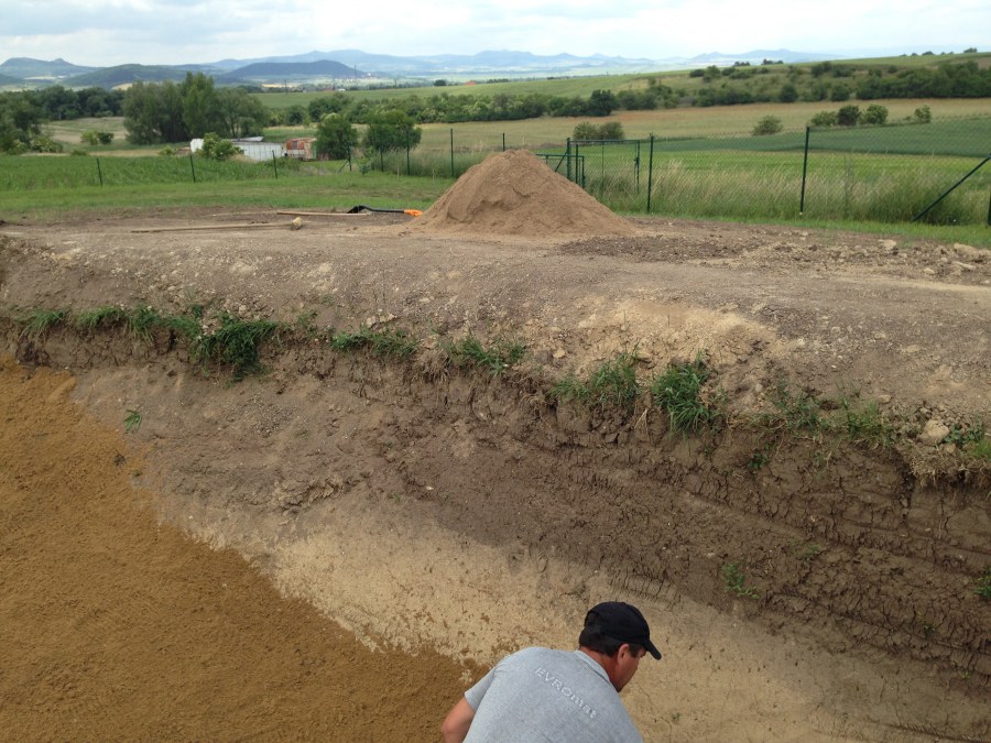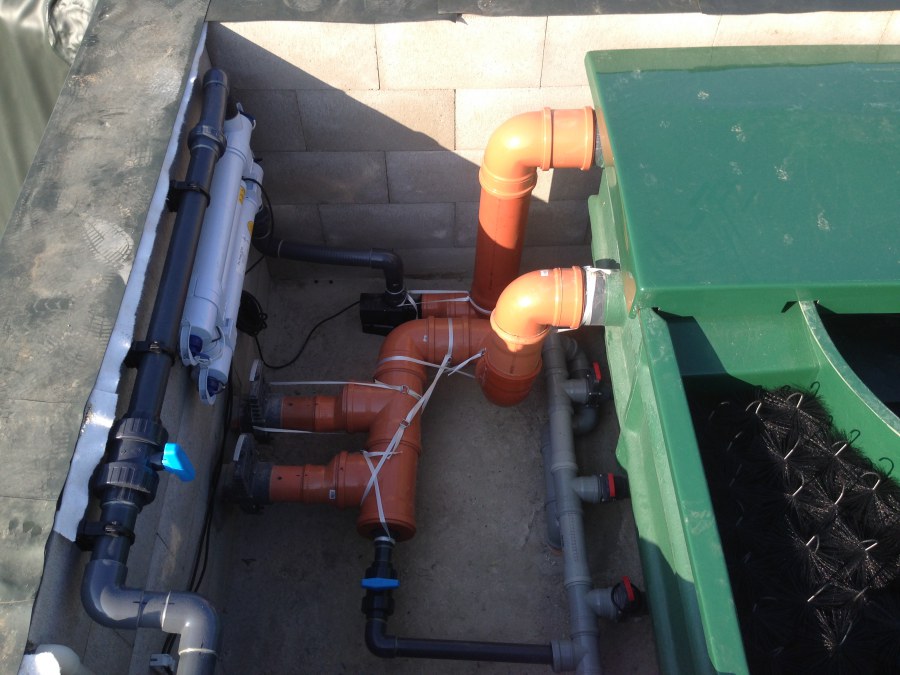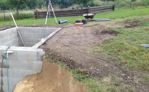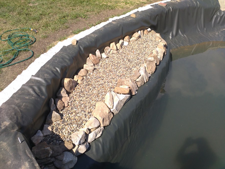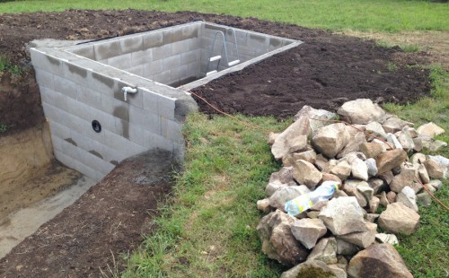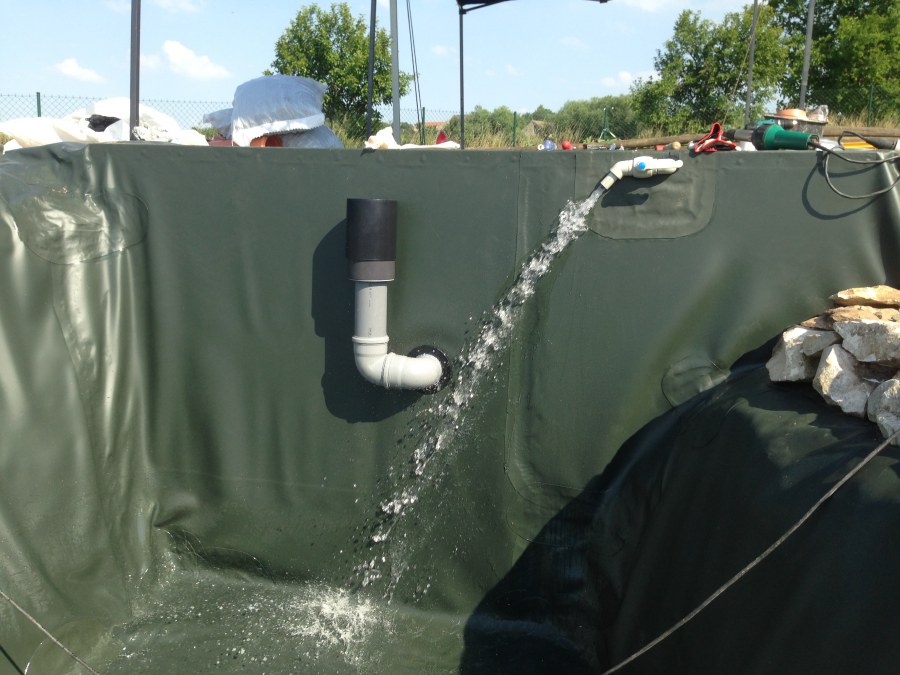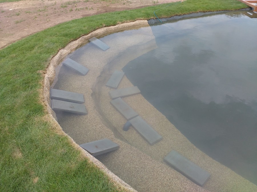 Tuto stavbu jsme realizovali celou od prvního rýpnutí bagrem do napuštění vody a zasazení květin. Po domluvení všech formalit, velikosti, tvaru a technologie se začalo se samotnou stavbou. Bagrem se vyhloubil požadovaný tvar jezírka a také technické místnosti. Také se udělal výkop na odkalovací potrubí od filtru. Do dna jezírka se zabetonovala gule a natáhlo potrubí do technické místnosti. Dno jezírka se potom zpevnilo a pokrylo vrstvou kopaného písku. Na užší straně se vystavěla technická místnost ze ztraceného bednění. Po dokončení těchto prací mohli technici začít s pokládkou jezírkové fólie. Nejprve položili geotextílii 500g a na ní následně navařovali fólii Fatra Aquaplast 805/V olivově zelenou. Pak už se mohla začít napouštět voda. Než se napustila voda po okraj upravili se pobřežní zóny. Jedna se obložila většími kameny, doprostřed se zasadili vodní květiny a dosypal se kačírek. Další mělčí zóna se upravila kamínkovou fólii Oase, ta je velmi dobrá na údržbu a je protiskluzová. Technologii jsme vybrali biologicko-mechanickou, filtr Tripond Vortex Center C115,na něj jsme pověsili UV lampu TMC Pro Clear 110W a čerpadlo Oase AquaMax Eco Gravity 20000. Vzduchování jak do filtru pod média tak do jezírka zajistí motor Hailea V-60.