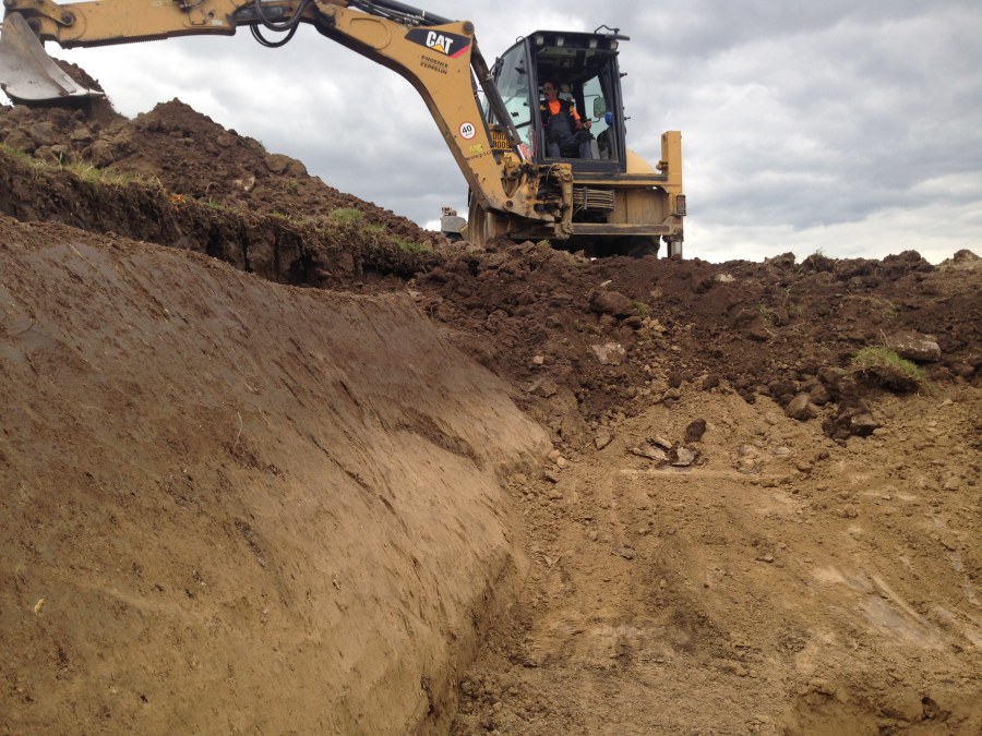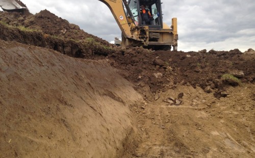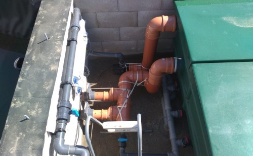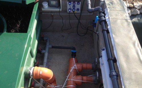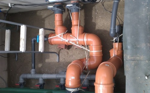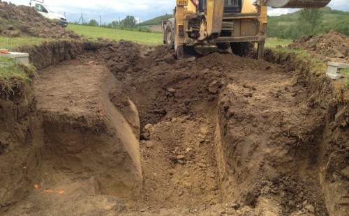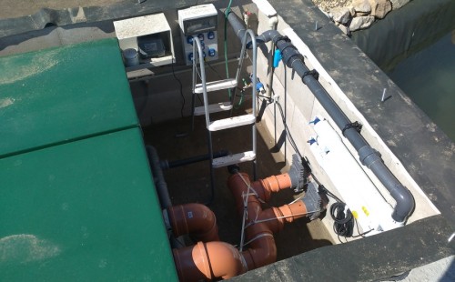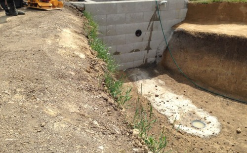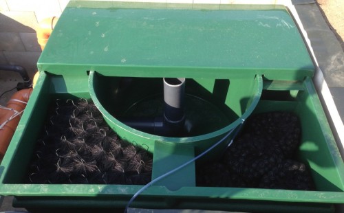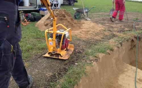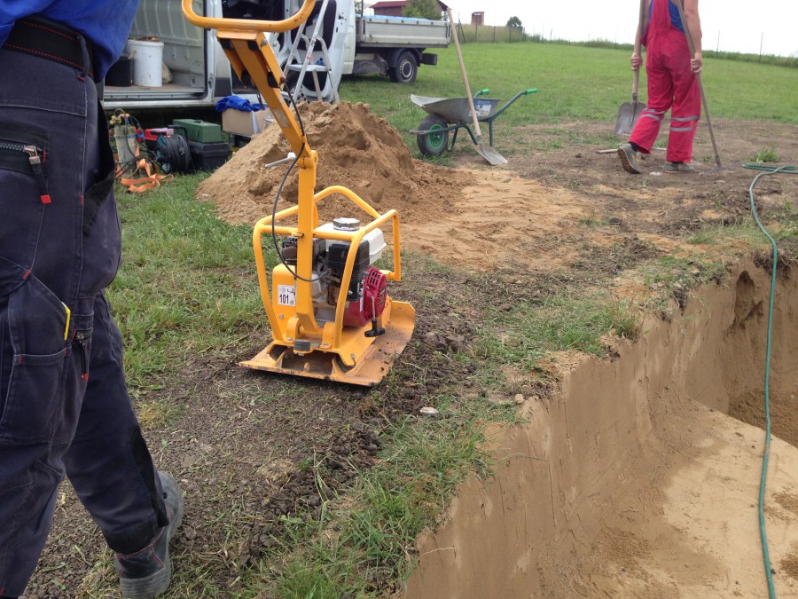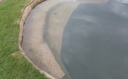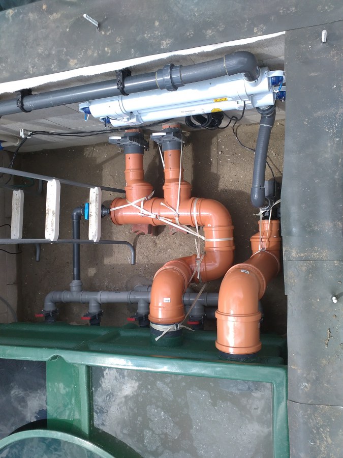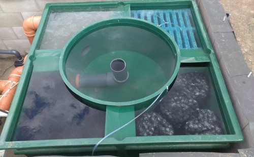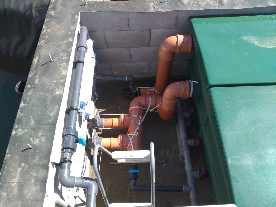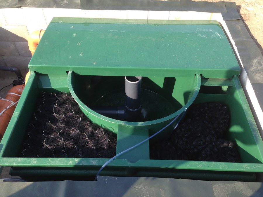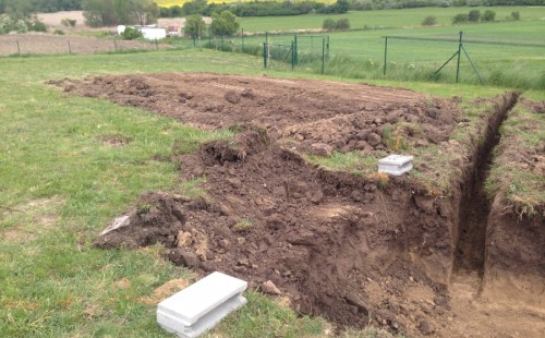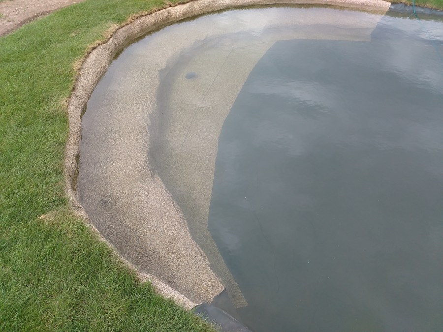 Tuto stavbu jsme realizovali celou od prvního rýpnutí bagrem do napuštění vody a zasazení květin. Po domluvení všech formalit, velikosti, tvaru a technologie se začalo se samotnou stavbou. Bagrem se vyhloubil požadovaný tvar jezírka a také technické místnosti. Také se udělal výkop na odkalovací potrubí od filtru. Do dna jezírka se zabetonovala gule a natáhlo potrubí do technické místnosti. Dno jezírka se potom zpevnilo a pokrylo vrstvou kopaného písku. Na užší straně se vystavěla technická místnost ze ztraceného bednění. Po dokončení těchto prací mohli technici začít s pokládkou jezírkové fólie. Nejprve položili geotextílii 500g a na ní následně navařovali fólii Fatra Aquaplast 805/V olivově zelenou. Pak už se mohla začít napouštět voda. Než se napustila voda po okraj upravili se pobřežní zóny. Jedna se obložila většími kameny, doprostřed se zasadili vodní květiny a dosypal se kačírek. Další mělčí zóna se upravila kamínkovou fólii Oase, ta je velmi dobrá na údržbu a je protiskluzová. Technologii jsme vybrali biologicko-mechanickou, filtr Tripond Vortex Center C115,na něj jsme pověsili UV lampu TMC Pro Clear 110W a čerpadlo Oase AquaMax Eco Gravity 20000. Vzduchování jak do filtru pod média tak do jezírka zajistí motor Hailea V-60.