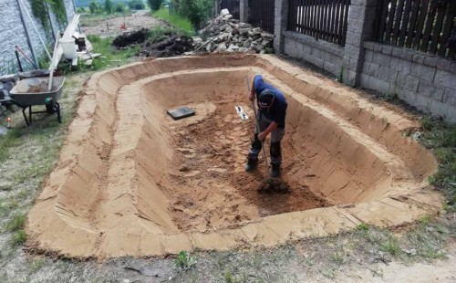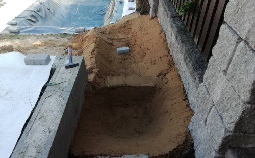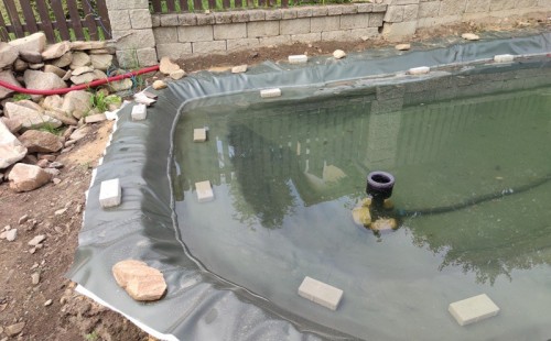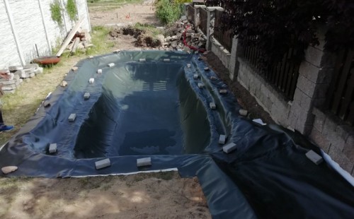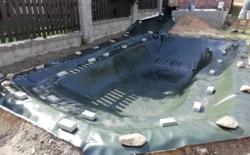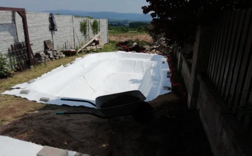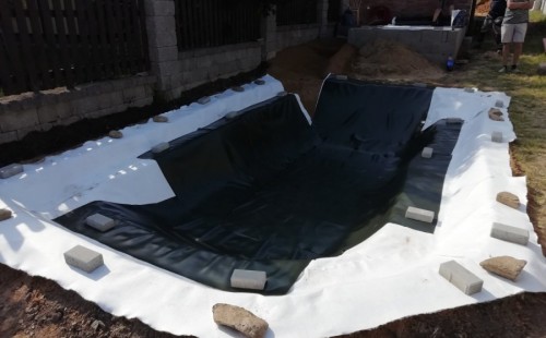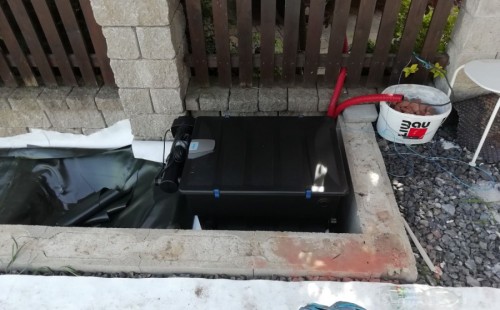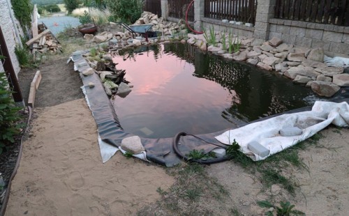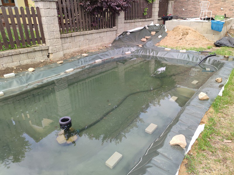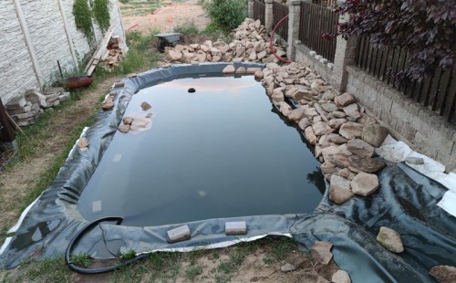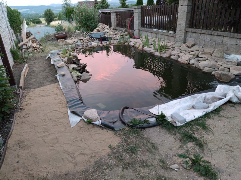 Toto jezírko je jedno z prvních jezírek postavených v tomto roce. Klient si sám vykopal základy jezírka a malého potůčku, naši technici pak jen upravili povrch, uhladili stěny a pokryli je kopaným pískem. Na ten pak položili geotextílii 500g a na tu začali pokládat fólii Fatra Aquaplast 805/V olivově zelenou, ta se svařuje na místě dle tvaru jezírka. Již dopředu se počítalo s malým obsahem vody a hobby provedením technologie, takže se na dno nedávala gule ale položí se tam čerpadlo napojené na filtr uložený nad potůčkem. Po napuštění má jezírko 10m3, proto jsme zvolili filtr Oase BioTec ScreenMatic2 40000 na něj jsme napojili UV lampu Oase Vitronic 36W, čerpadlo do jezírka dvouvětvé Oase AquaMax Eco Premium 10000, na něj se napojil skimmer Oase AquaSkim 40 postavený v pobřežní zóně.