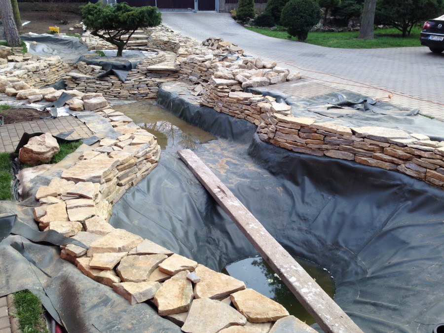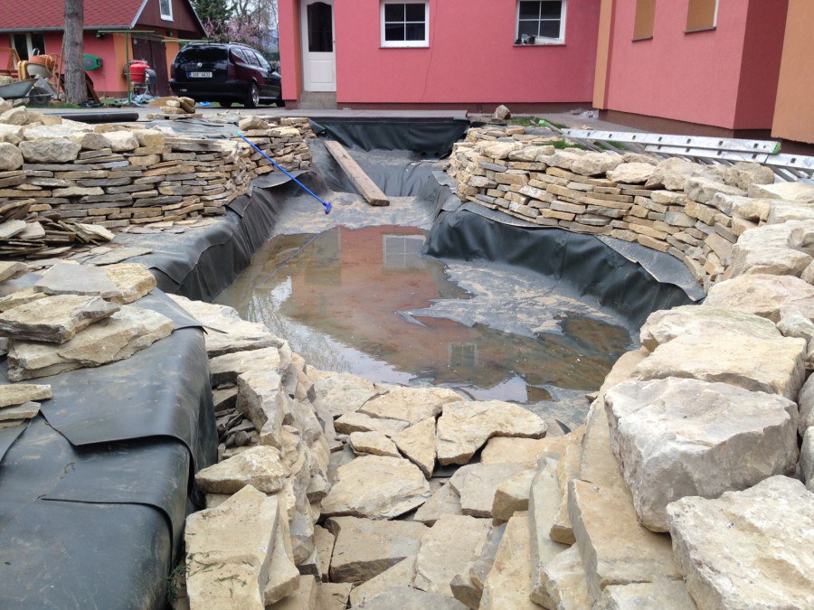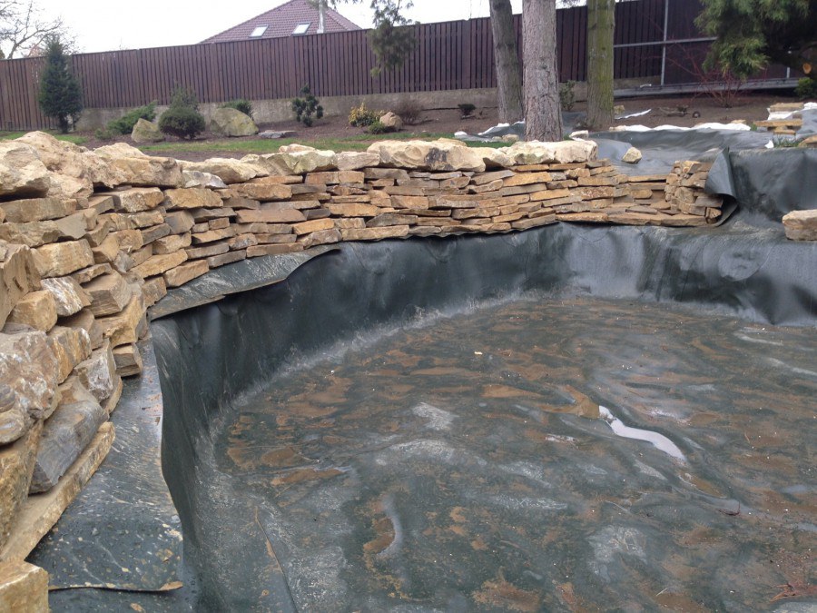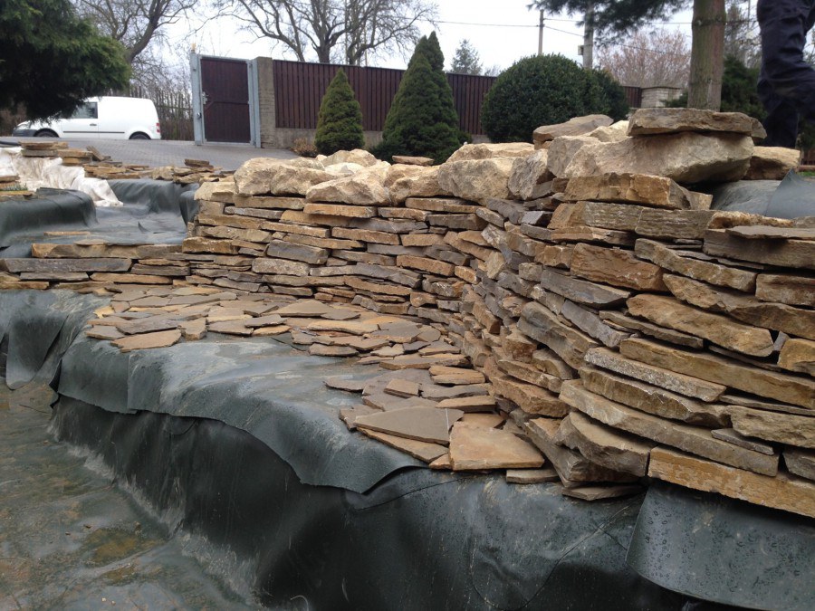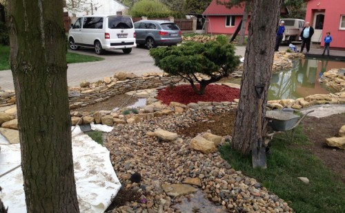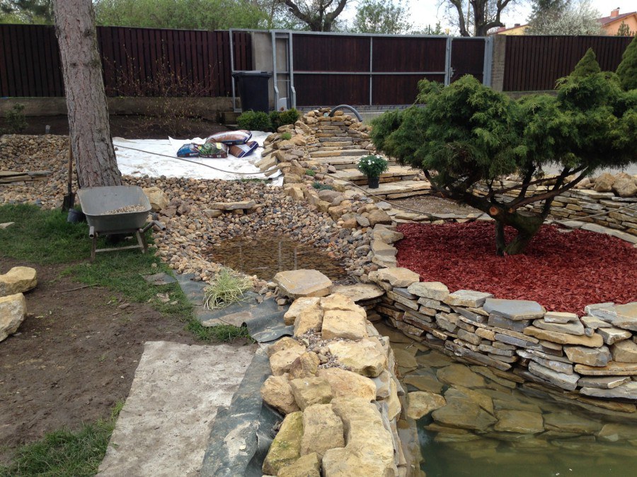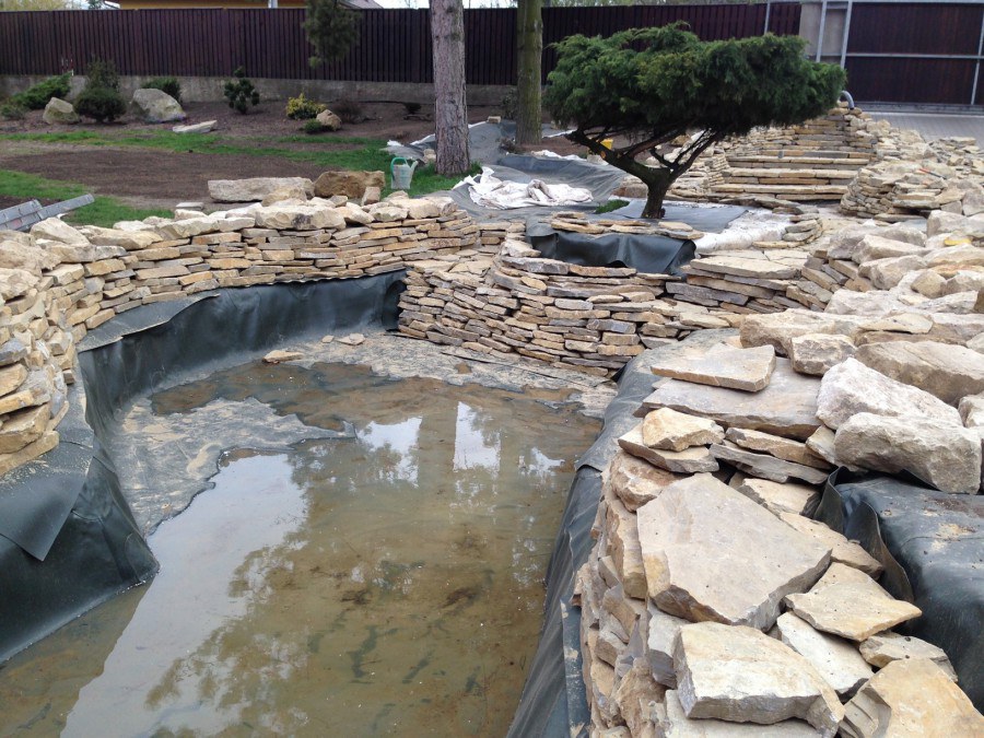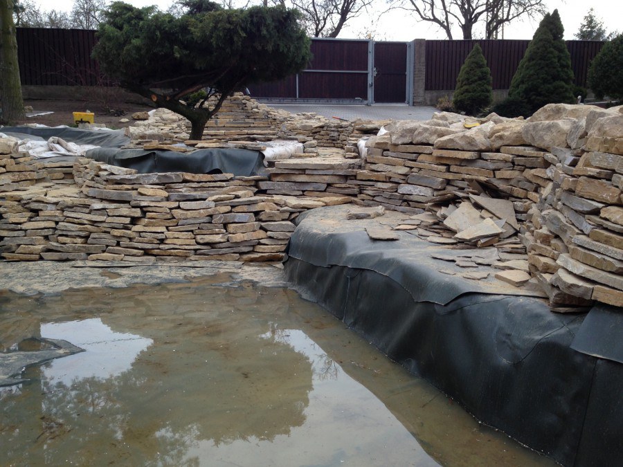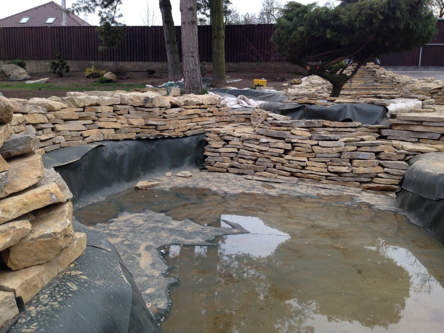 Realizace tohoto jezírka byla zahájena v září roku 2015, kdy byl vytyčen tvar jezírka s potoky. Přáním klientů bylo, aby byl zachován ostrůvek s okrasným keřem jalovcem. Zakomponování ostrůvku bude vyřešeno dvěma potoky, které budou kolem ostrůvku vtékat do jezírka. První bude z kačírku a druhý bude z pískovcových kamenů. Po vykopání požadovaných tvarů jezírka a potoků, došlo k položení technologie a vypískování. Následně pak proběhla pokládka geotextílie 500 g a svařila se na míru fólie Fatra Aquaplast 805 1,5 mm. Poté začala jedna z náročnějších etap, vyskládání stěn a břehů jezírka i potoků okrasným pískovcem.