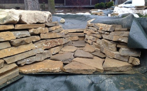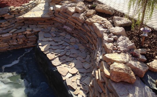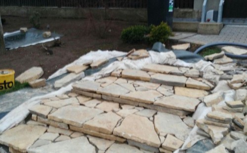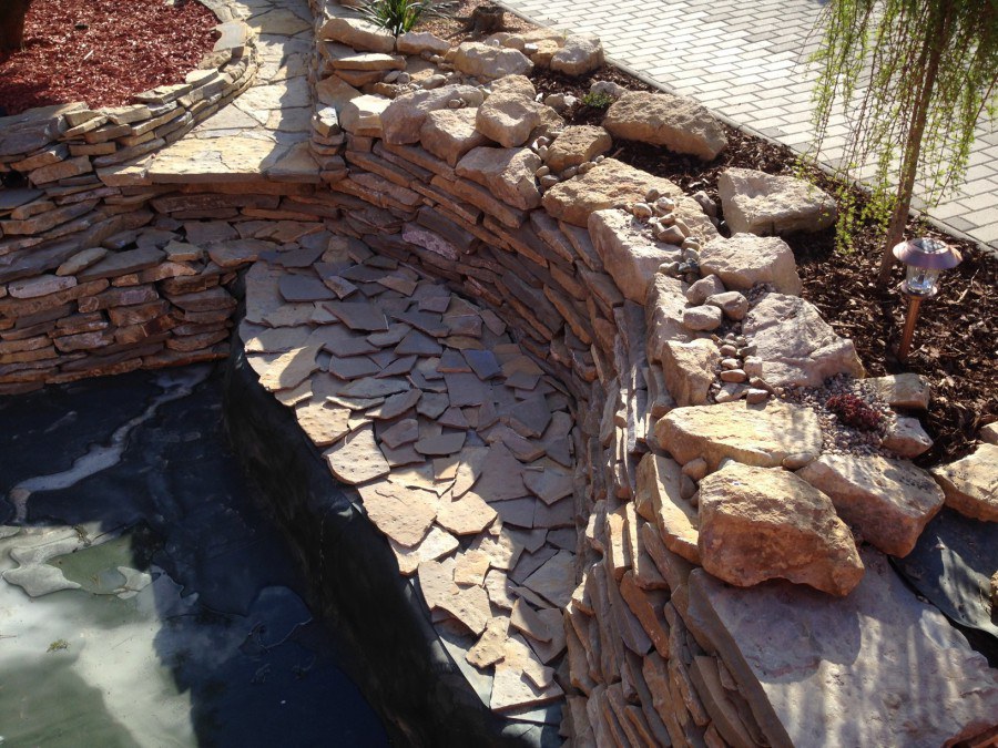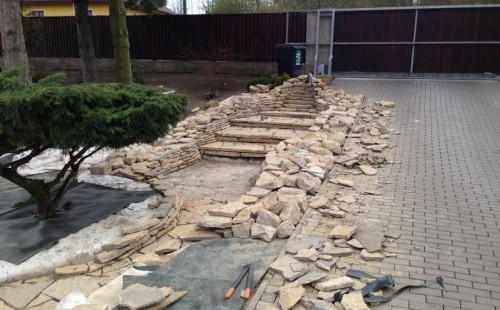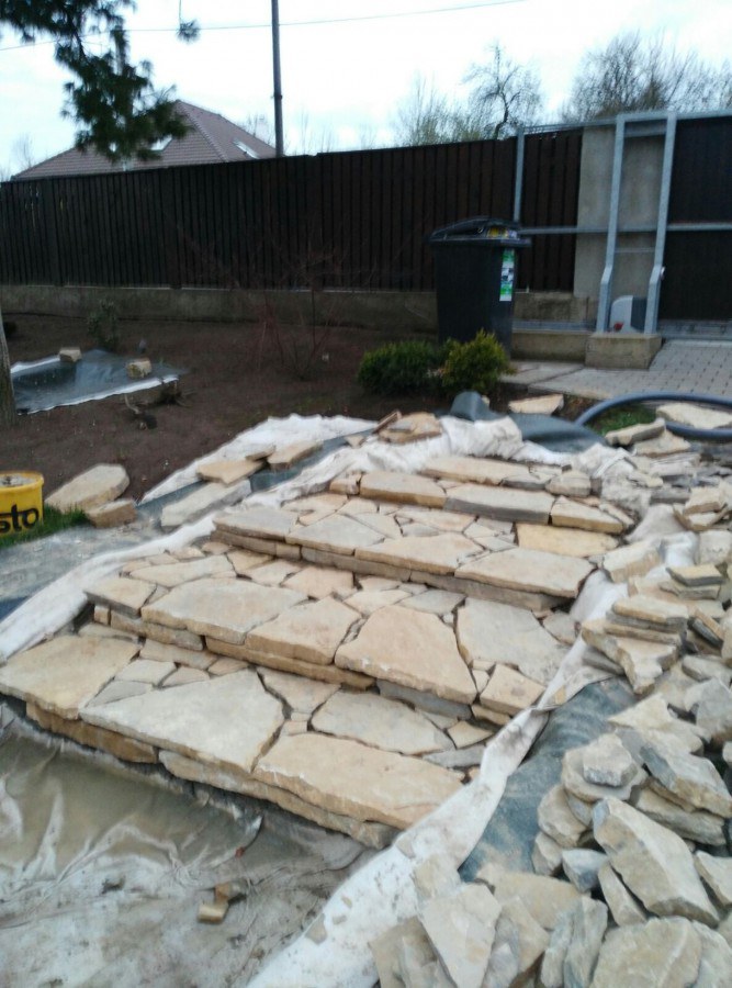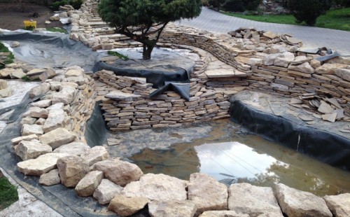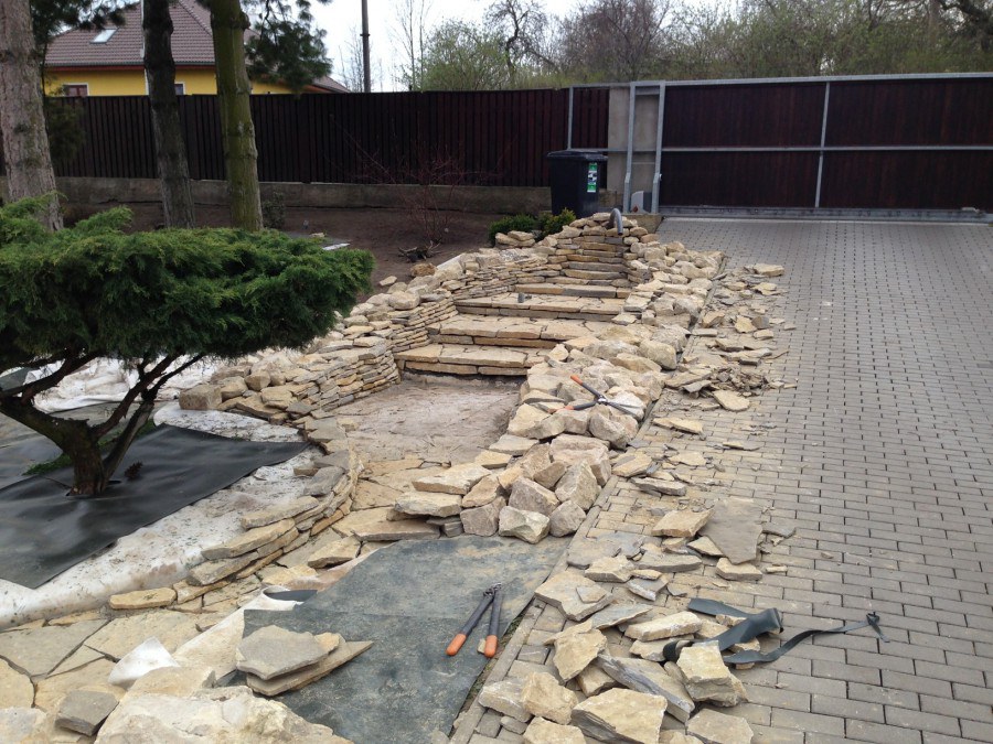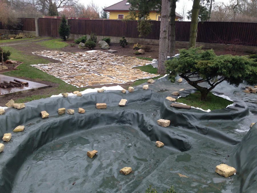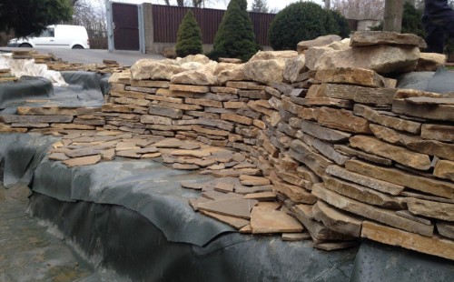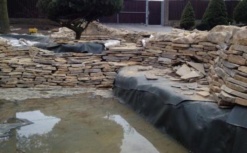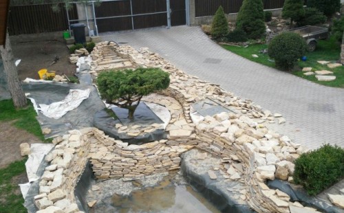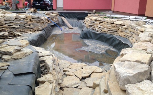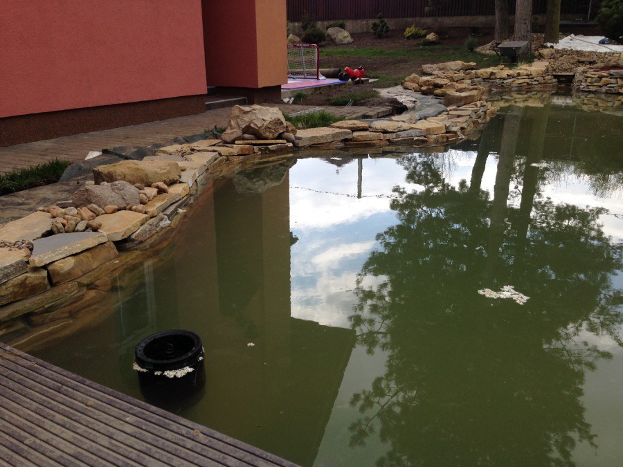 Realizace tohoto jezírka byla zahájena v září roku 2015, kdy byl vytyčen tvar jezírka s potoky. Přáním klientů bylo, aby byl zachován ostrůvek s okrasným keřem jalovcem. Zakomponování ostrůvku bude vyřešeno dvěma potoky, které budou kolem ostrůvku vtékat do jezírka. První bude z kačírku a druhý bude z pískovcových kamenů. Po vykopání požadovaných tvarů jezírka a potoků, došlo k položení technologie a vypískování. Následně pak proběhla pokládka geotextílie 500 g a svařila se na míru fólie Fatra Aquaplast 805 1,5 mm. Poté začala jedna z náročnějších etap, vyskládání stěn a břehů jezírka i potoků okrasným pískovcem.