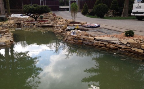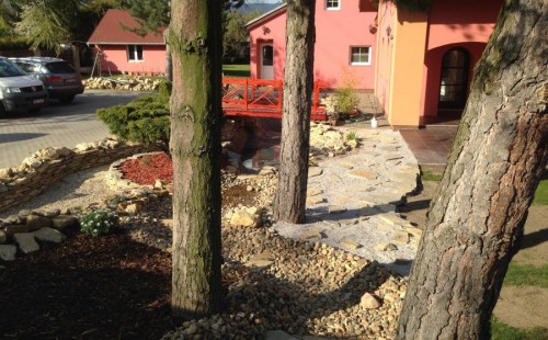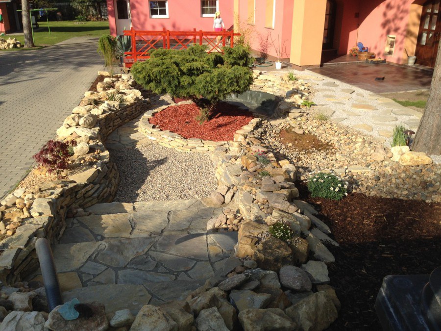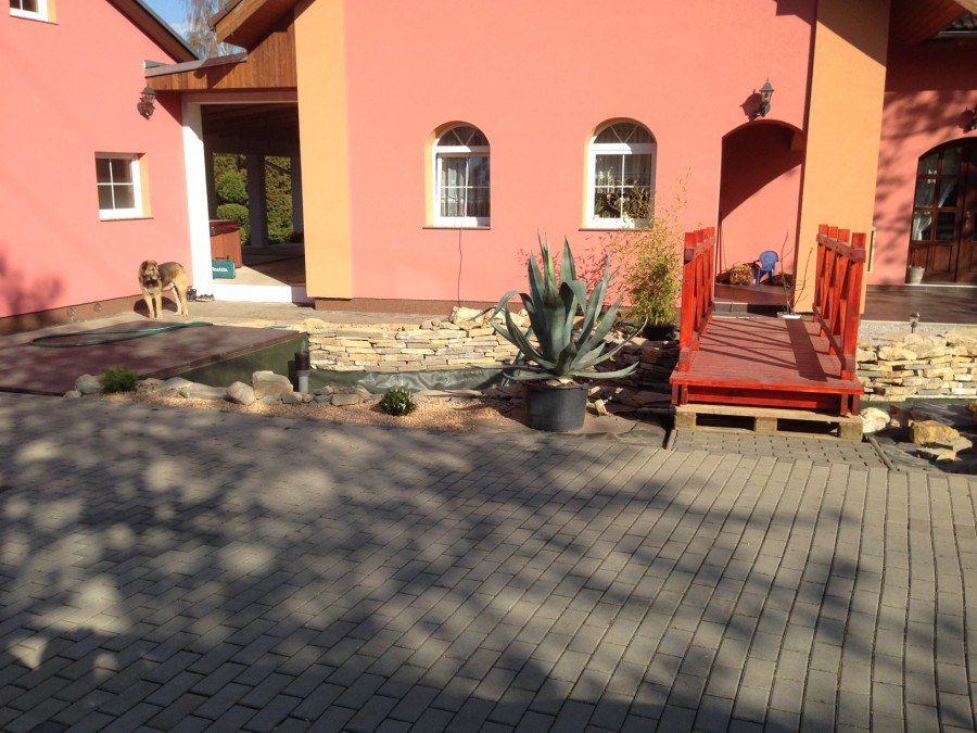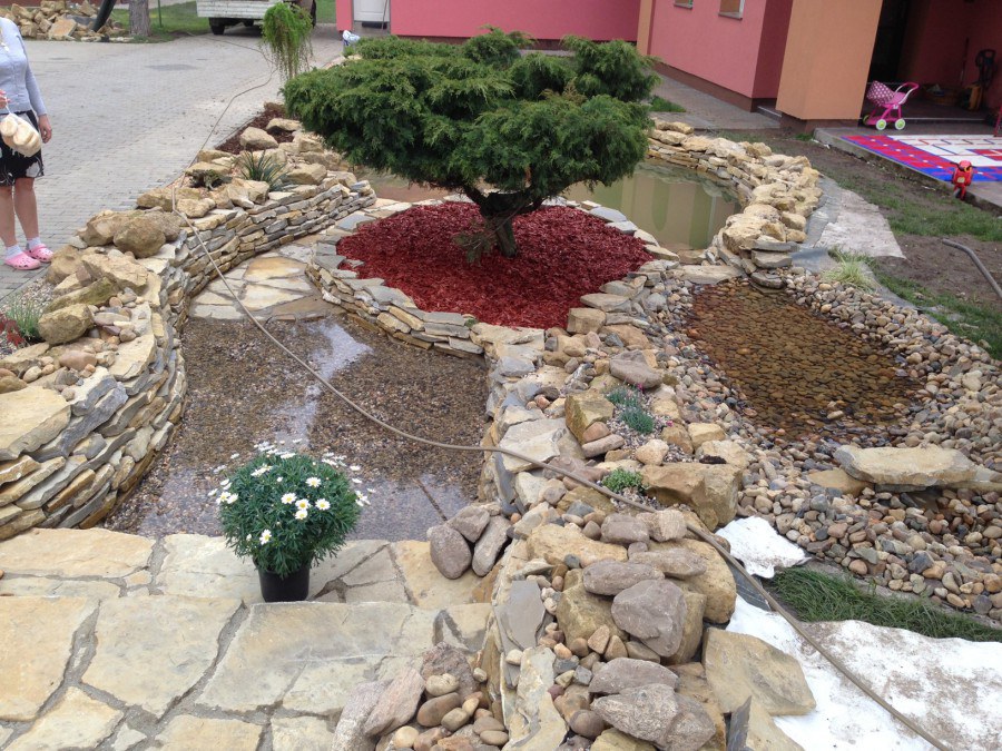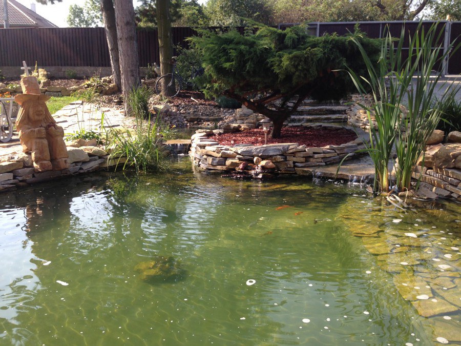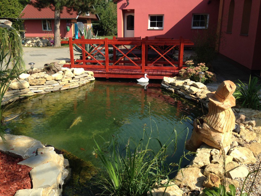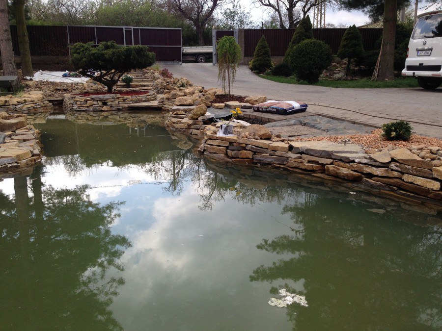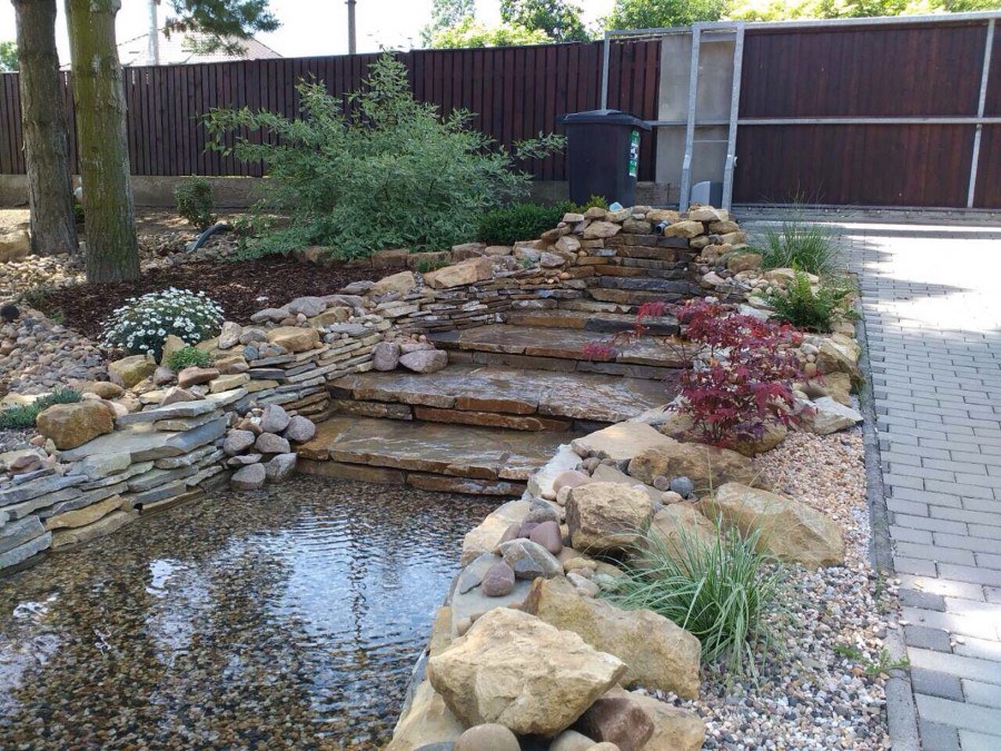 Do tohoto okrasného jezírka byli vypuštěni KOI kapři a jeseteři. Jezírko se stalo dominantou celého dvorku. Klient si nechal vytvořit okrasnou lávku přes jezírko, odkud může krmit a pozorovat své rybí miláčky.