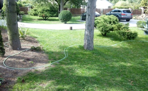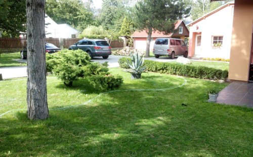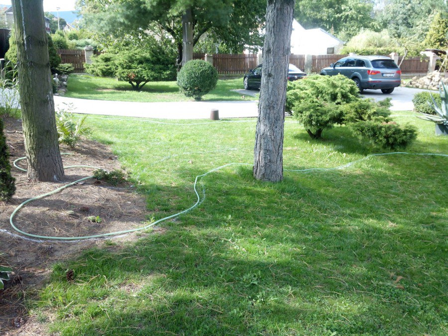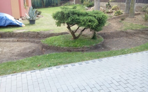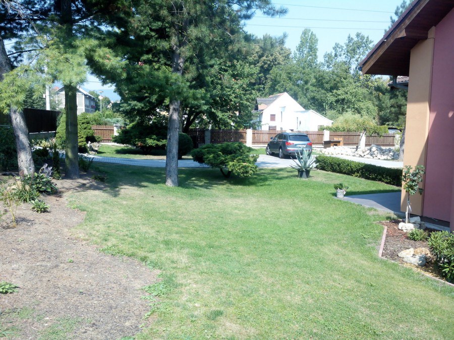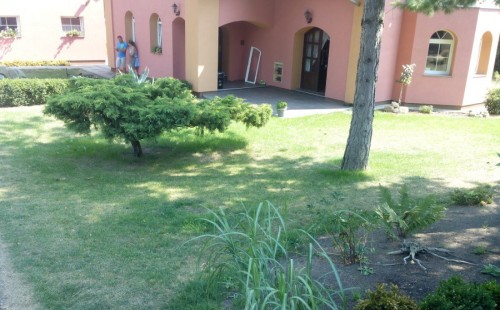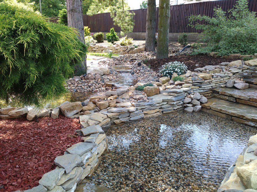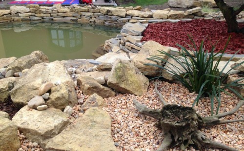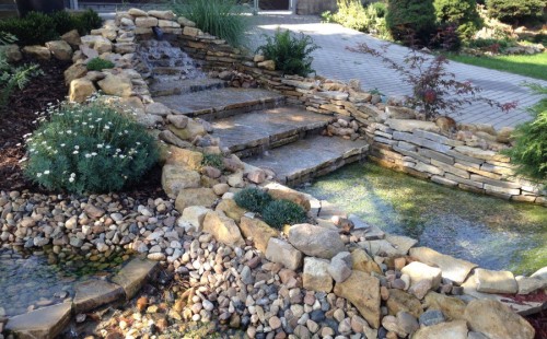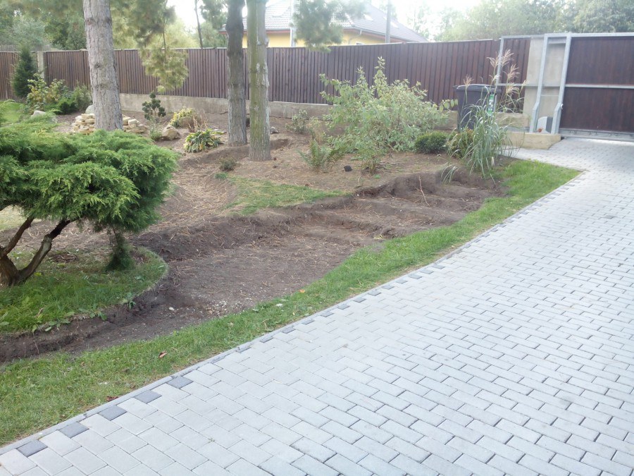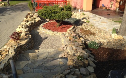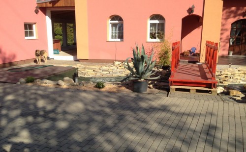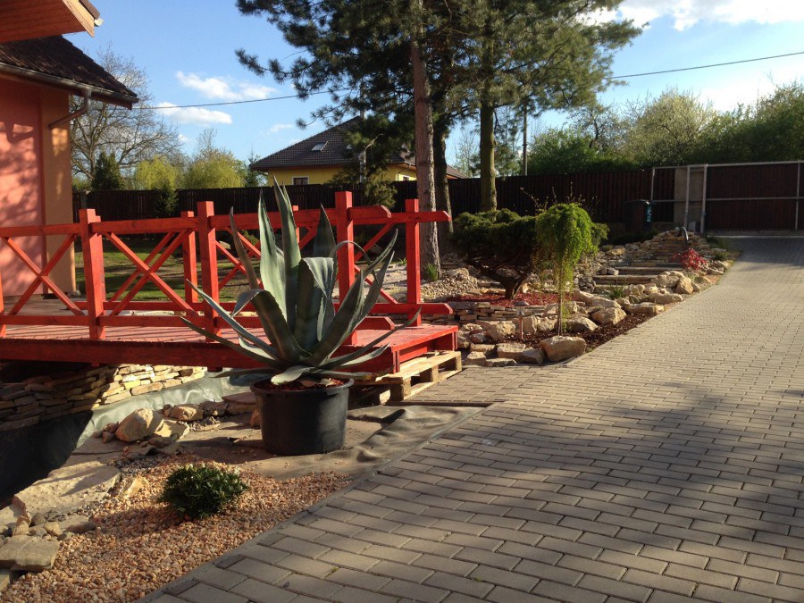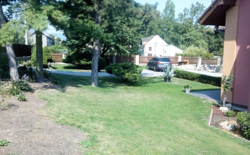 Do tohoto okrasného jezírka byli vypuštěni KOI kapři a jeseteři. Jezírko se stalo dominantou celého dvorku. Klient si nechal vytvořit okrasnou lávku přes jezírko, odkud může krmit a pozorovat své rybí miláčky.